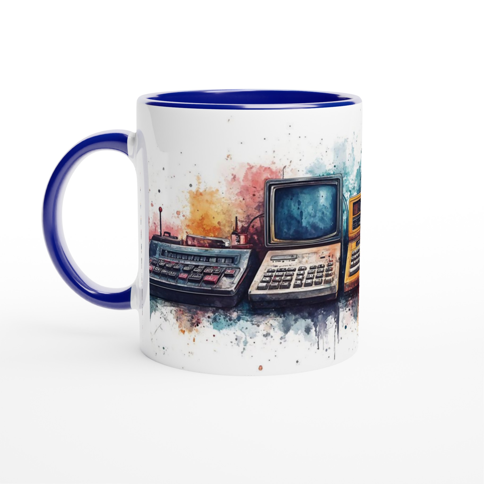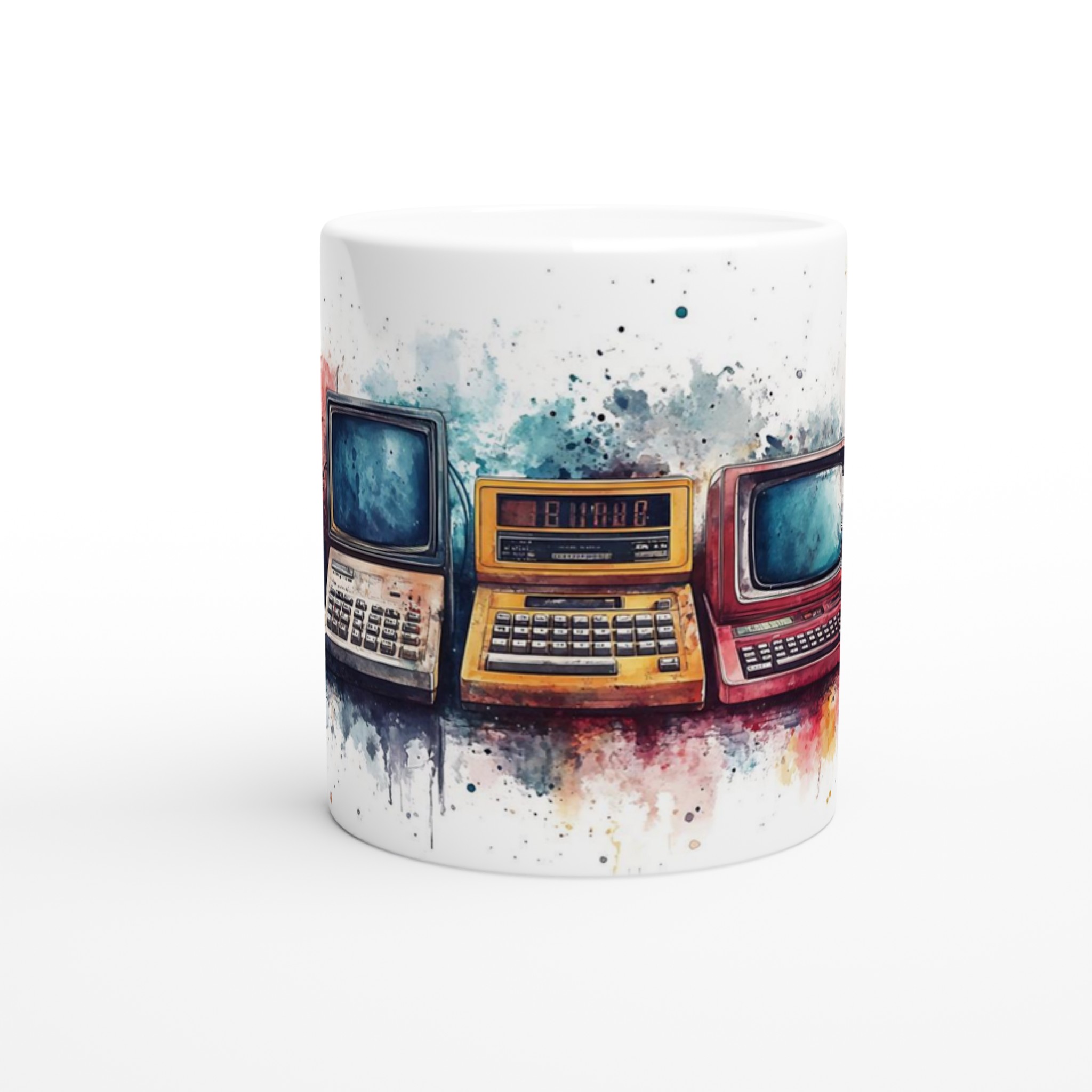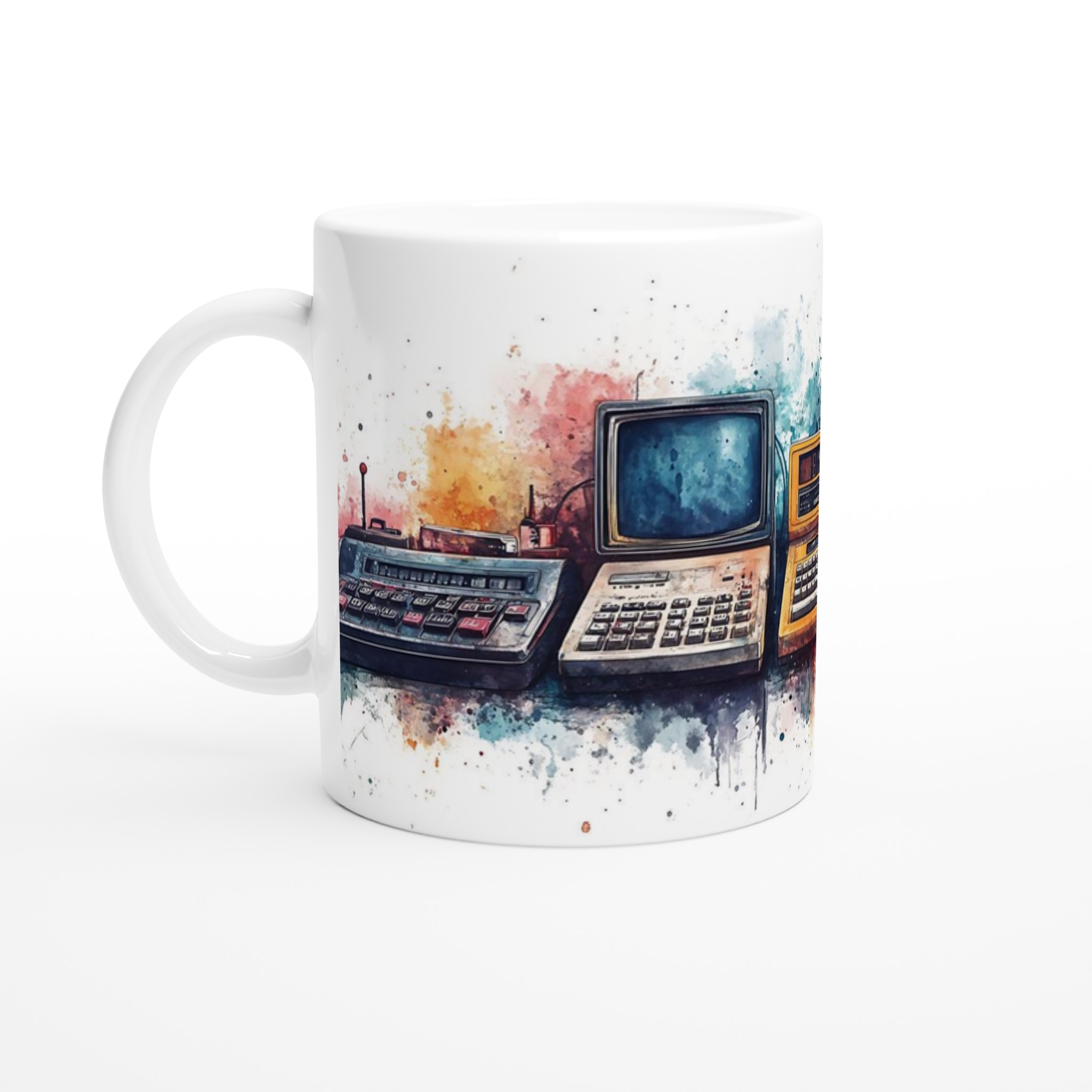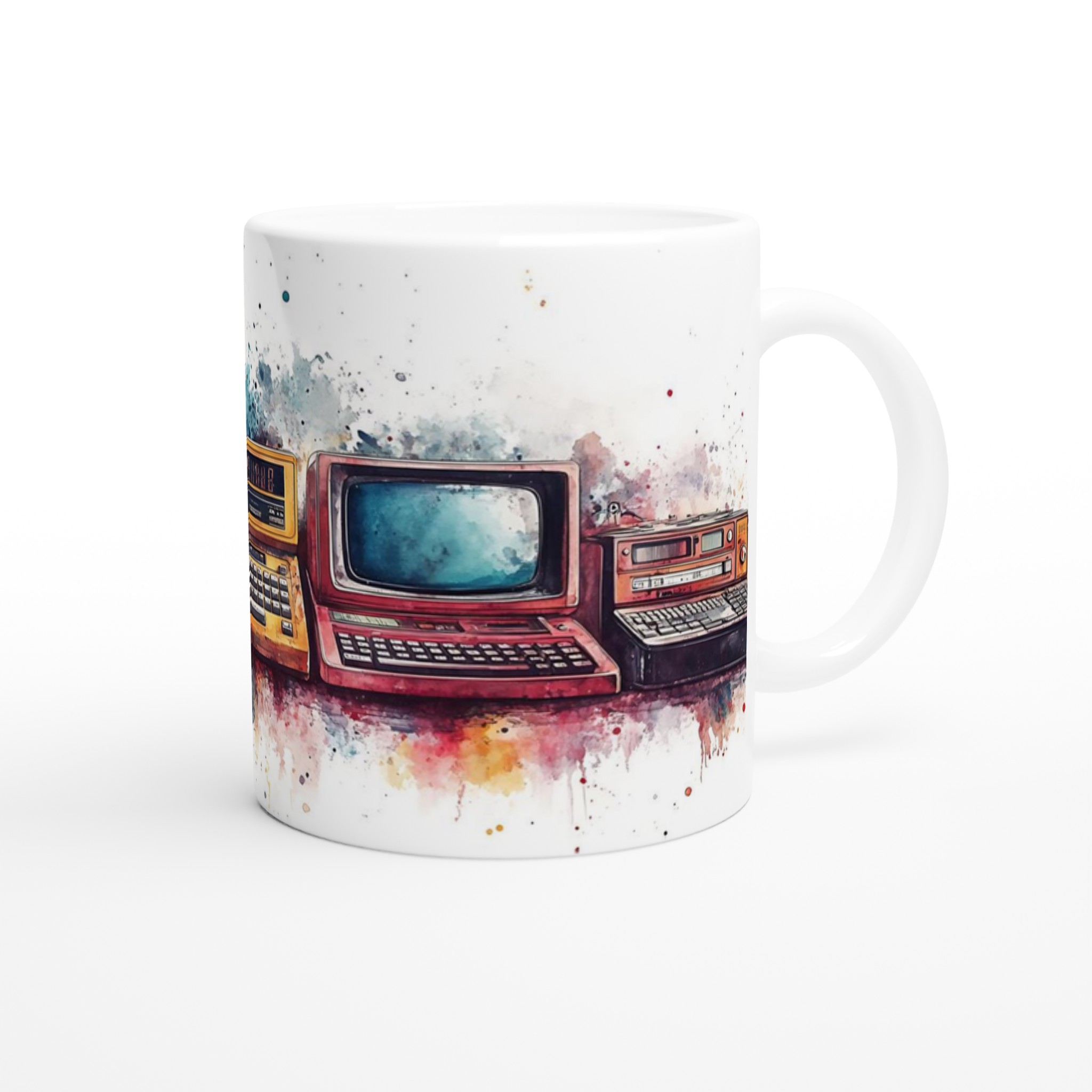 Retro tech watercolor – ceramic mug 11oz: a splash of nostalgia for your daily brew tar dig tillbaka till en tid då stil var tidlös. Inspirerad av klassisk design, med en modern twist.