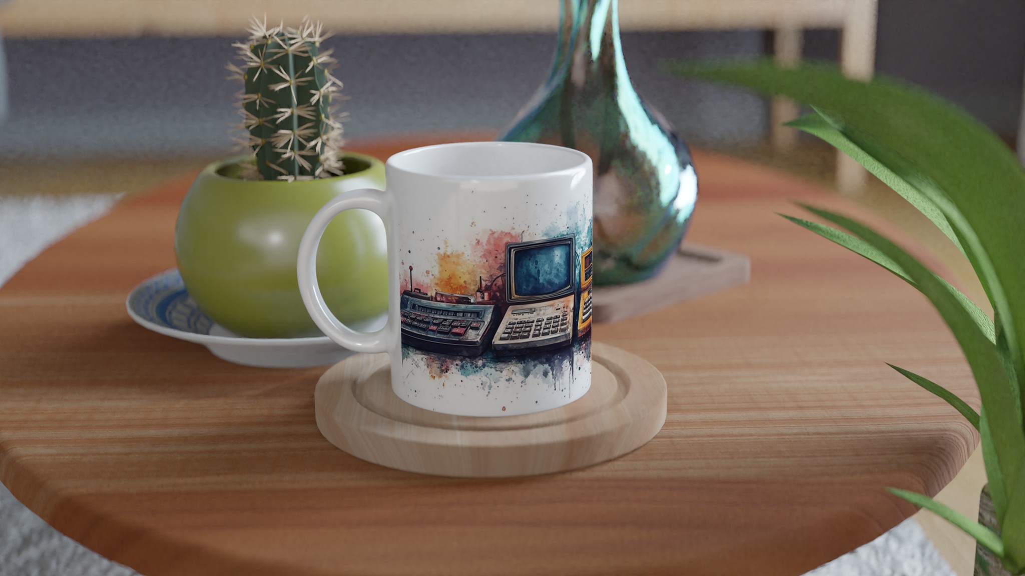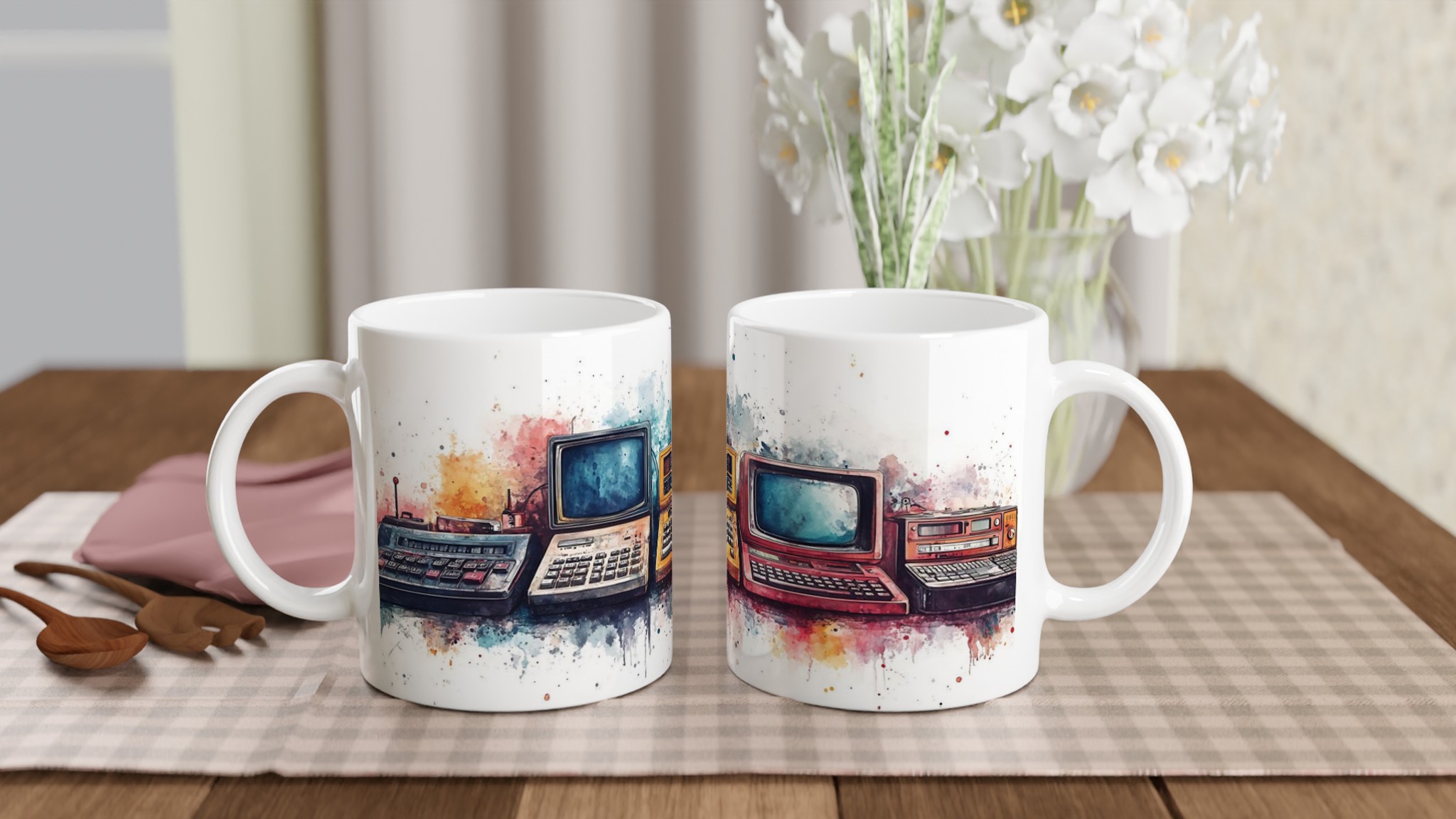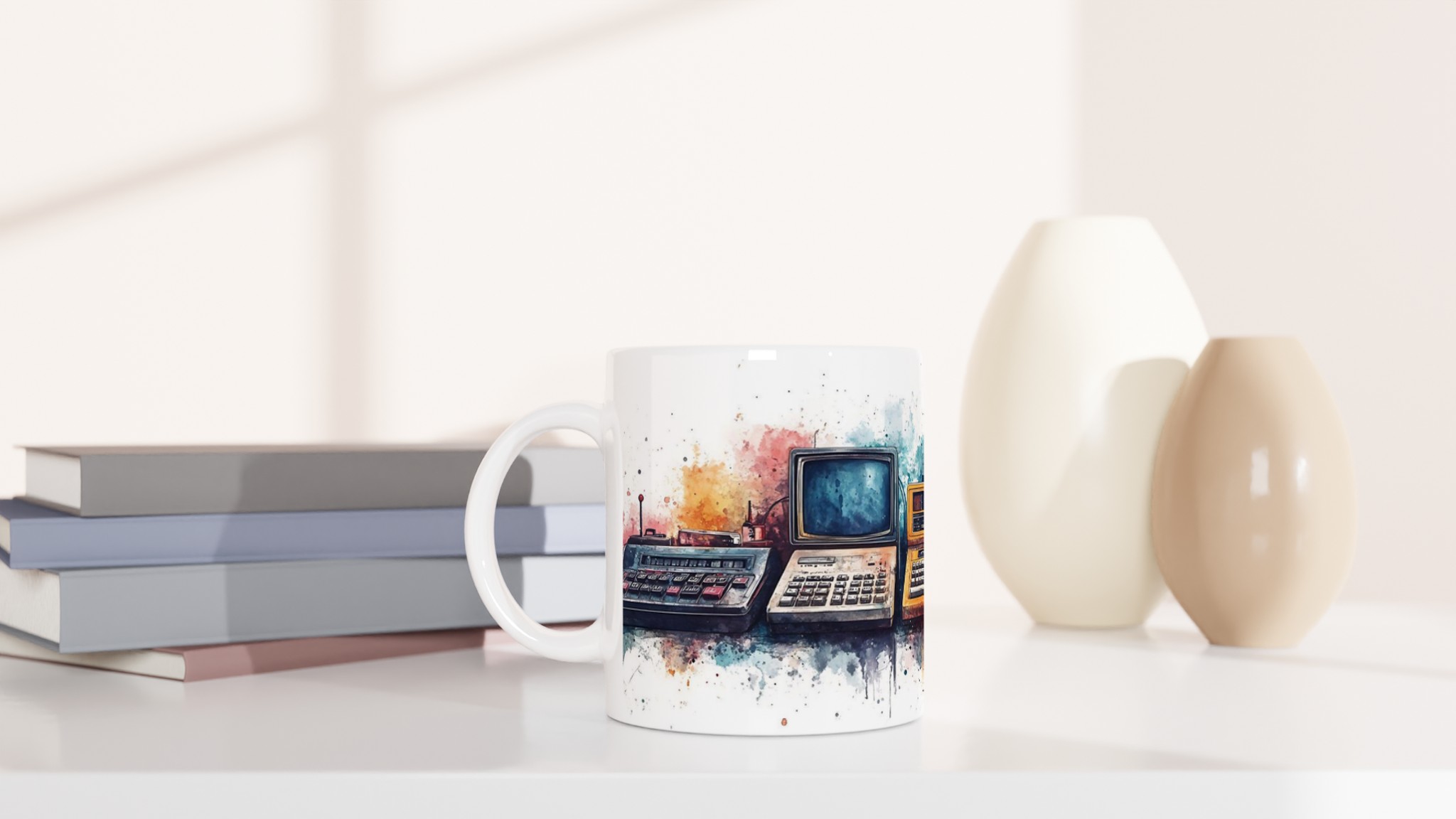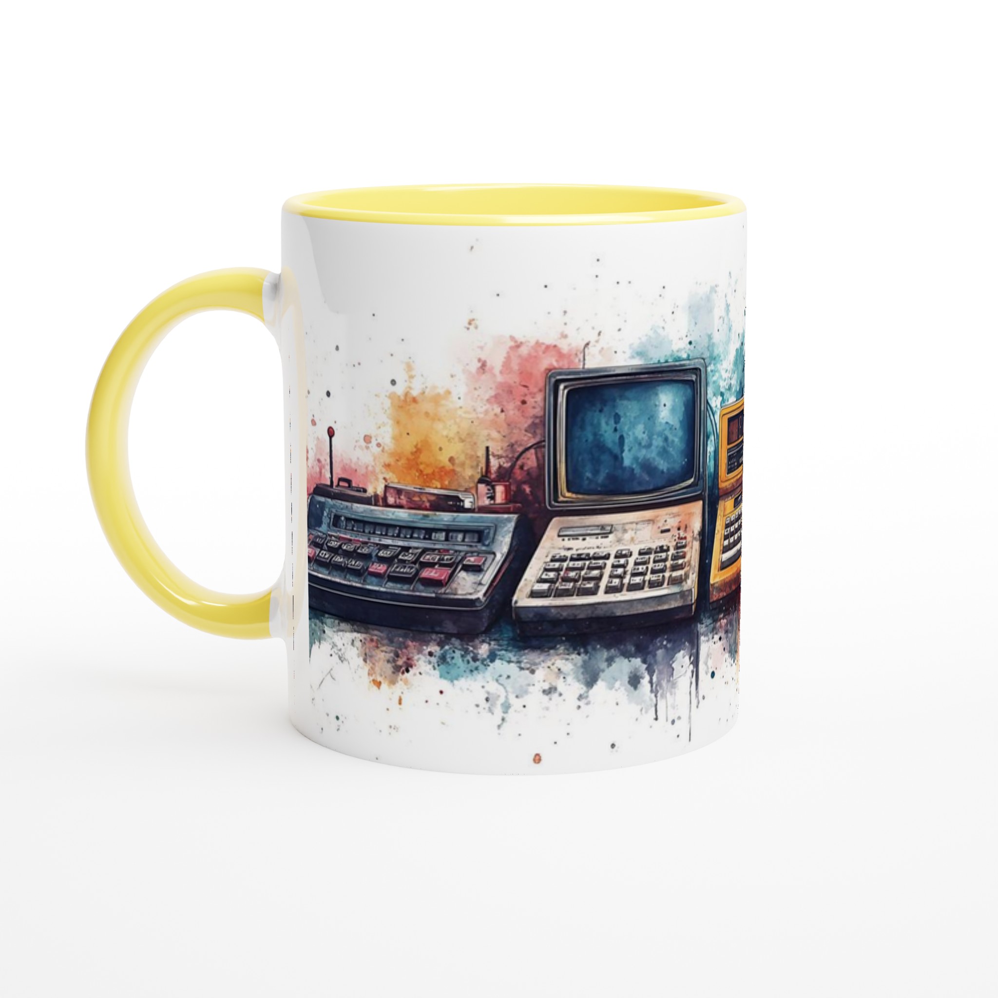 Retro tech watercolor – ceramic mug 11oz: a splash of nostalgia for your daily brew tar dig tillbaka till en tid då stil var tidlös. Inspirerad av klassisk design, med en modern twist.