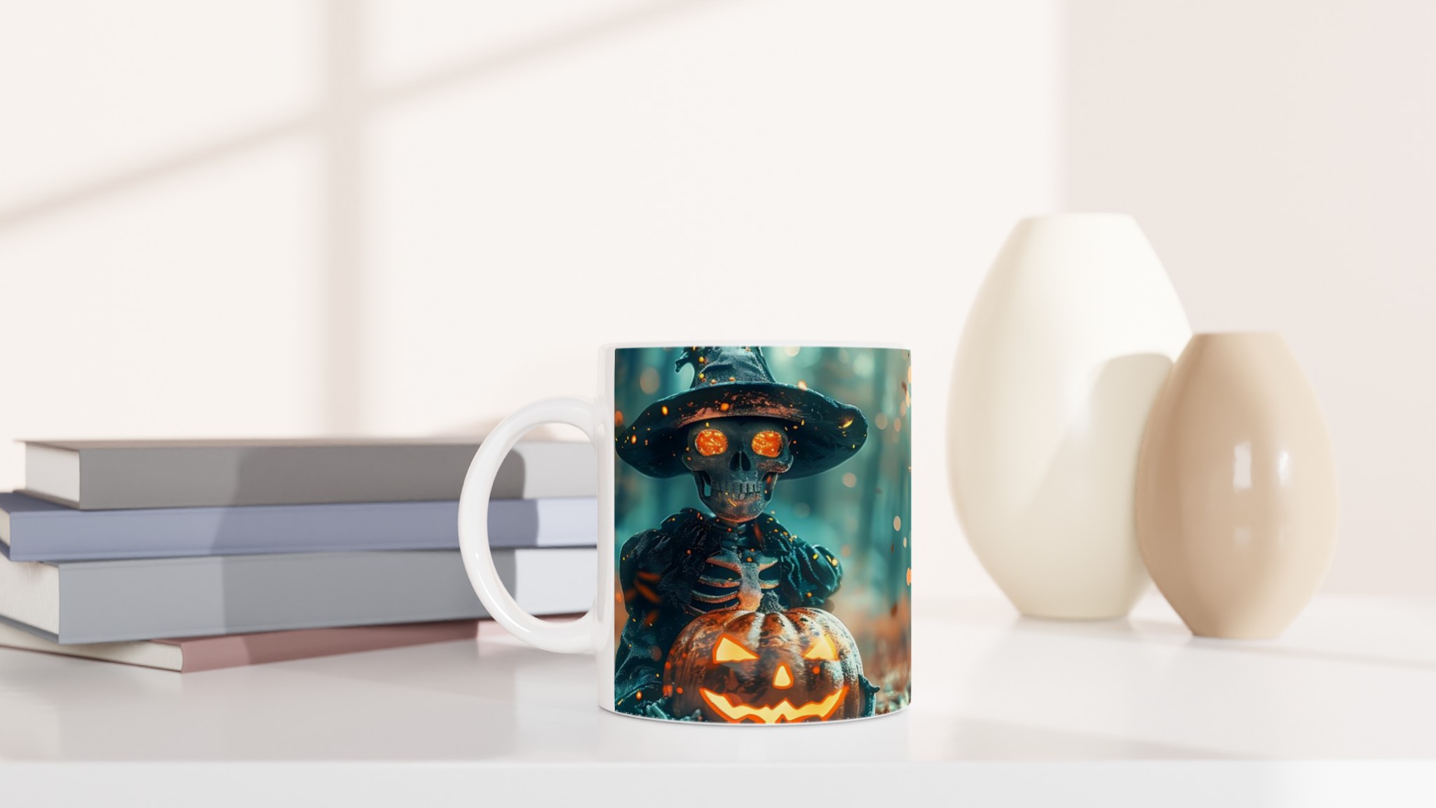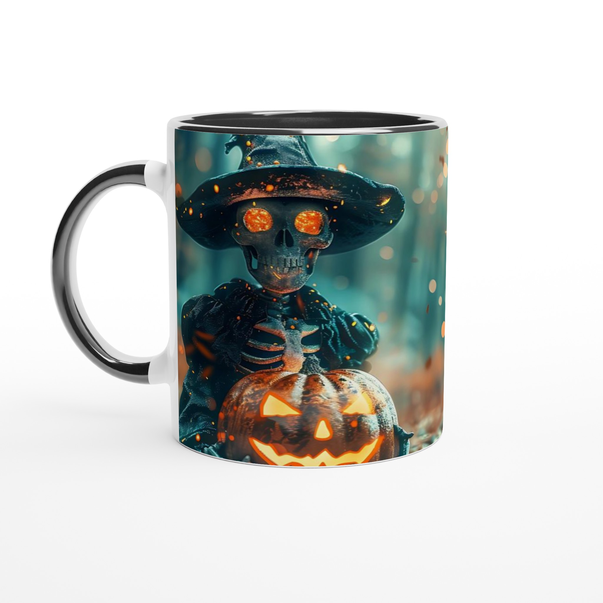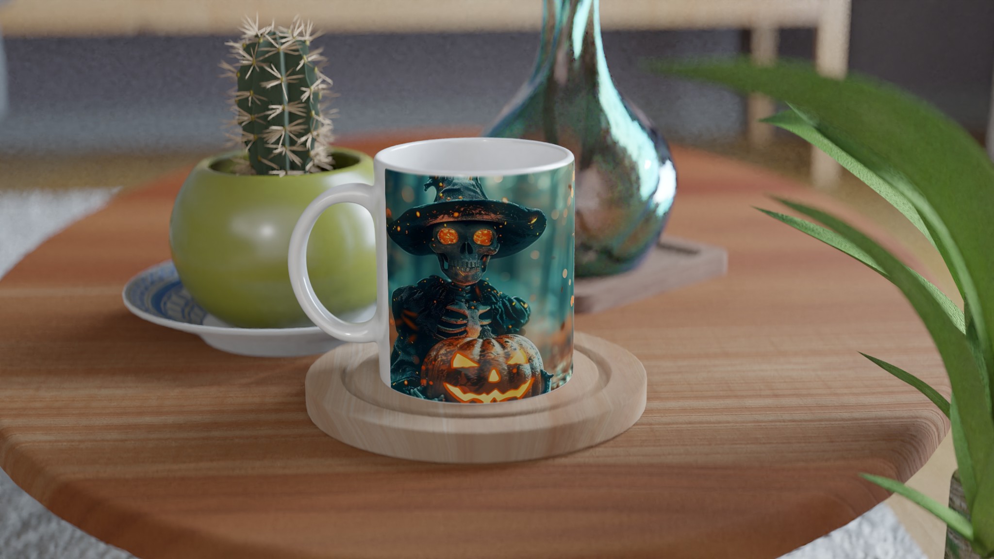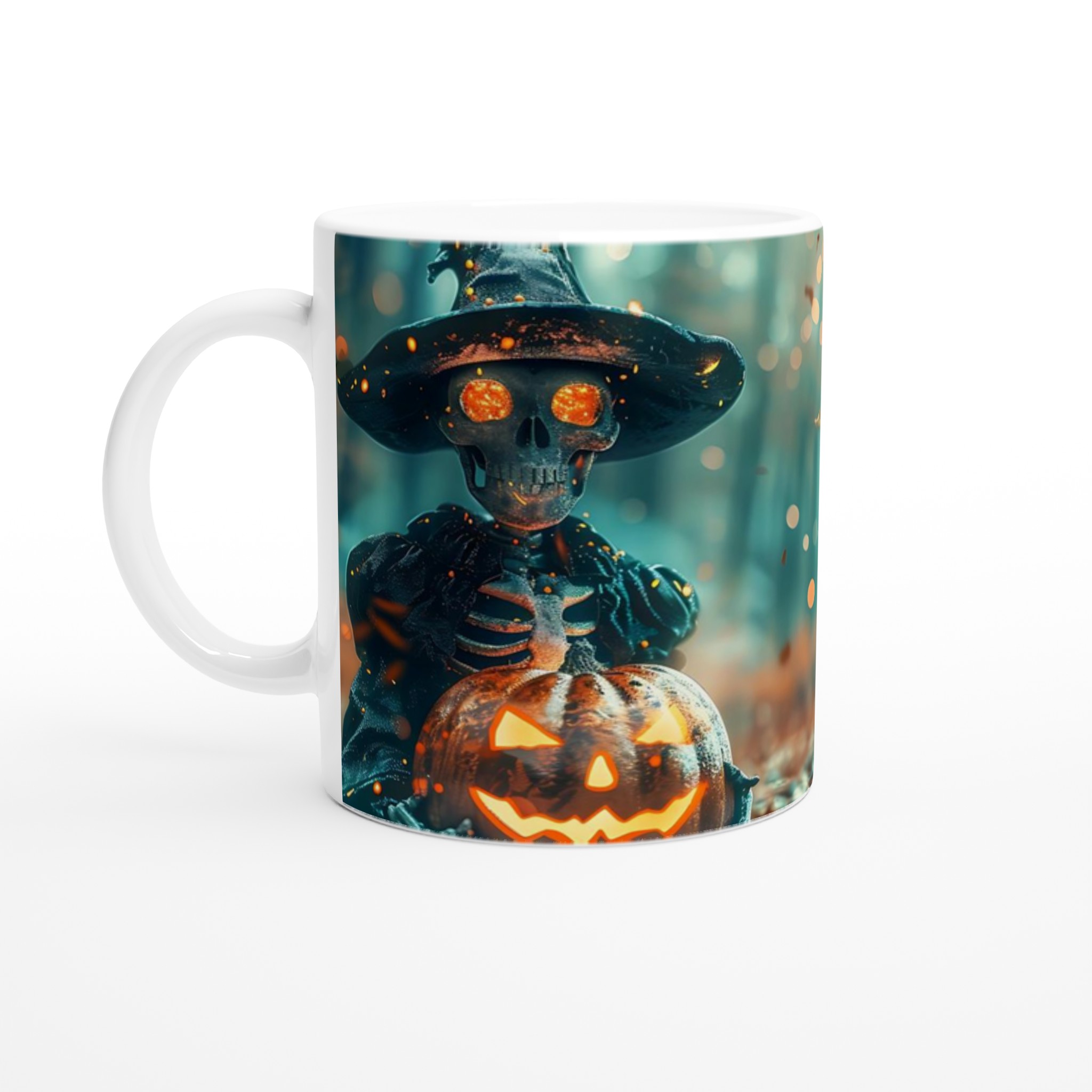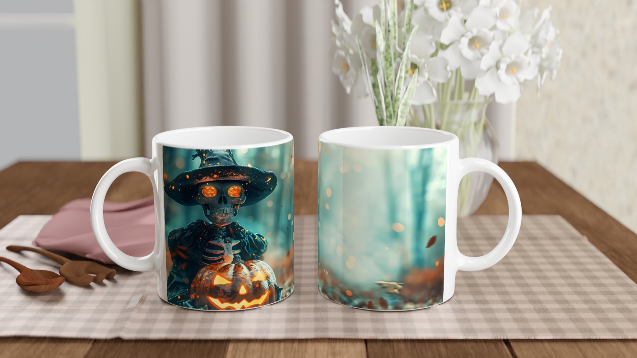Spooky Forest Skeleton & Jack-o’-Lantern 11oz Ceramic Mug – Perfect for Halloween Haunts in Your Choice of Color