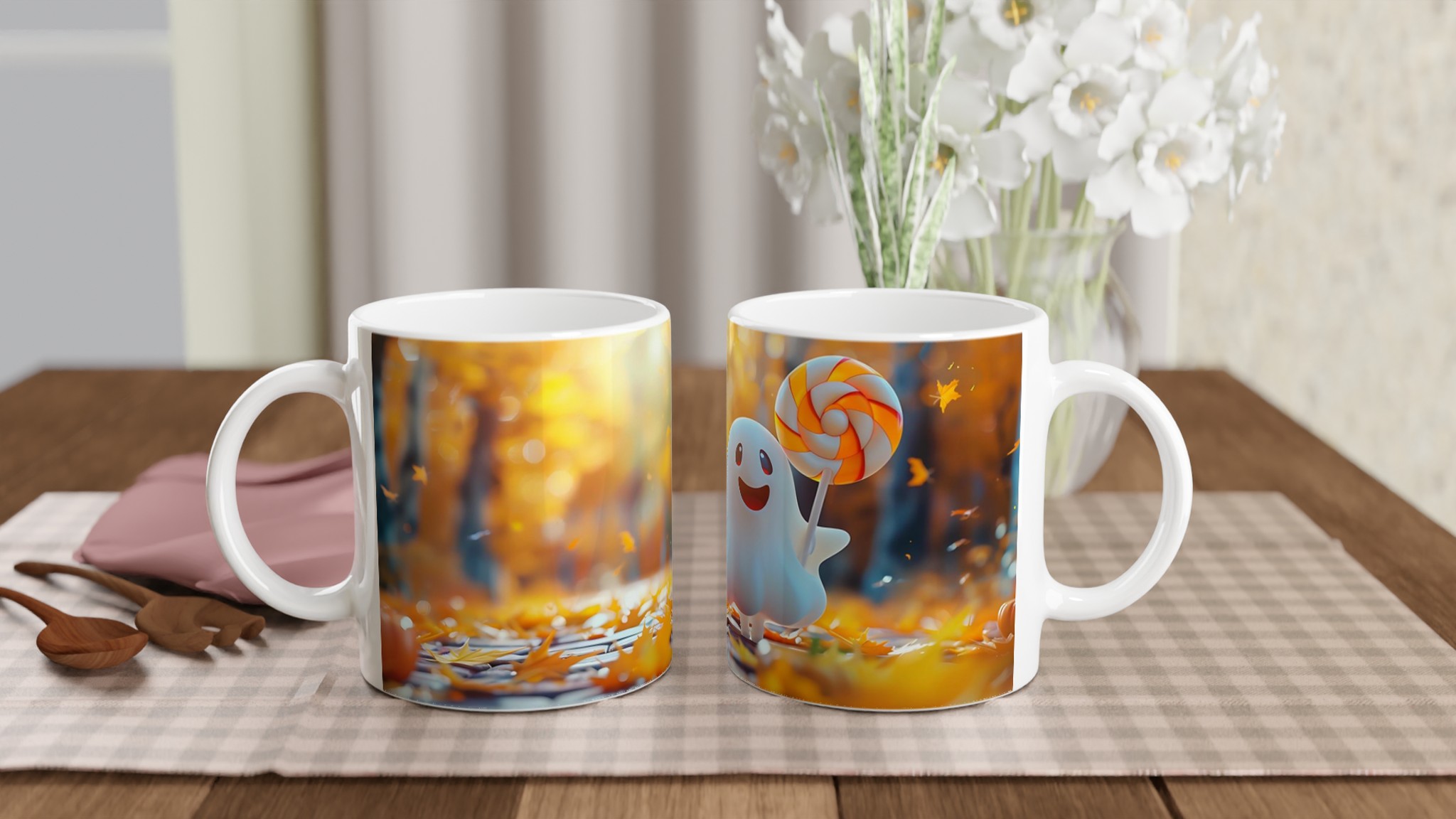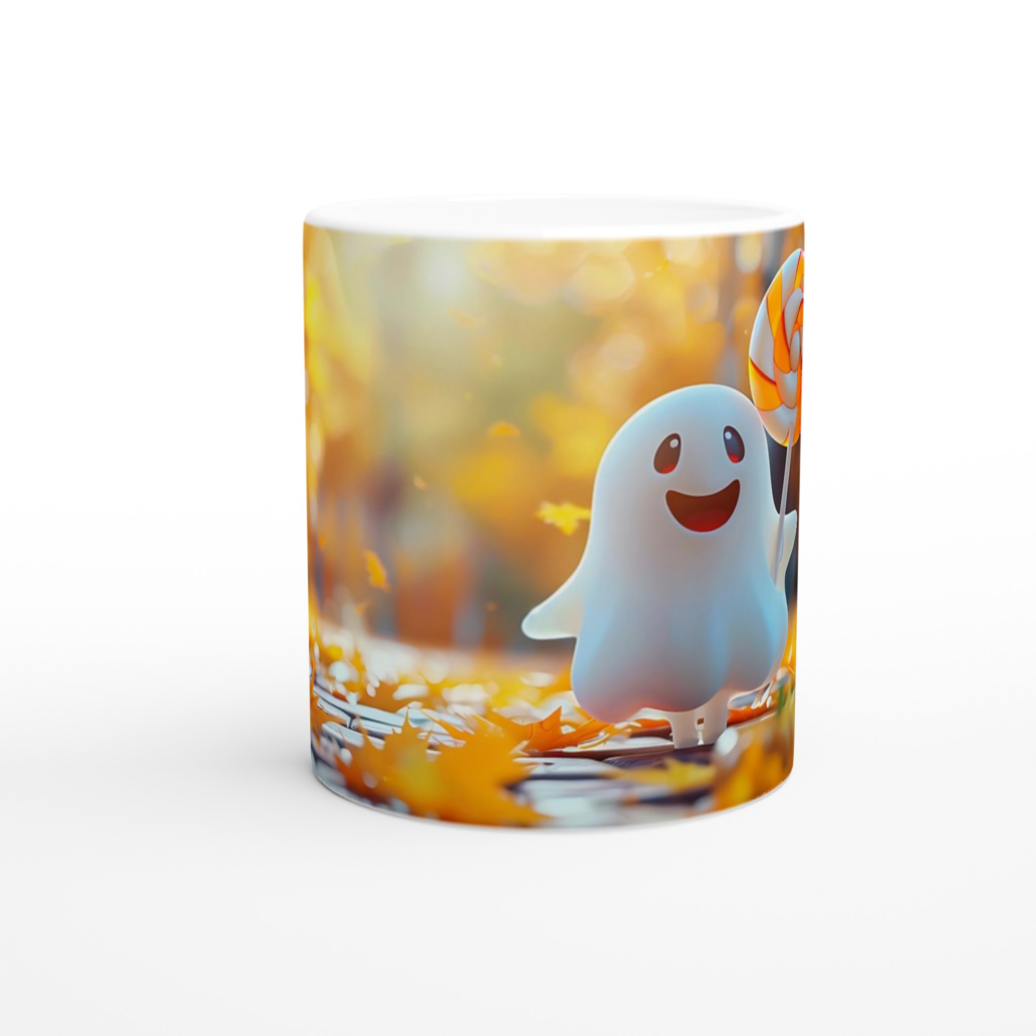 Spooky-Cute Ghost with Lollipop White 11oz Ceramic Mug – Perfect for Halloween & Fall Fun