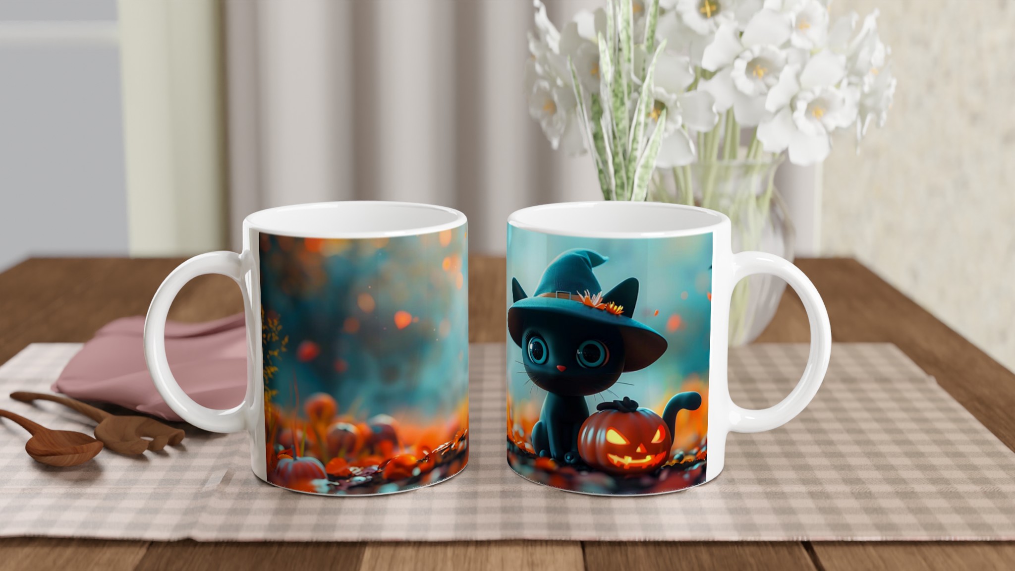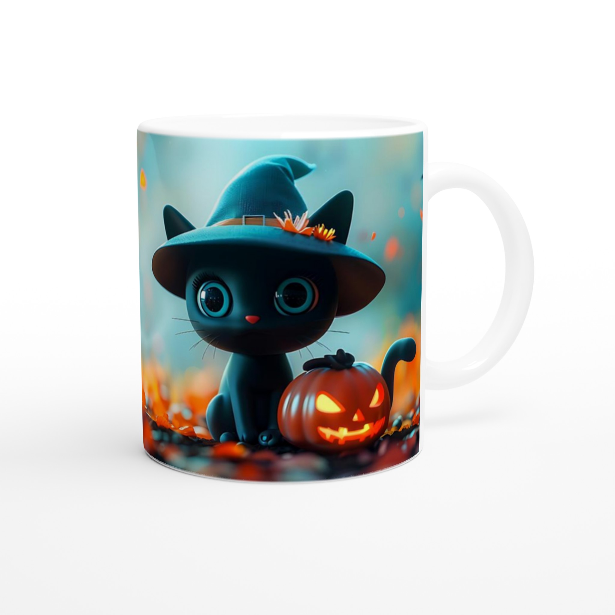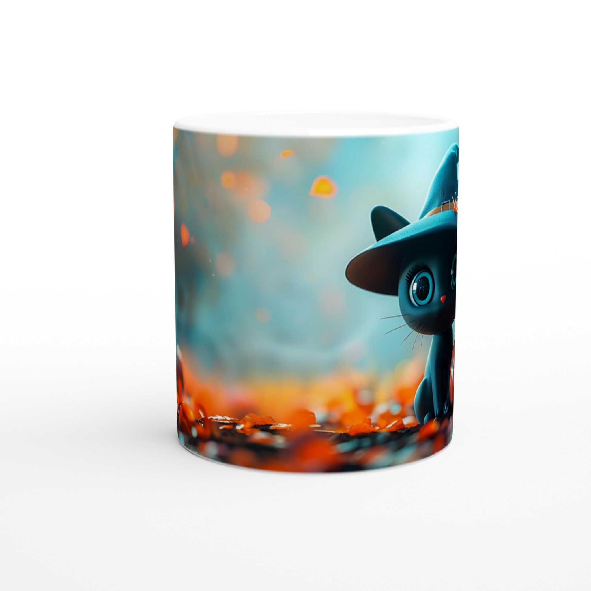 Charming Chibi Witch Cat 11oz Ceramic Mug – Whimsical Halloween Theme in Your Choice of Seven Hues