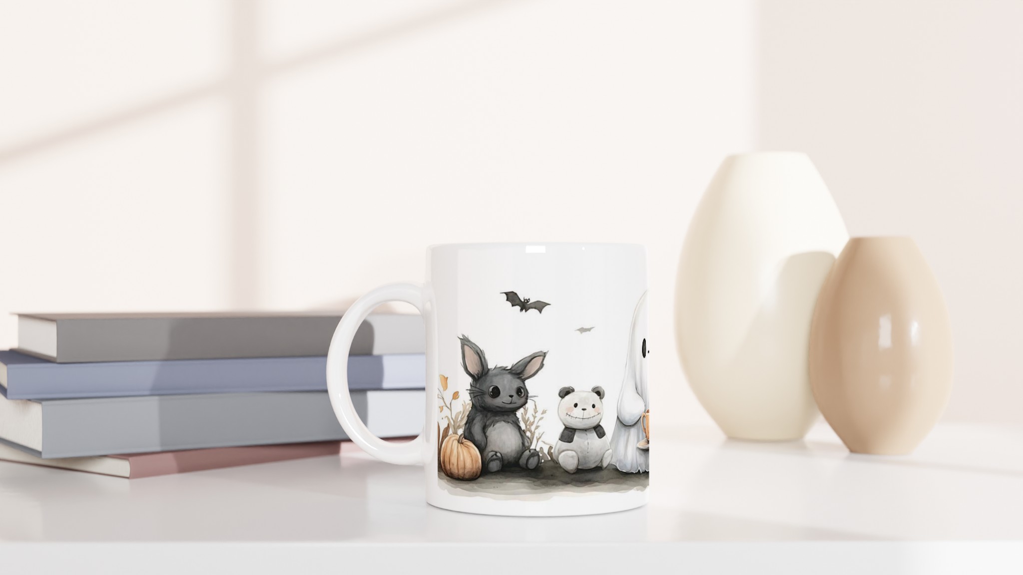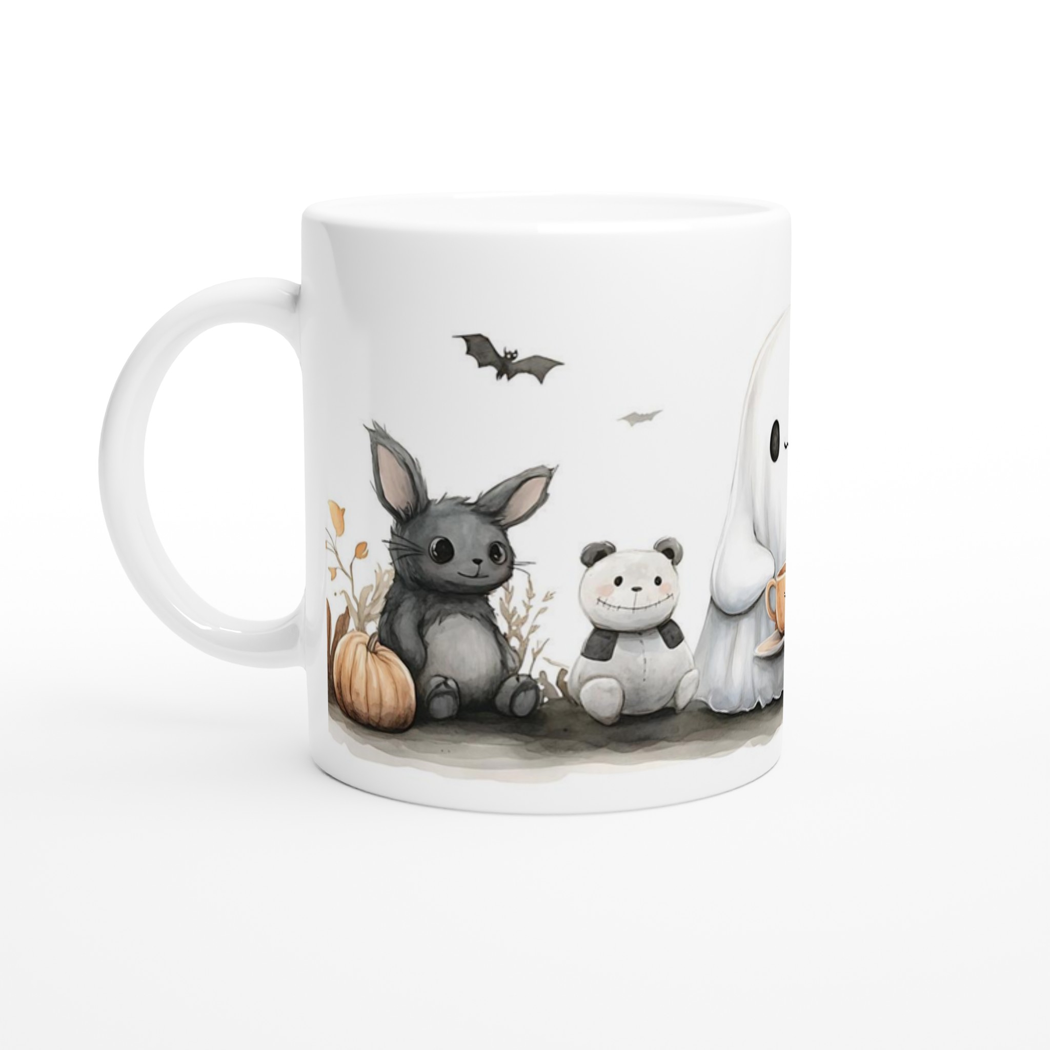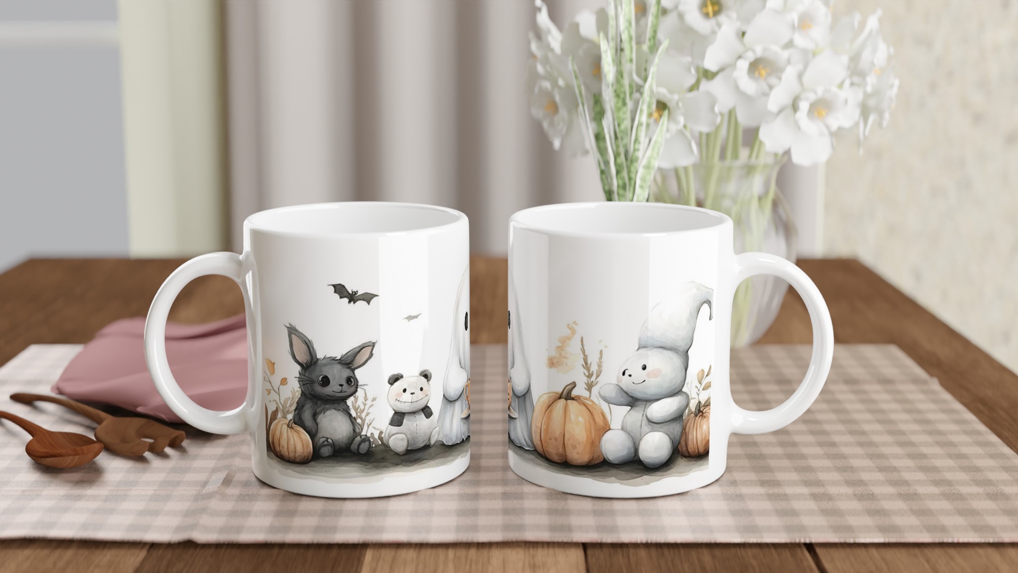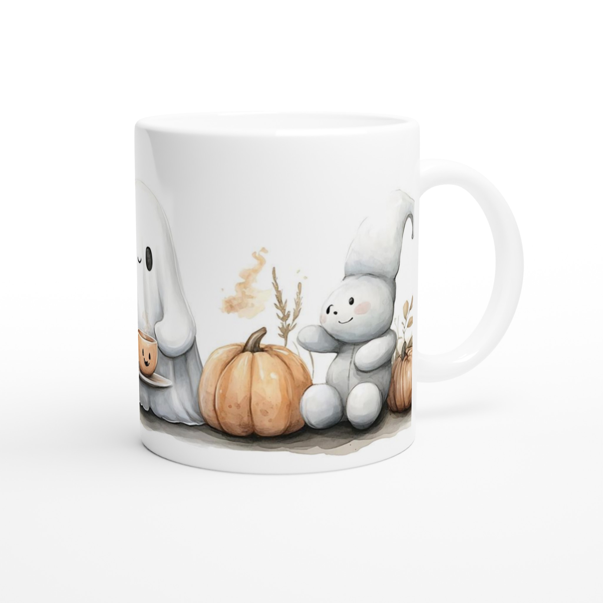 Spooky Cute Ghost & Friends Autumn Mug – White 11oz Ceramic Mug for Halloween & Fall Fun