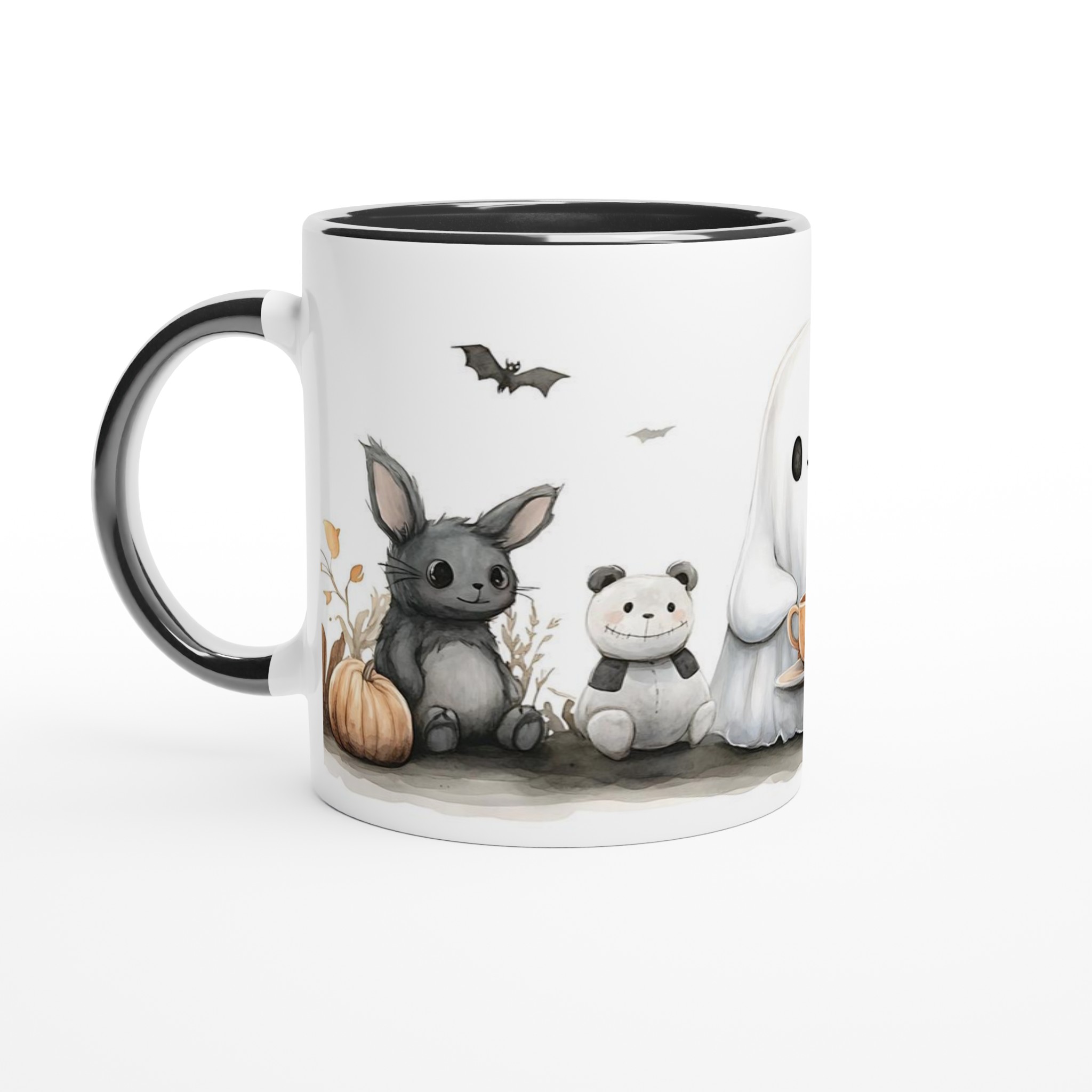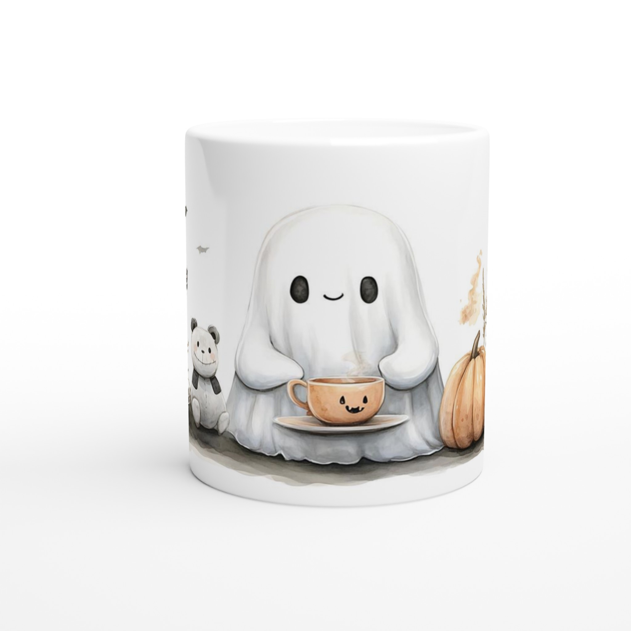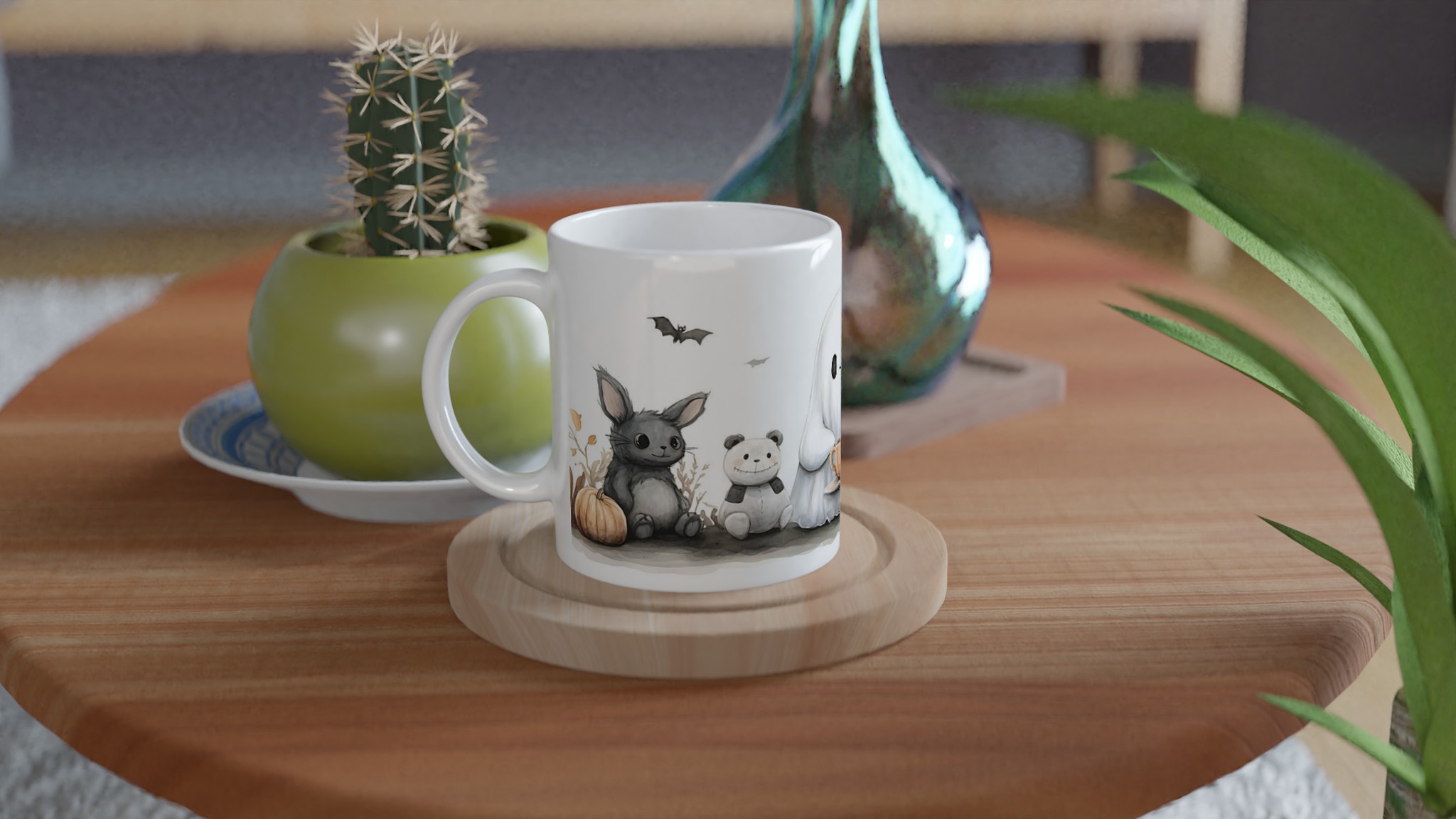 Spooky Cute Ghost & Friends Autumn Mug – White 11oz Ceramic Mug for Halloween & Fall Fun