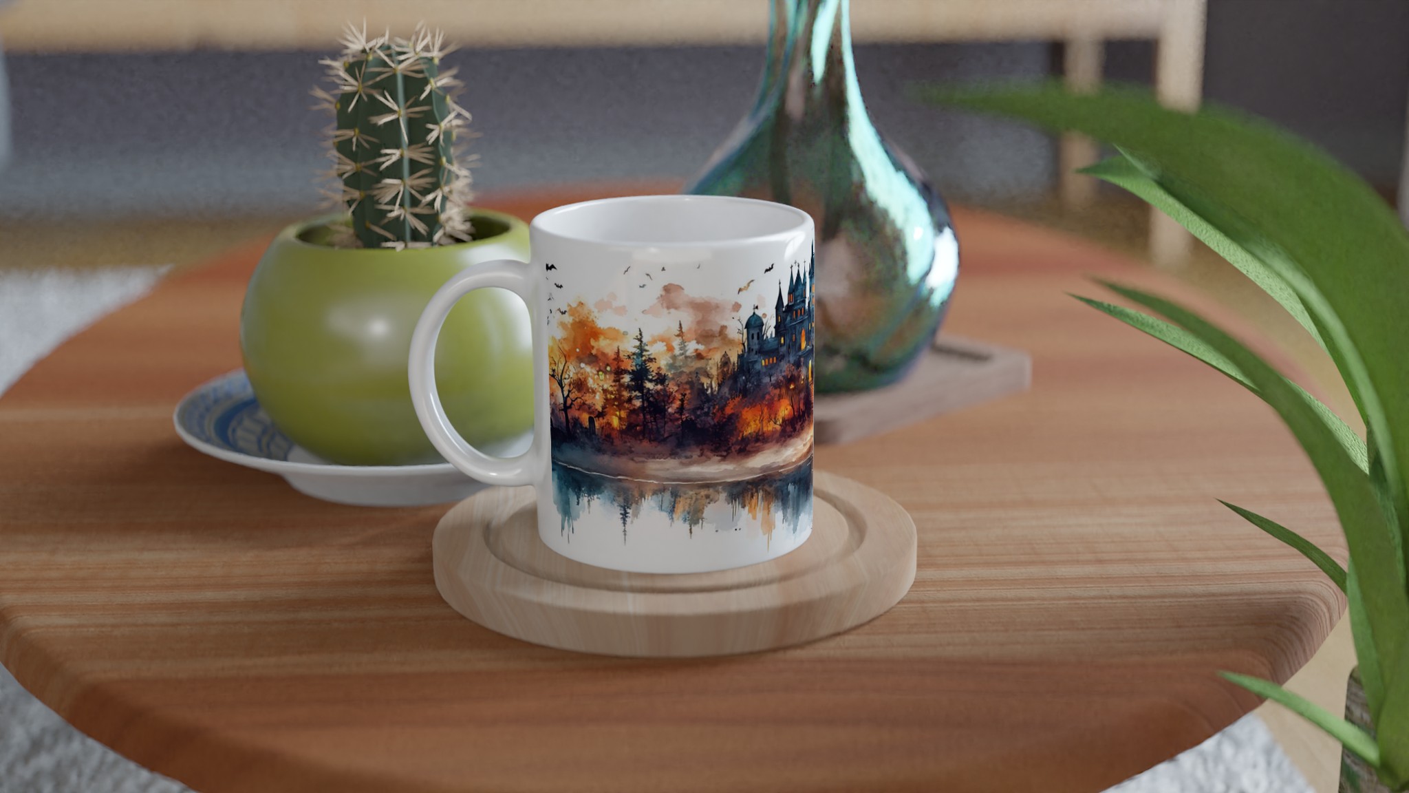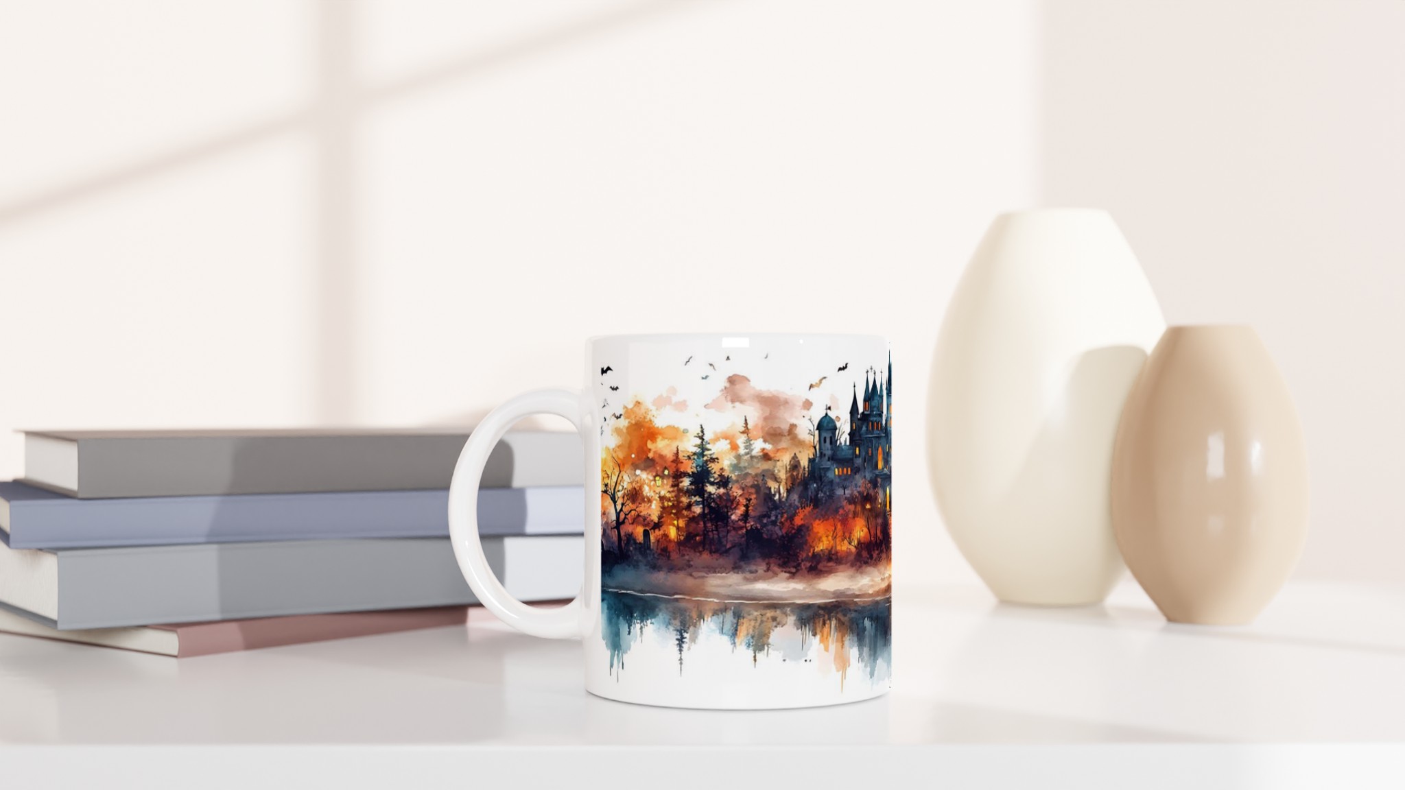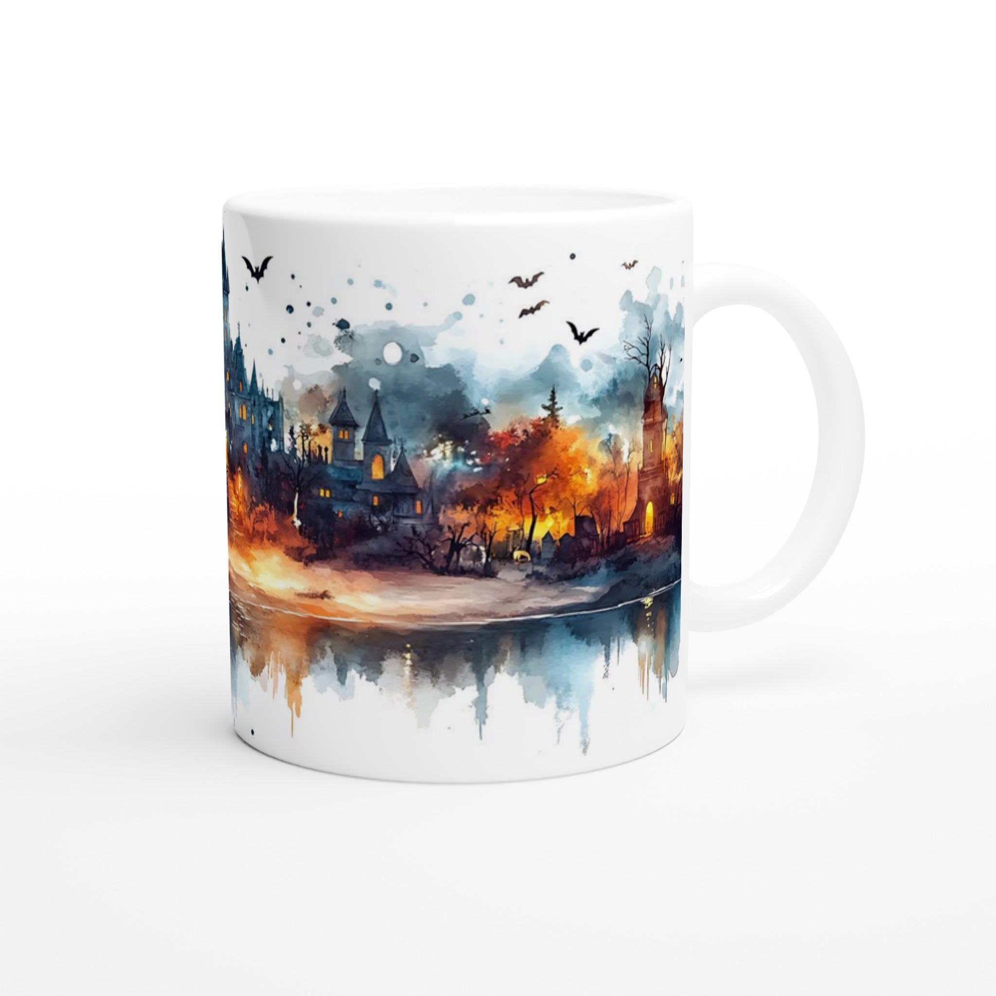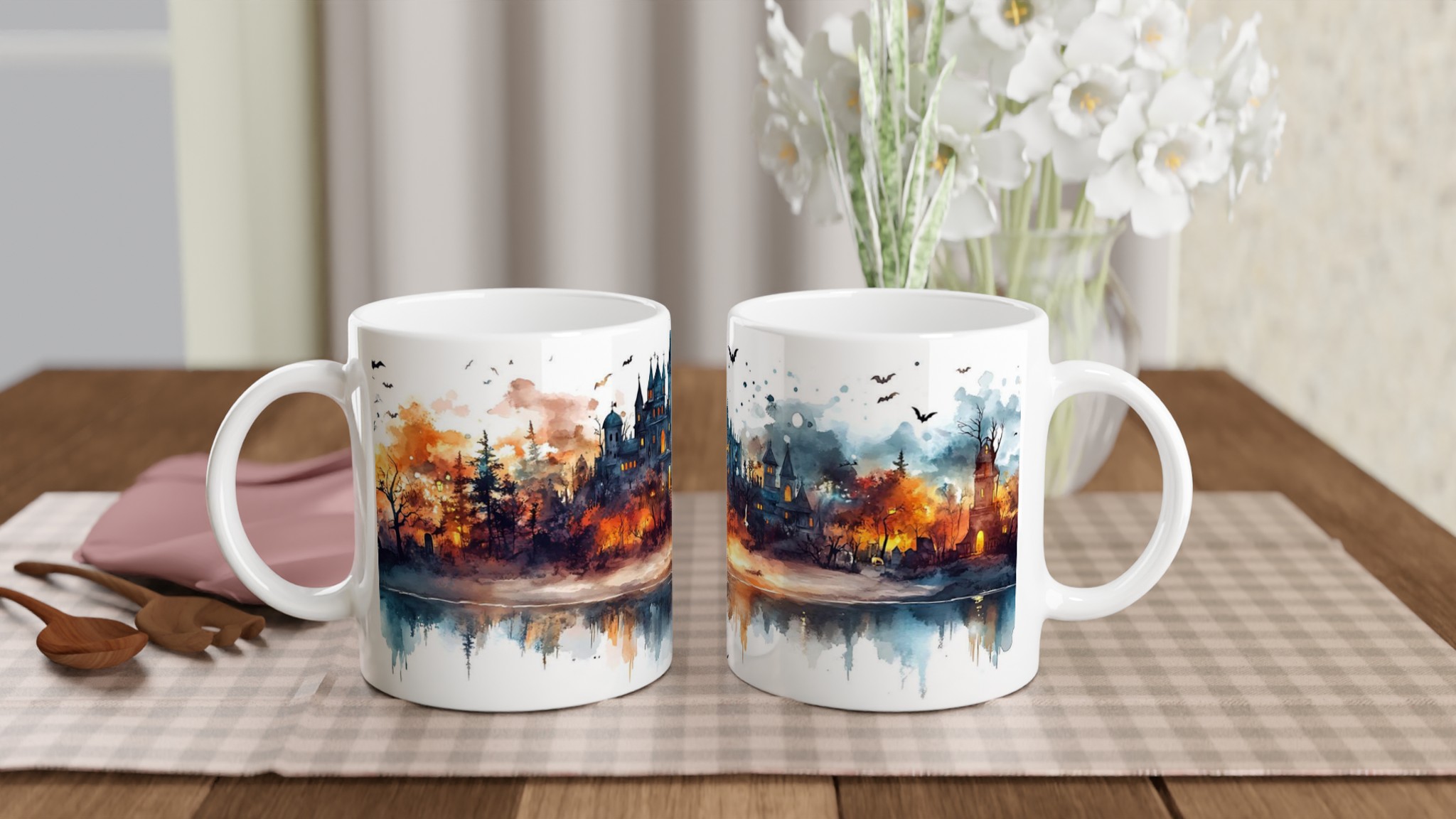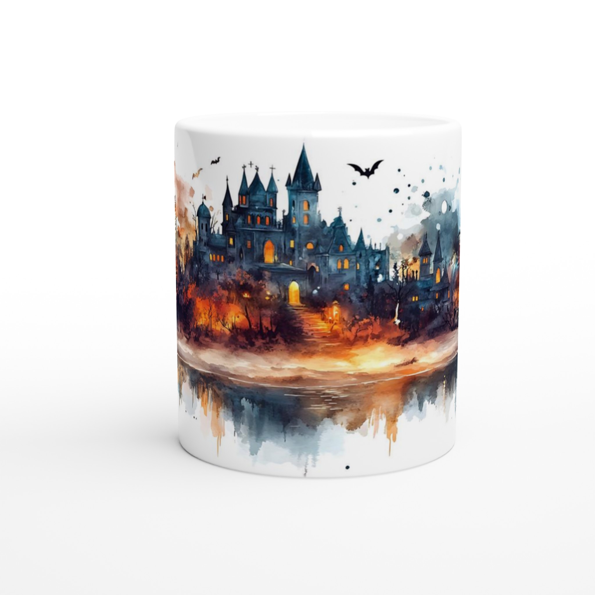 Haunted Castle Watercolor 11oz Ceramic Mug – Spooky Enchantment in Your Choice of Seven Hues
