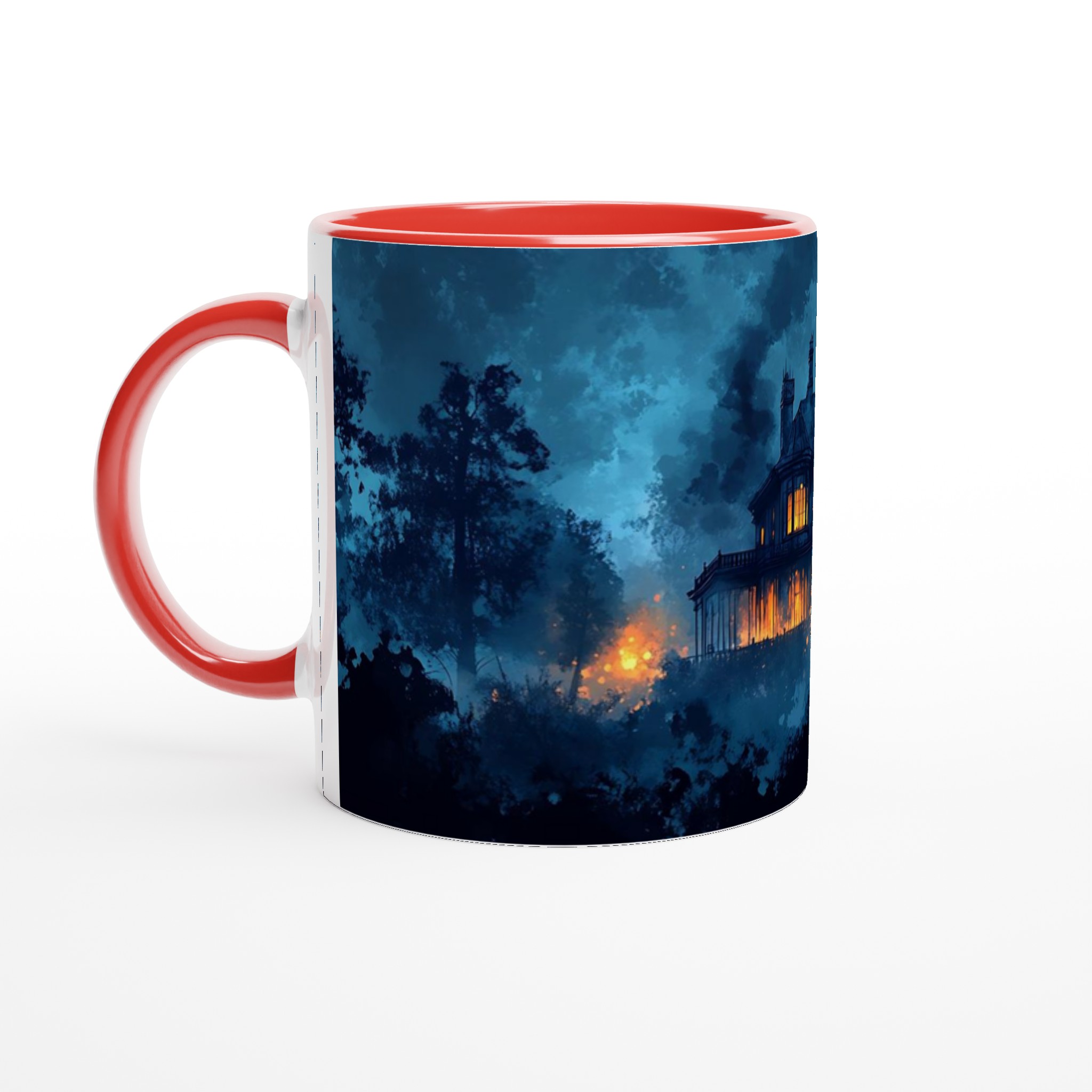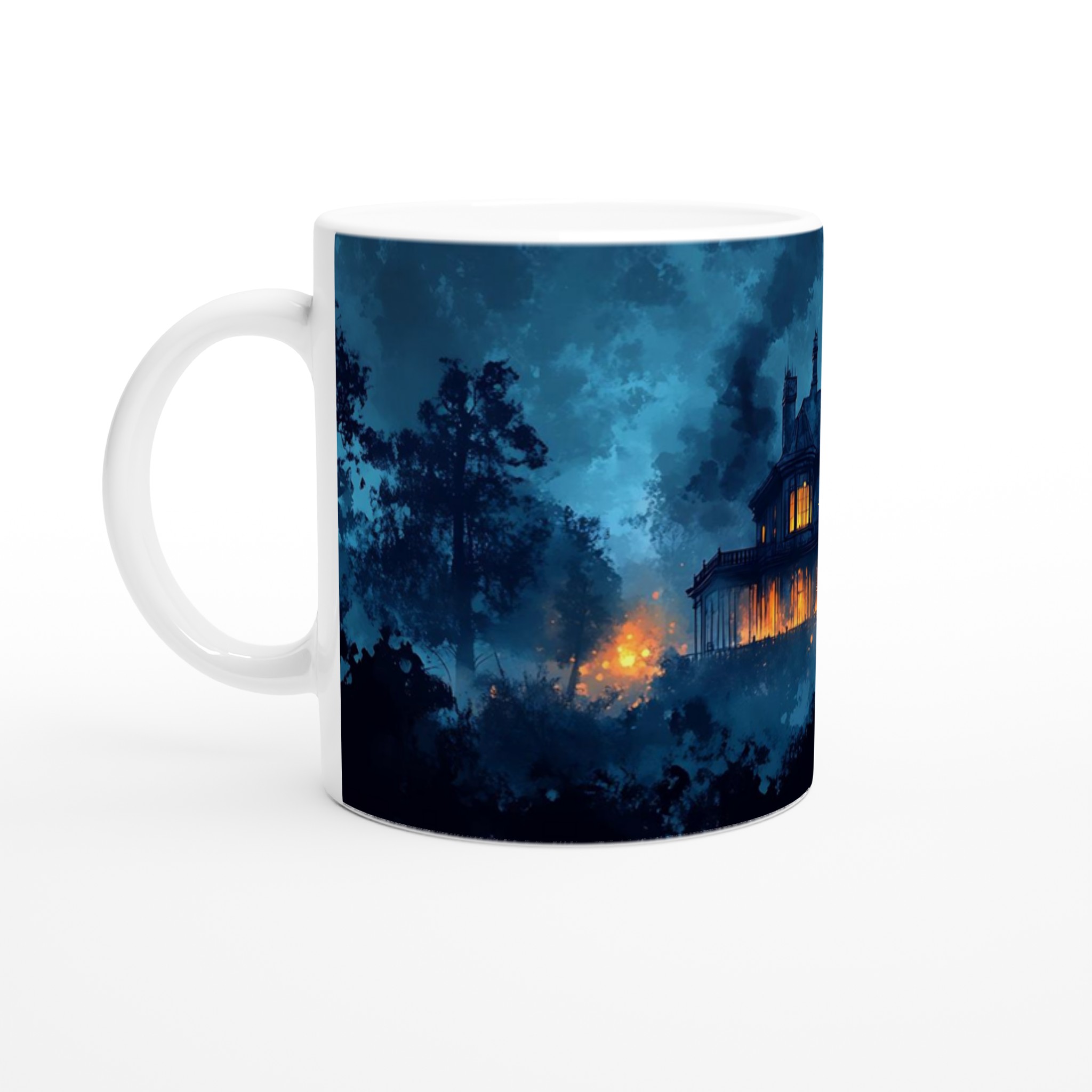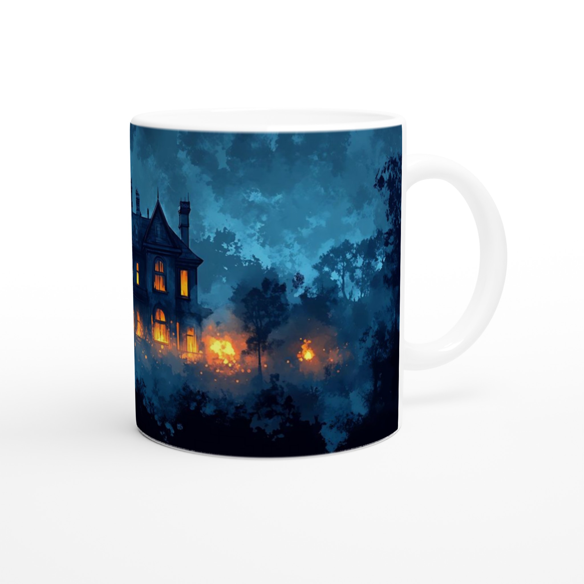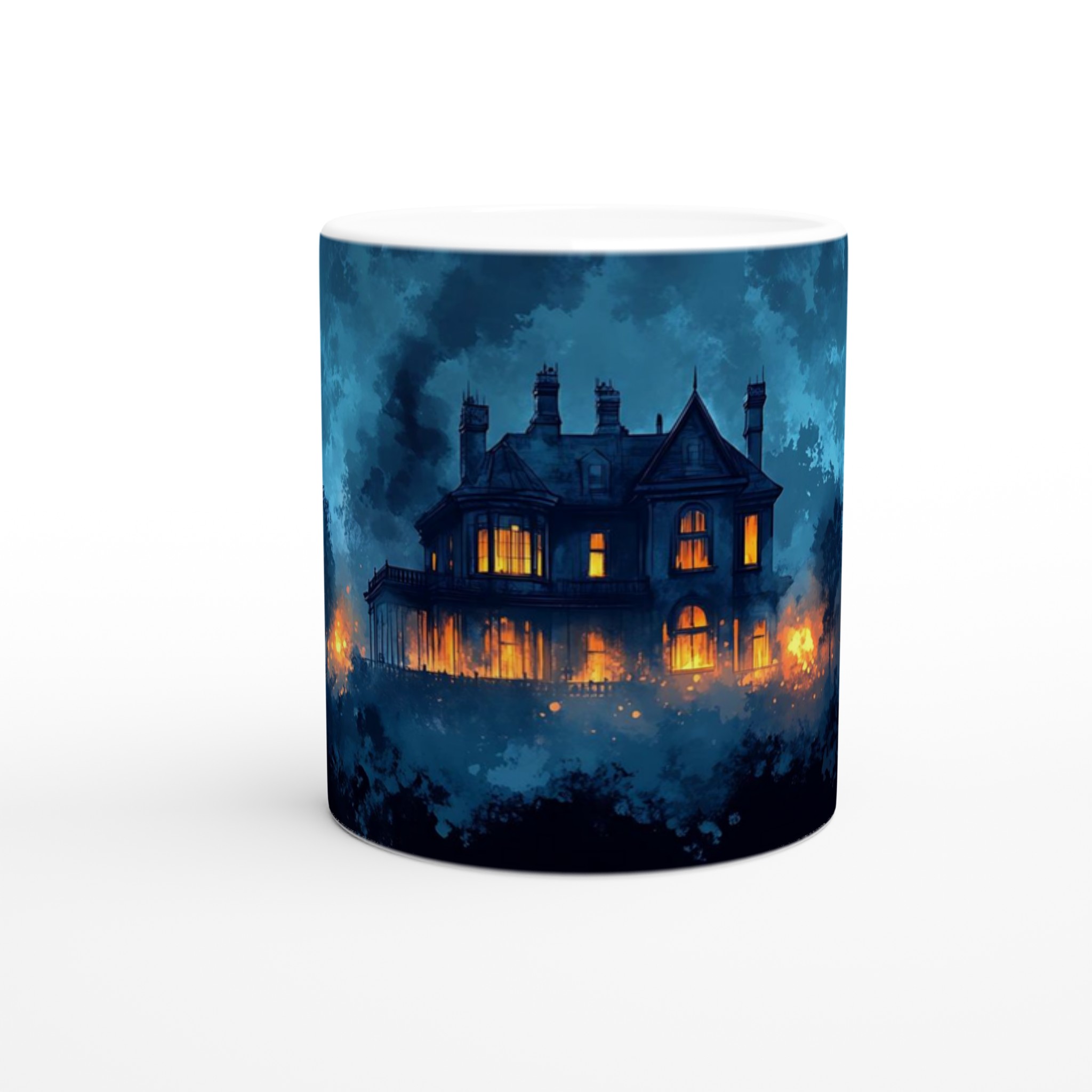 Eerie Haunted Mansion 11oz Ceramic Mug – Spooky Teal & Orange Art Coffee Cup