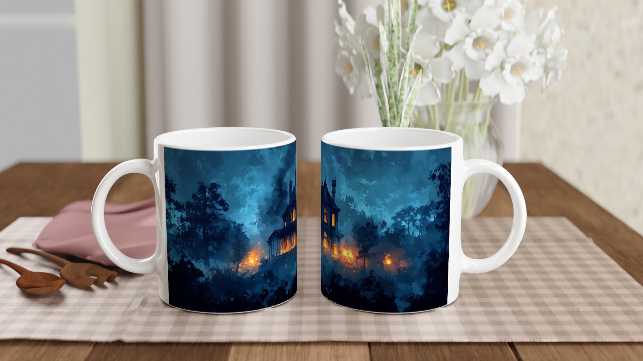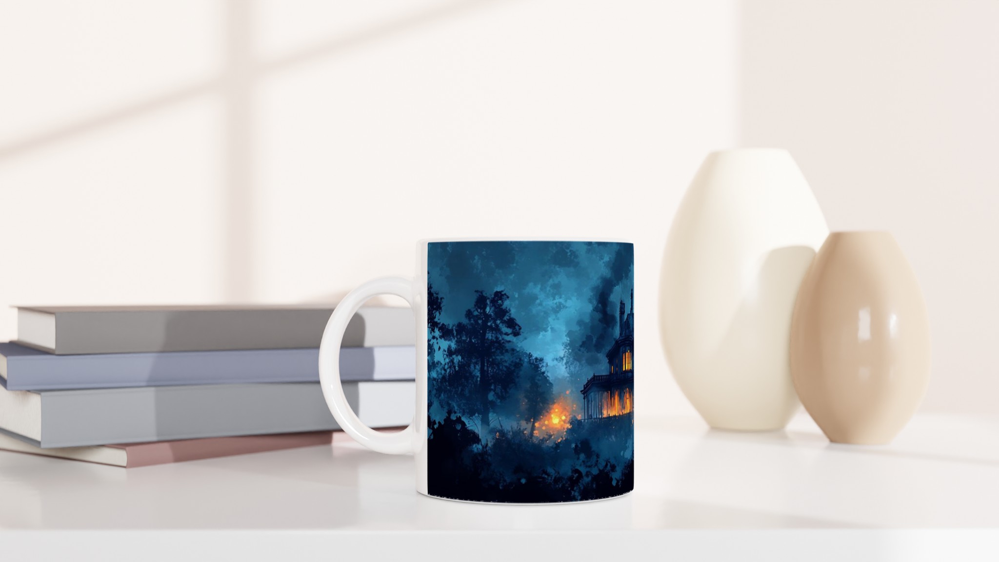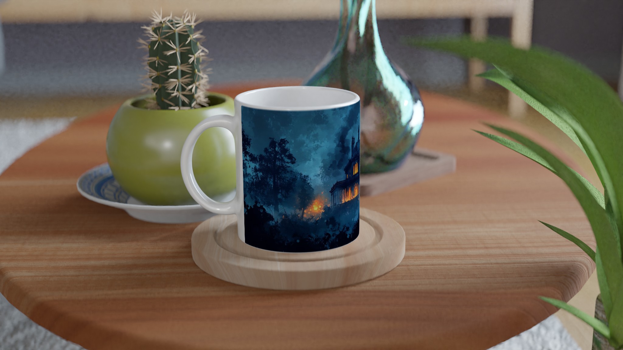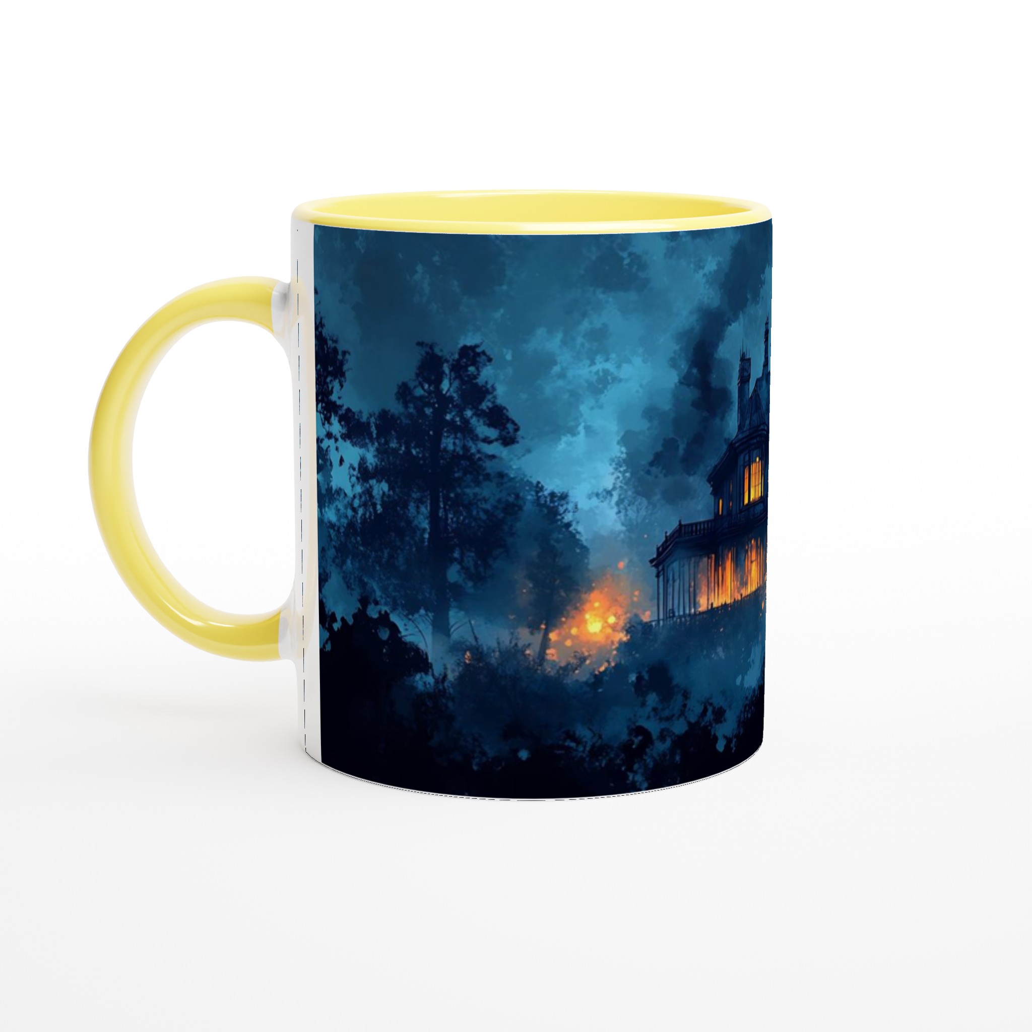 Eerie Haunted Mansion 11oz Ceramic Mug – Spooky Teal & Orange Art Coffee Cup