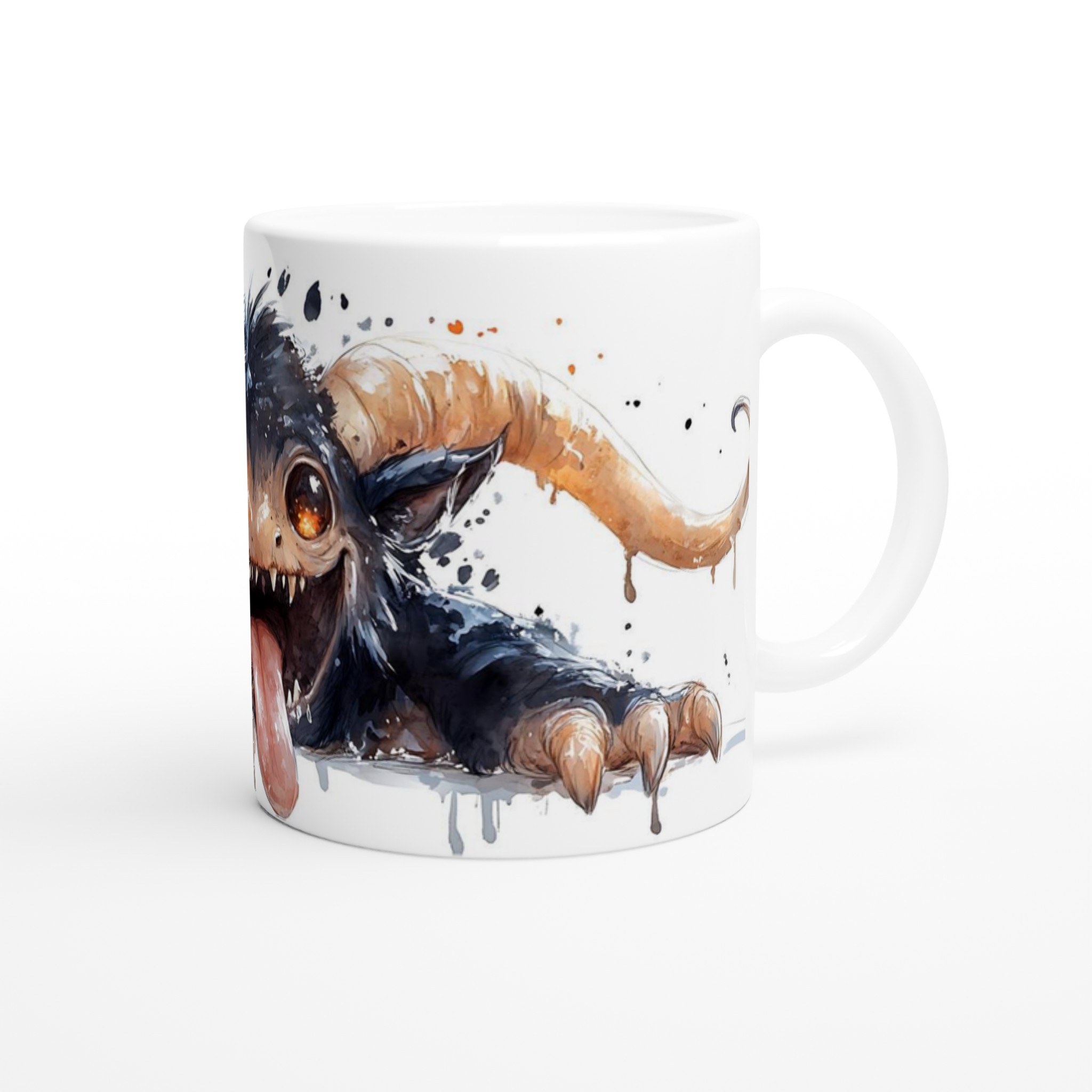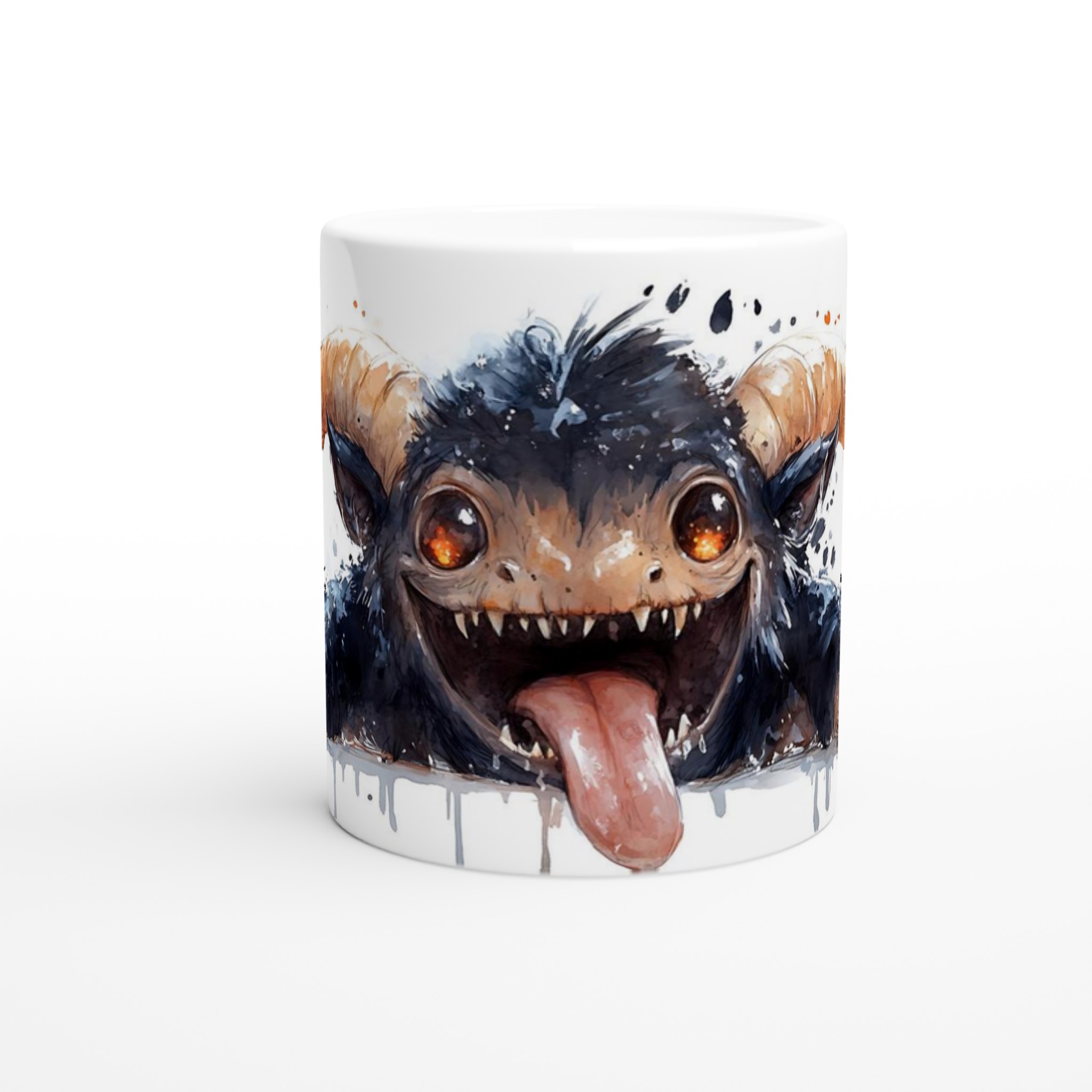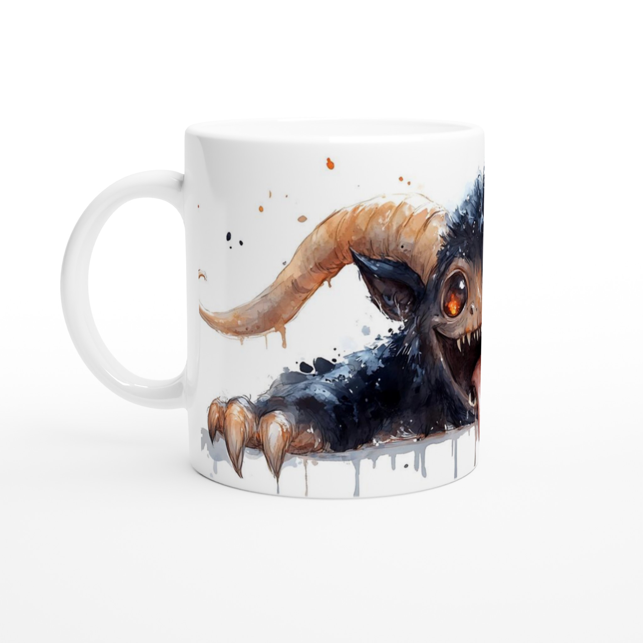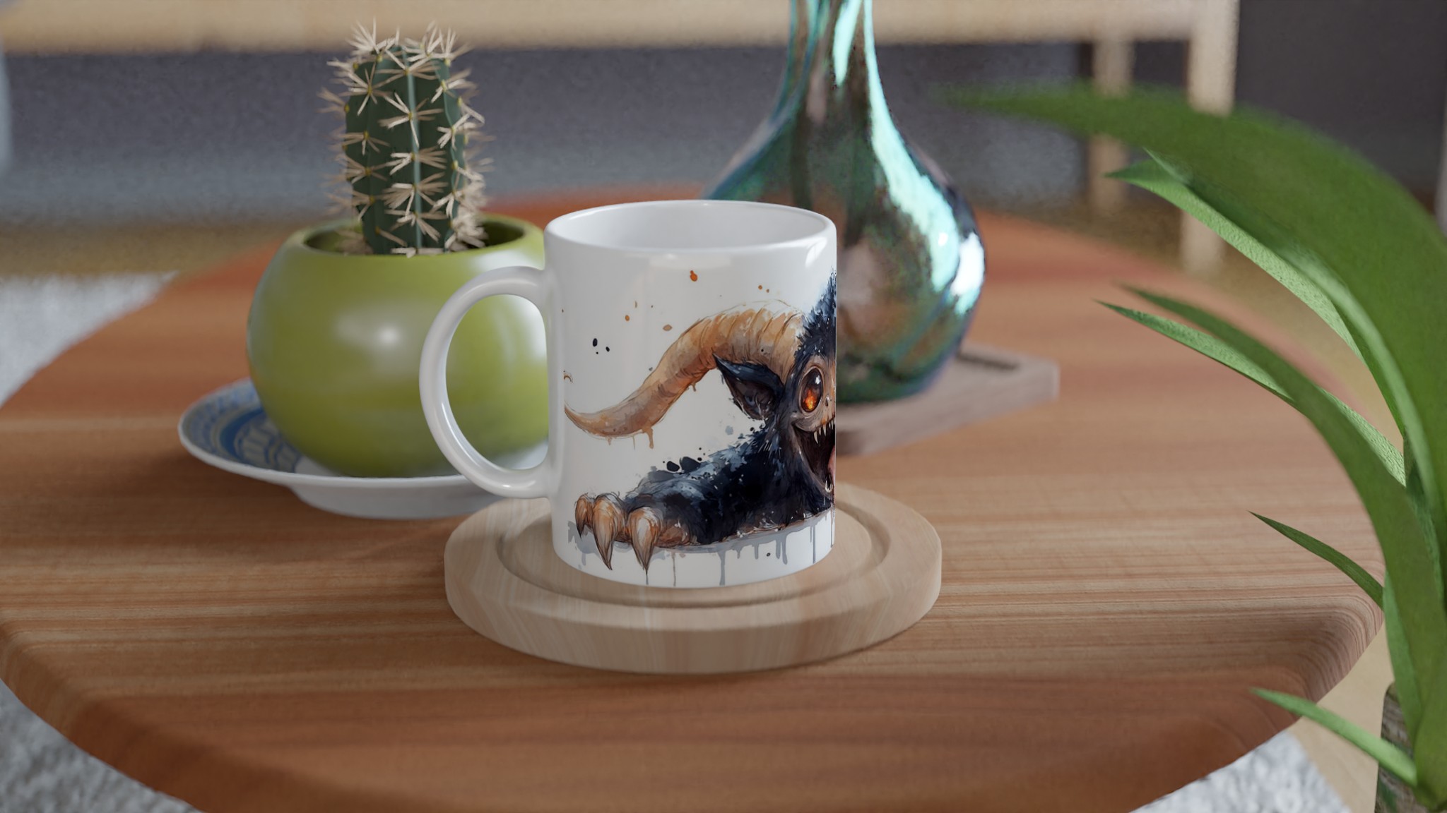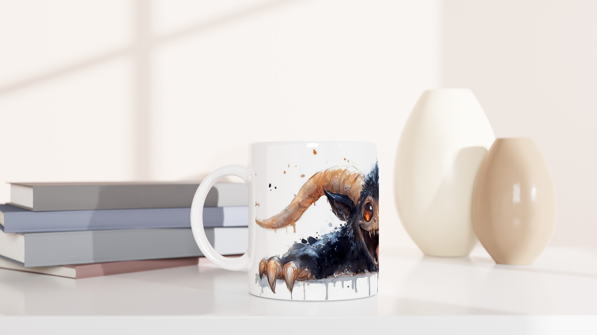 Charming Horned Monster 11oz Ceramic Mug – Whimsical Watercolor Creature Coffee Cup in Your Choice of Seven Vibrant Hues
