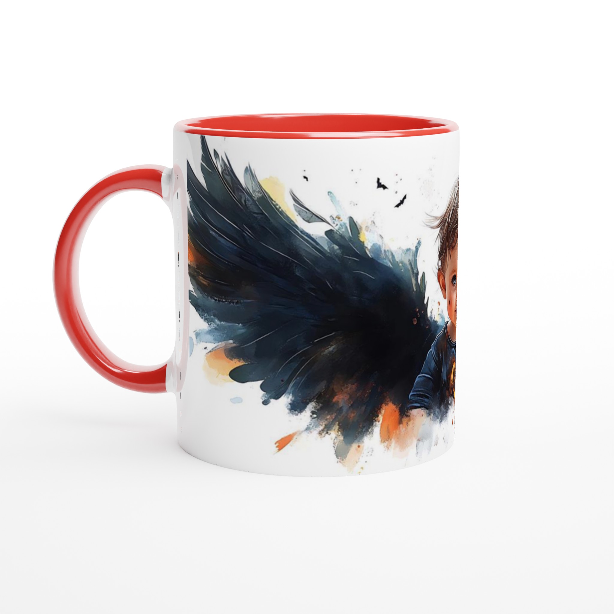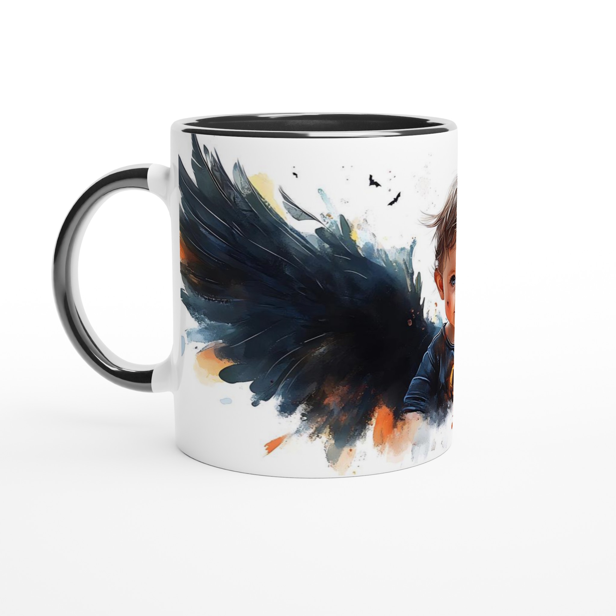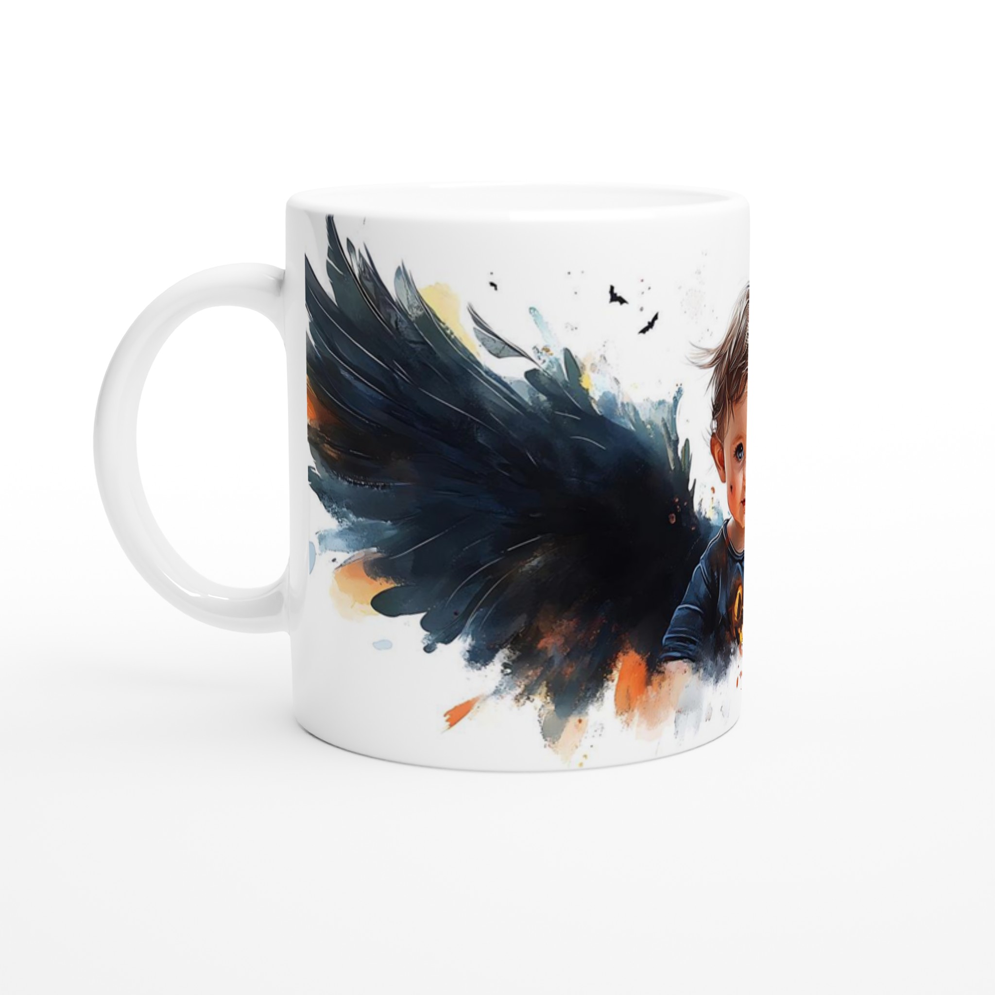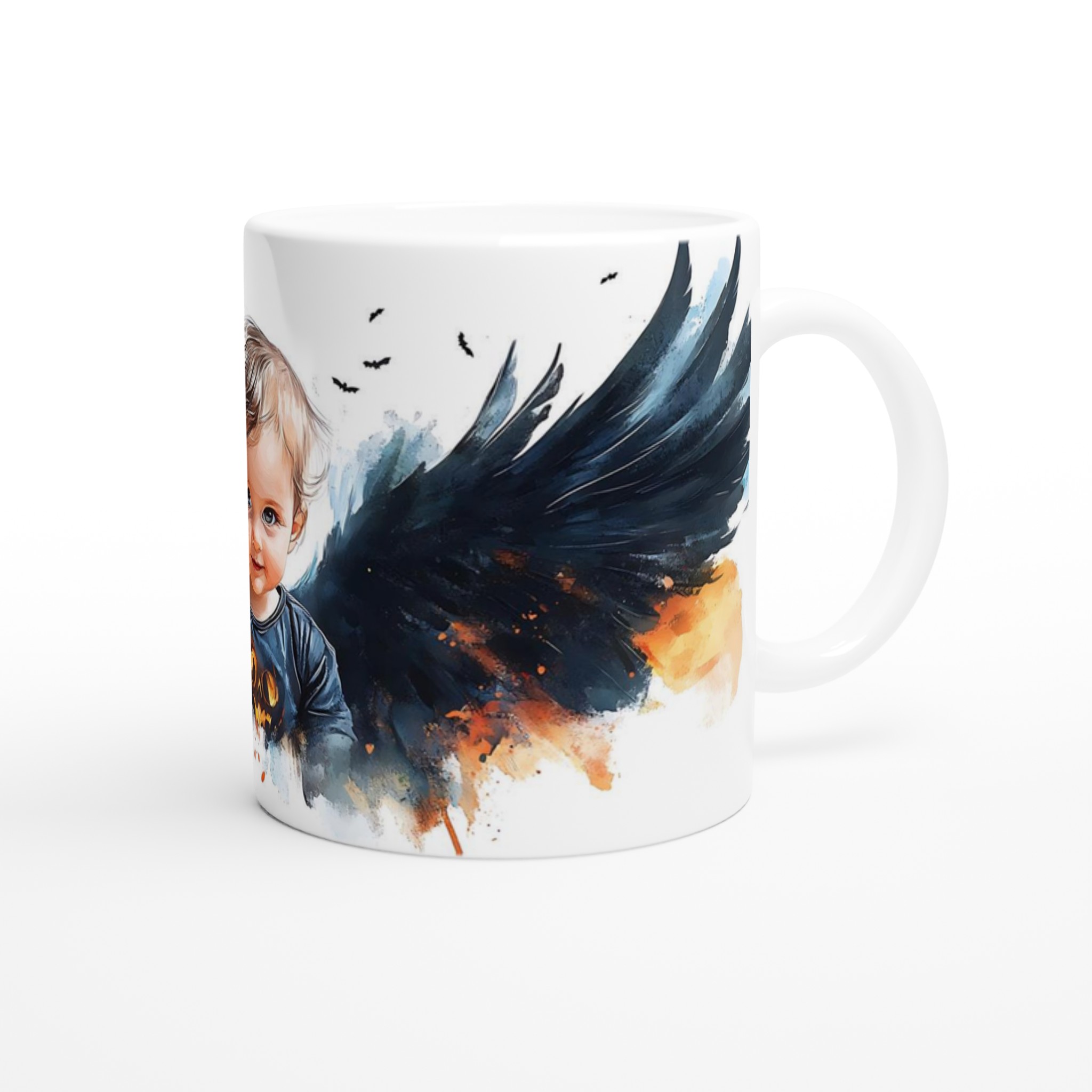Little Halloween Angel Mug: Whimsical Watercolor Baby with Dark Wings in Your Choice of Seven Ceramic Colors