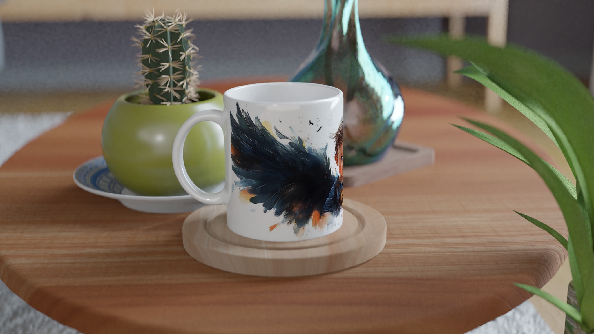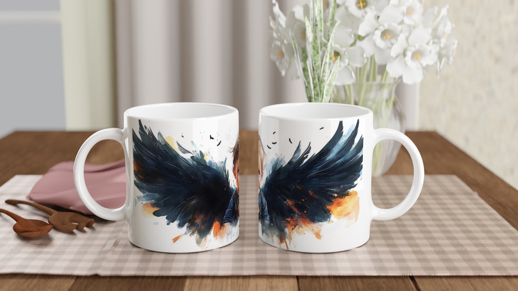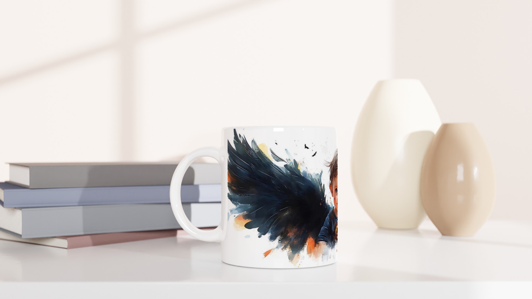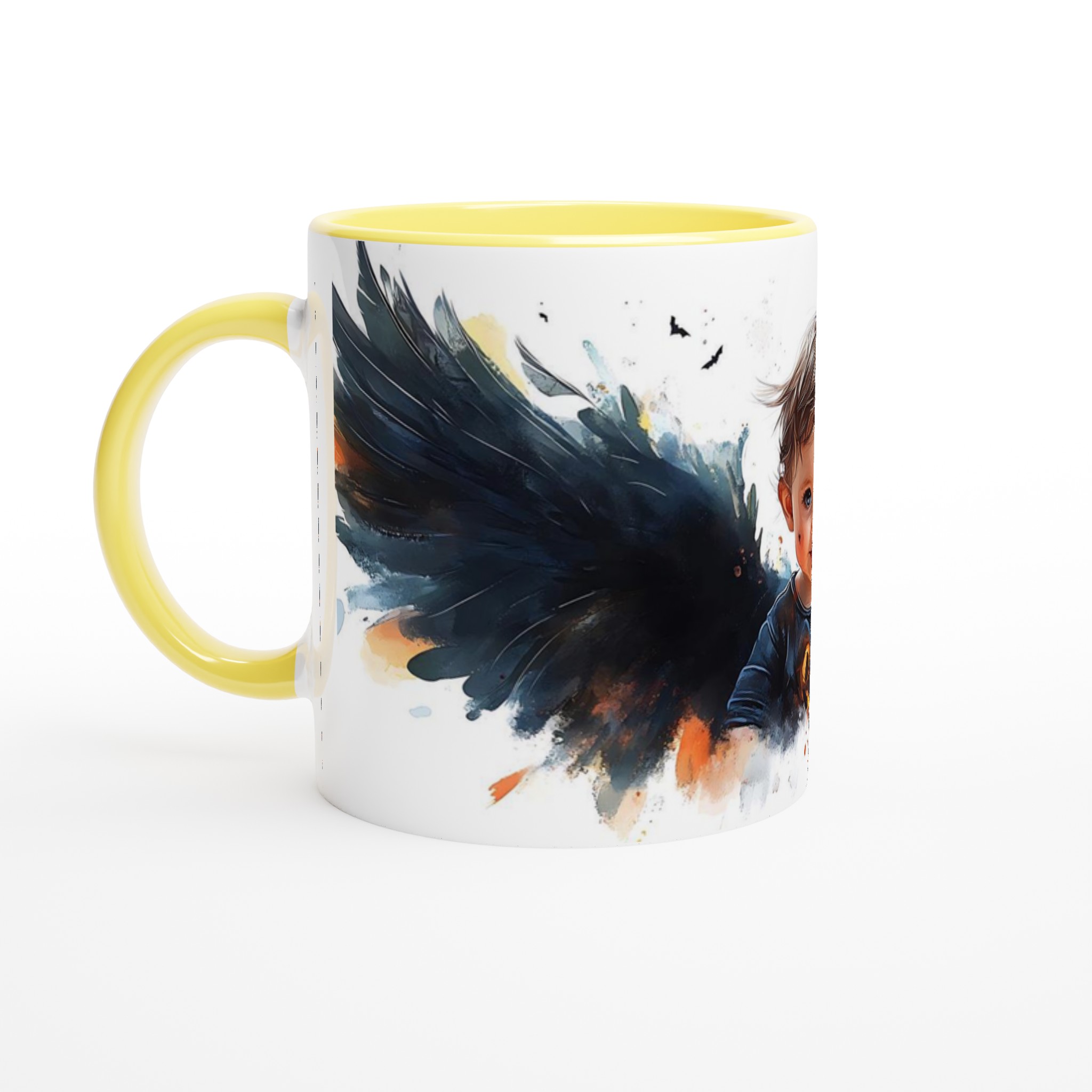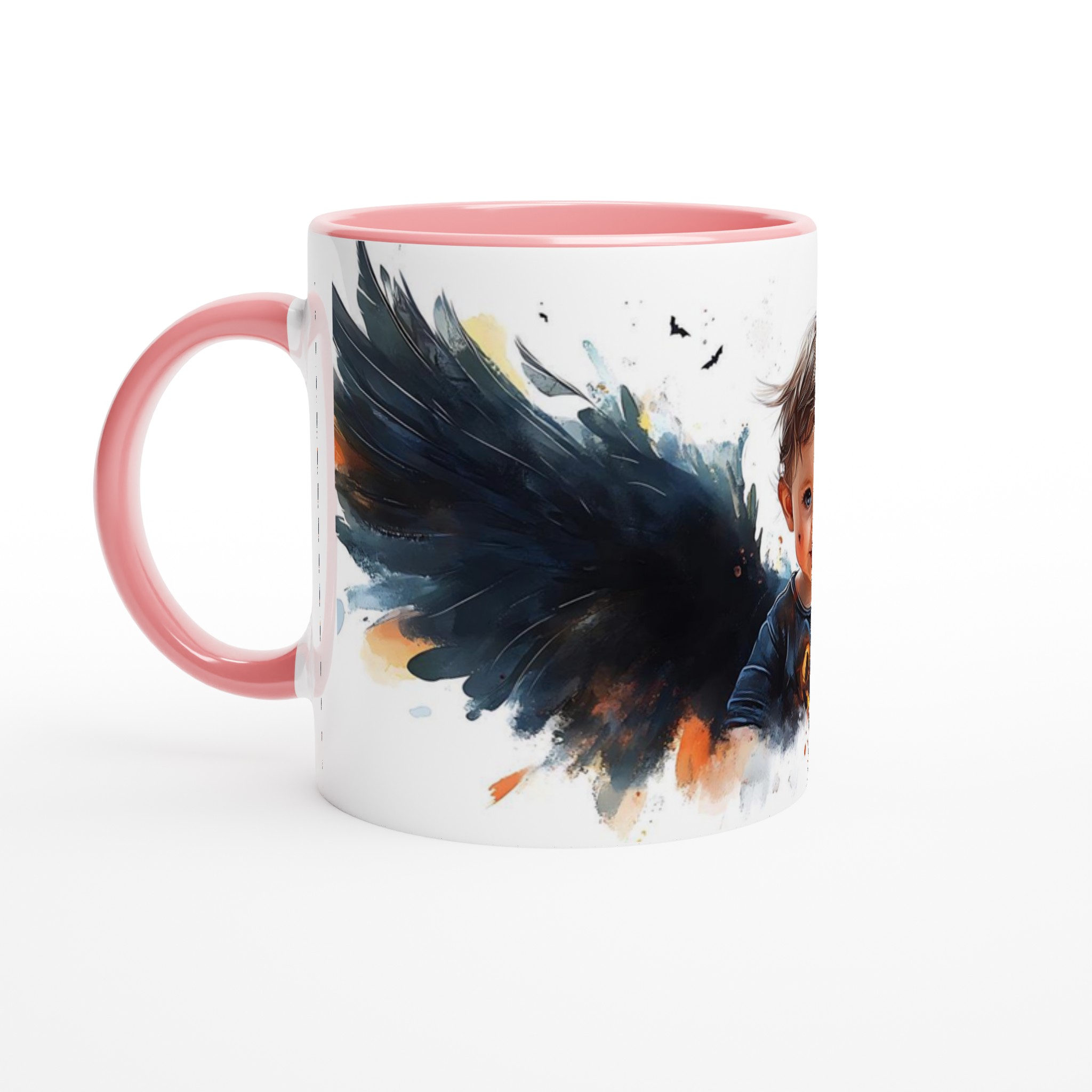 Little Halloween Angel Mug: Whimsical Watercolor Baby with Dark Wings in Your Choice of Seven Ceramic Colors