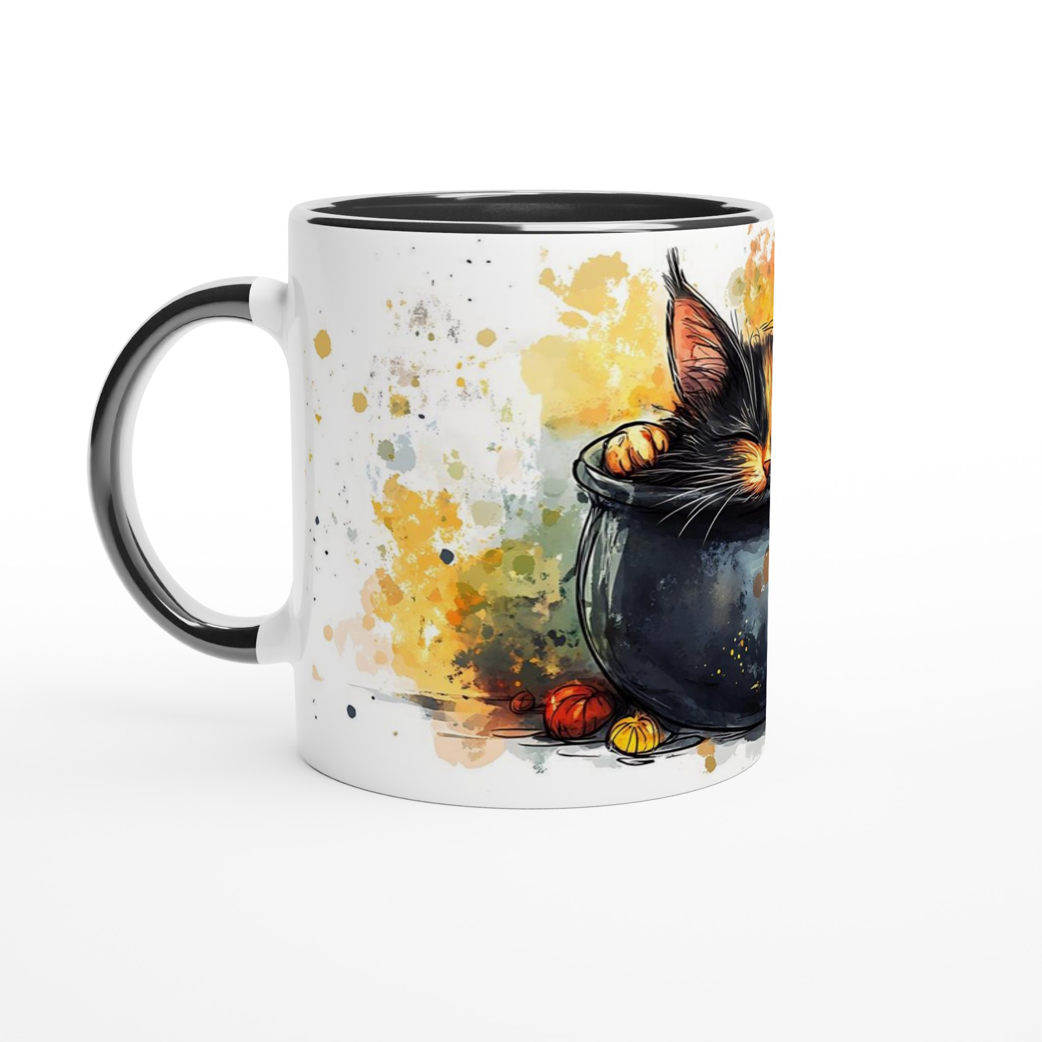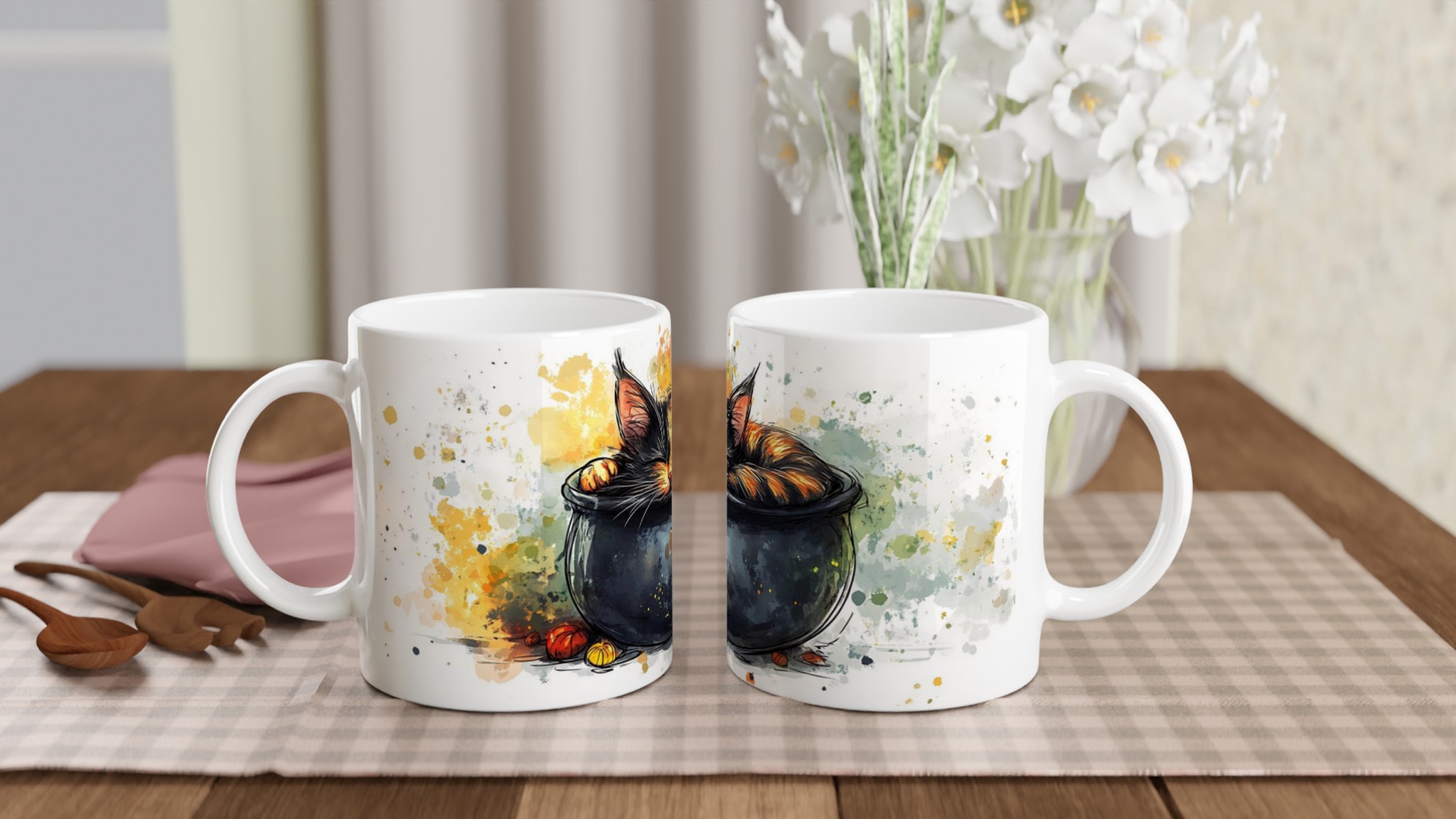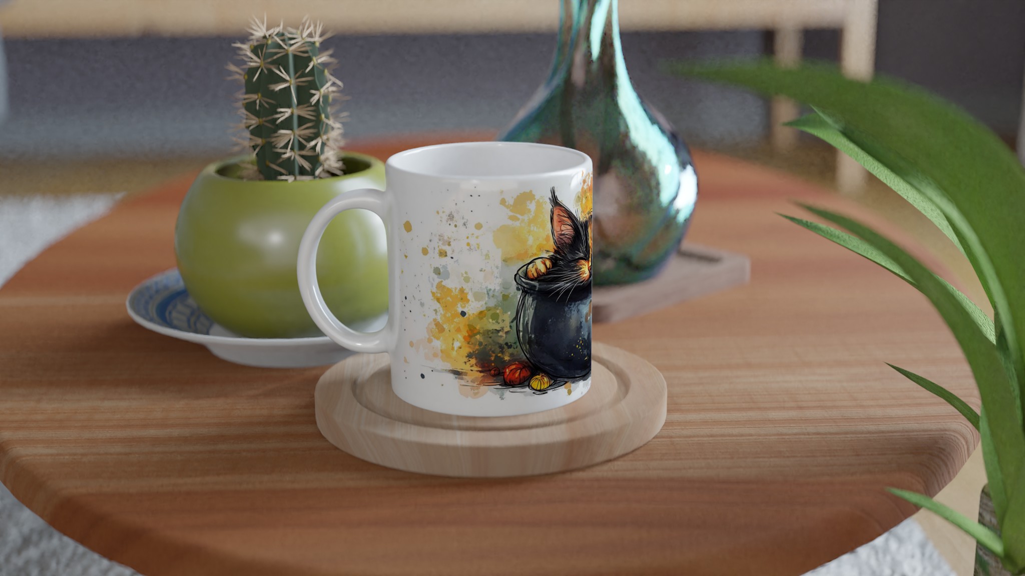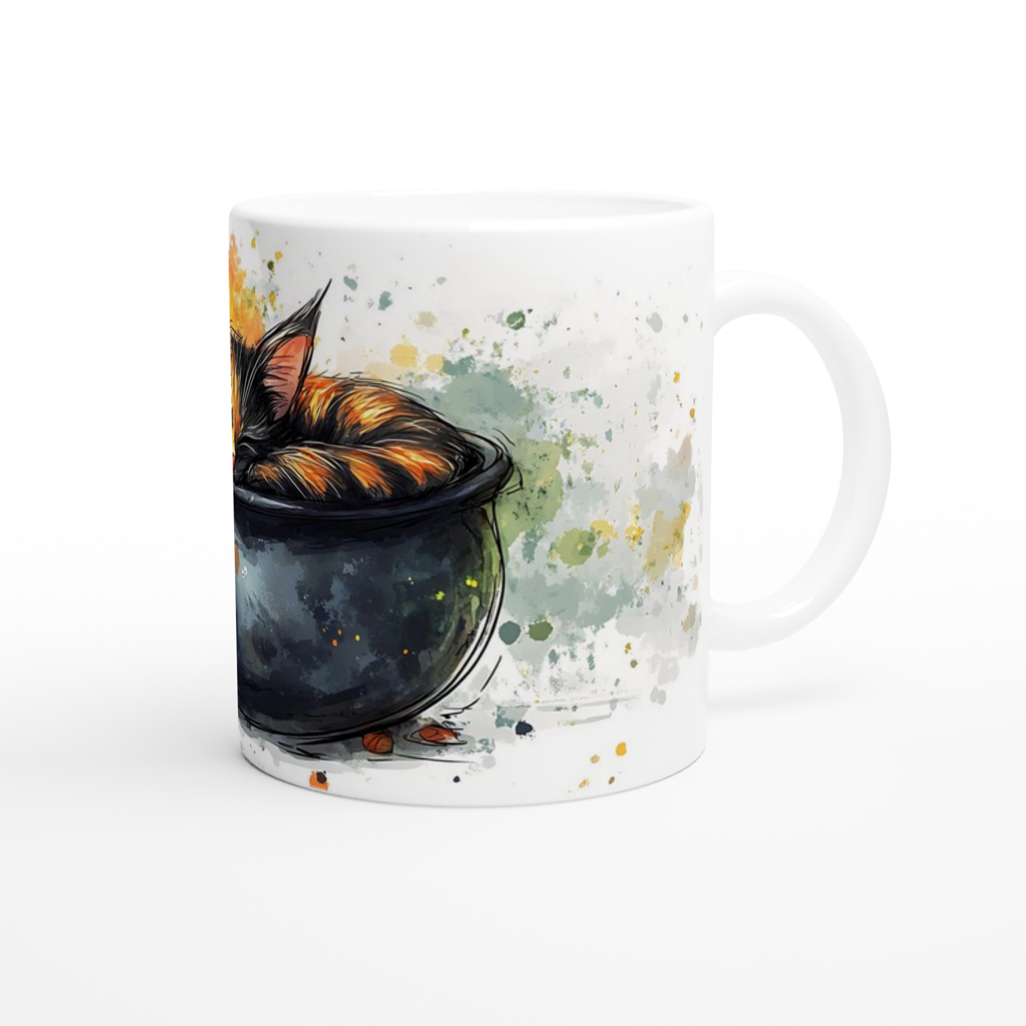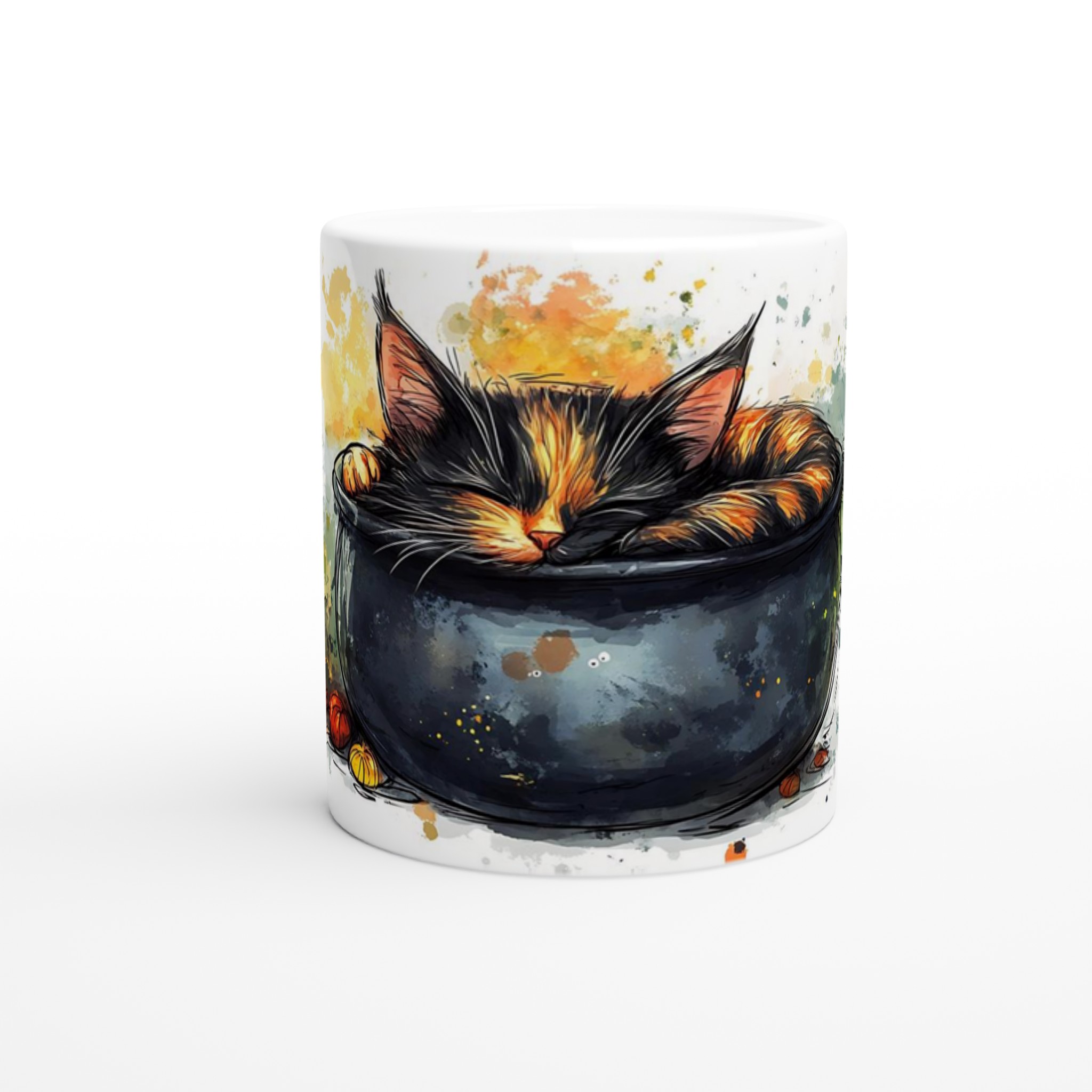 Cozy Calico Cat in Cauldron Ceramic Mug – Whimsical Watercolor Art for Your Favorite Brew