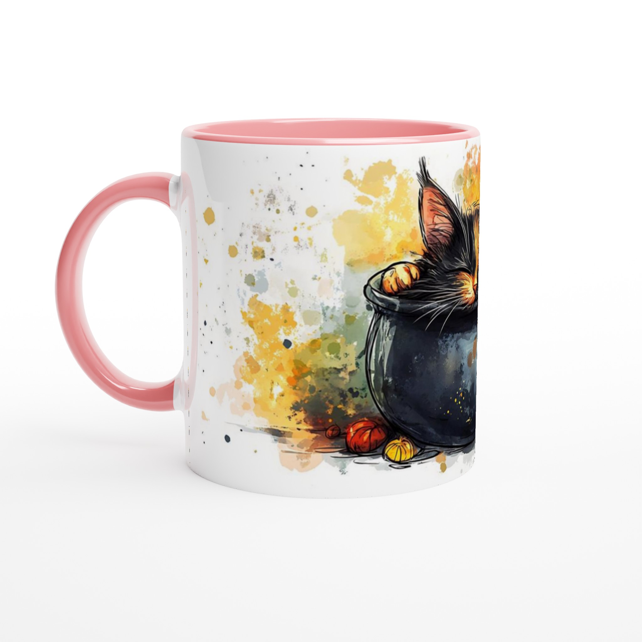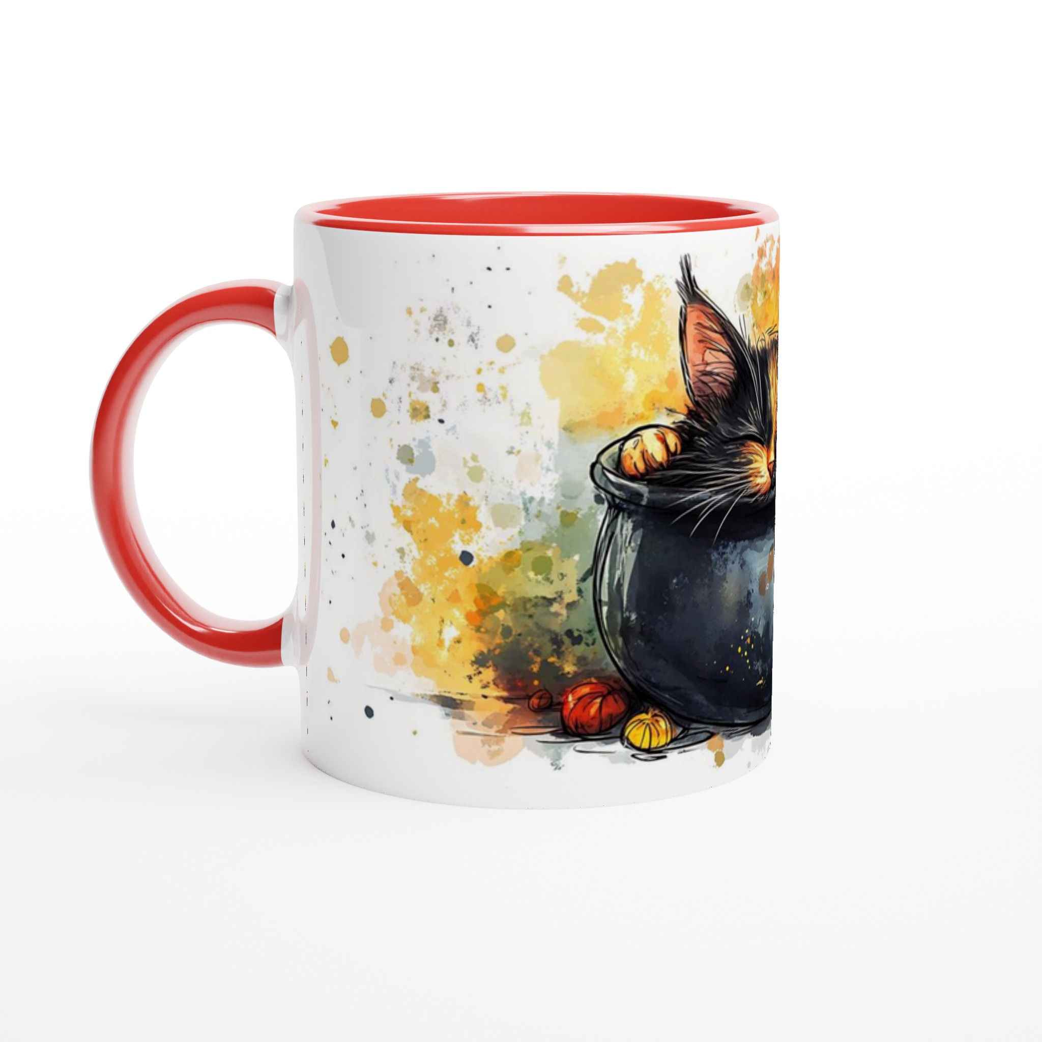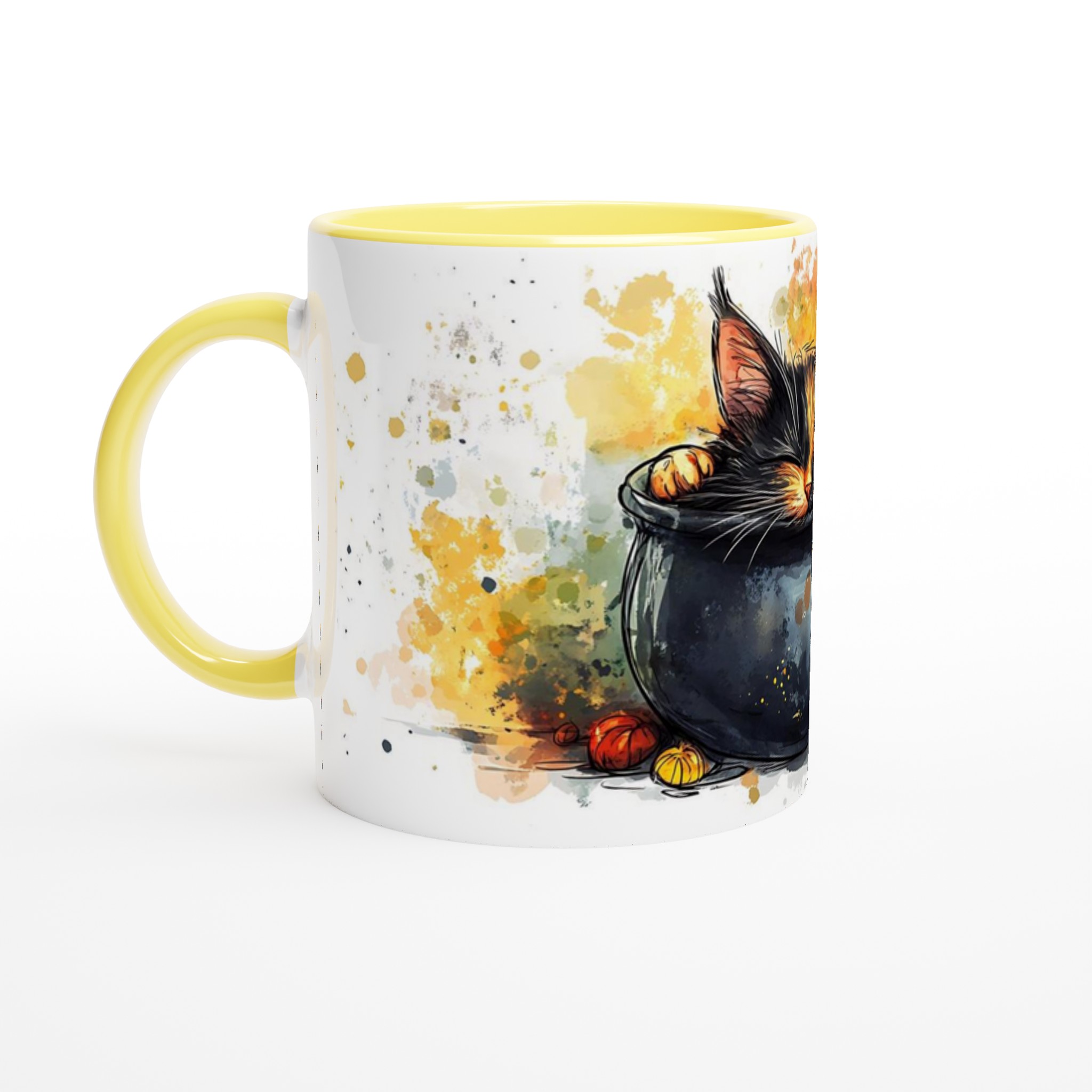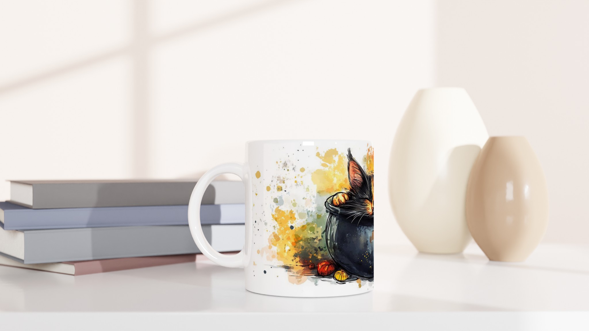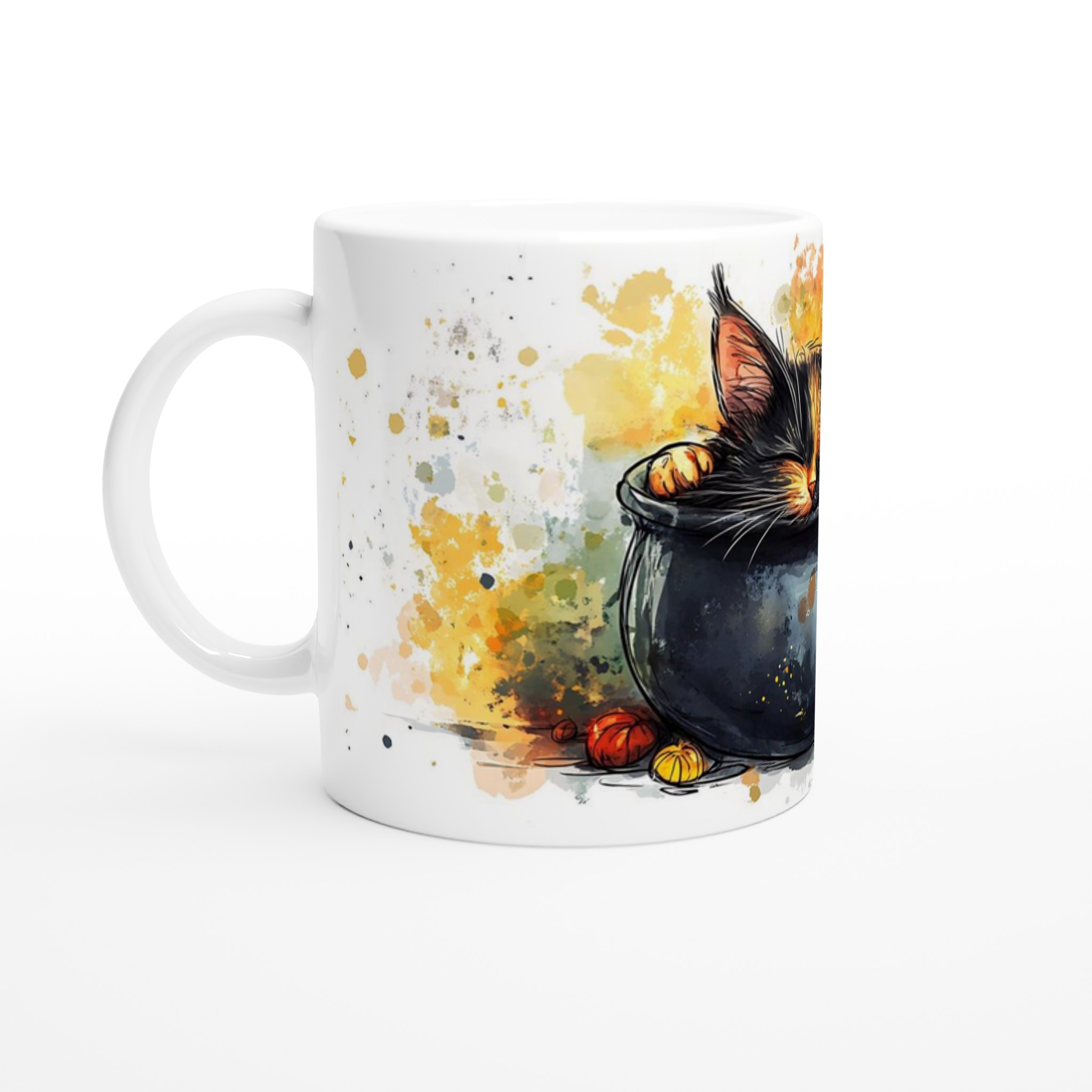 Cozy Calico Cat in Cauldron Ceramic Mug – Whimsical Watercolor Art for Your Favorite Brew
