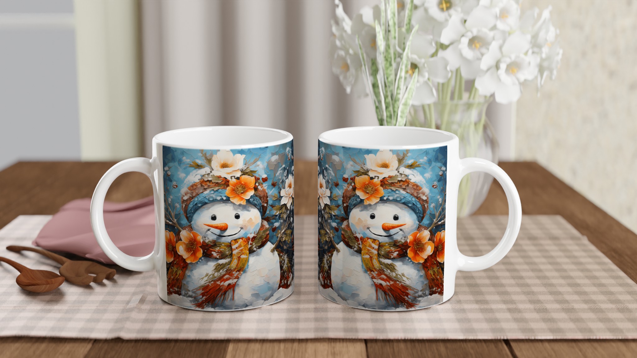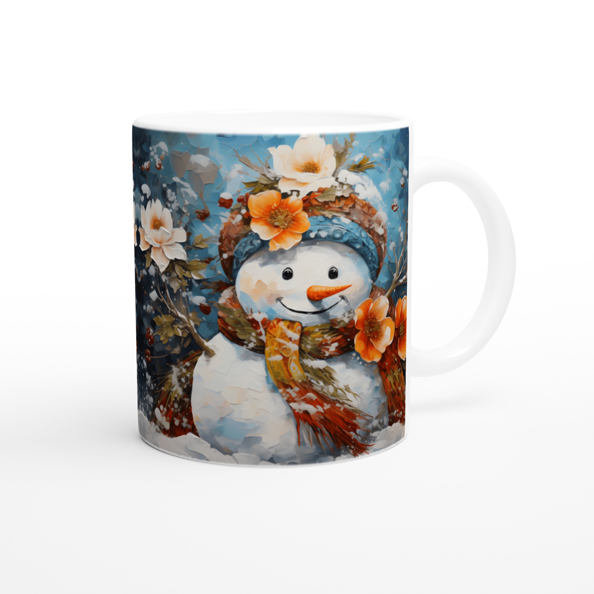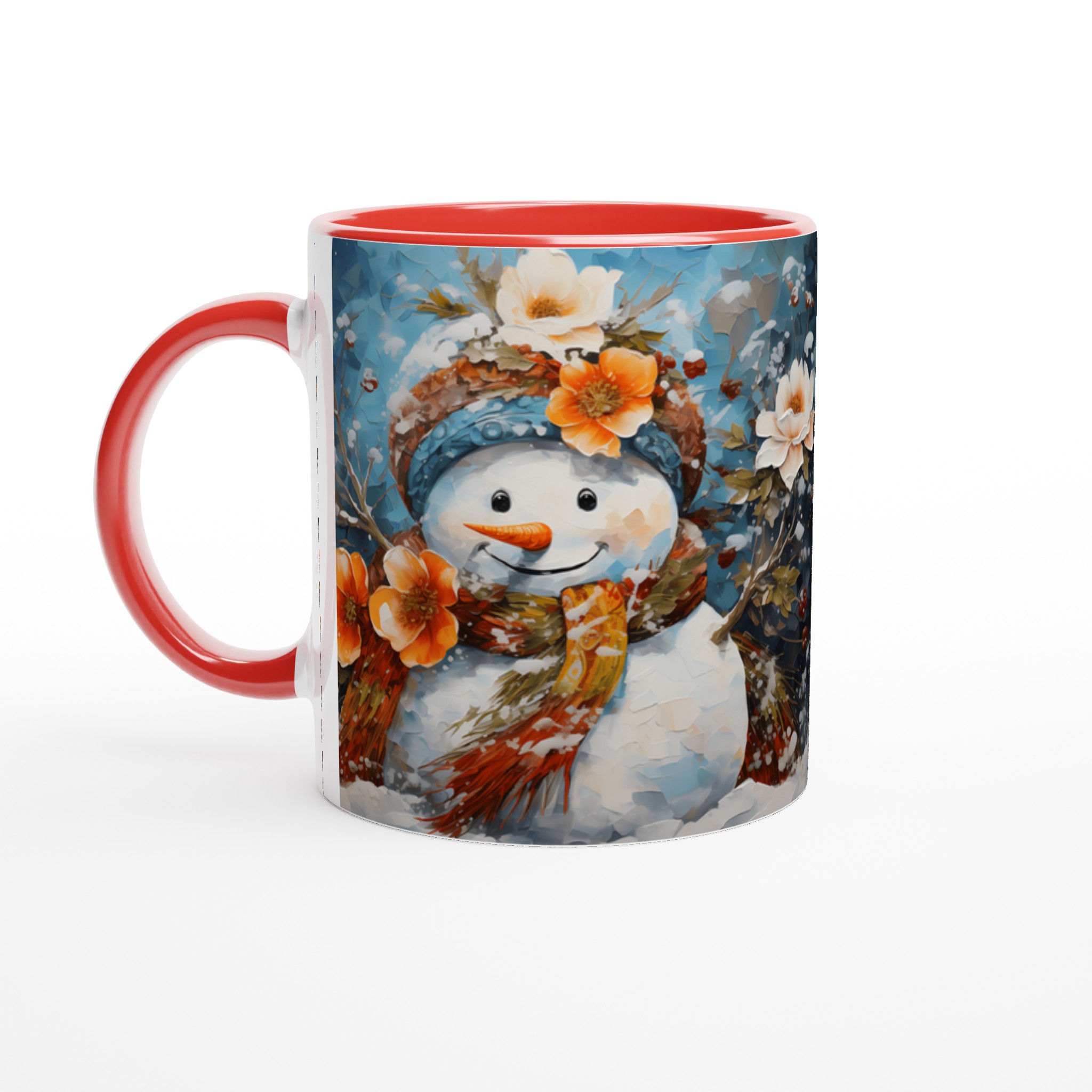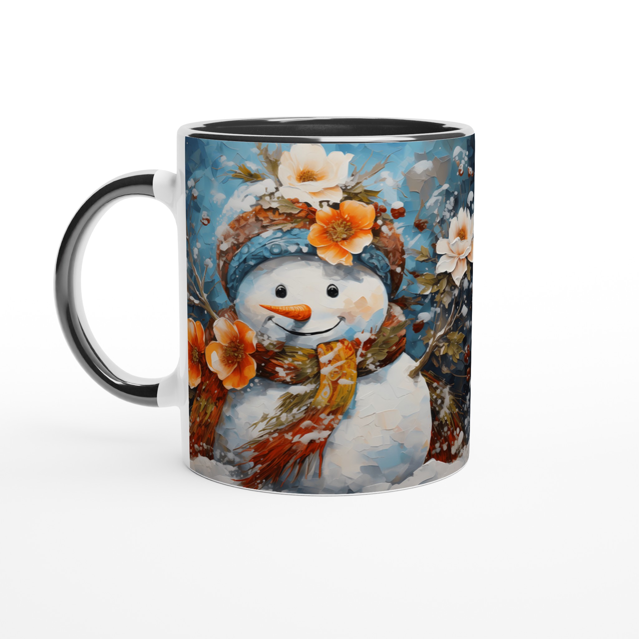 Charming Winter Snowman Art 11oz Ceramic Mug – Festive Floral Design in Your Choice of Seven Hues