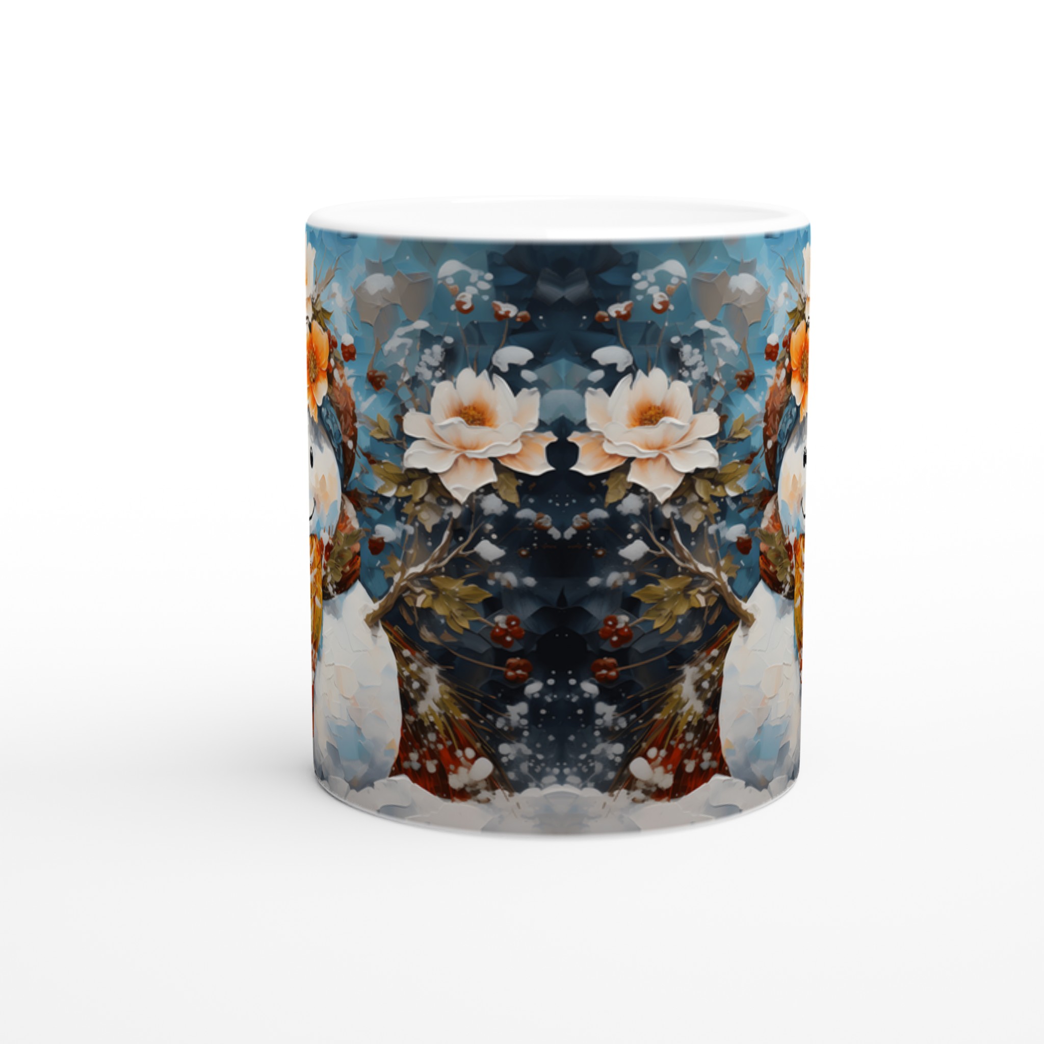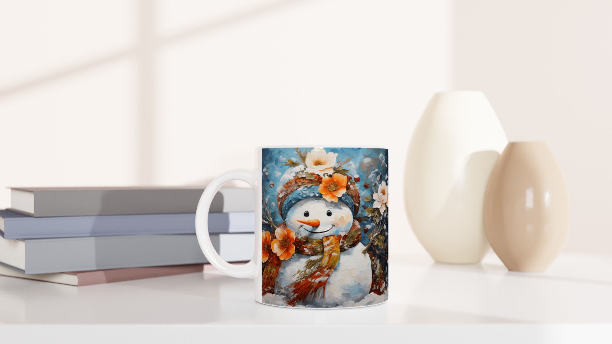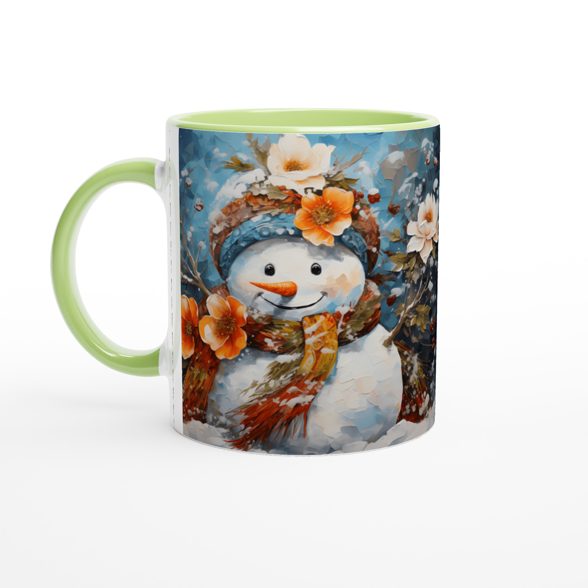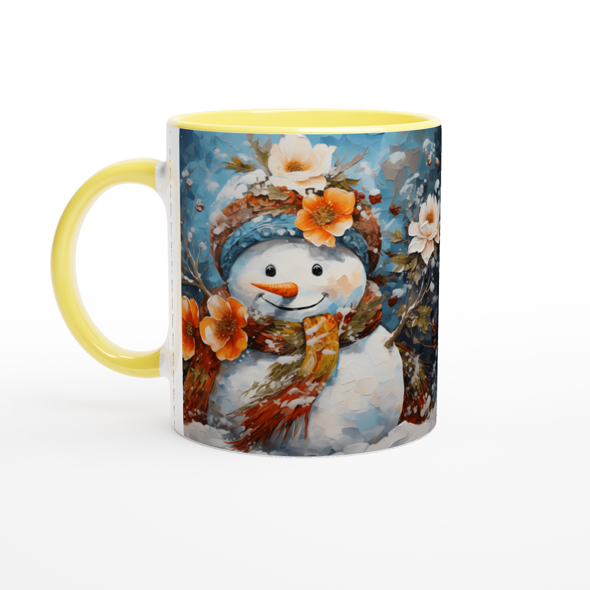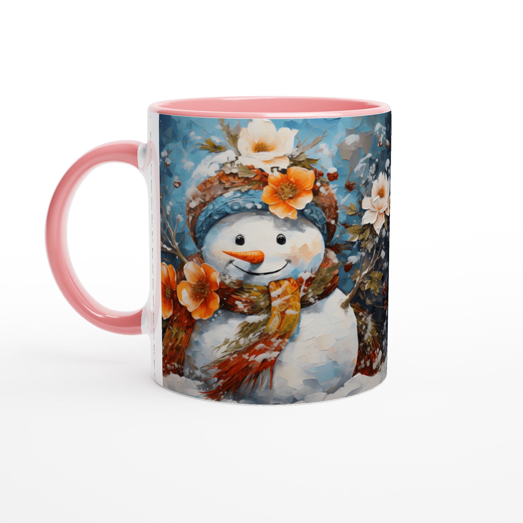 Charming Winter Snowman Art 11oz Ceramic Mug – Festive Floral Design in Your Choice of Seven Hues