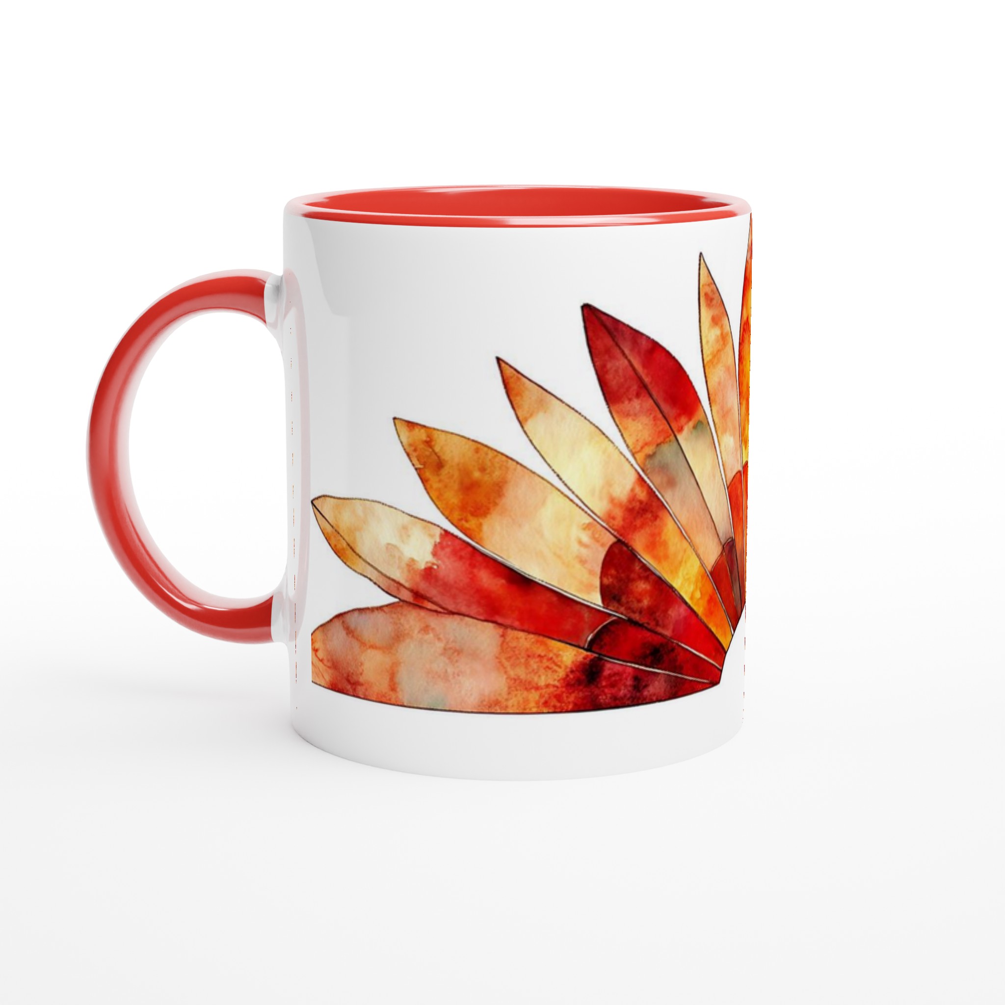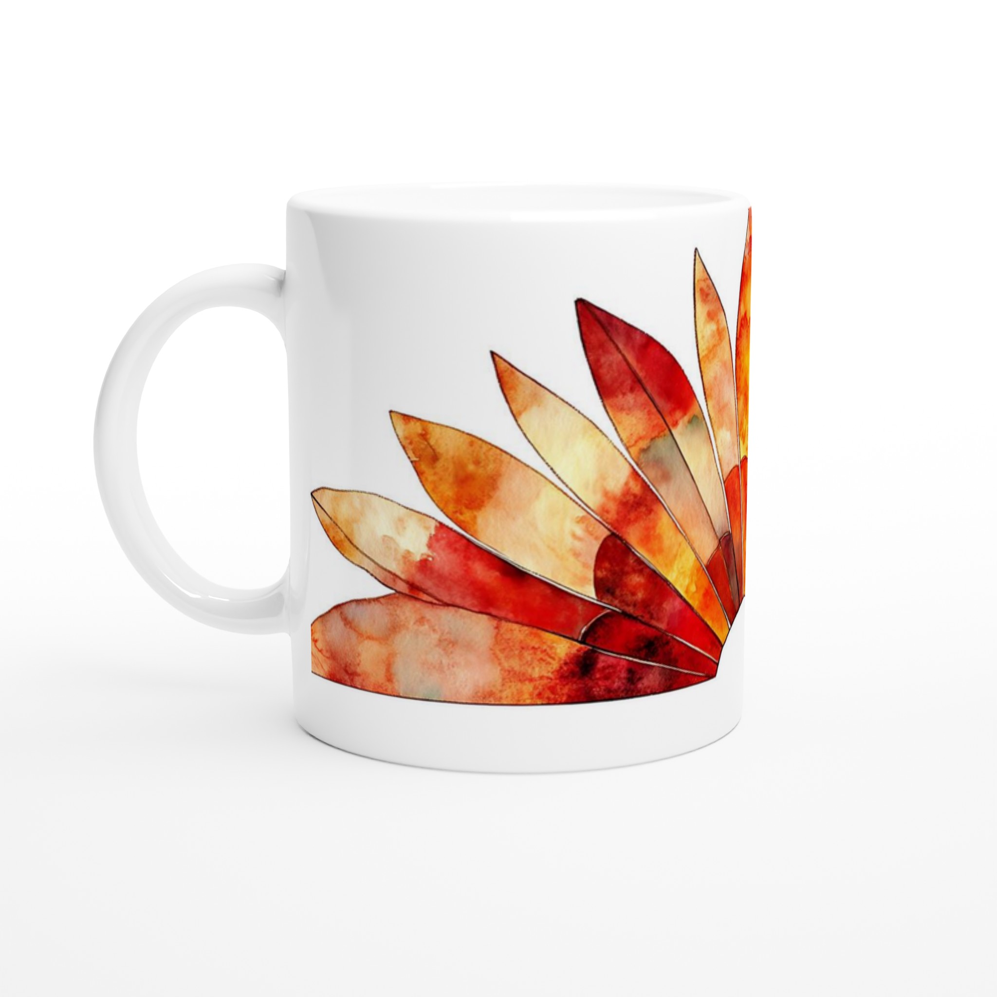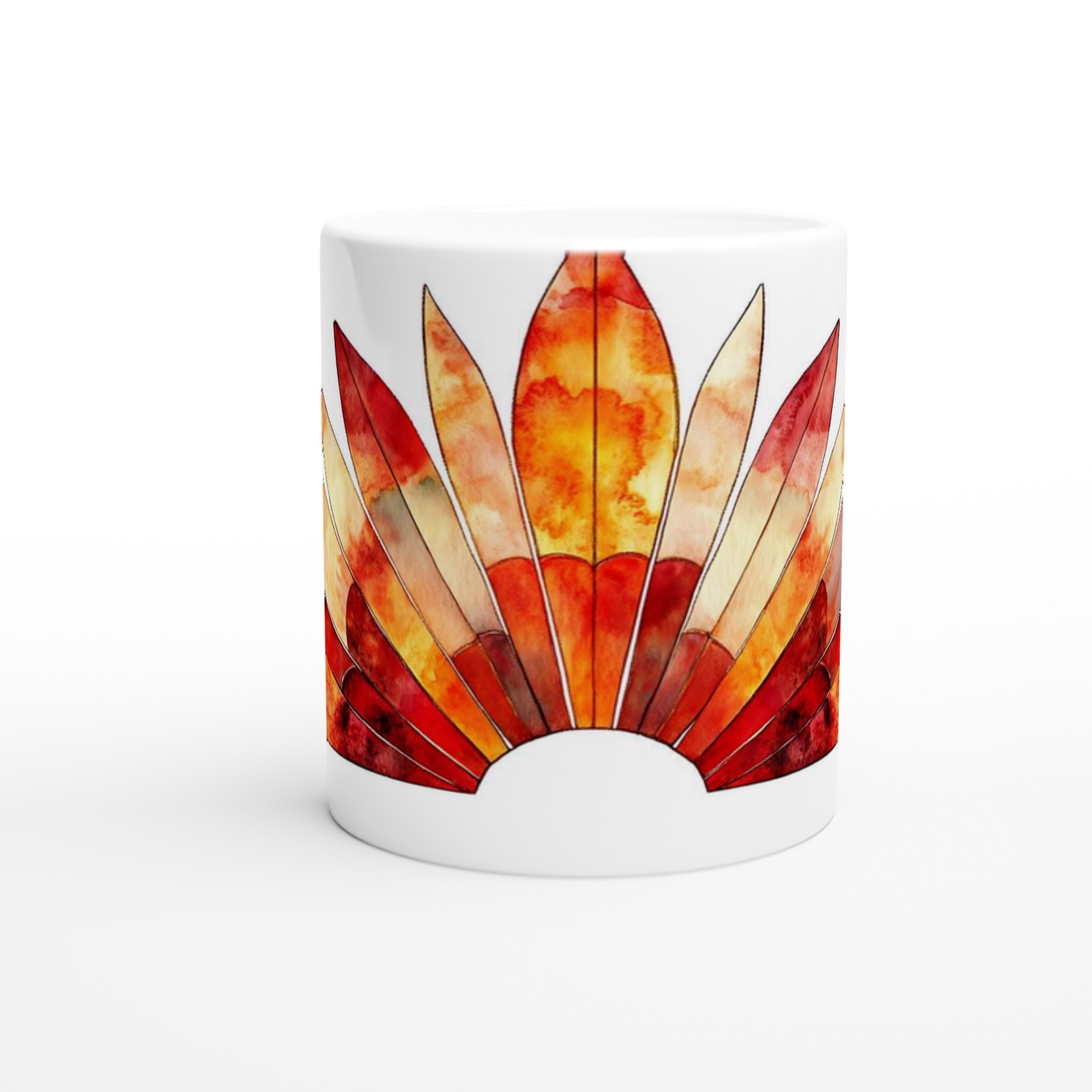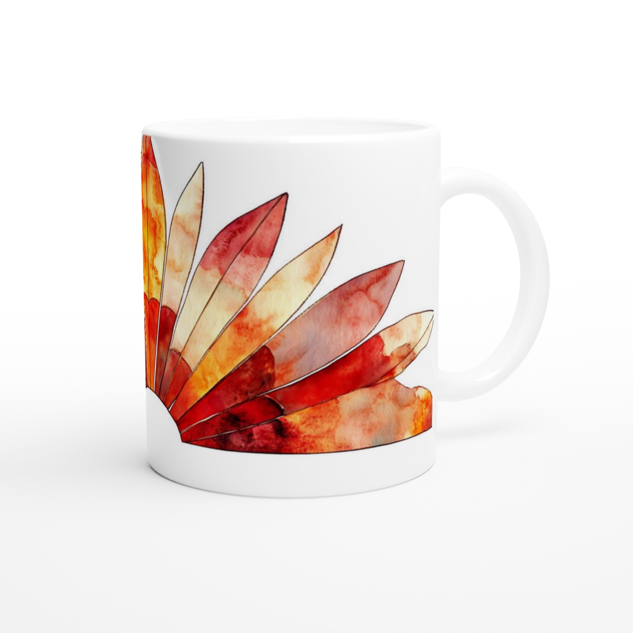 Fiery Sunset Feathers – White Ceramic Mug 11oz, in your choice of seven vibrant colors