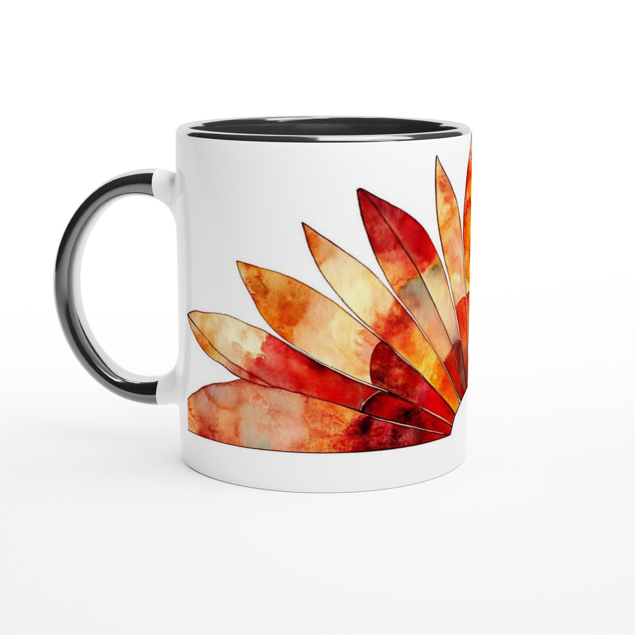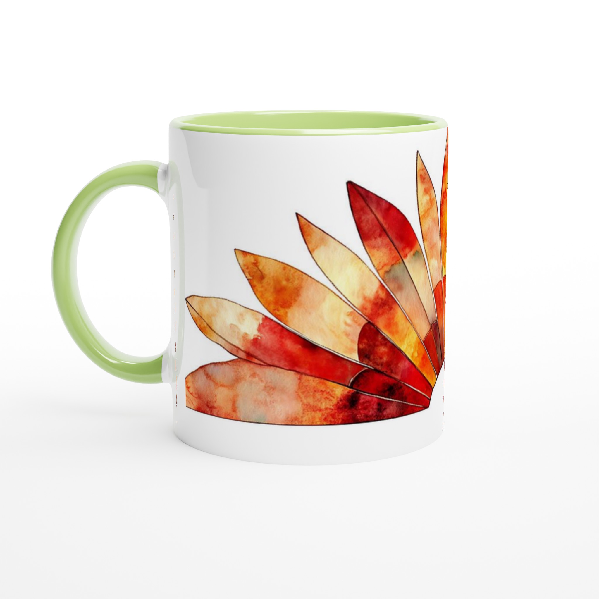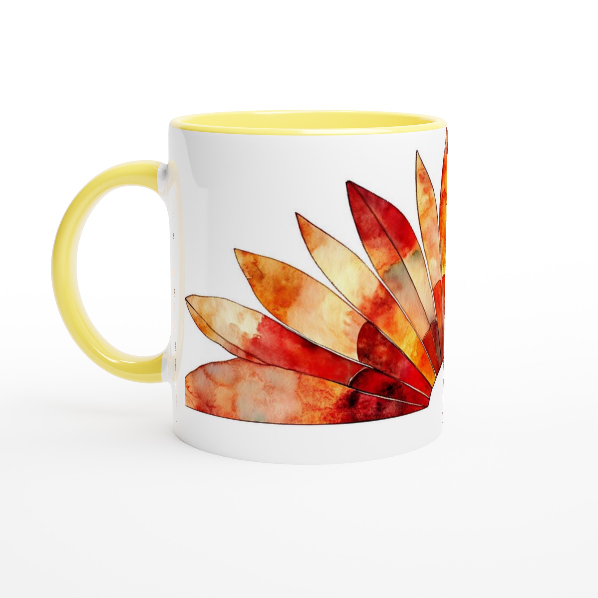Fiery Sunset Feathers – White Ceramic Mug 11oz, in your choice of seven vibrant colors