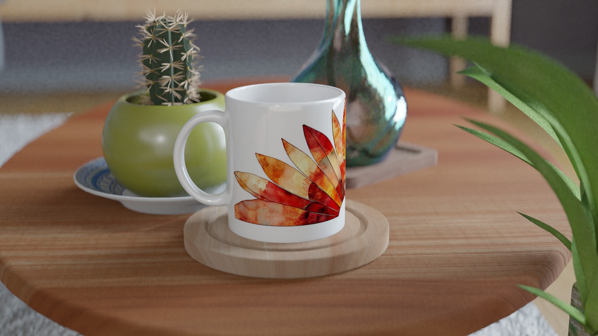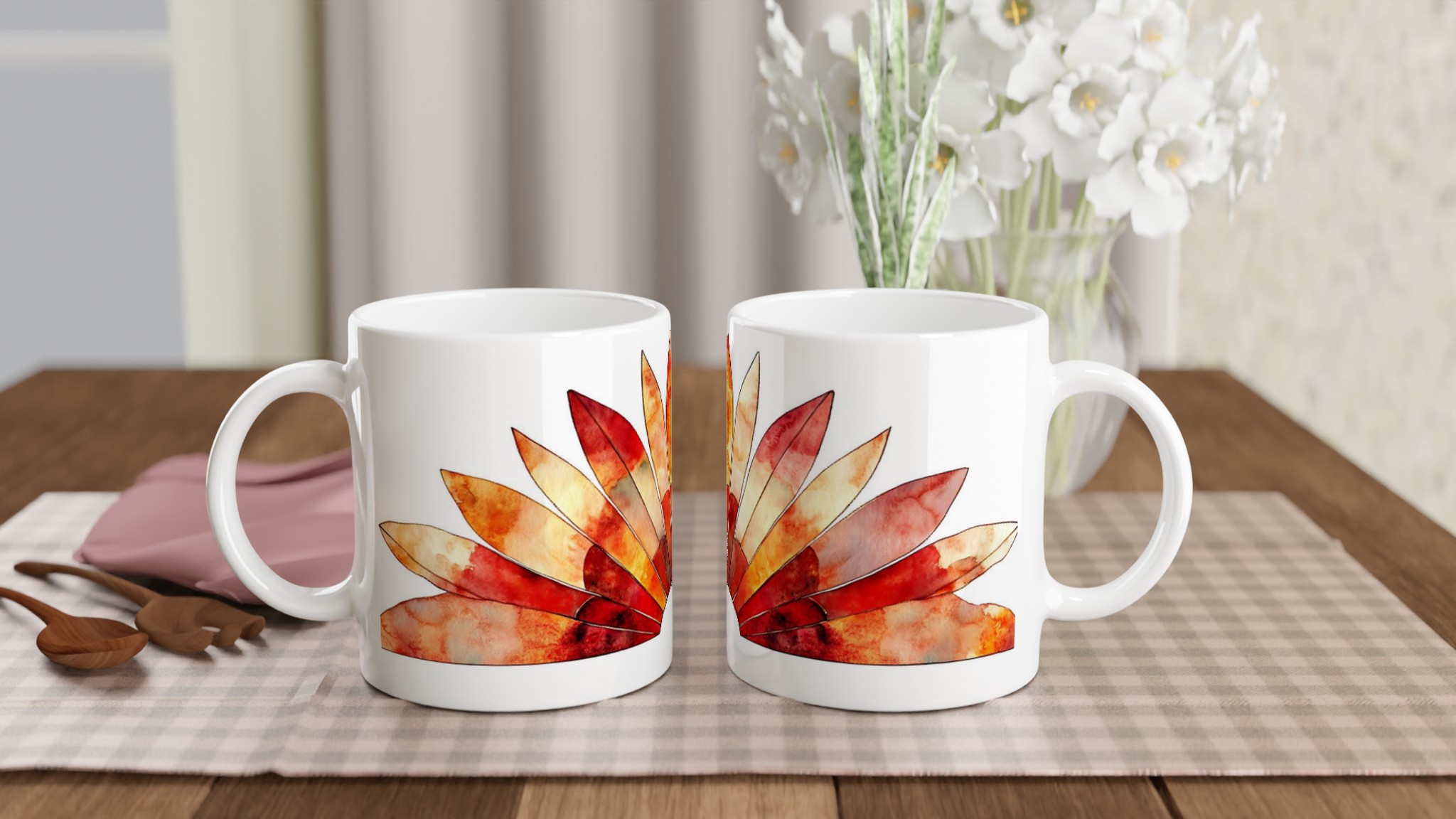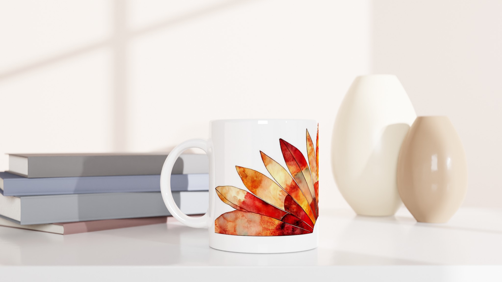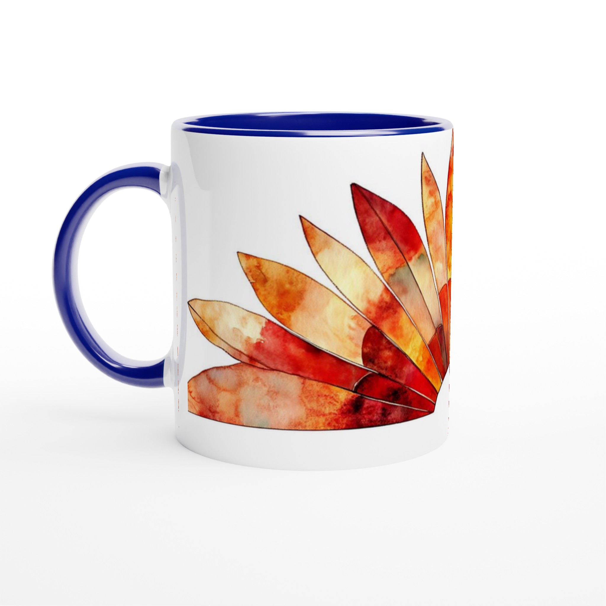 Fiery Sunset Feathers – White Ceramic Mug 11oz, in your choice of seven vibrant colors