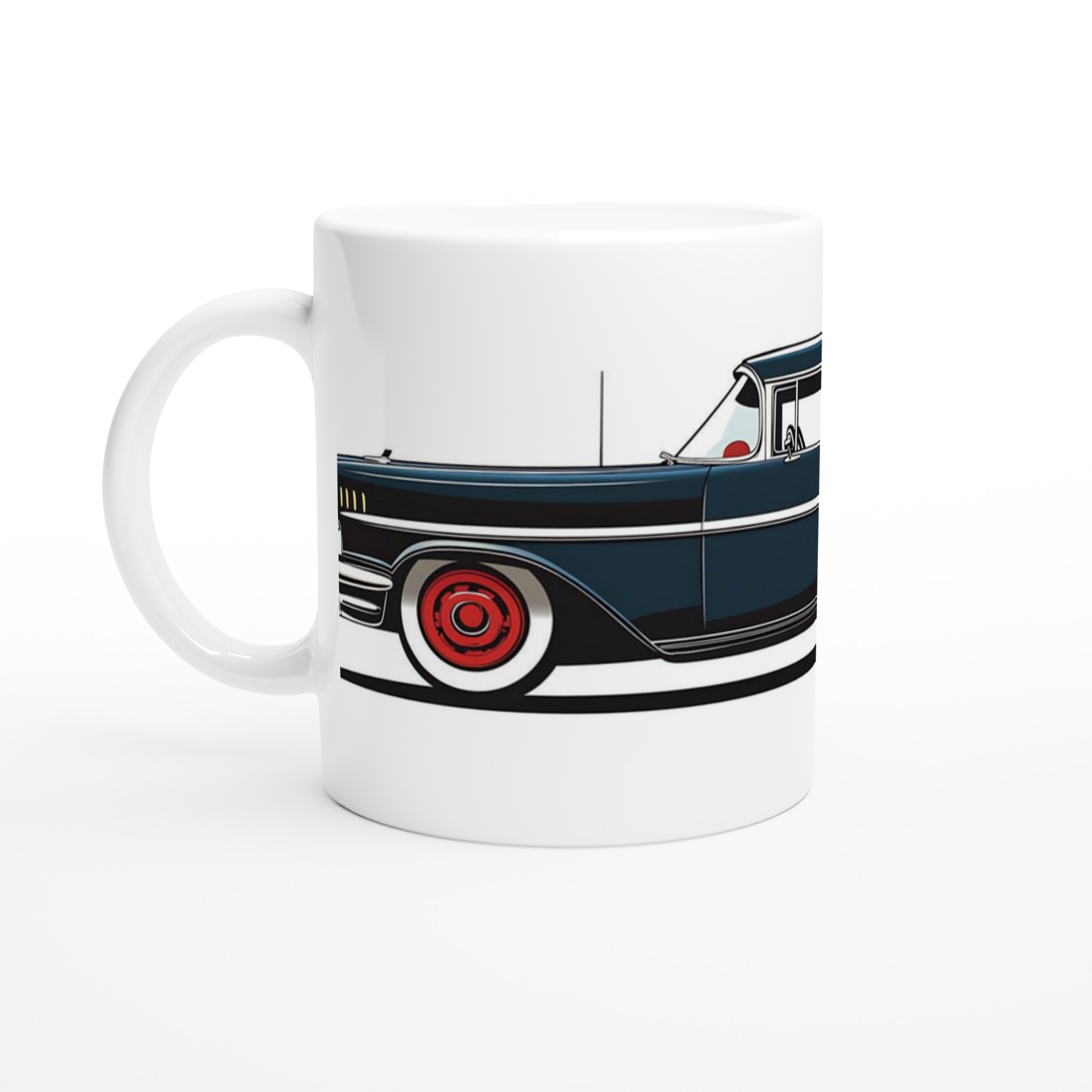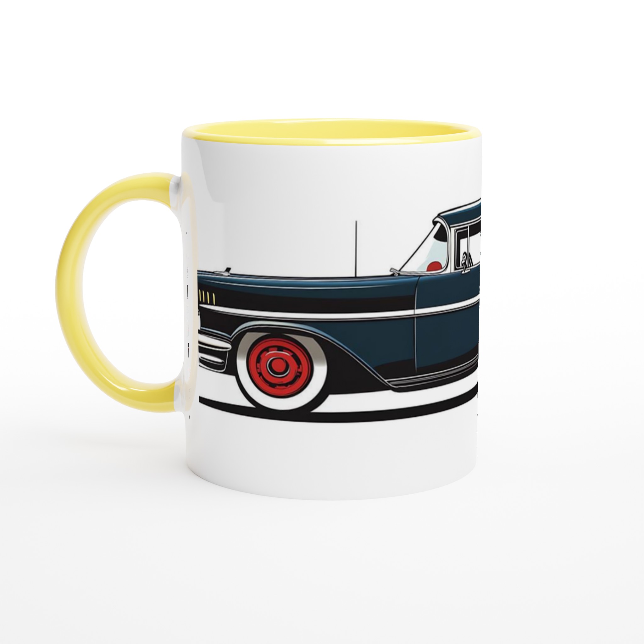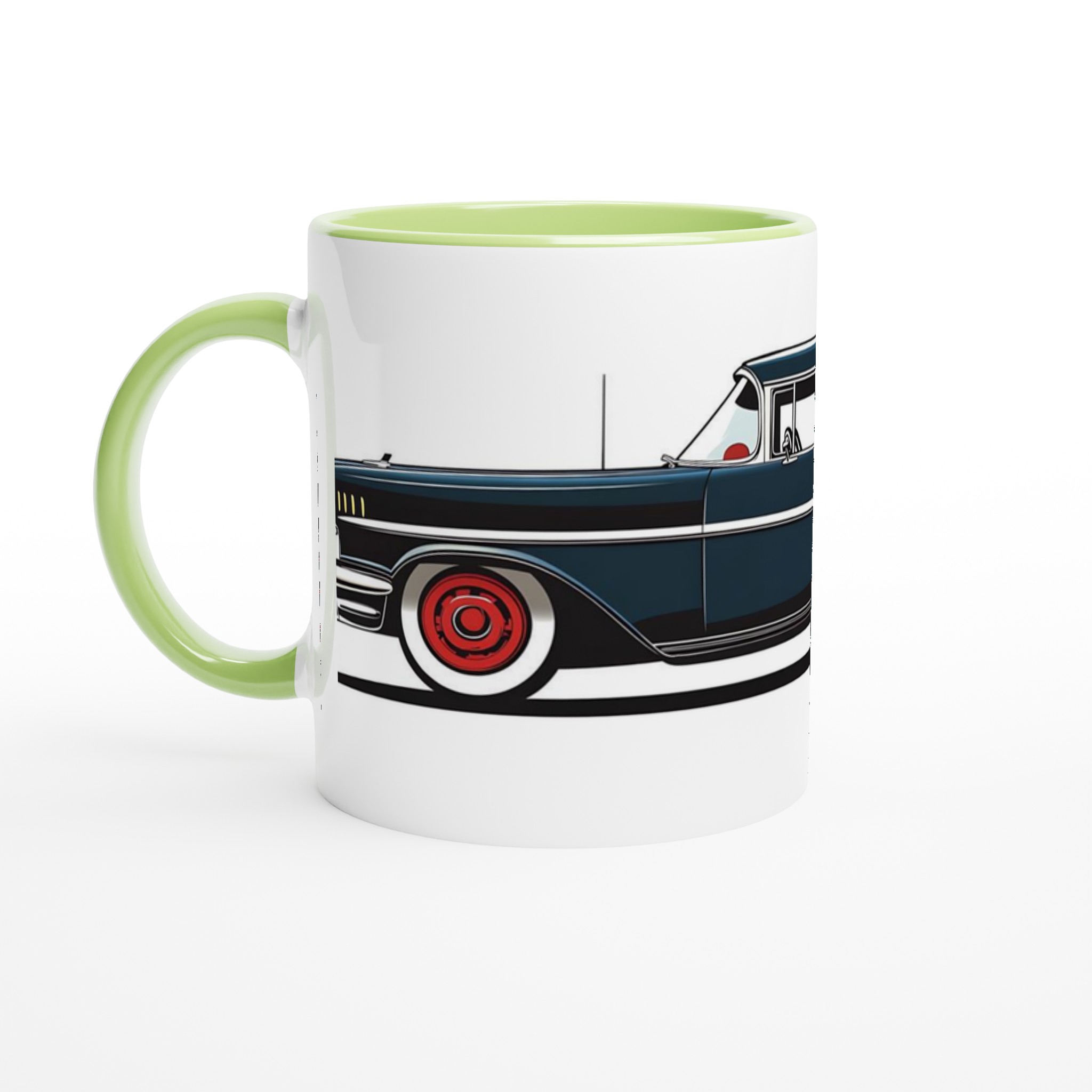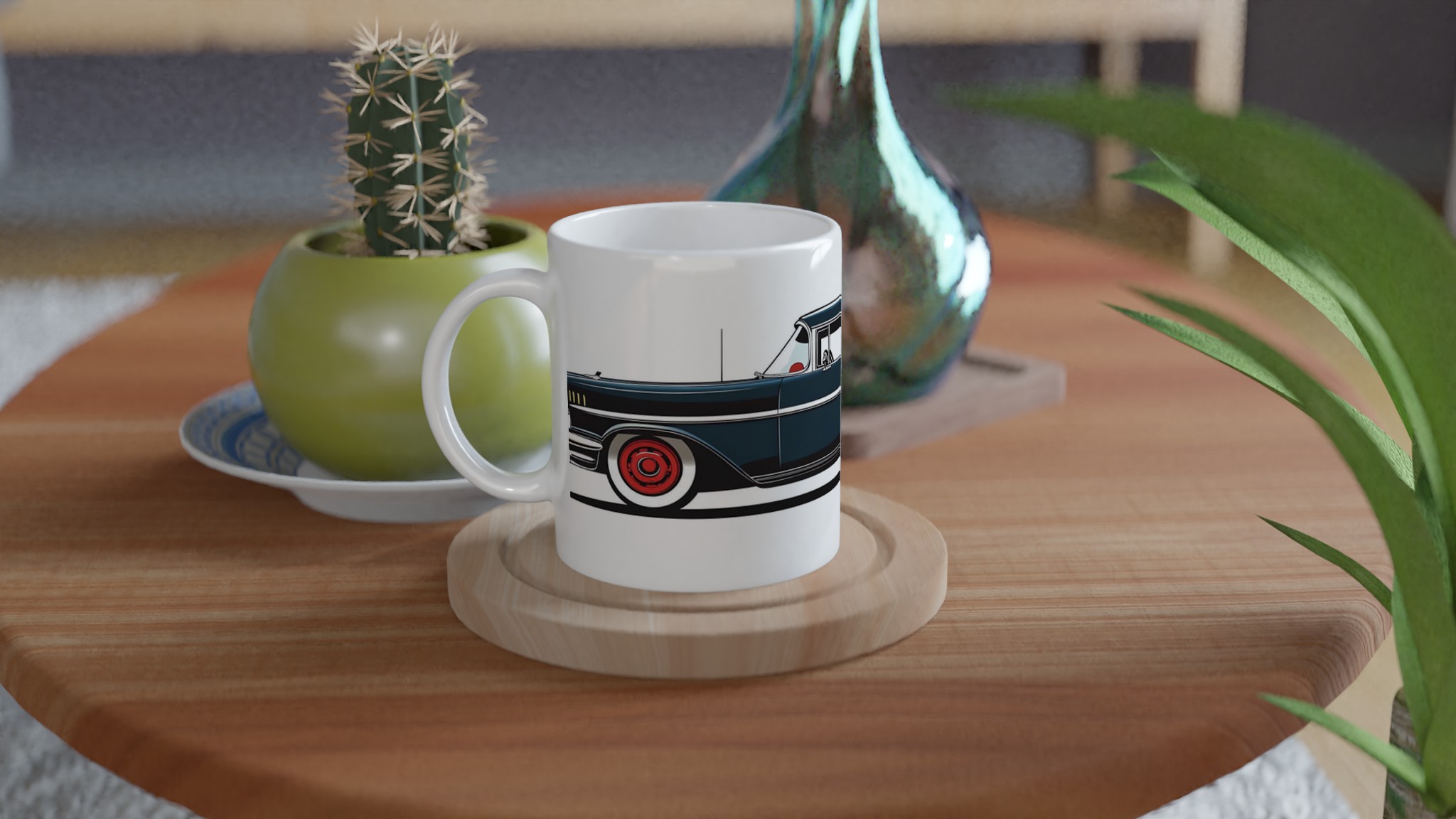 Classic Cruiser – White Ceramic Mug 11oz, Featuring a Retro Car Design in Your Choice of Seven Vibrant Colors
