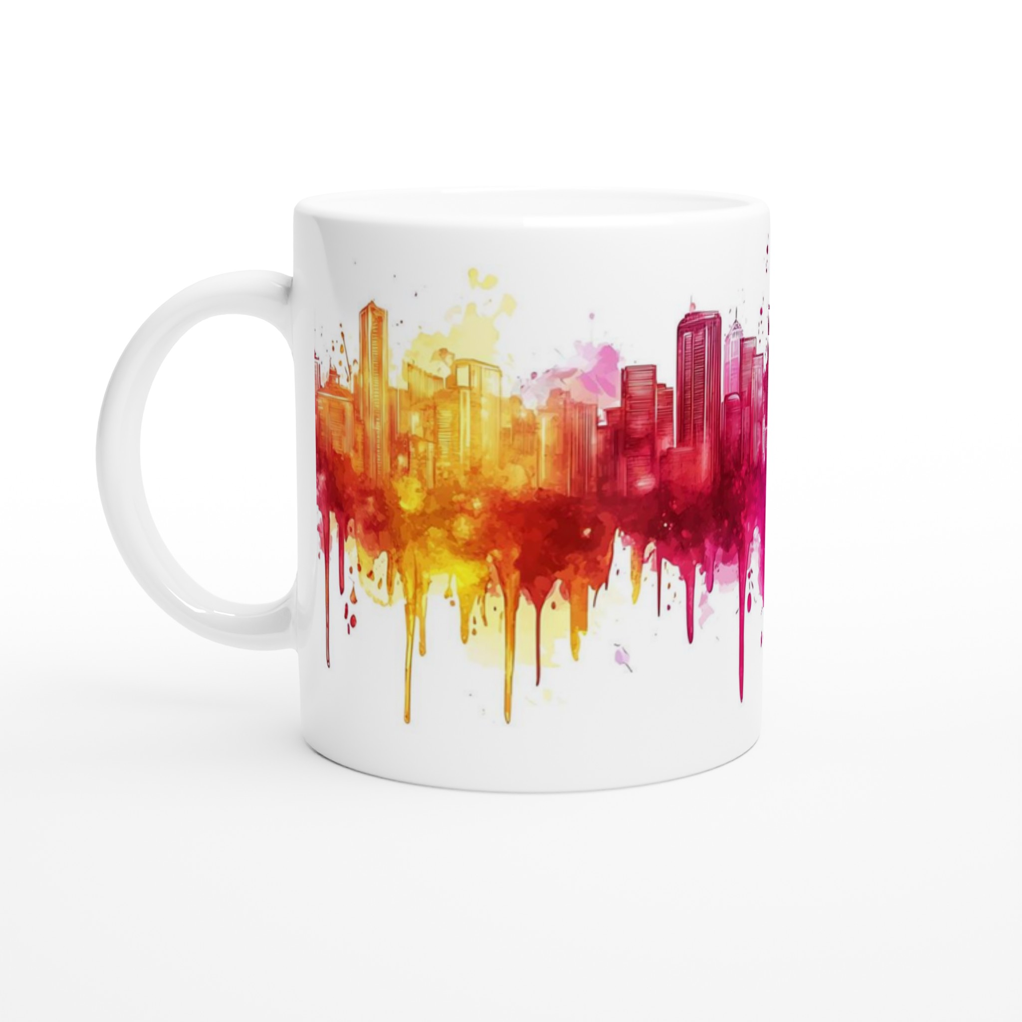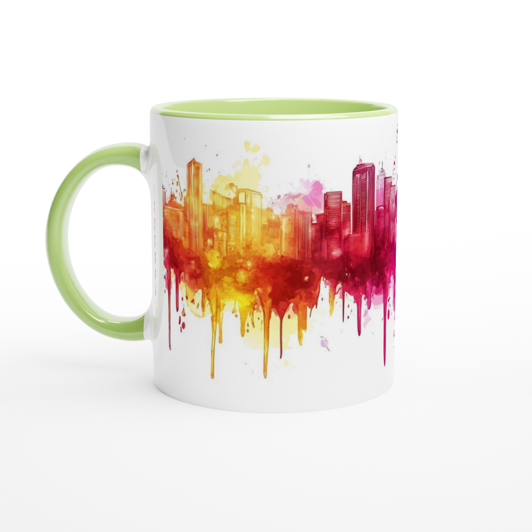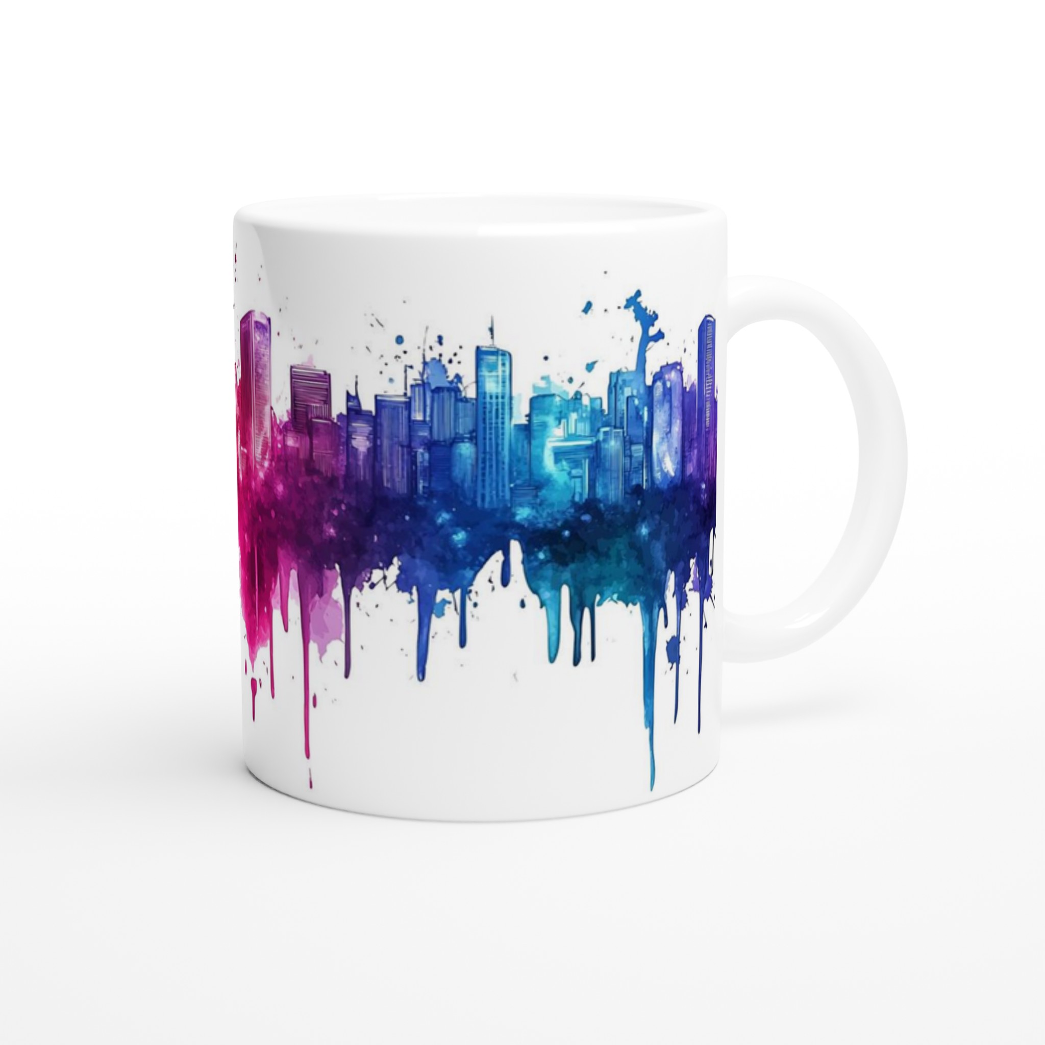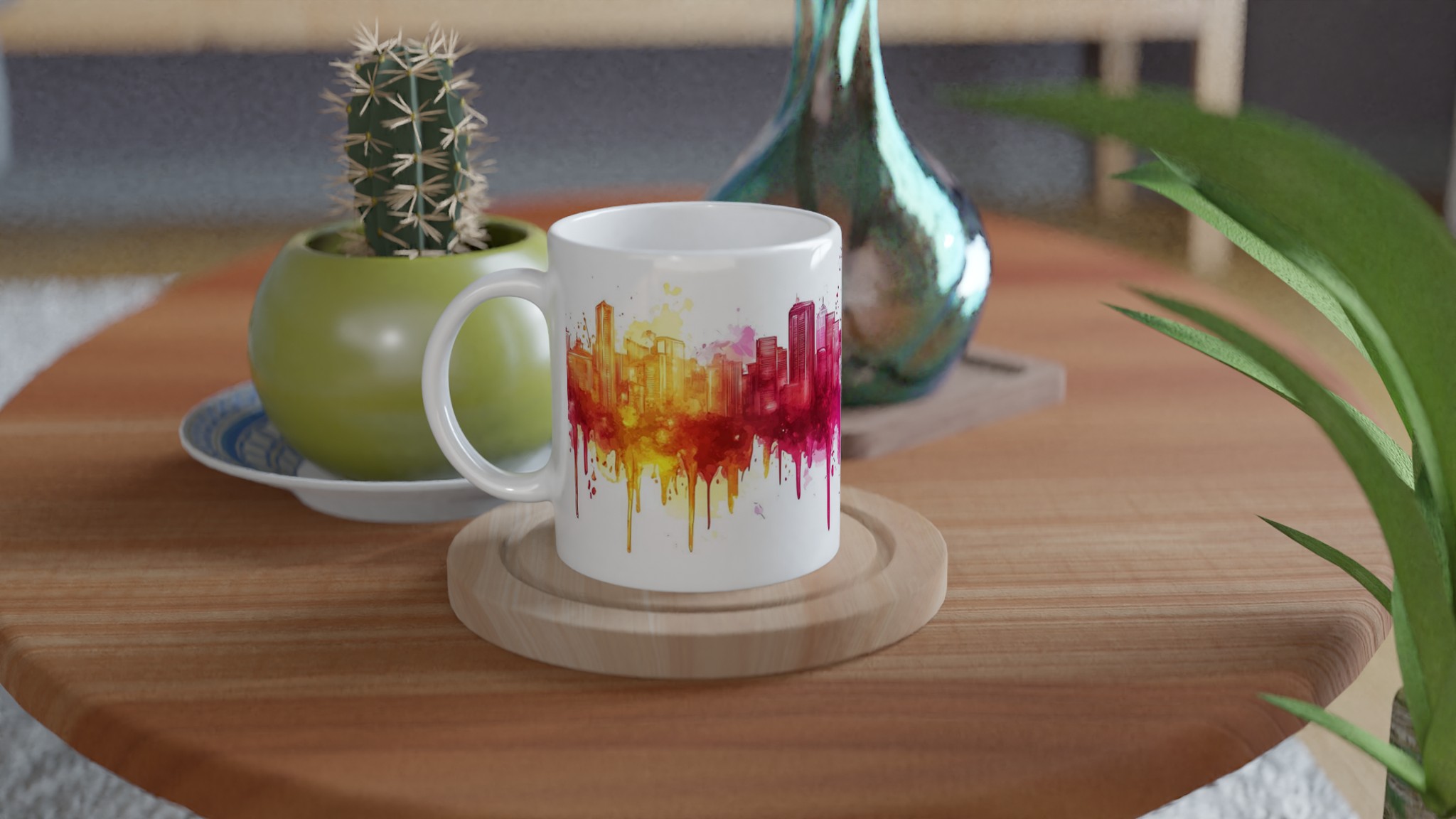 Vibrant Watercolor Cityscape Mug – Artistic Ceramic 11oz Cup in Your Choice of Seven Hues