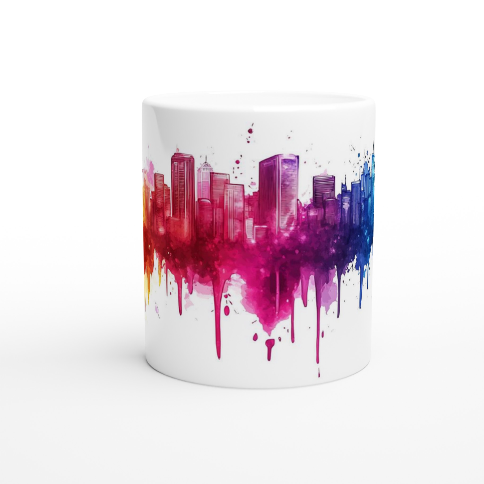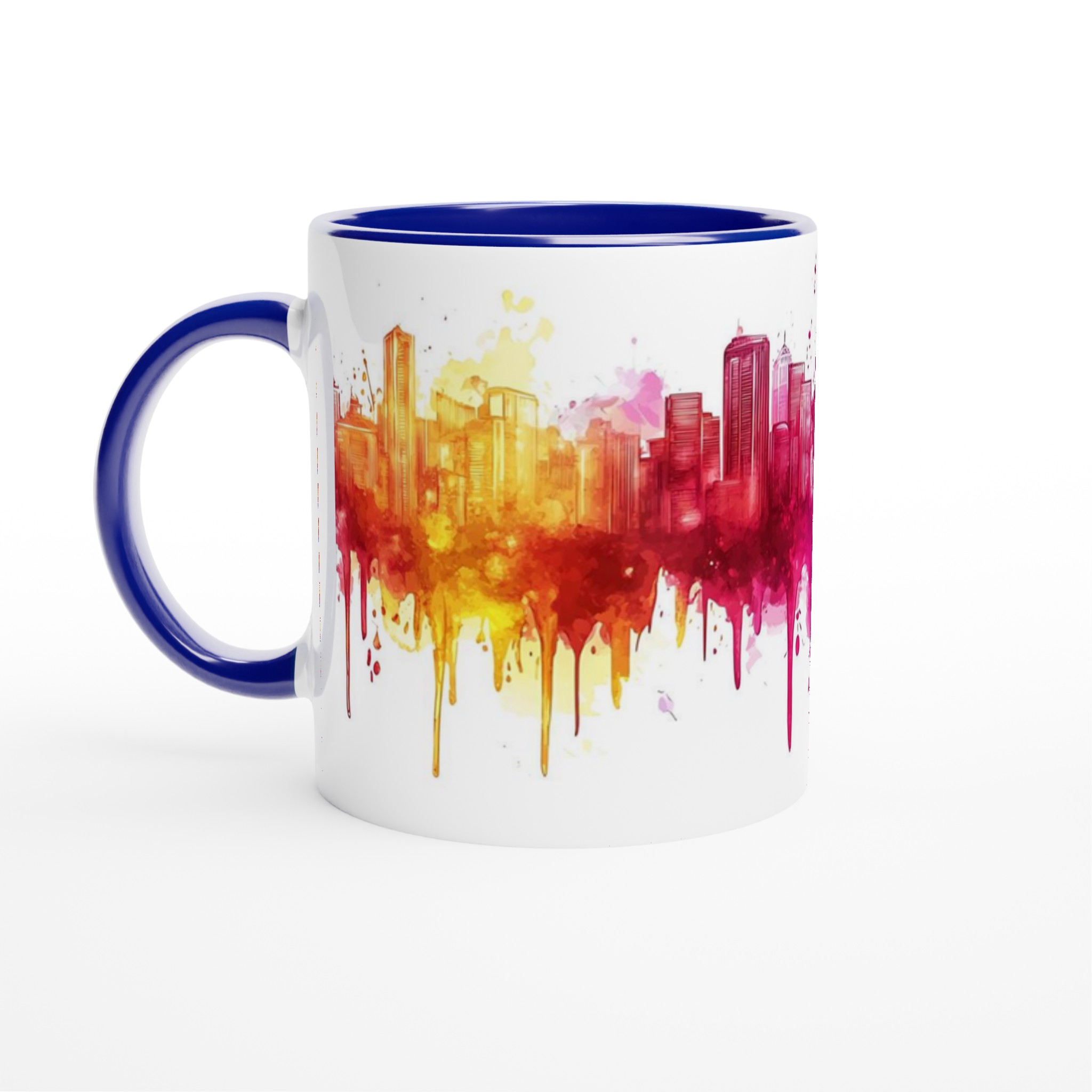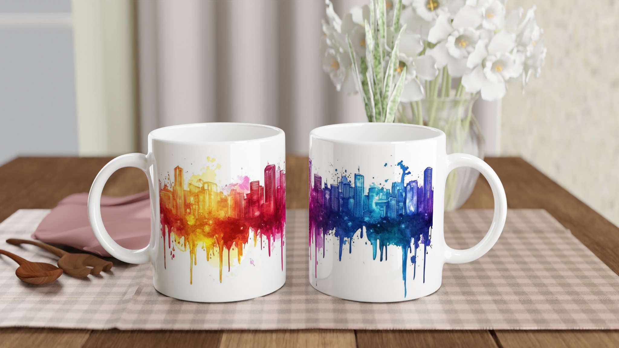 Vibrant Watercolor Cityscape Mug – Artistic Ceramic 11oz Cup in Your Choice of Seven Hues