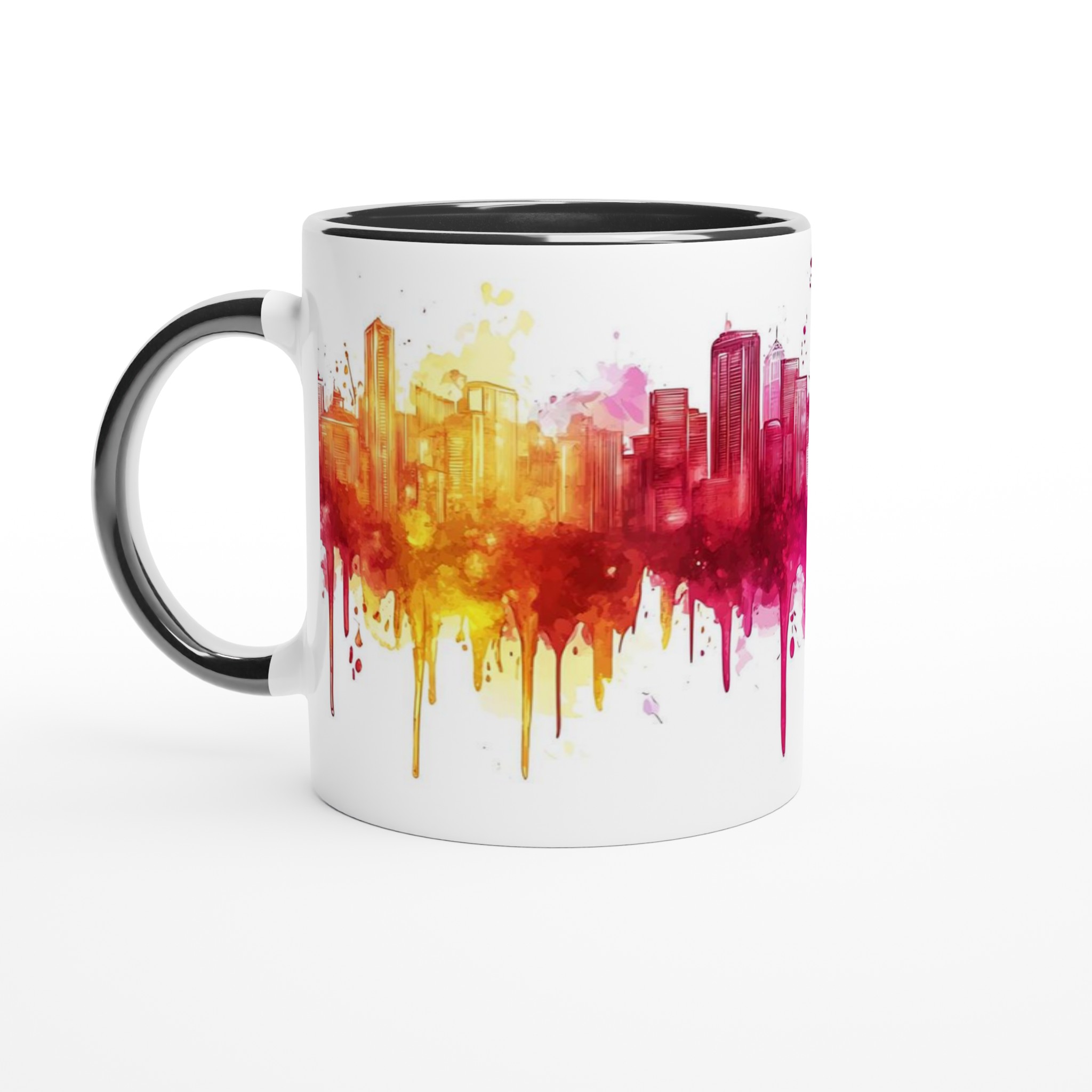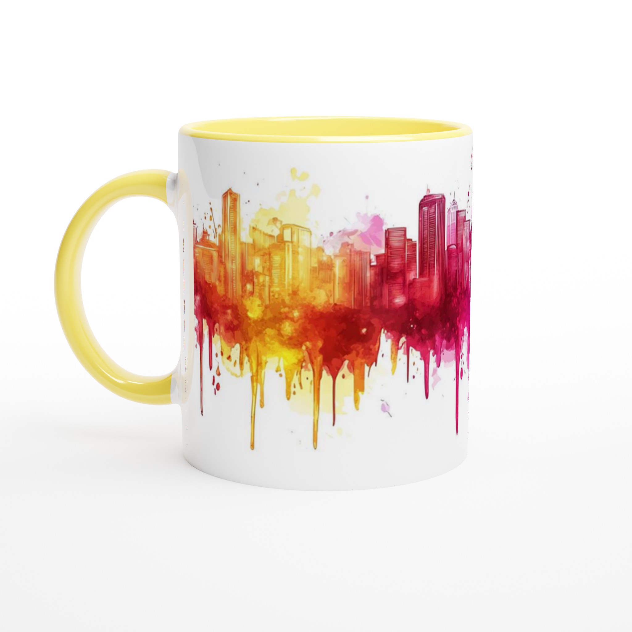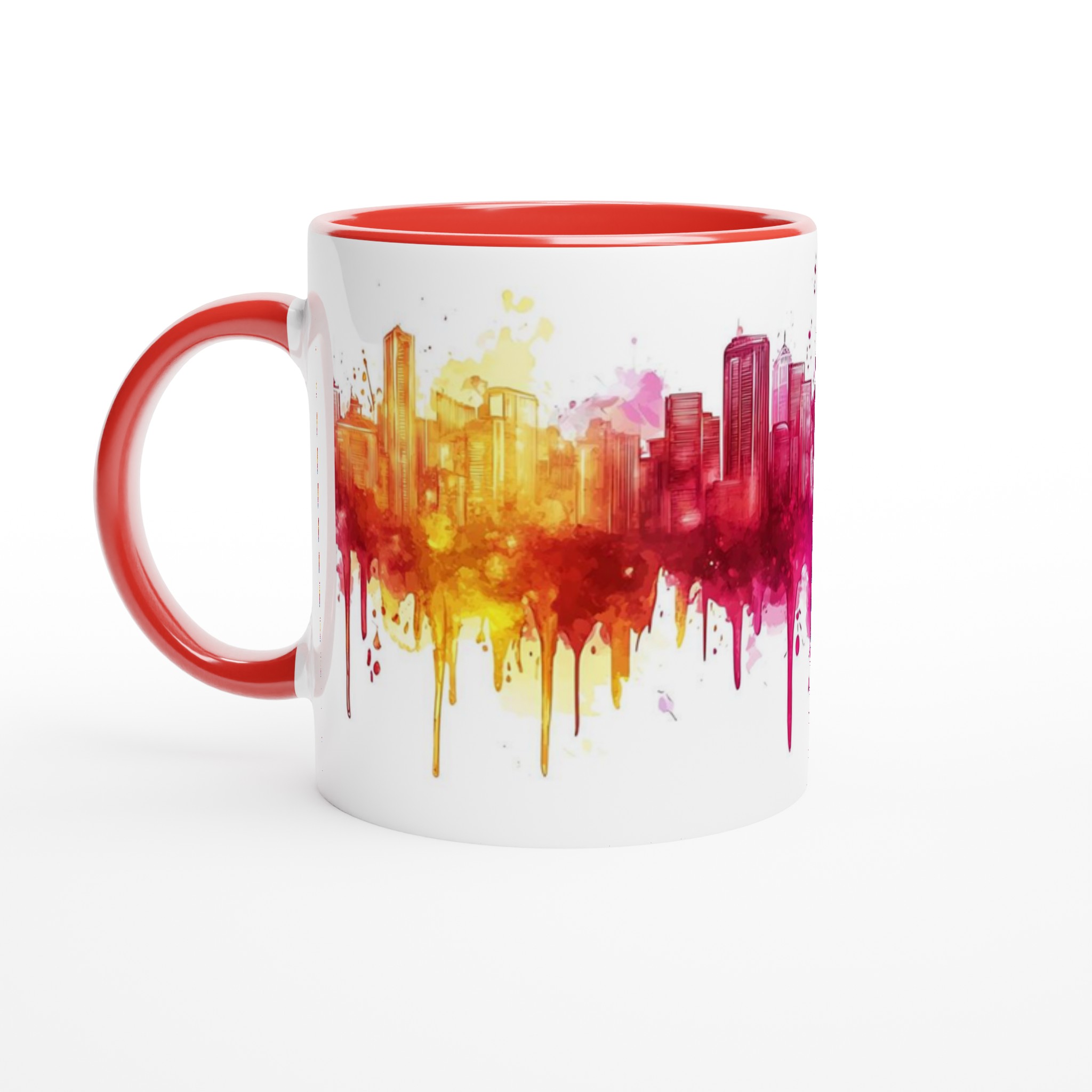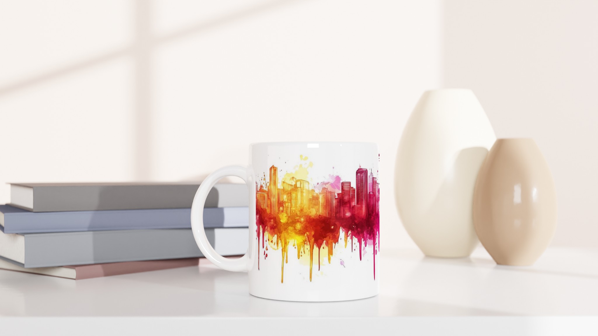 Vibrant Watercolor Cityscape Mug – Artistic Ceramic 11oz Cup in Your Choice of Seven Hues