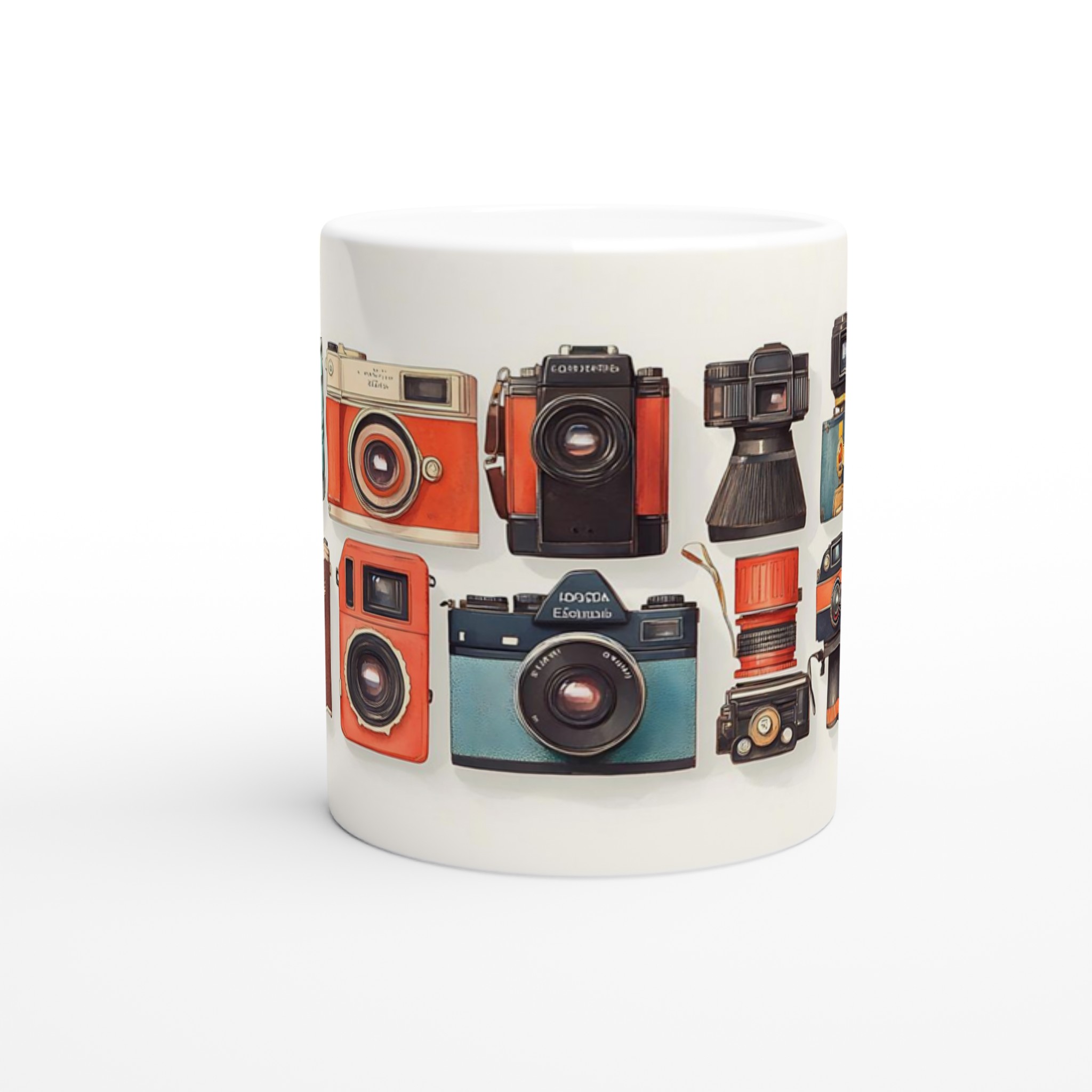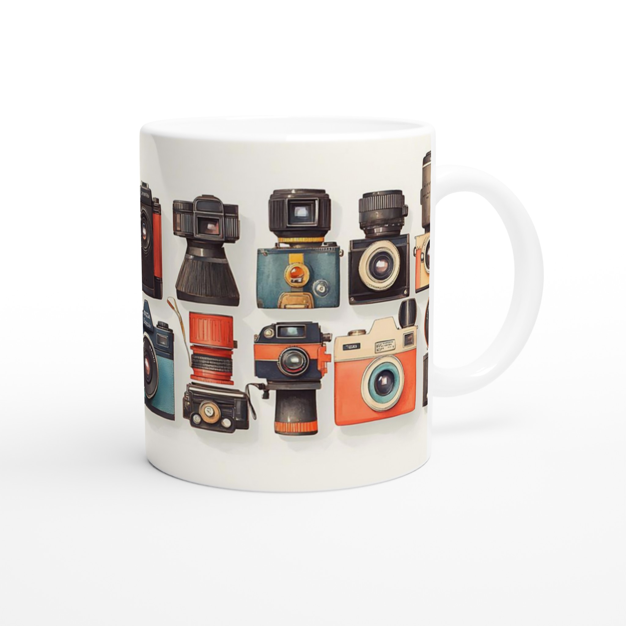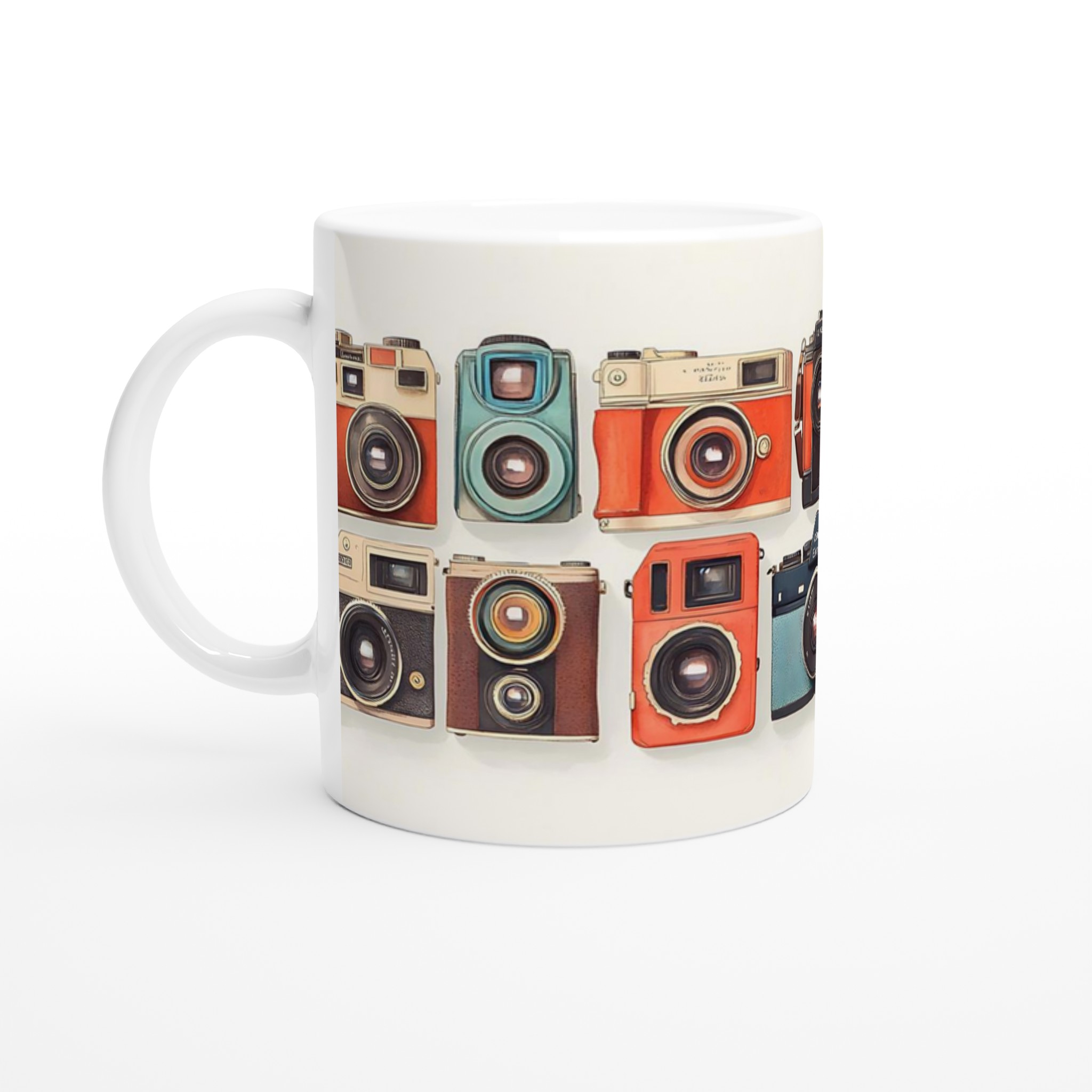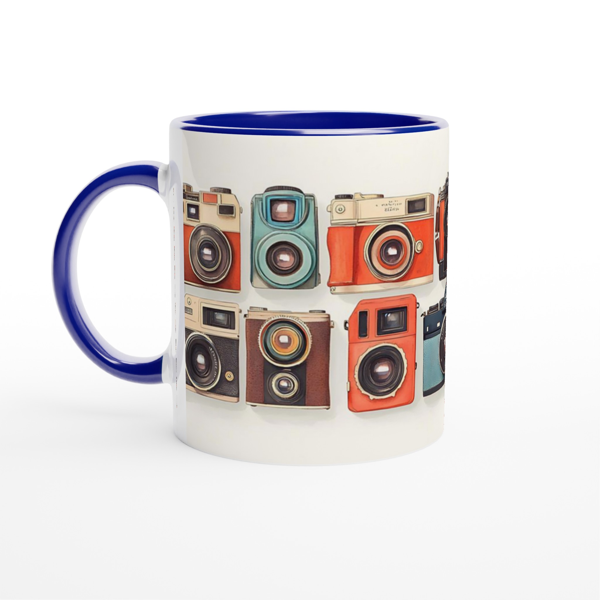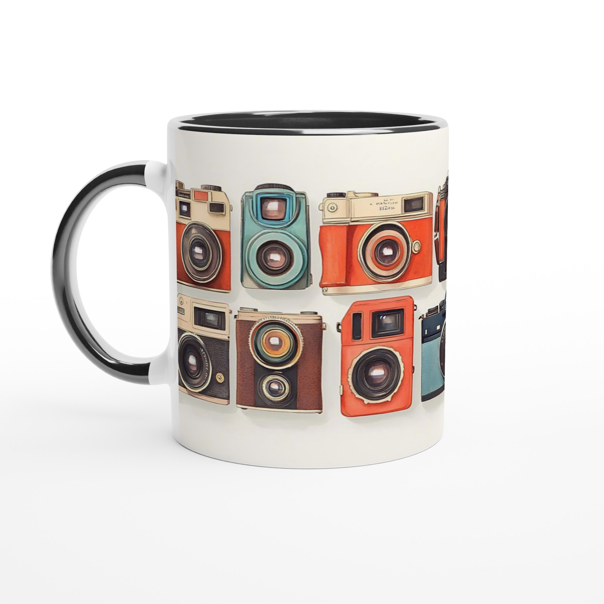 Vintage Camera Collection – White Ceramic Mug 11oz, in your choice of seven vibrant colors