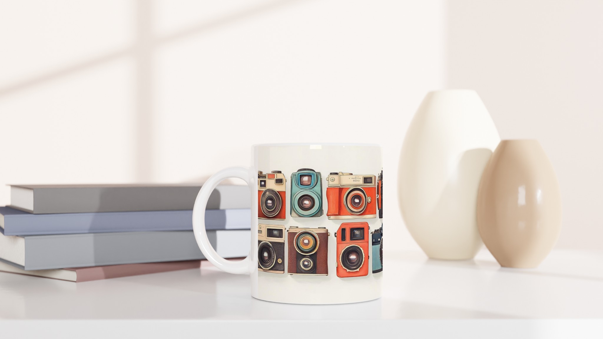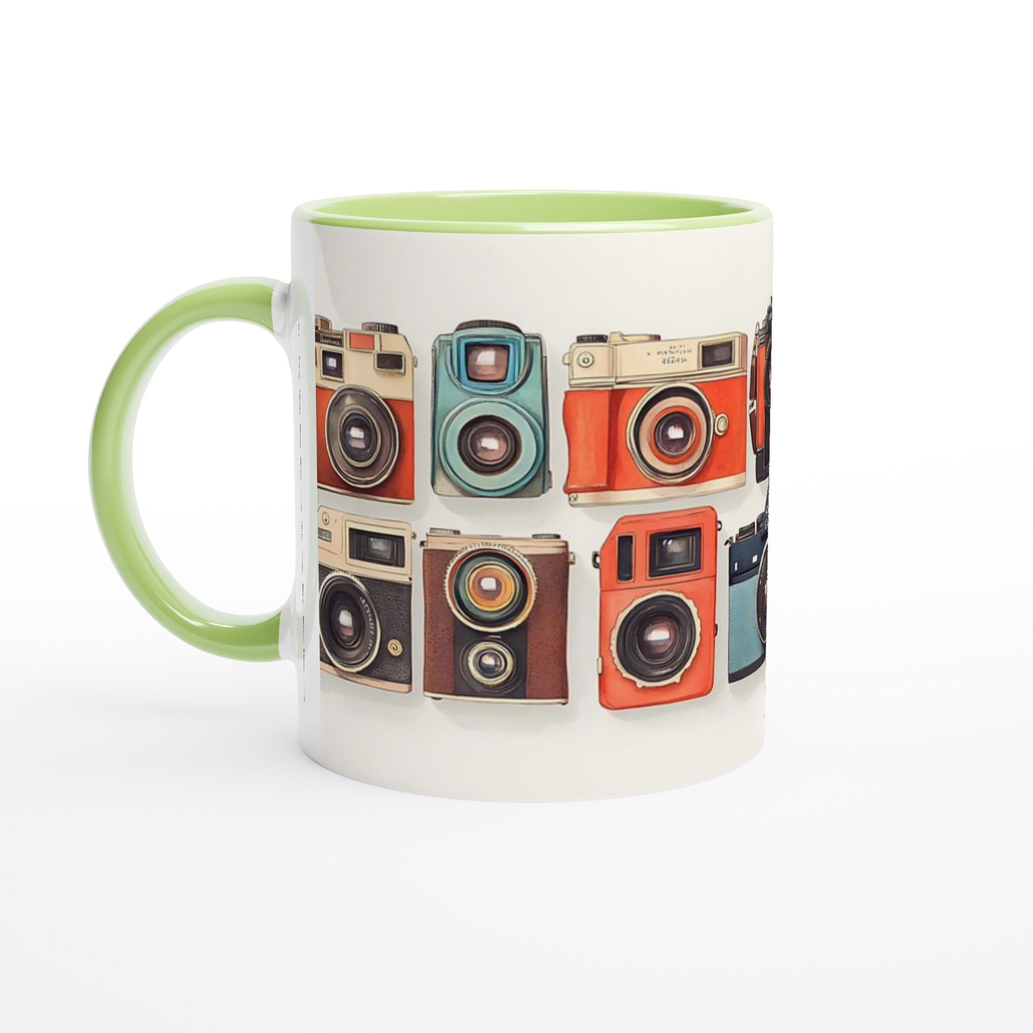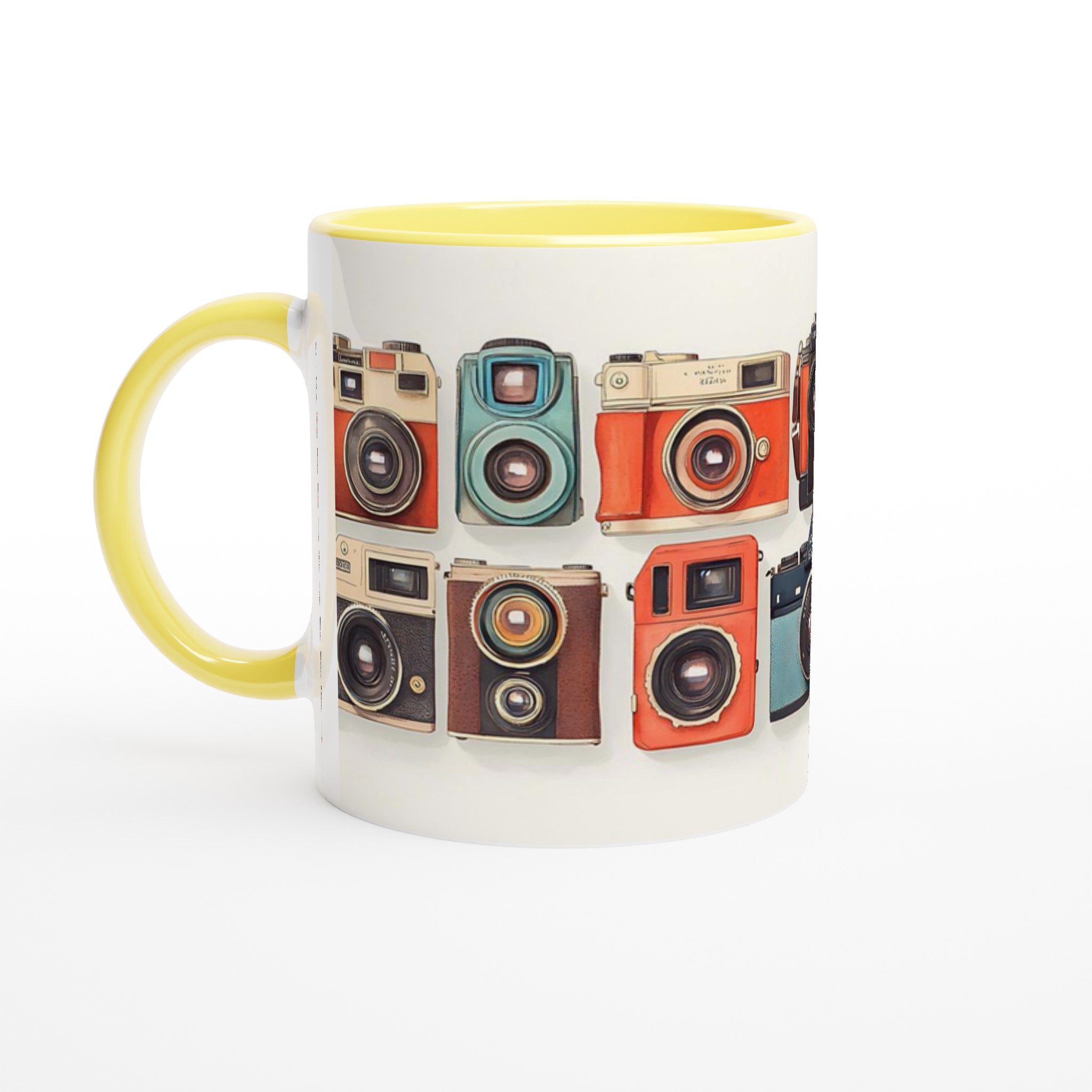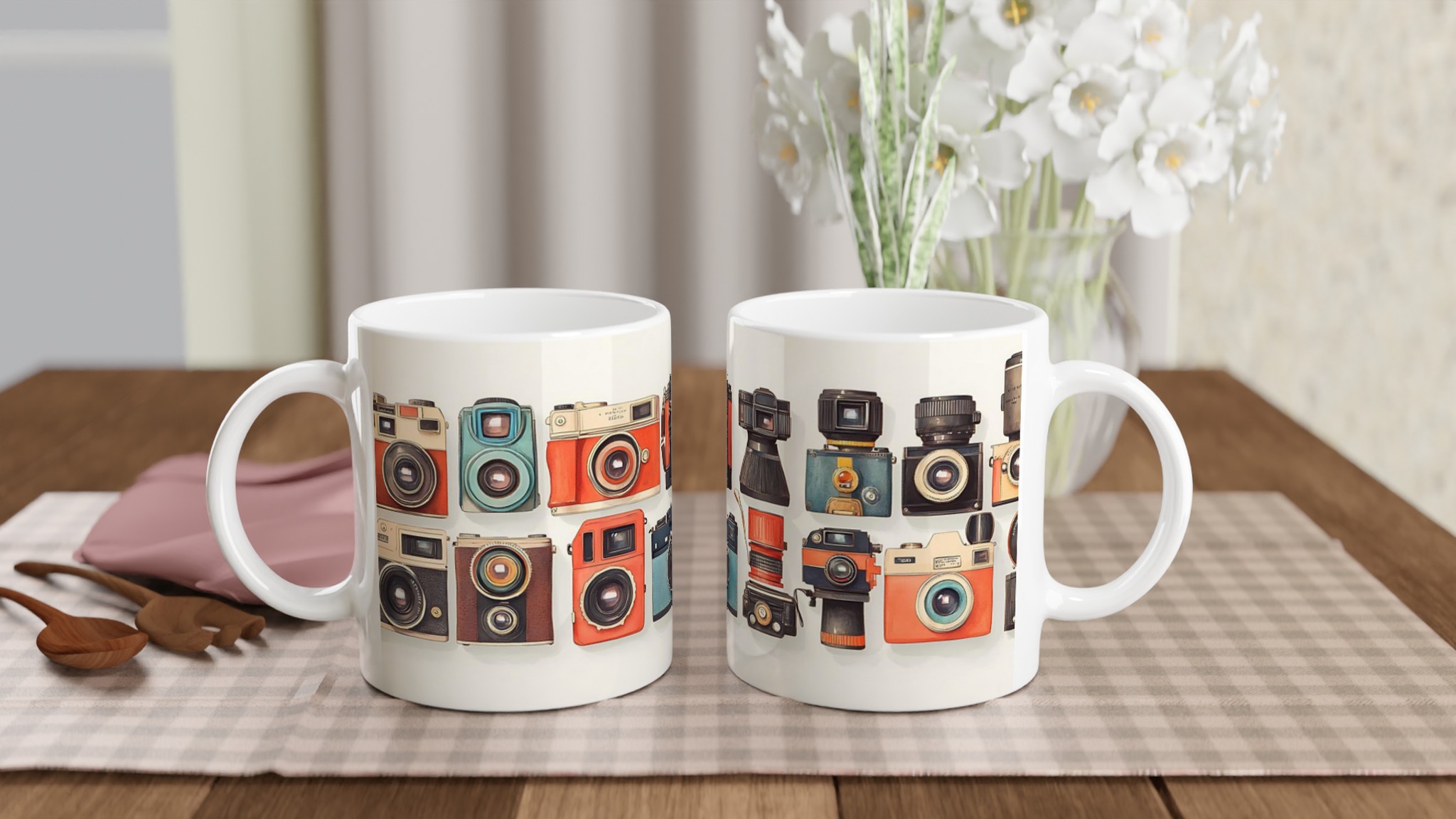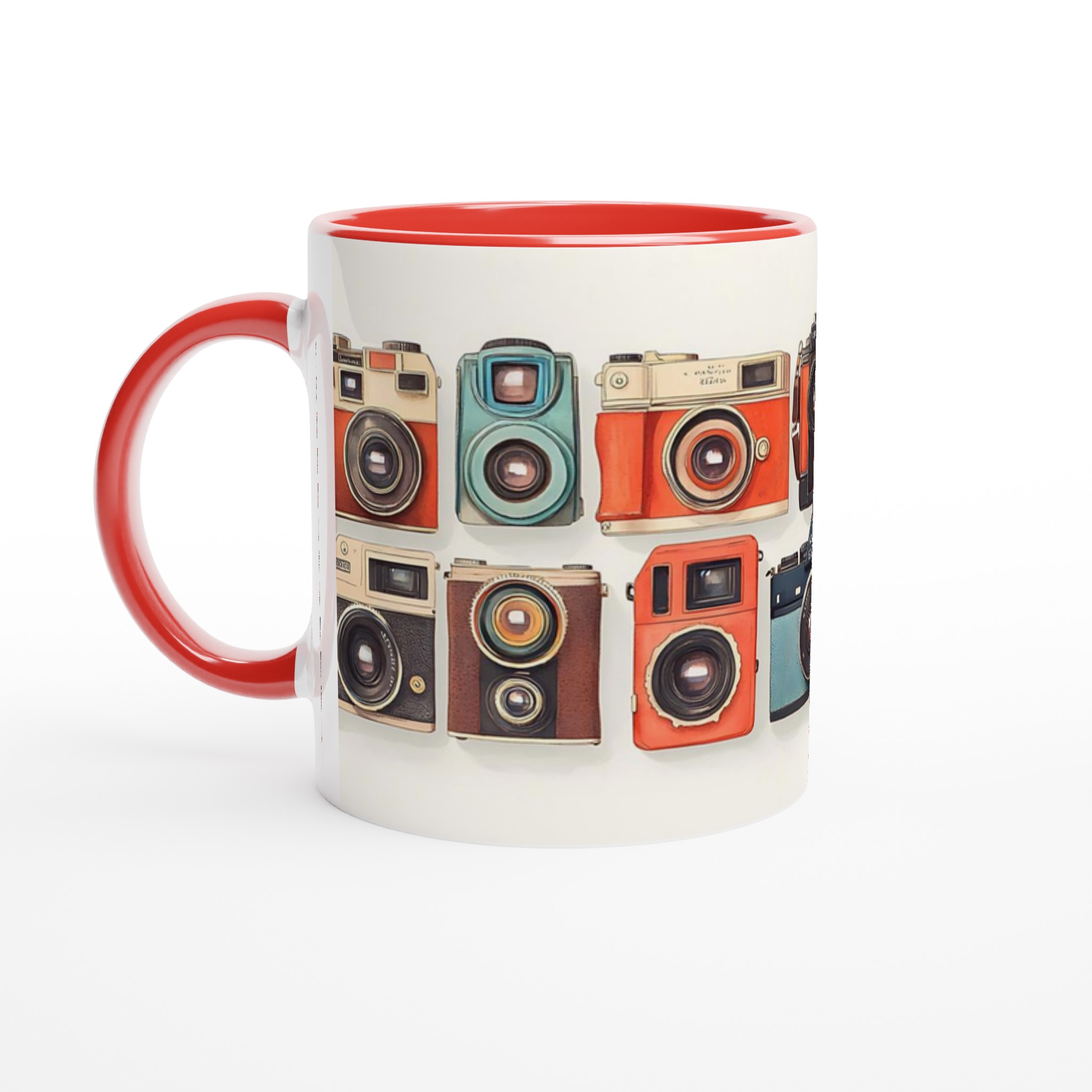 Vintage Camera Collection – White Ceramic Mug 11oz, in your choice of seven vibrant colors