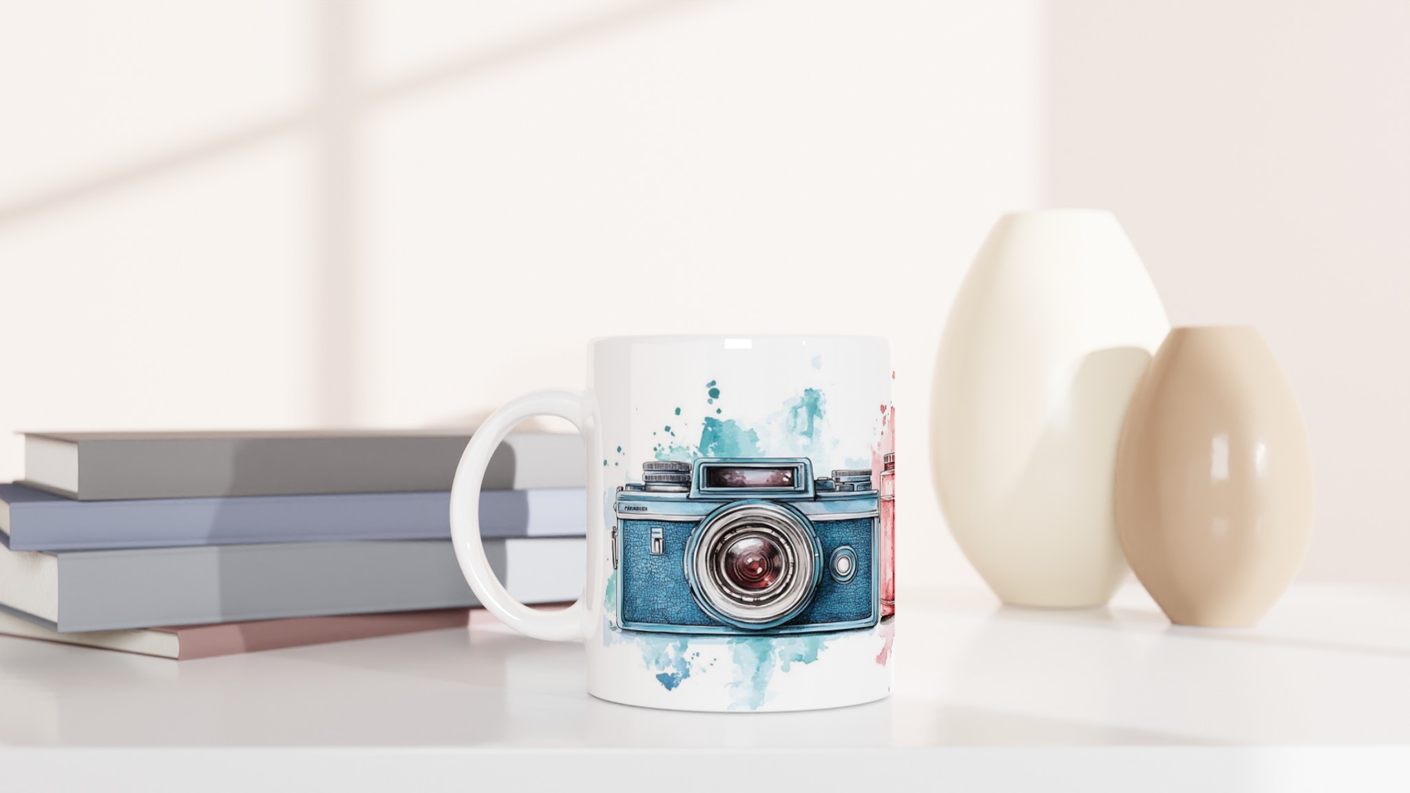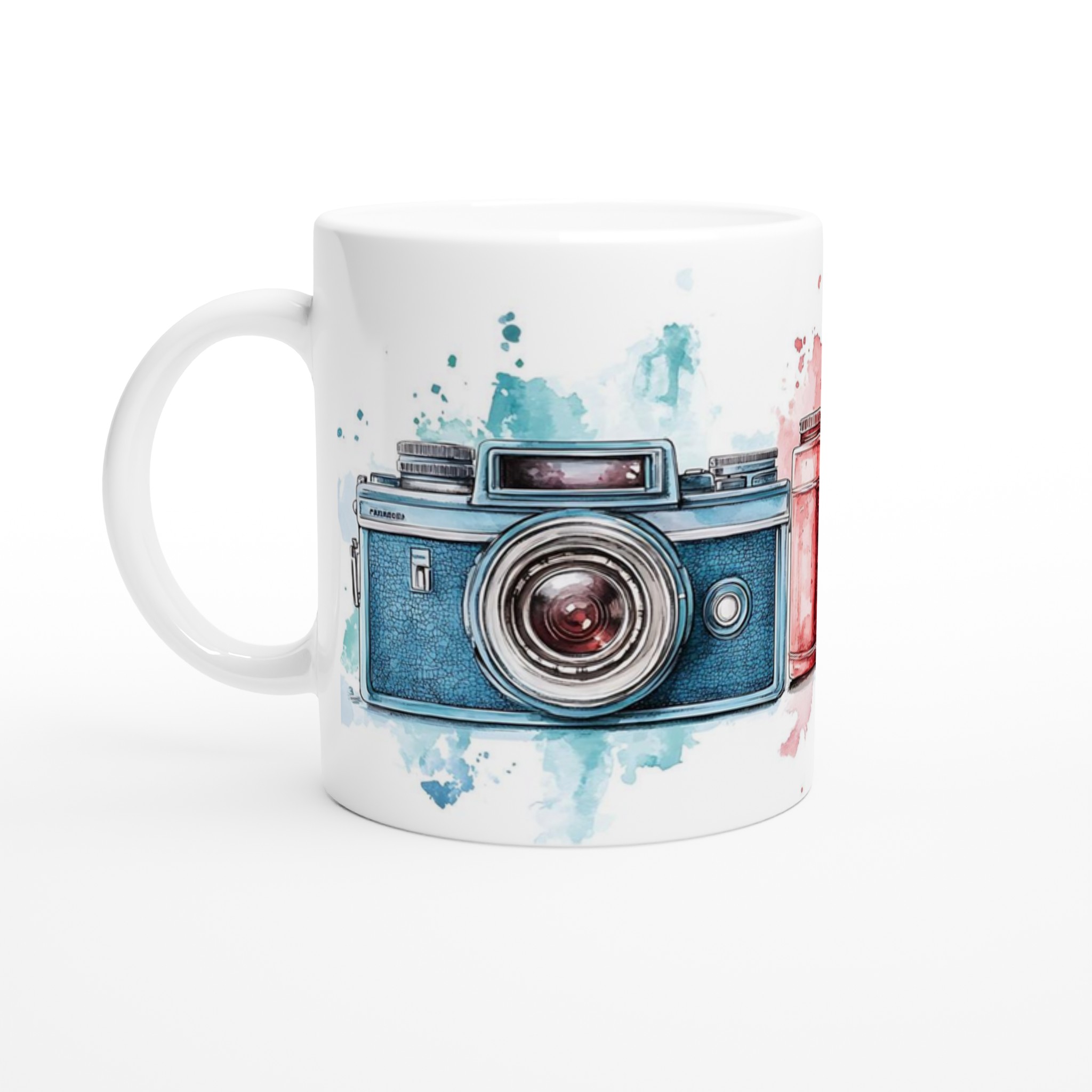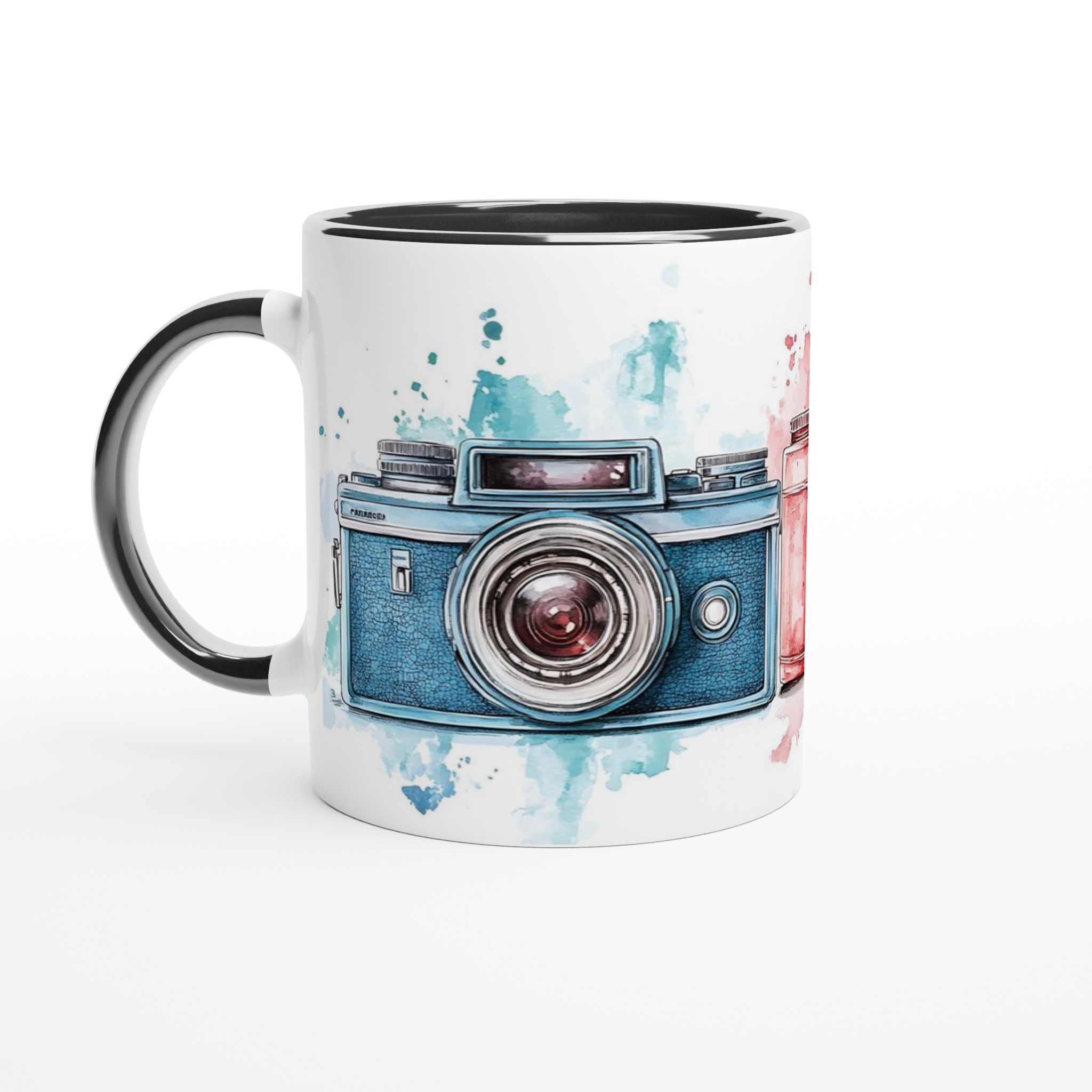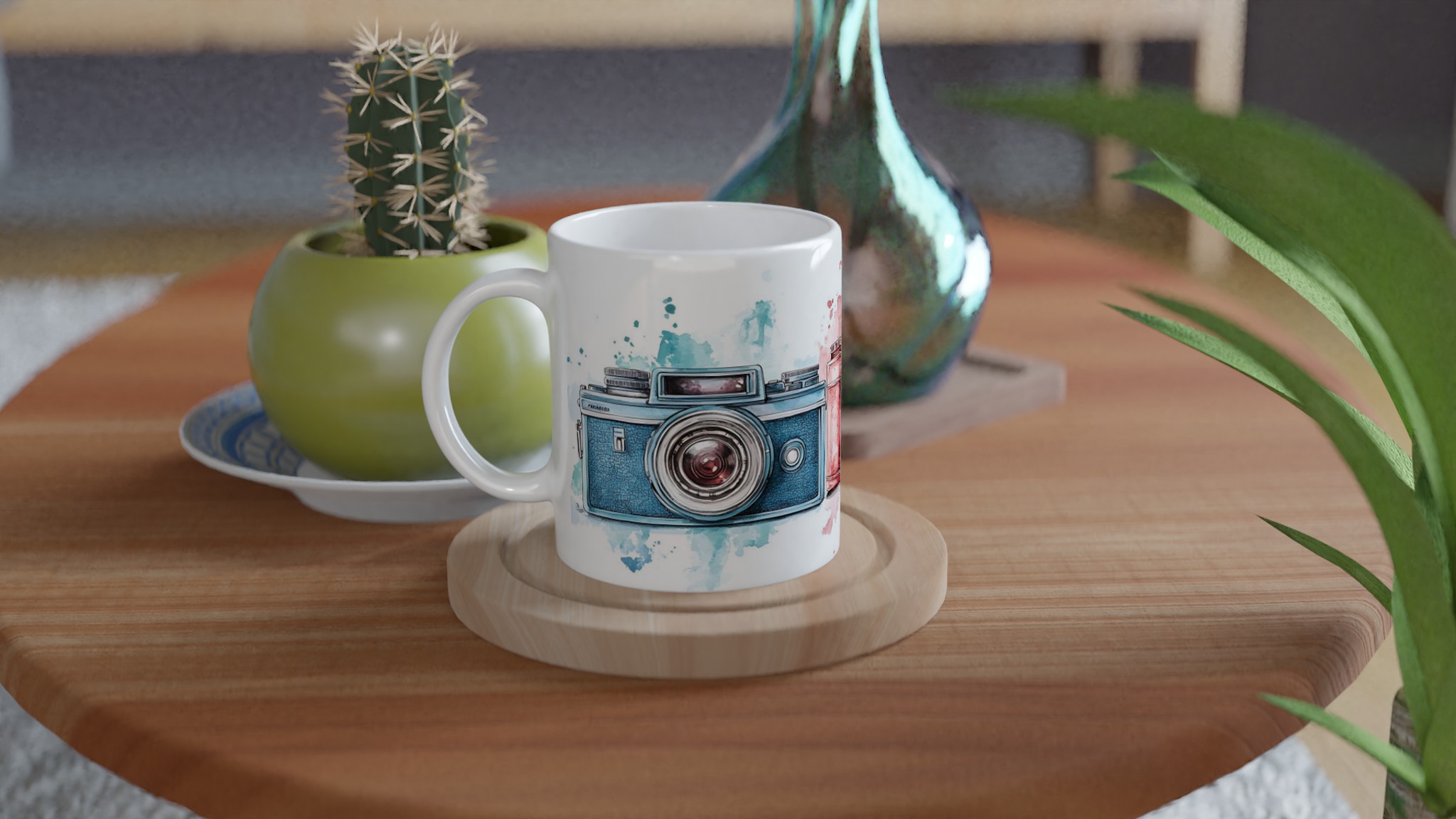 Vintage Camera Watercolor Splash – Artistic Ceramic Mug 11oz, in Your Choice of Seven Vibrant Hues