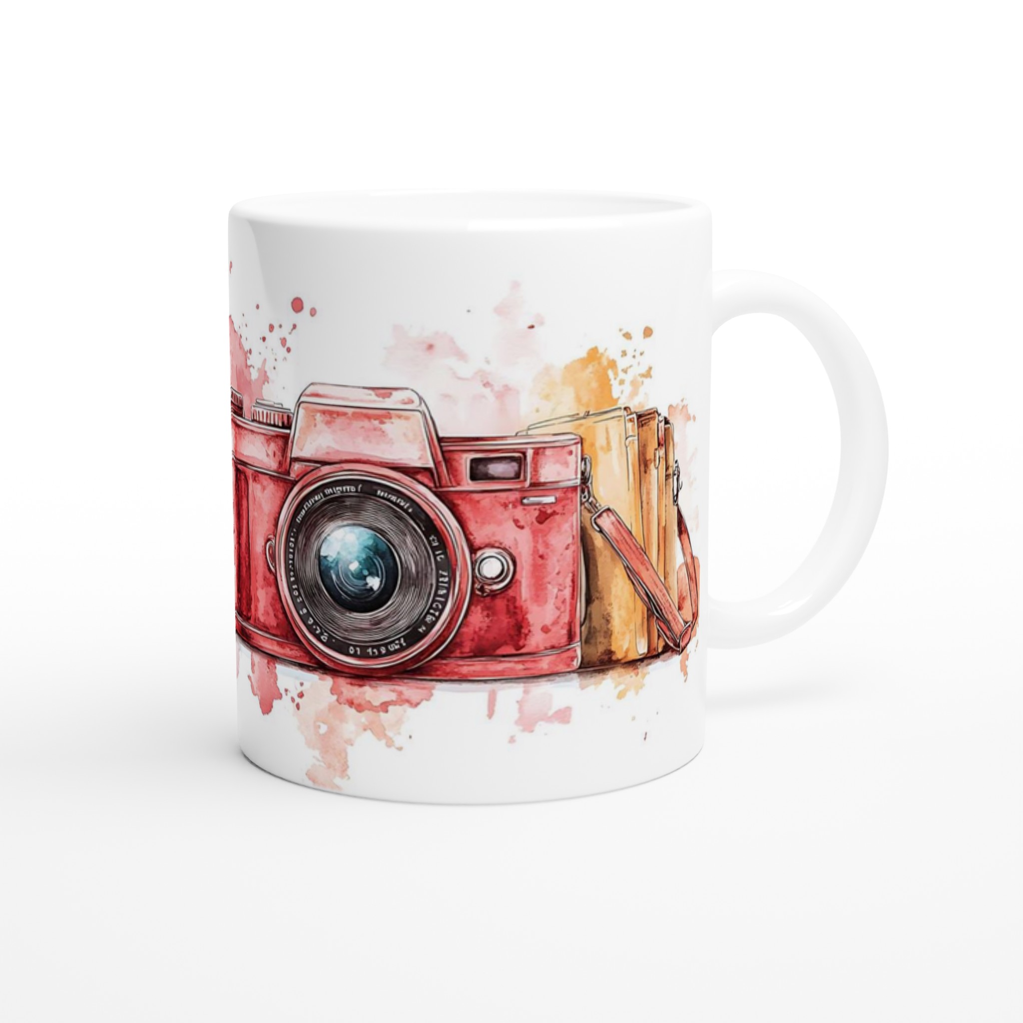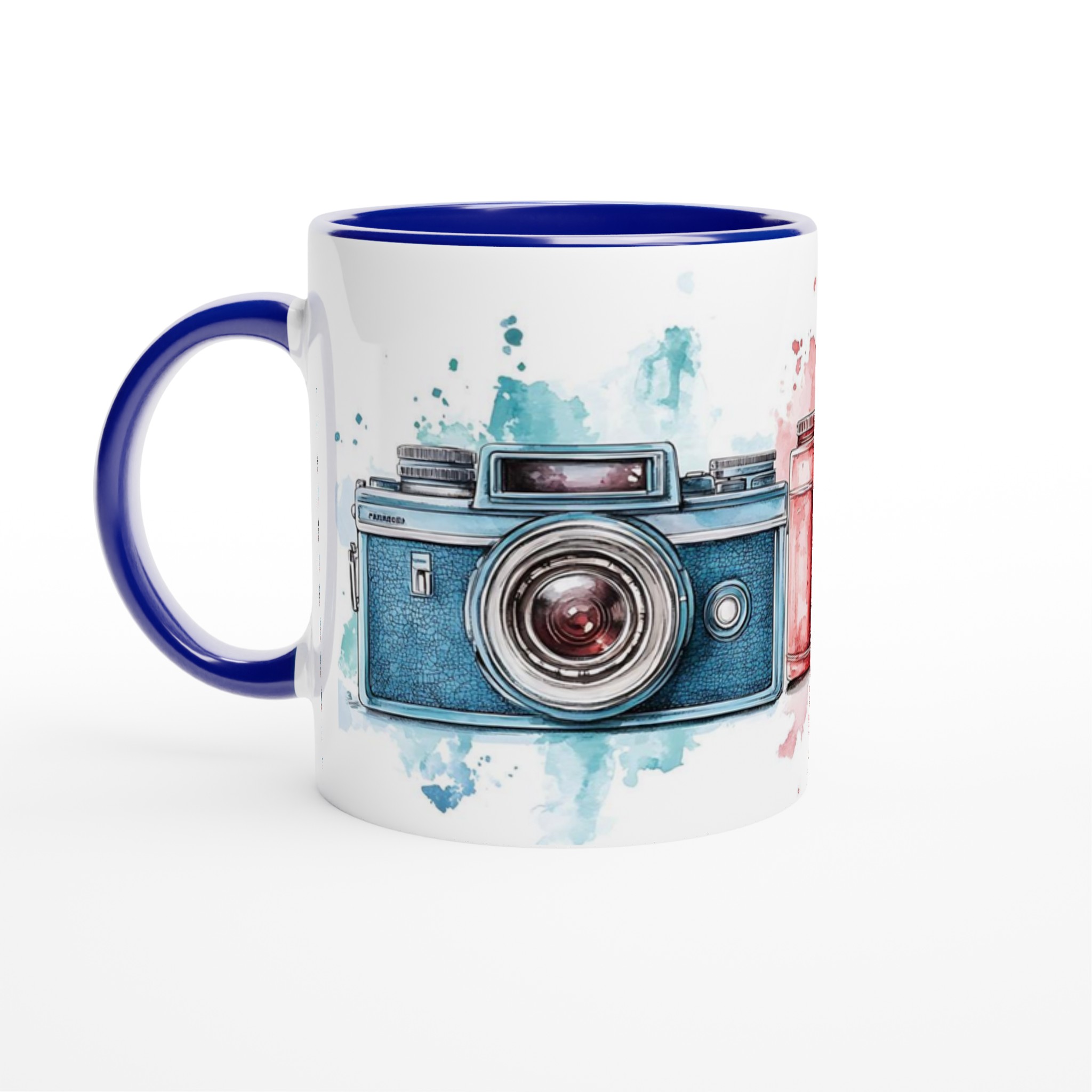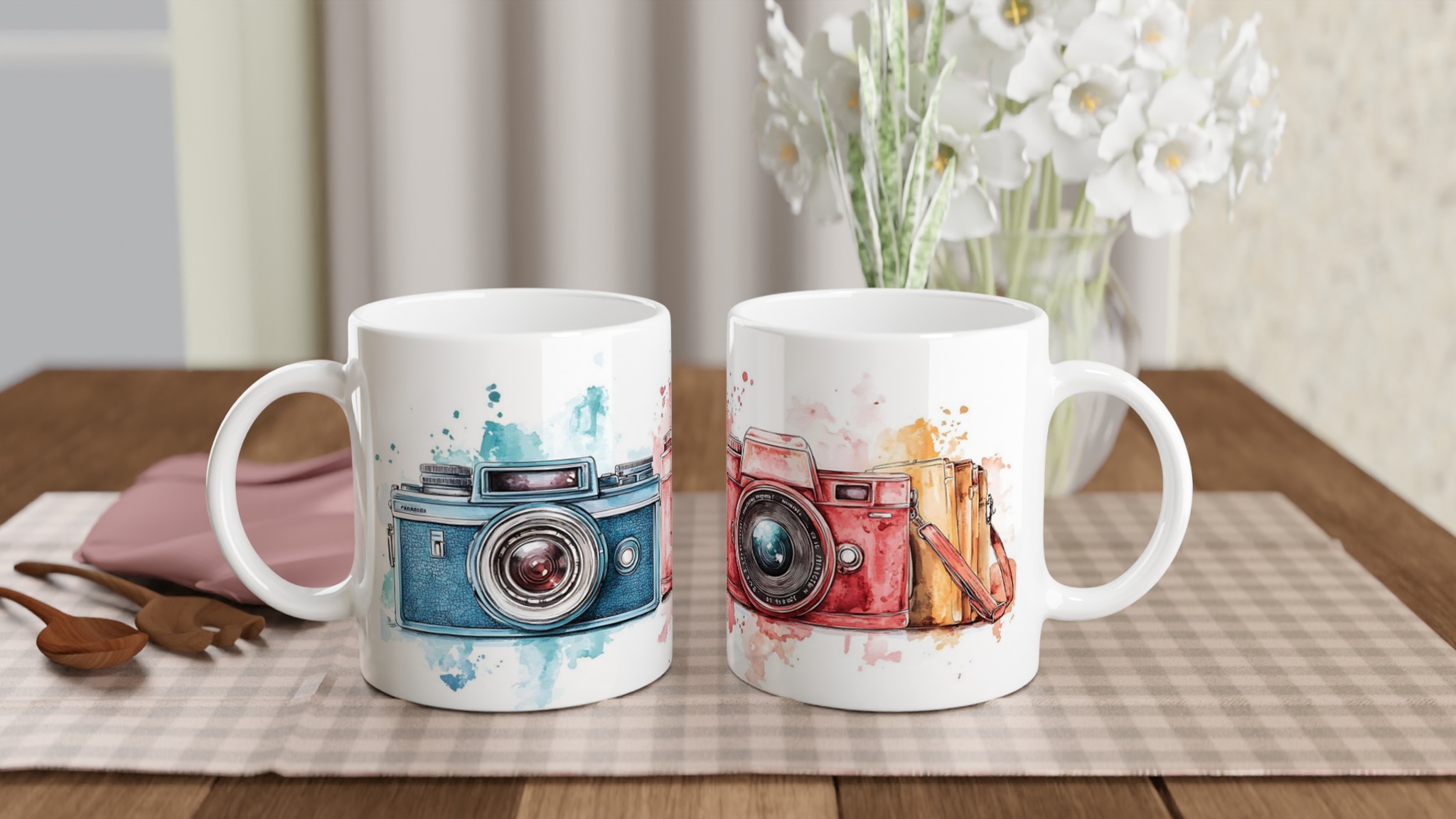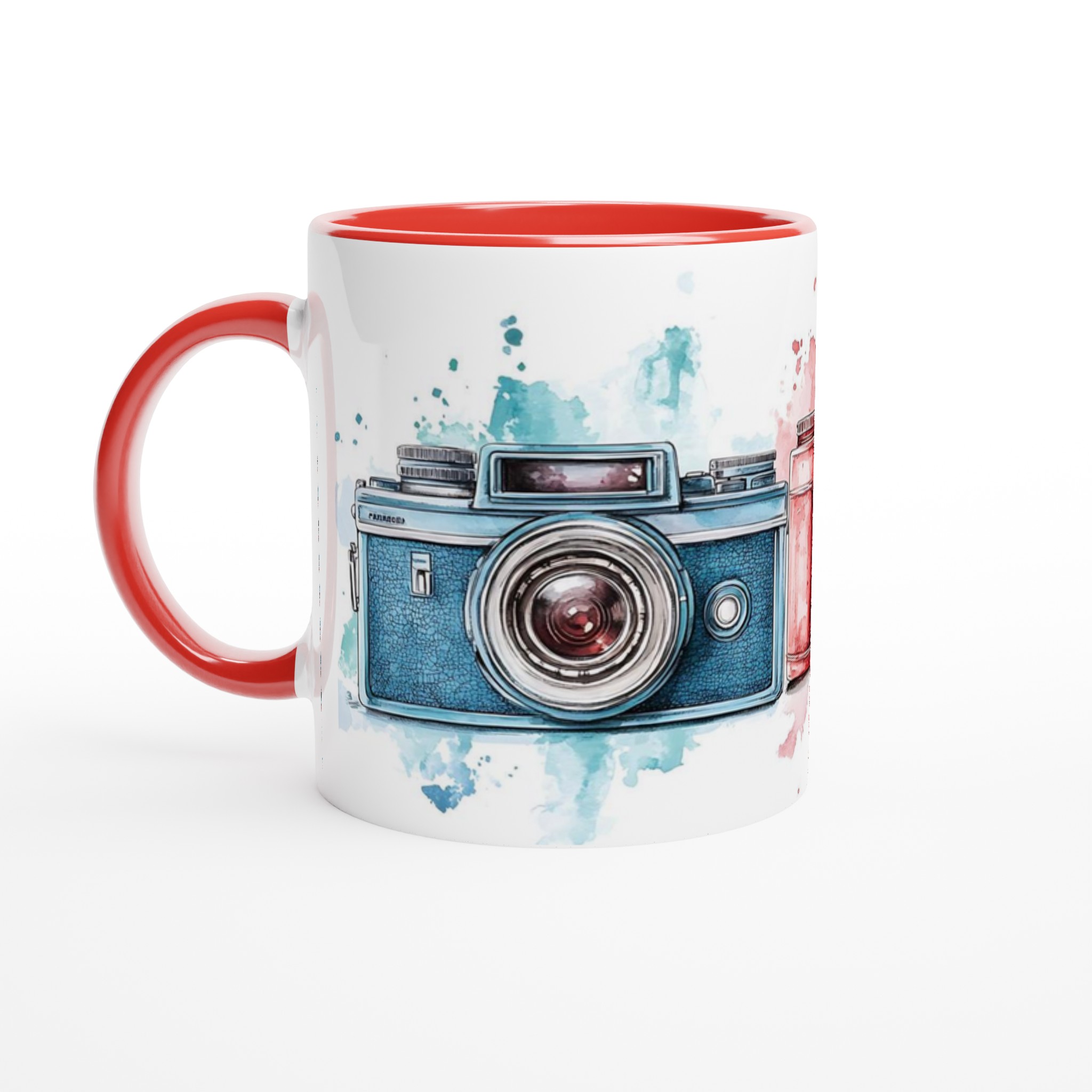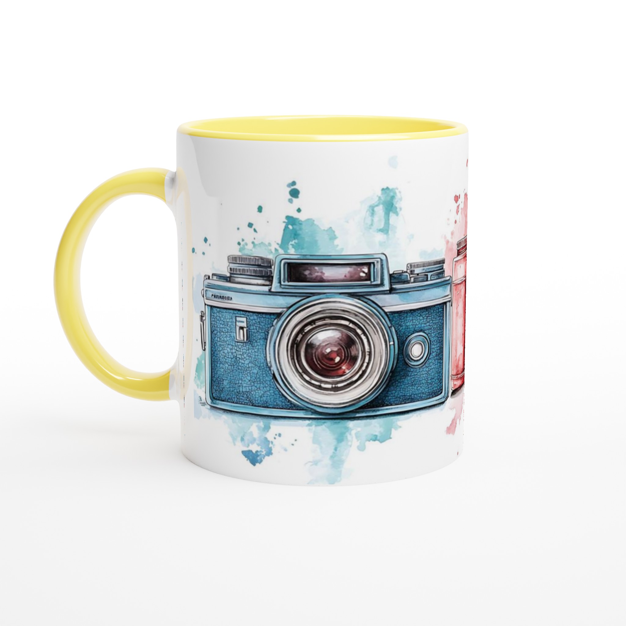 Vintage Camera Watercolor Splash – Artistic Ceramic Mug 11oz, in Your Choice of Seven Vibrant Hues