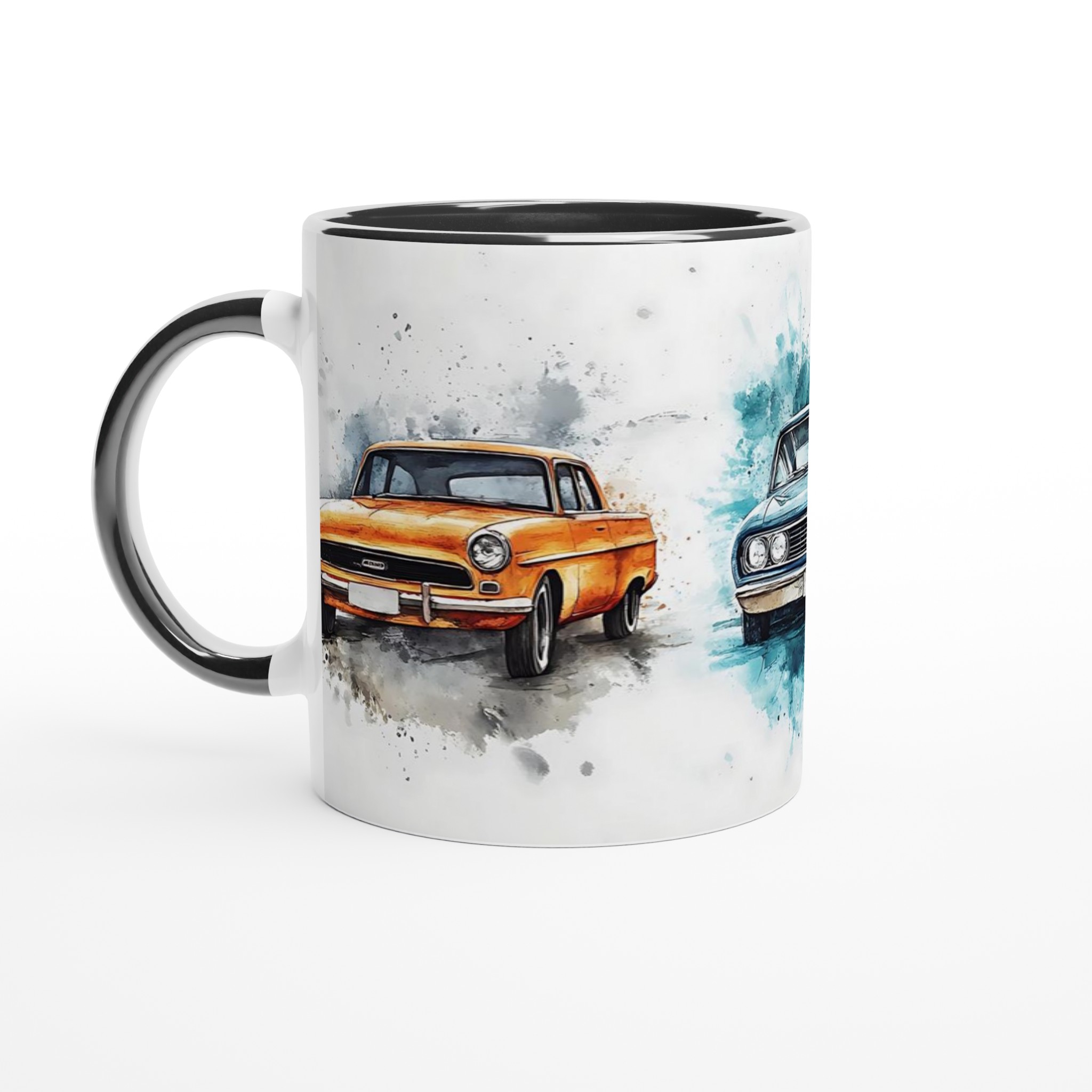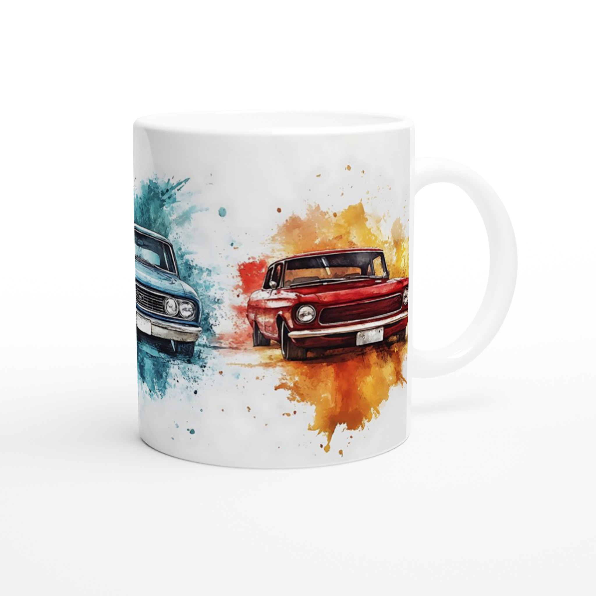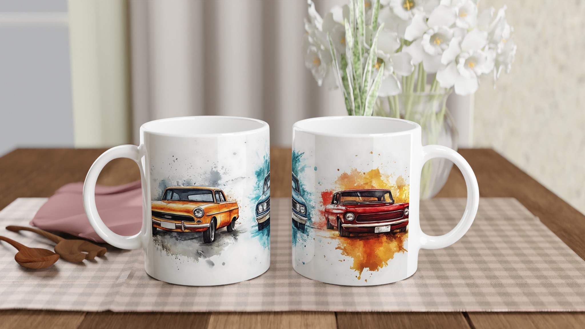 Classic Car Watercolor Splash Mug – Vibrant 11oz Ceramic in Your Choice of Seven Hues