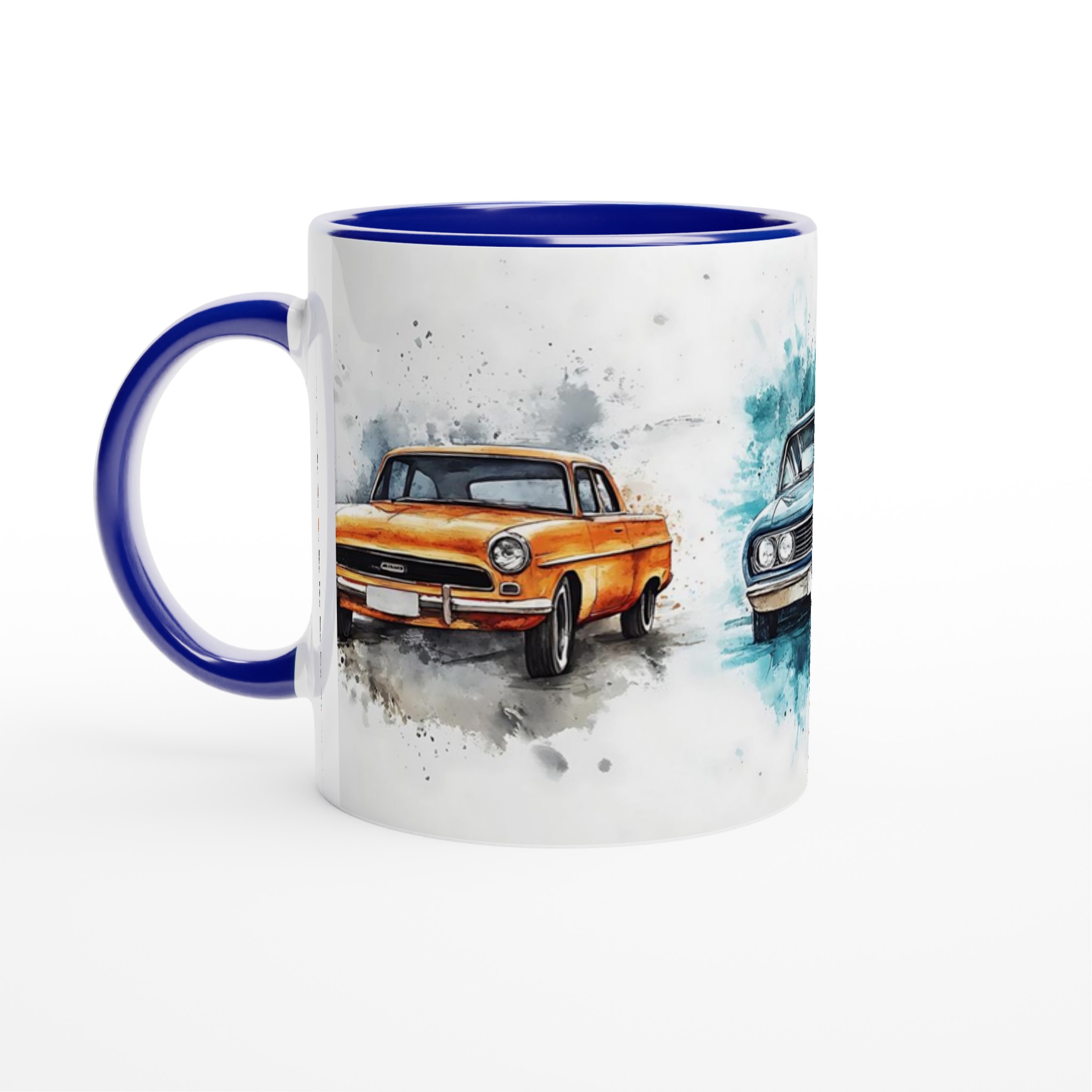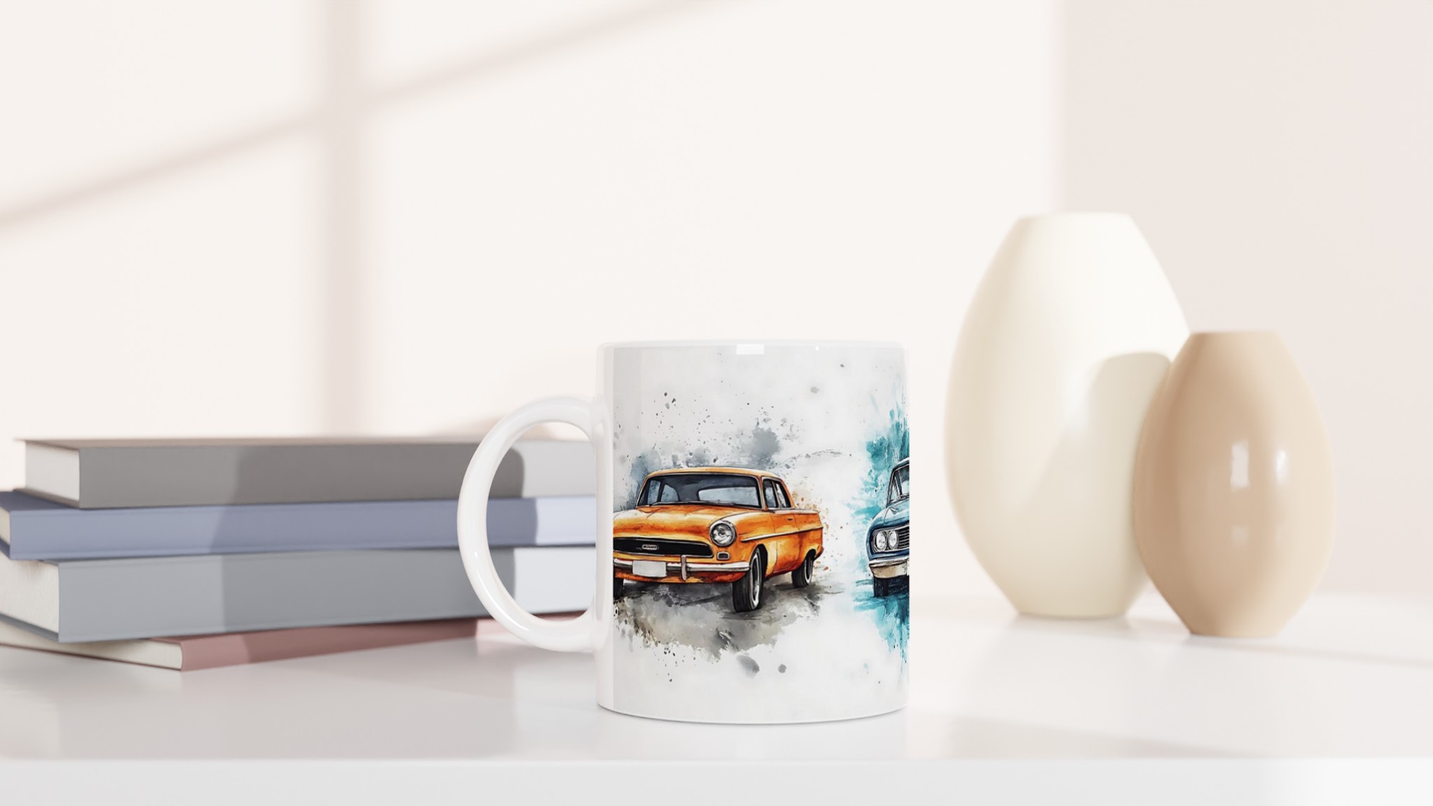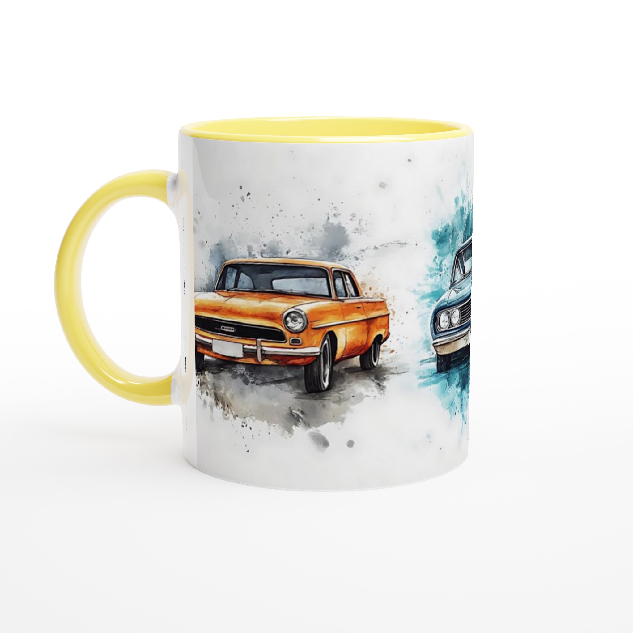 Classic Car Watercolor Splash Mug – Vibrant 11oz Ceramic in Your Choice of Seven Hues
