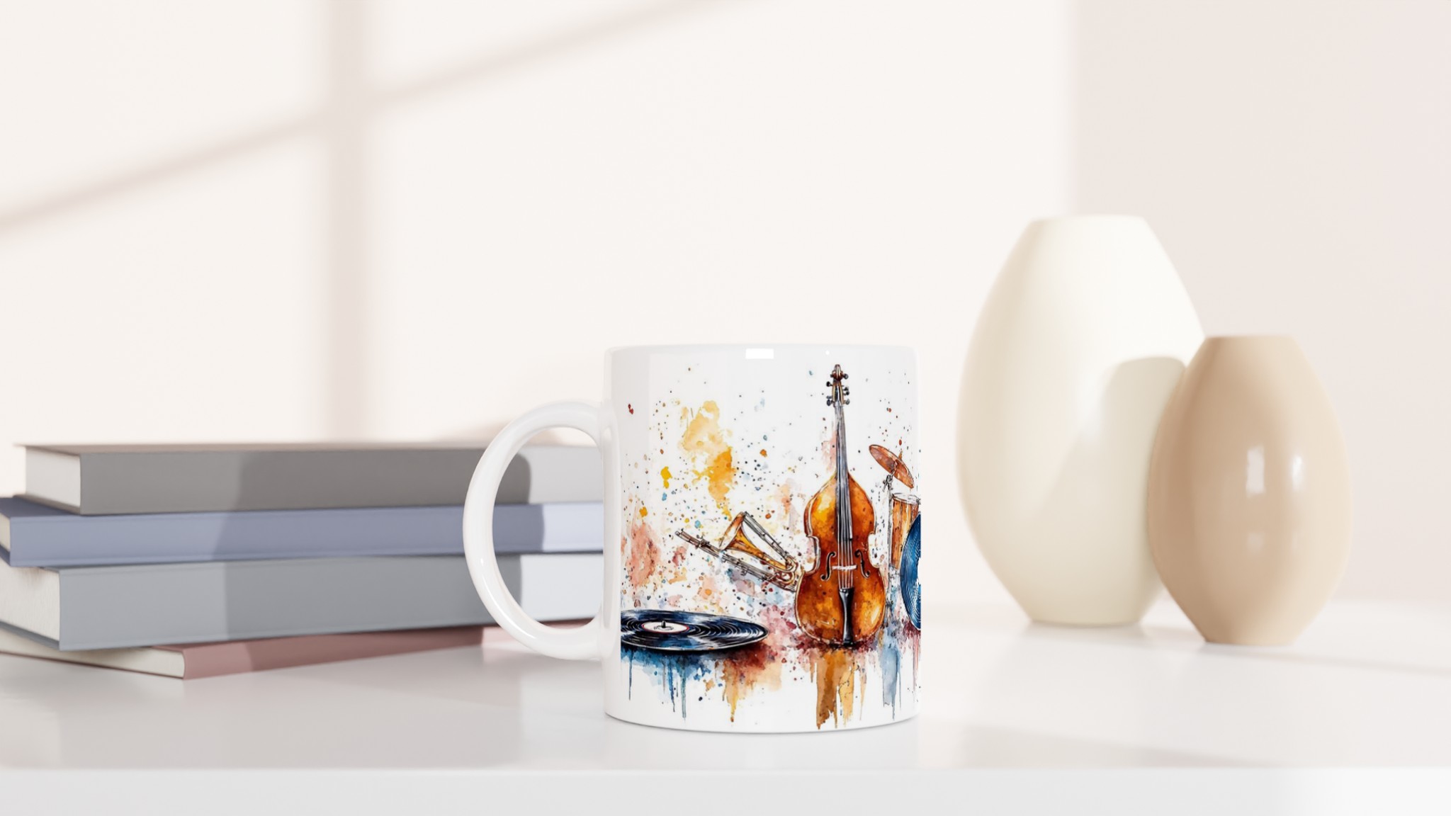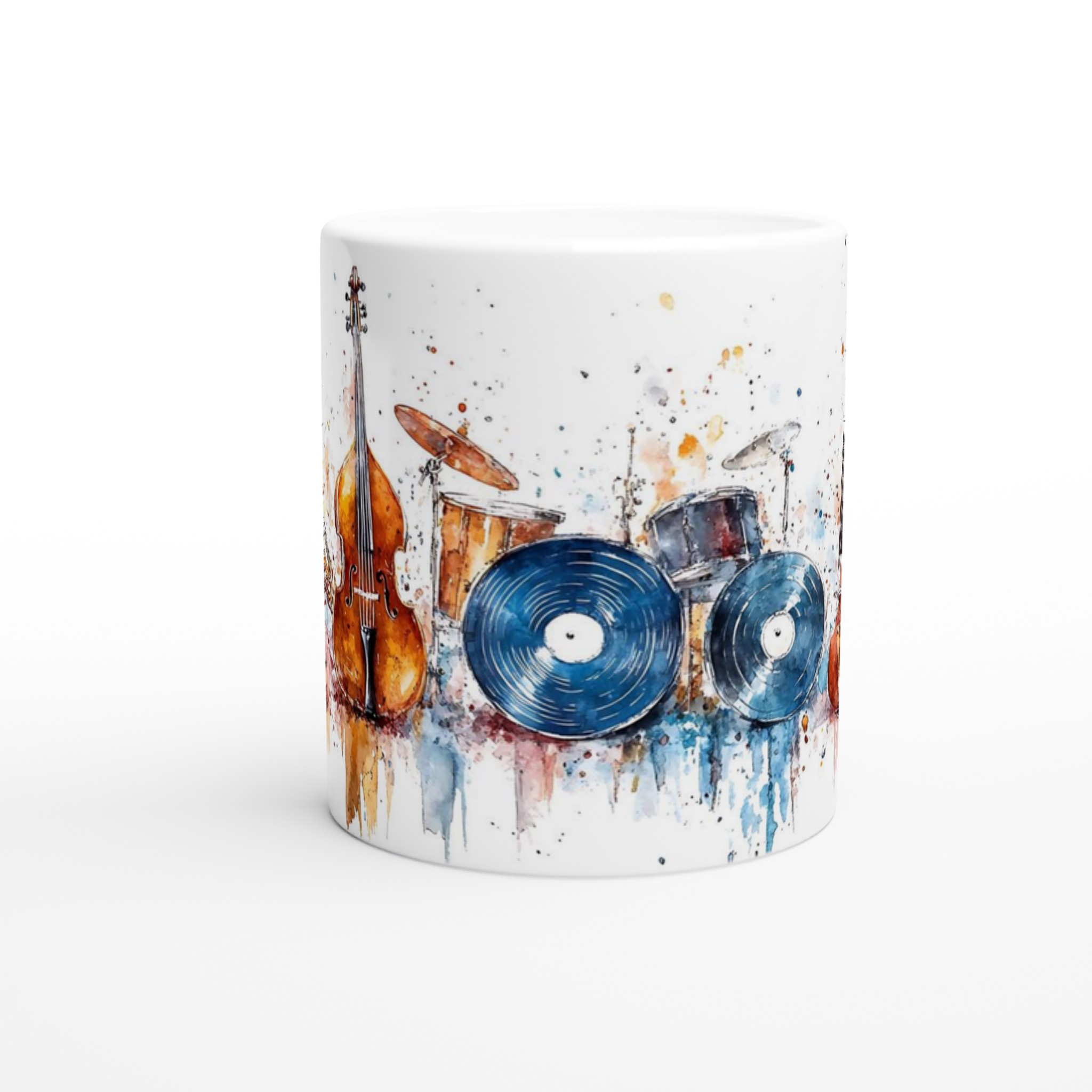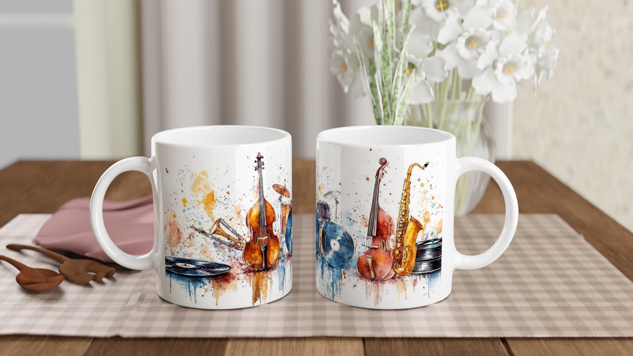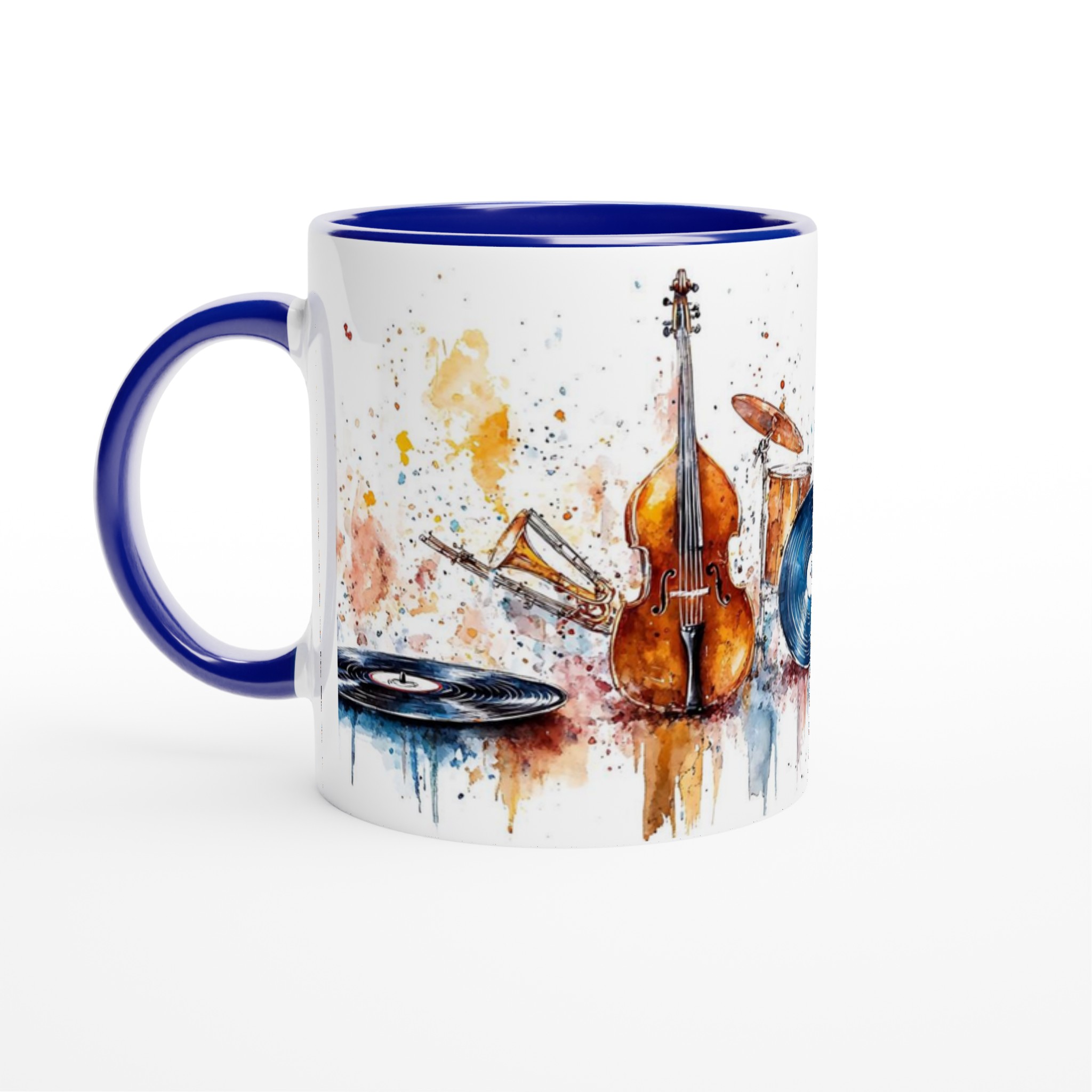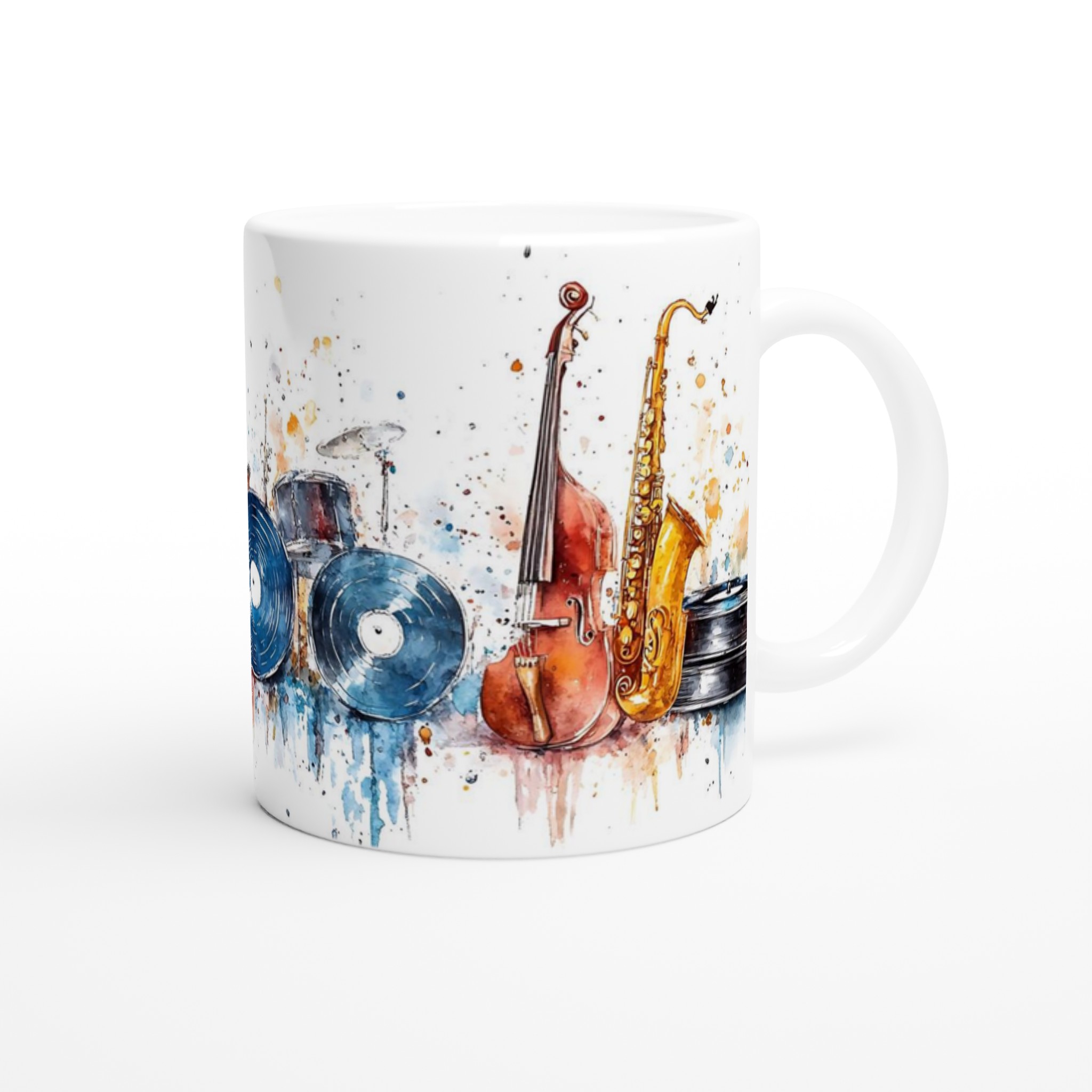 Jazz Fusion Watercolor Mug – Dynamic Music Art 11oz Ceramic Mug in Your Choice of Seven Vibrant Colors