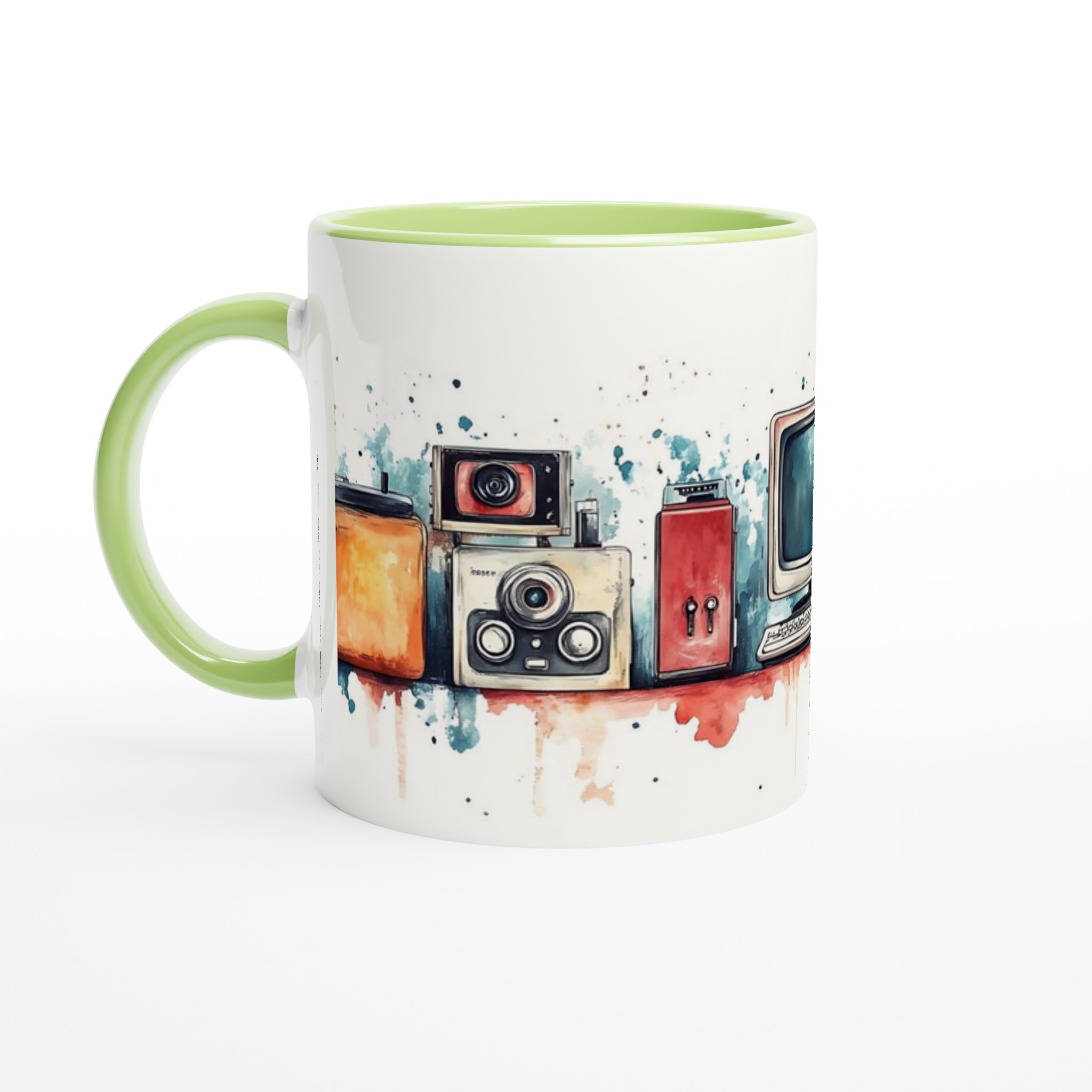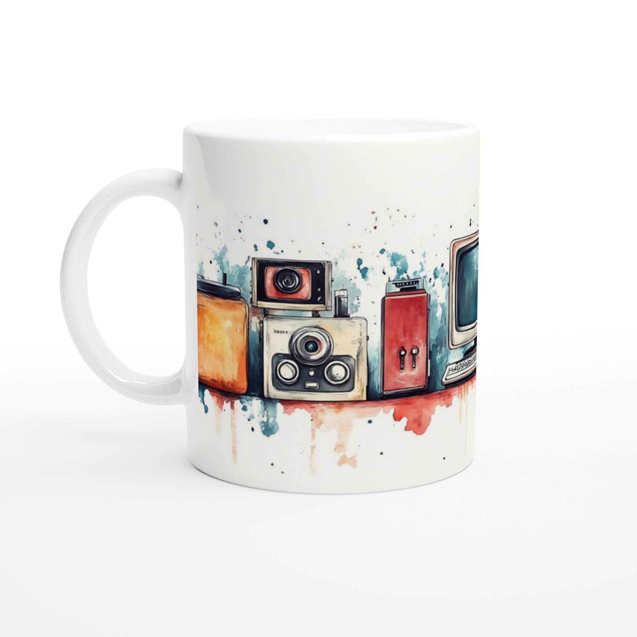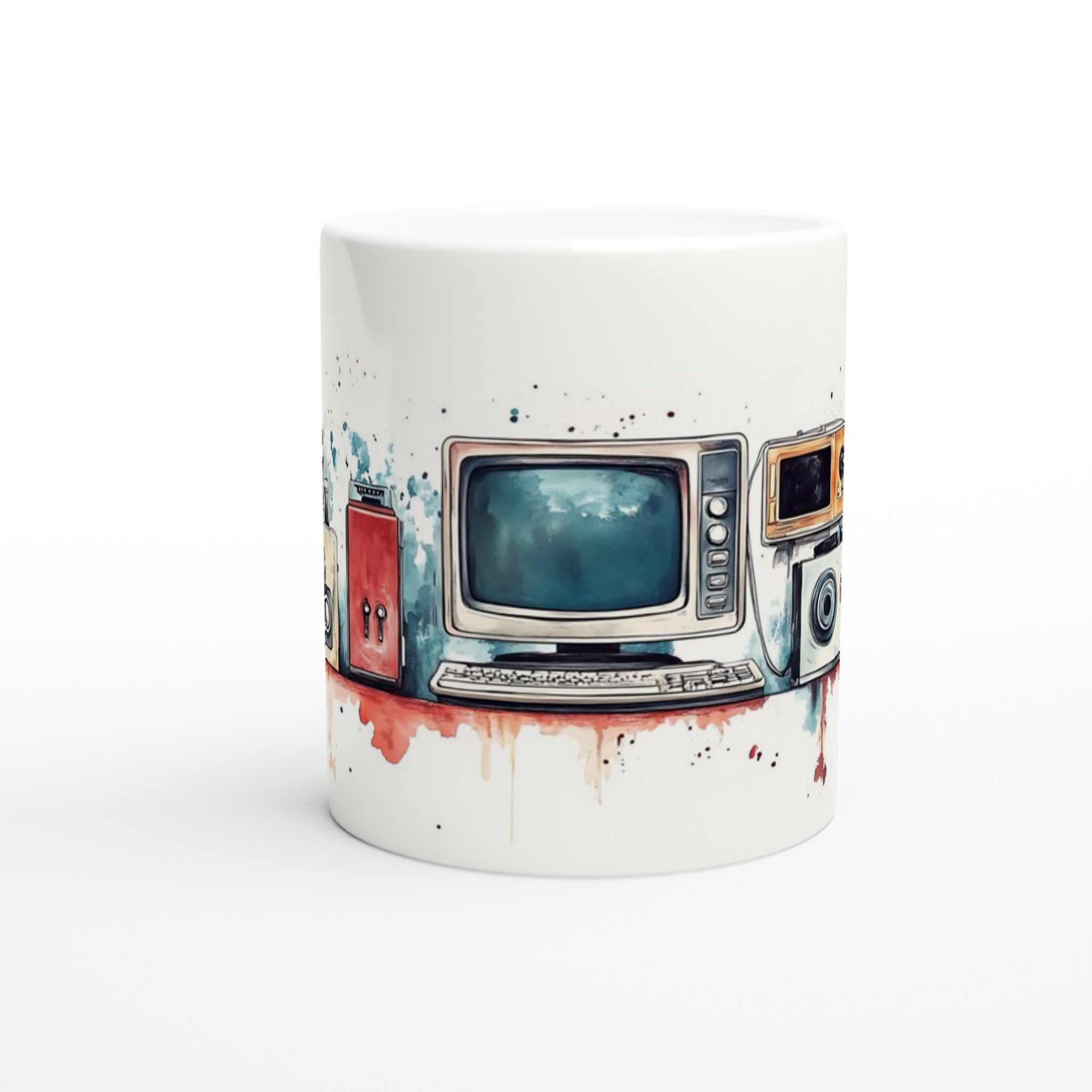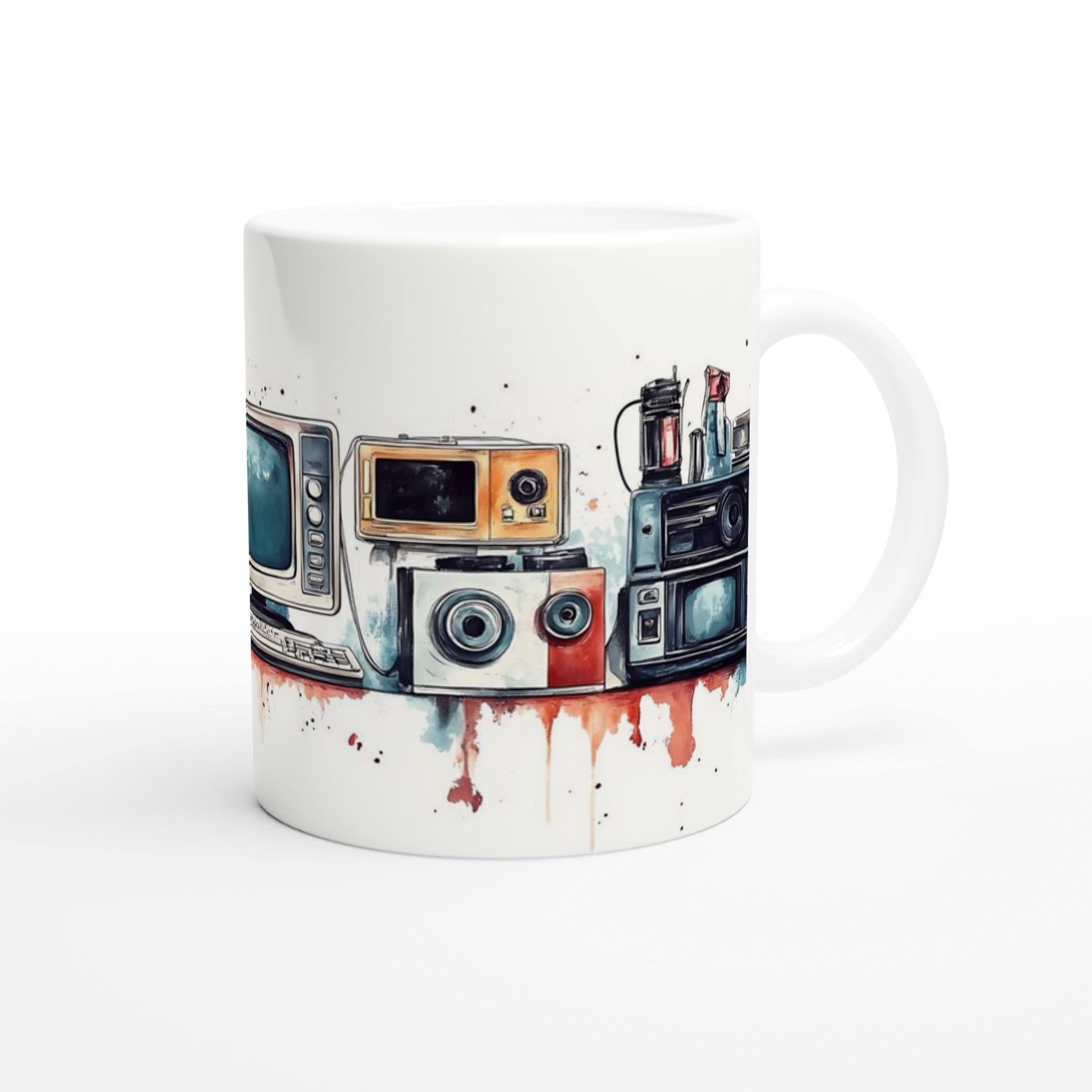 Retro Tech Chic – Watercolor Art Ceramic Mug, 11oz – Your Choice of 7 Vibrant Colors!