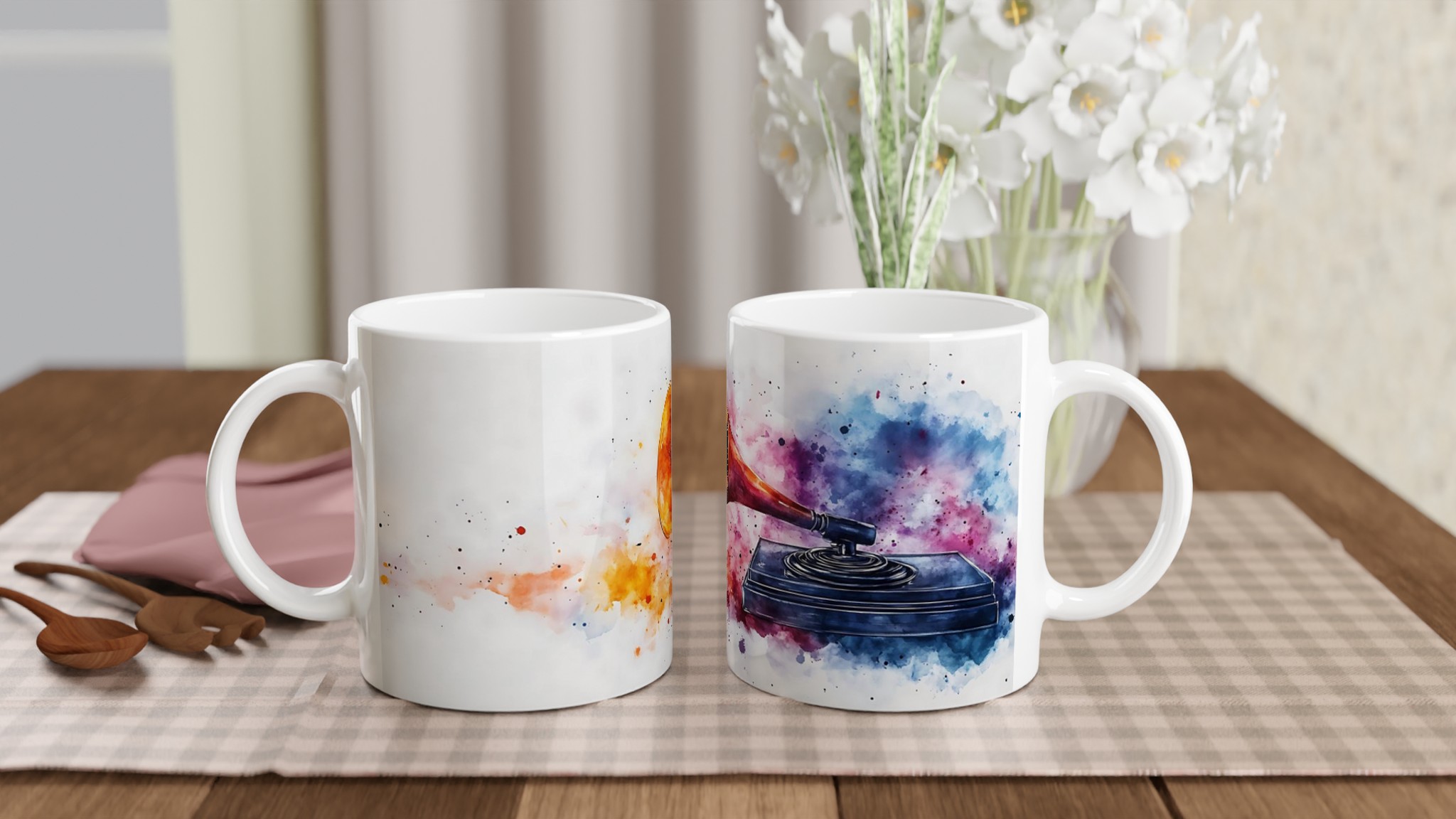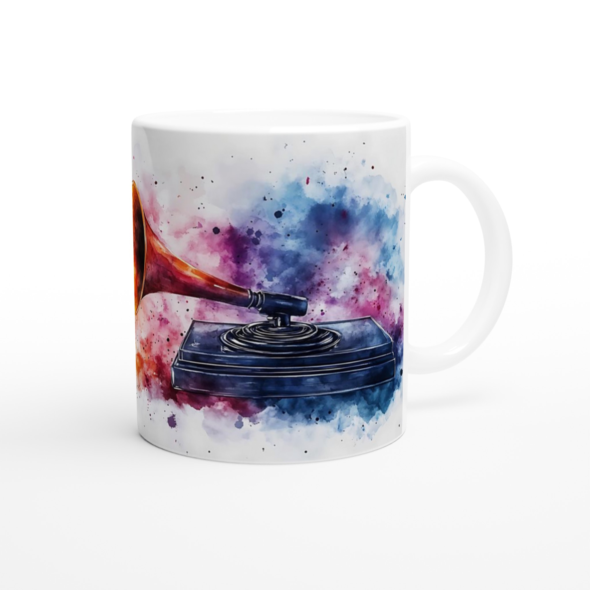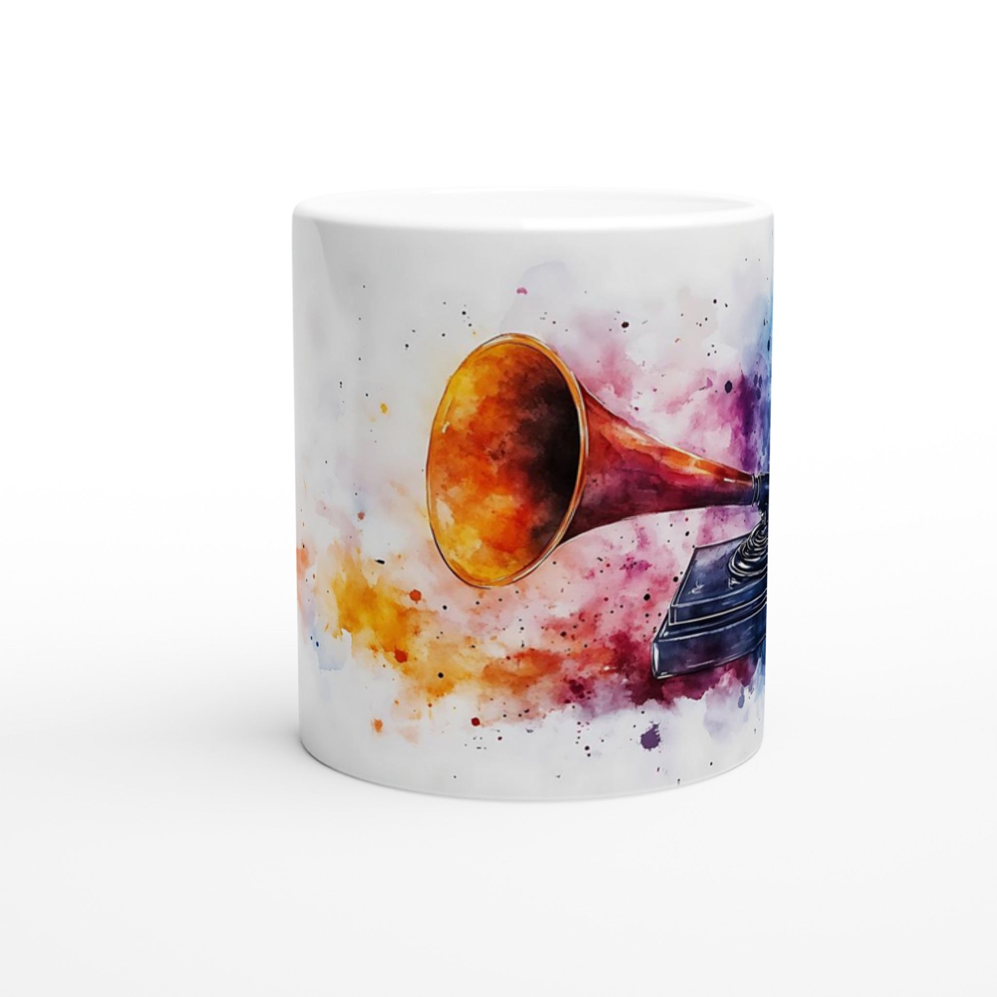 Vintage Harmony – Artistic Watercolor Gramophone Ceramic Mug, in your choice of seven vibrant hues
