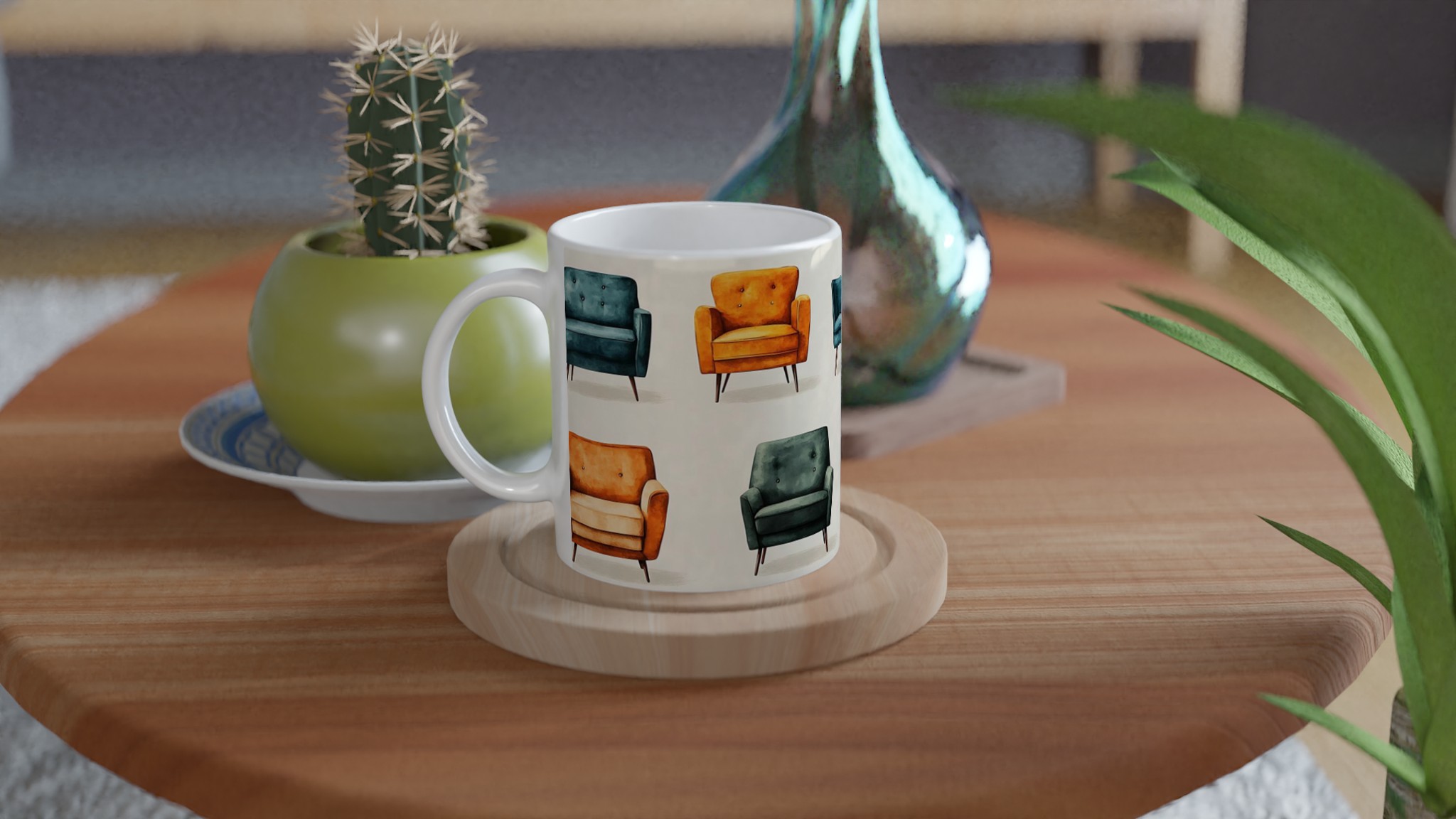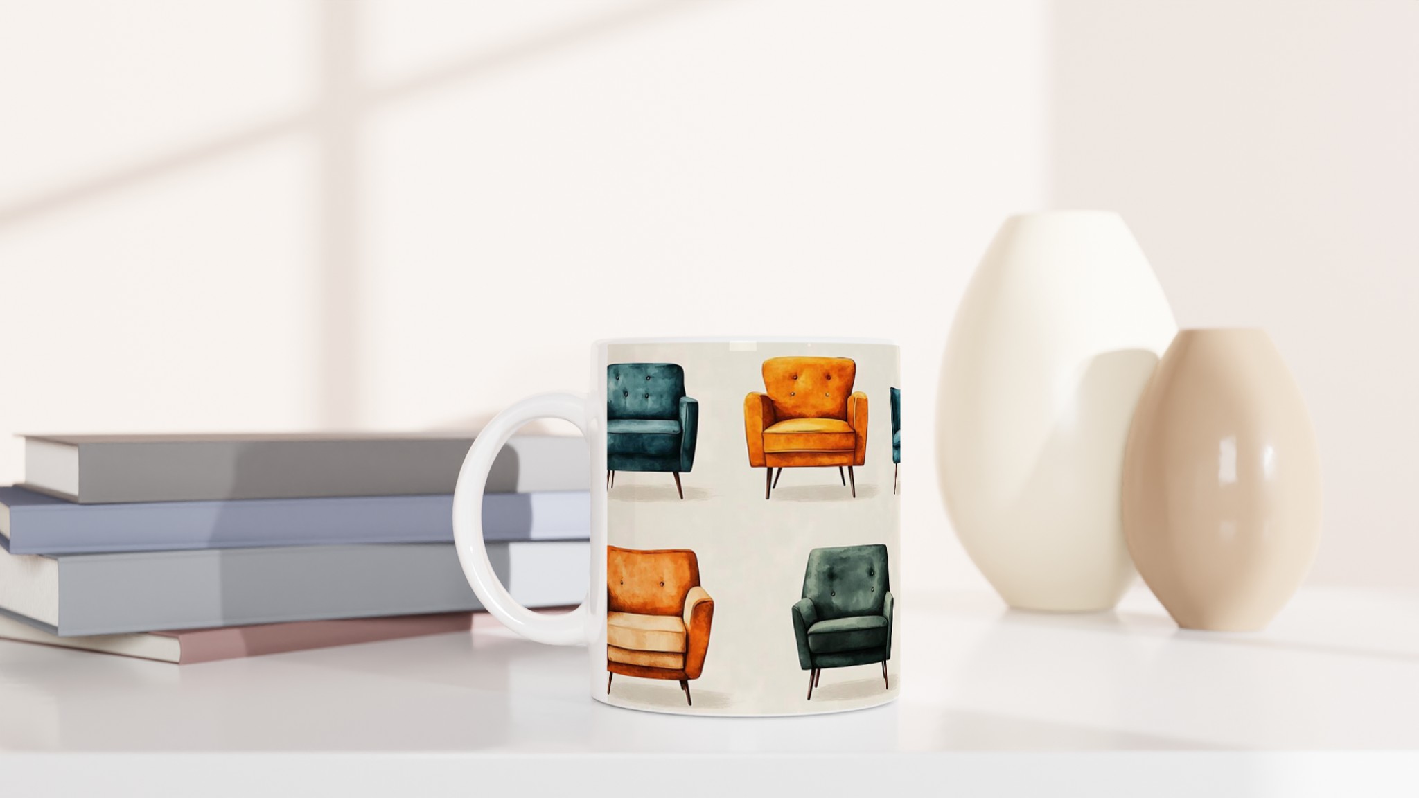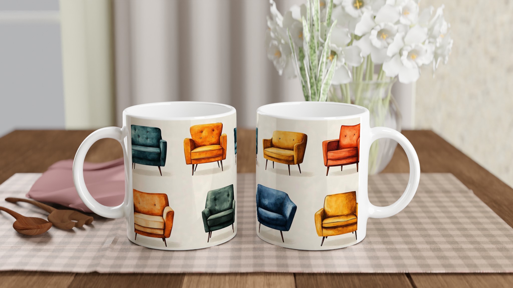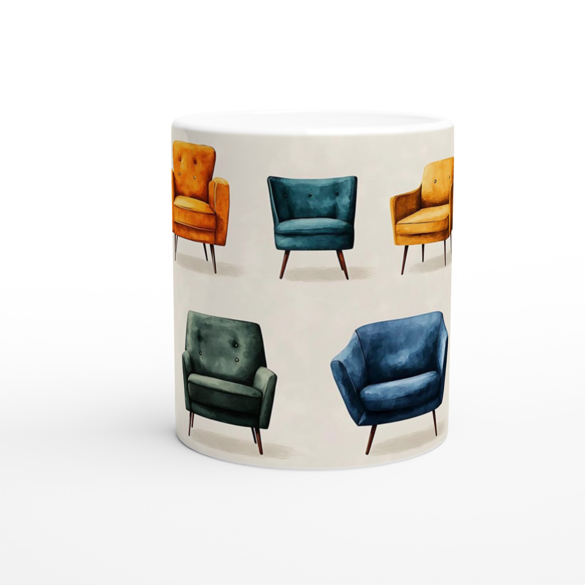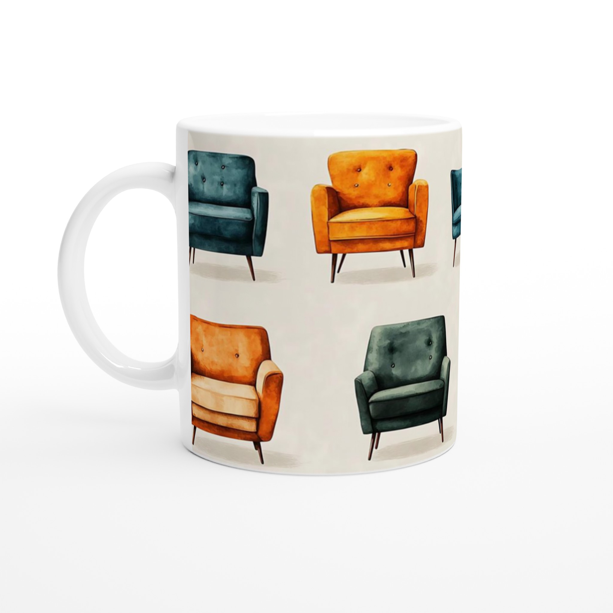 Retro Comfort: Mid-Century Modern Armchair White Ceramic Mug 11oz – Choose Your Vibrant Hue