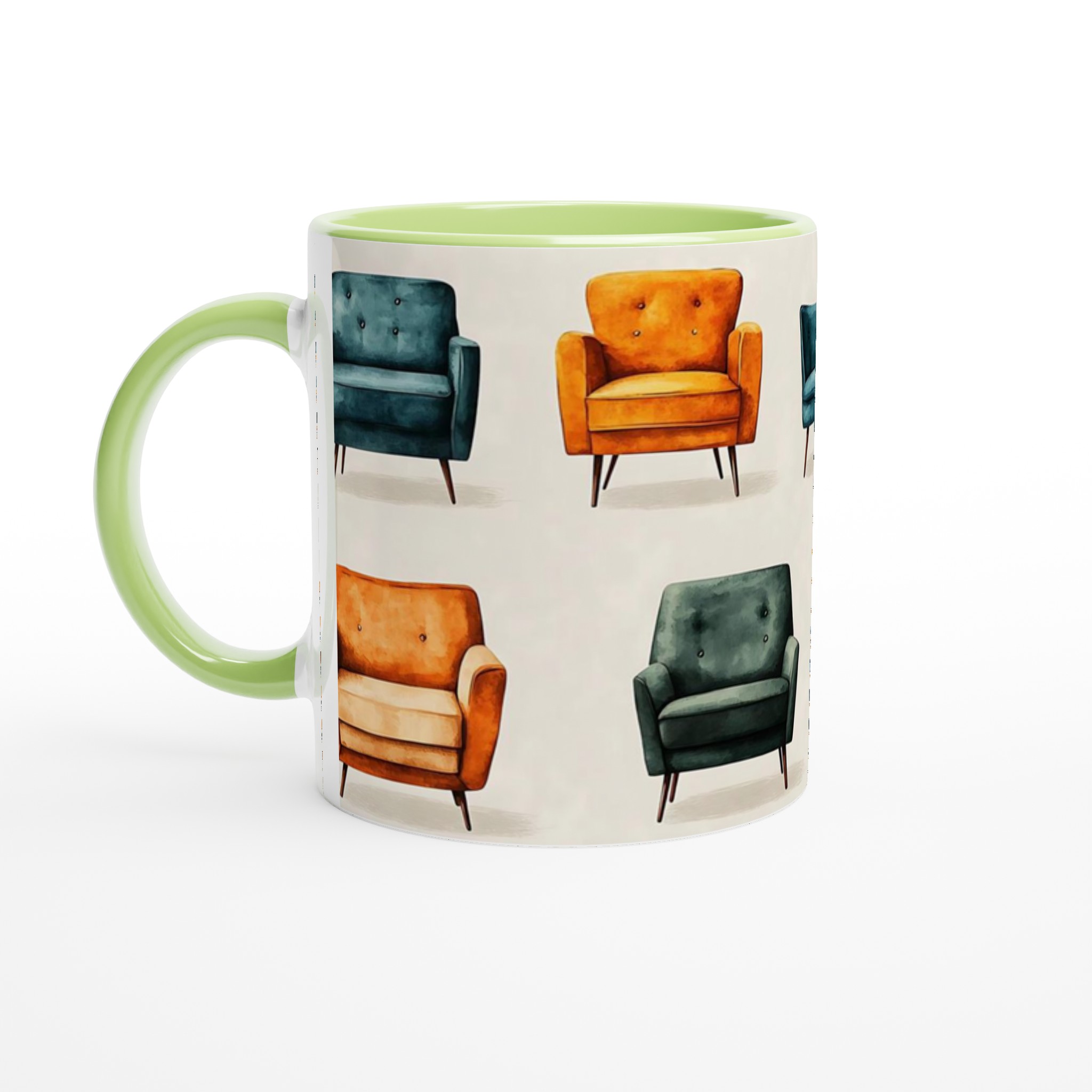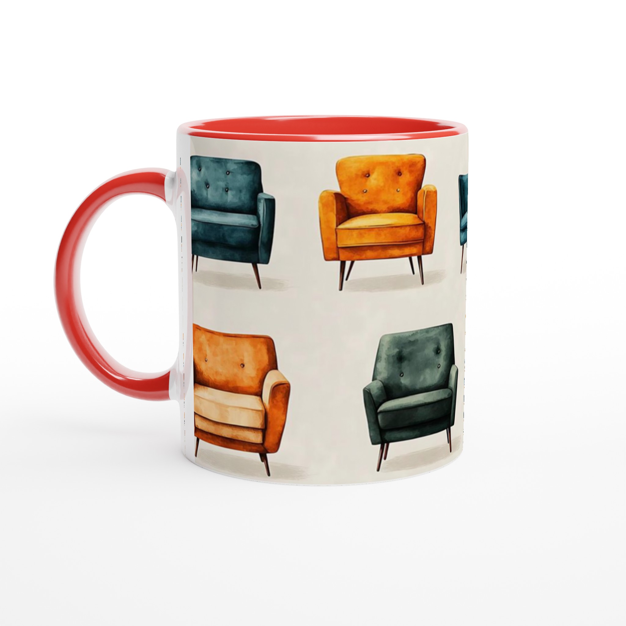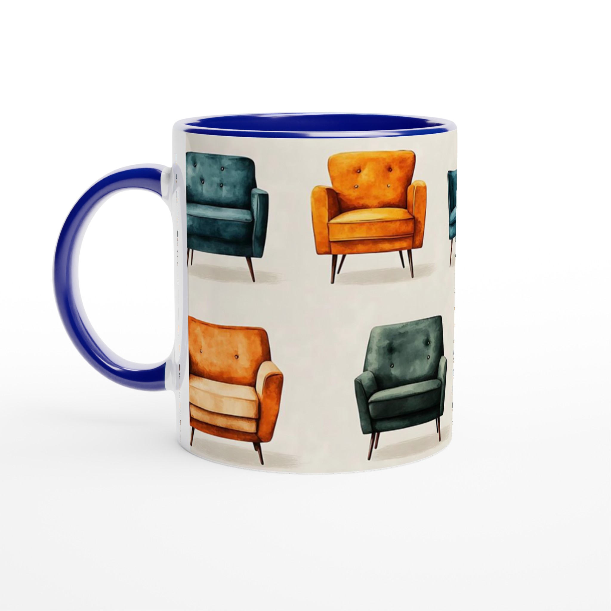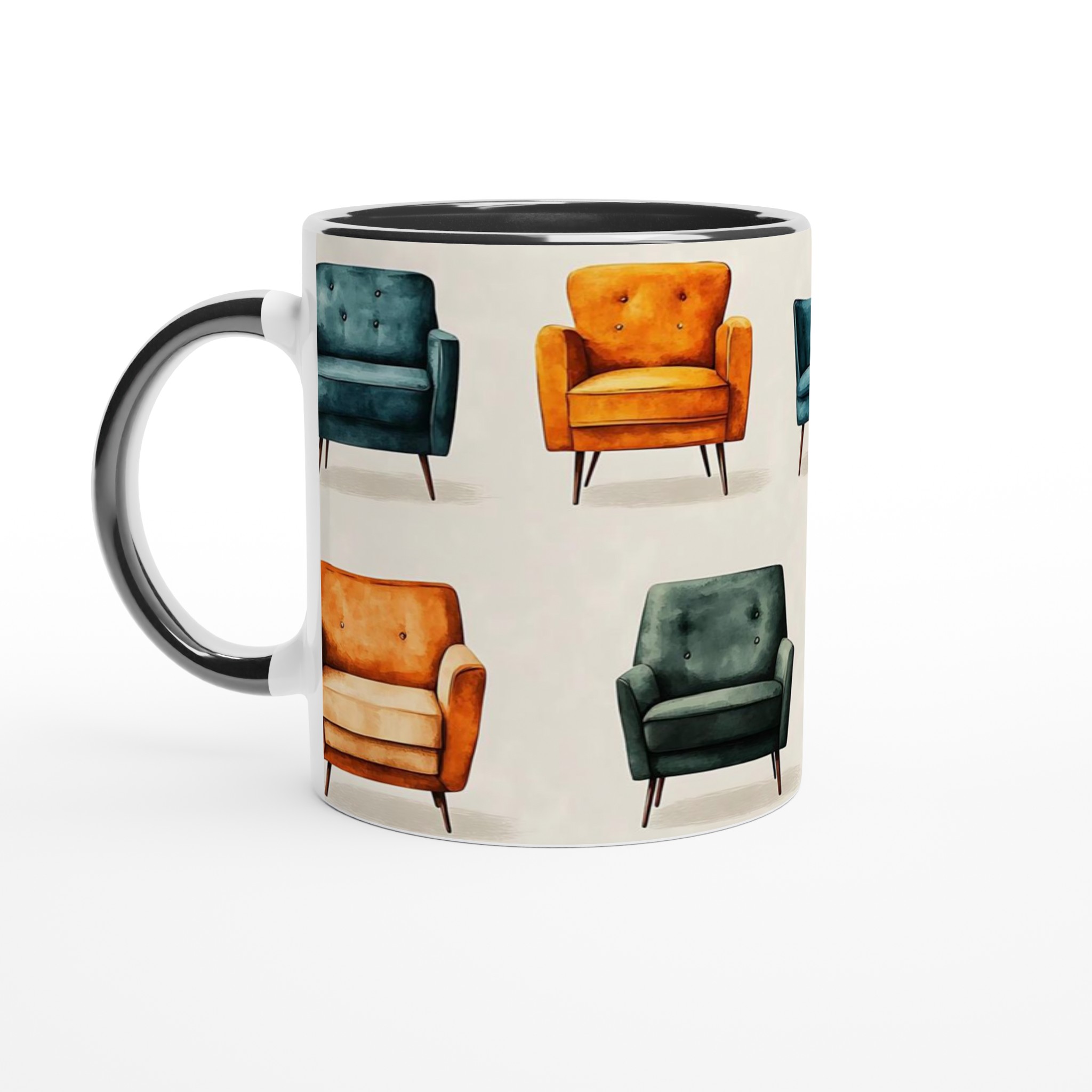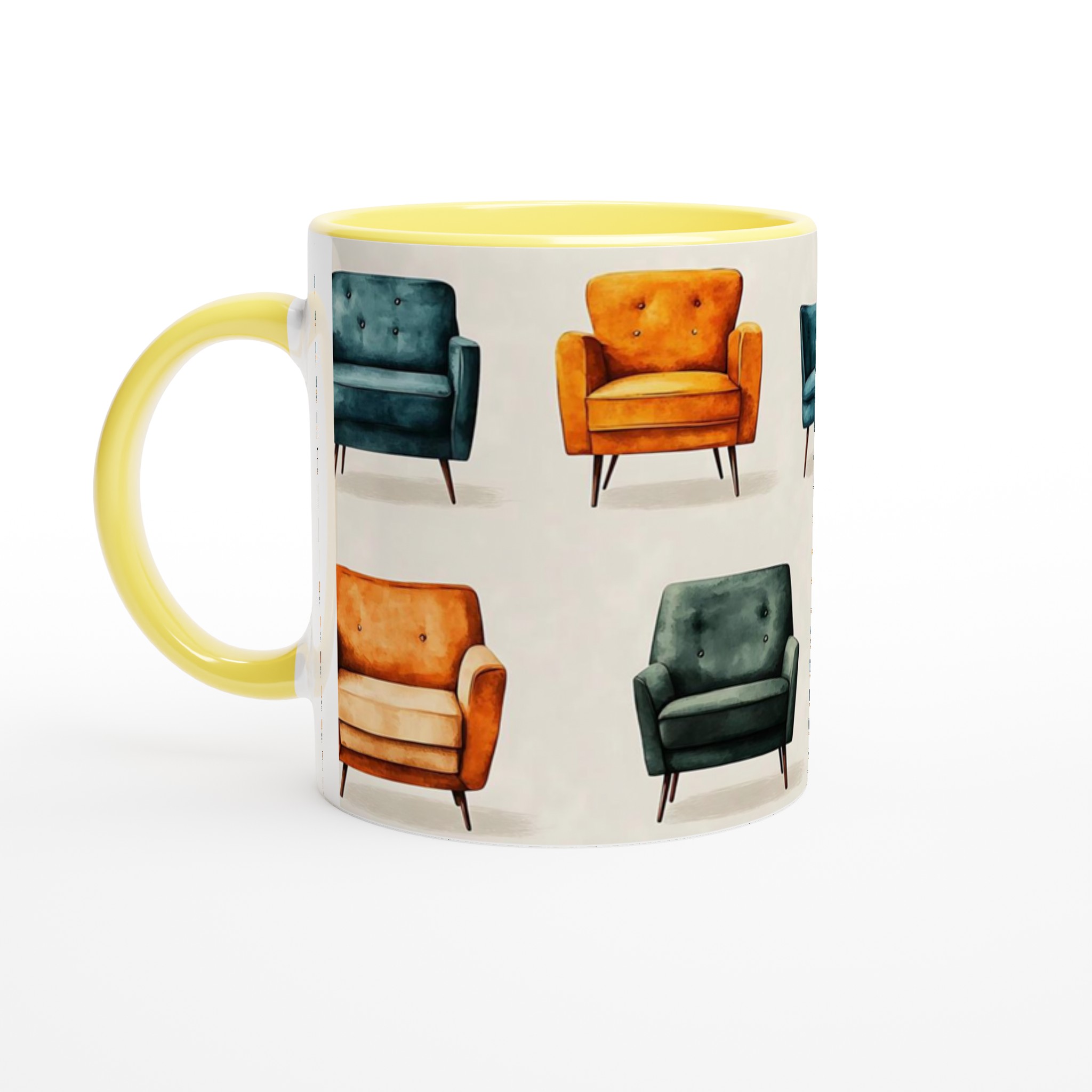 Retro Comfort: Mid-Century Modern Armchair White Ceramic Mug 11oz – Choose Your Vibrant Hue