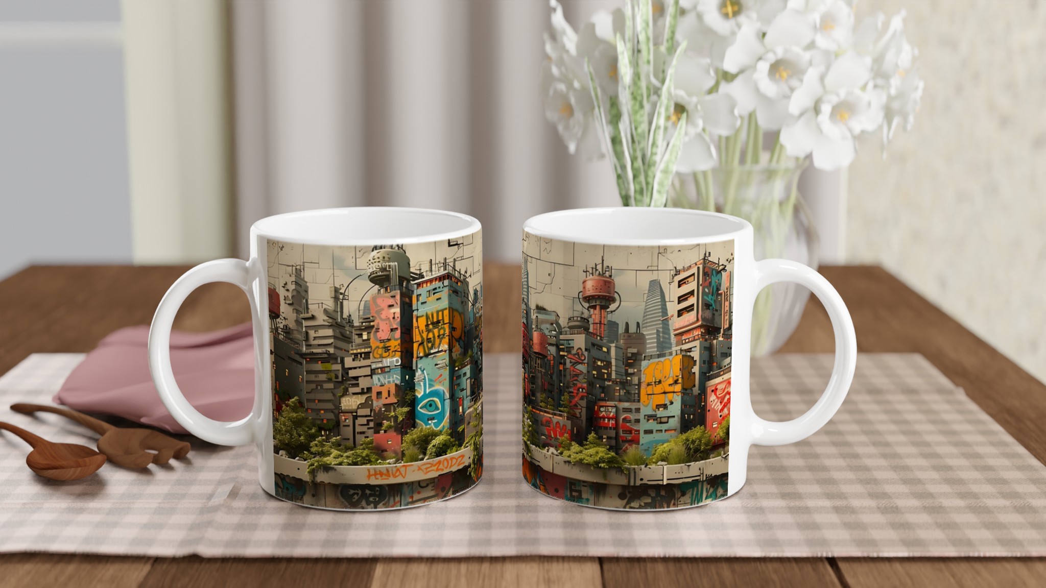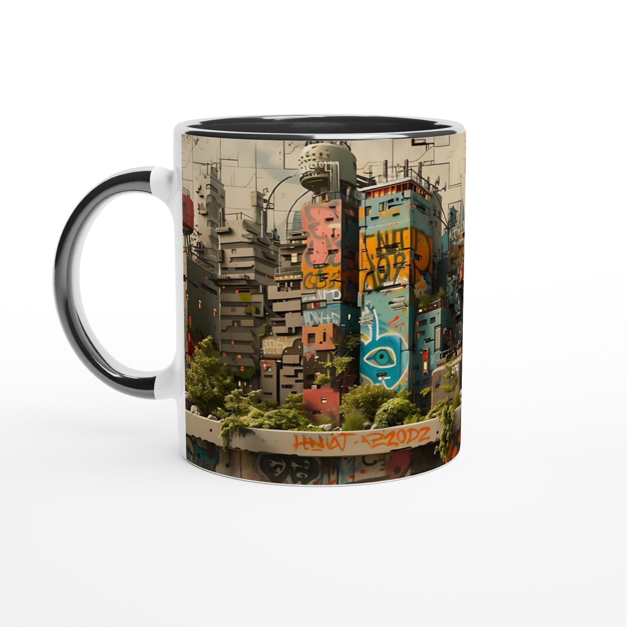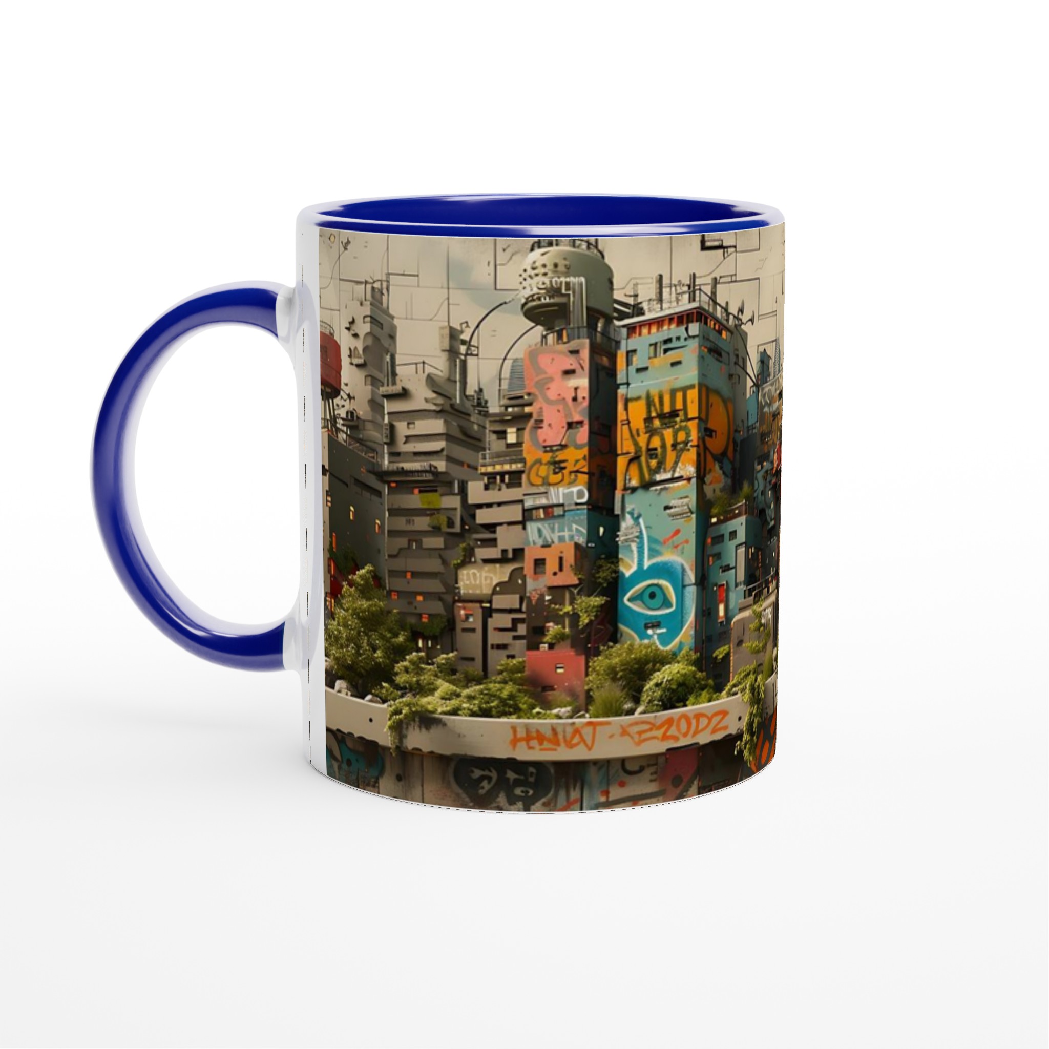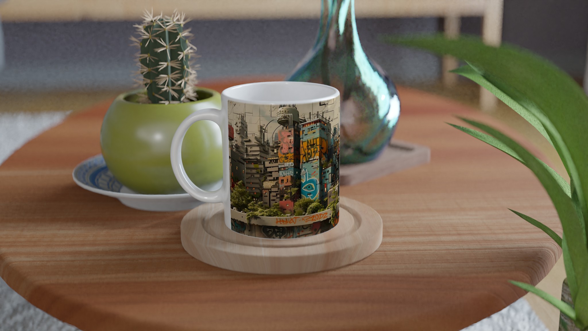 Urban Artistry – Graffiti Cityscape Ceramic Mug 11oz, in your choice of seven vibrant hues