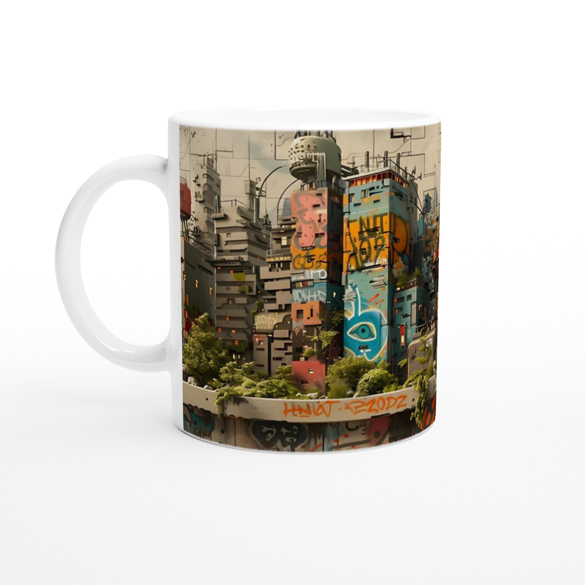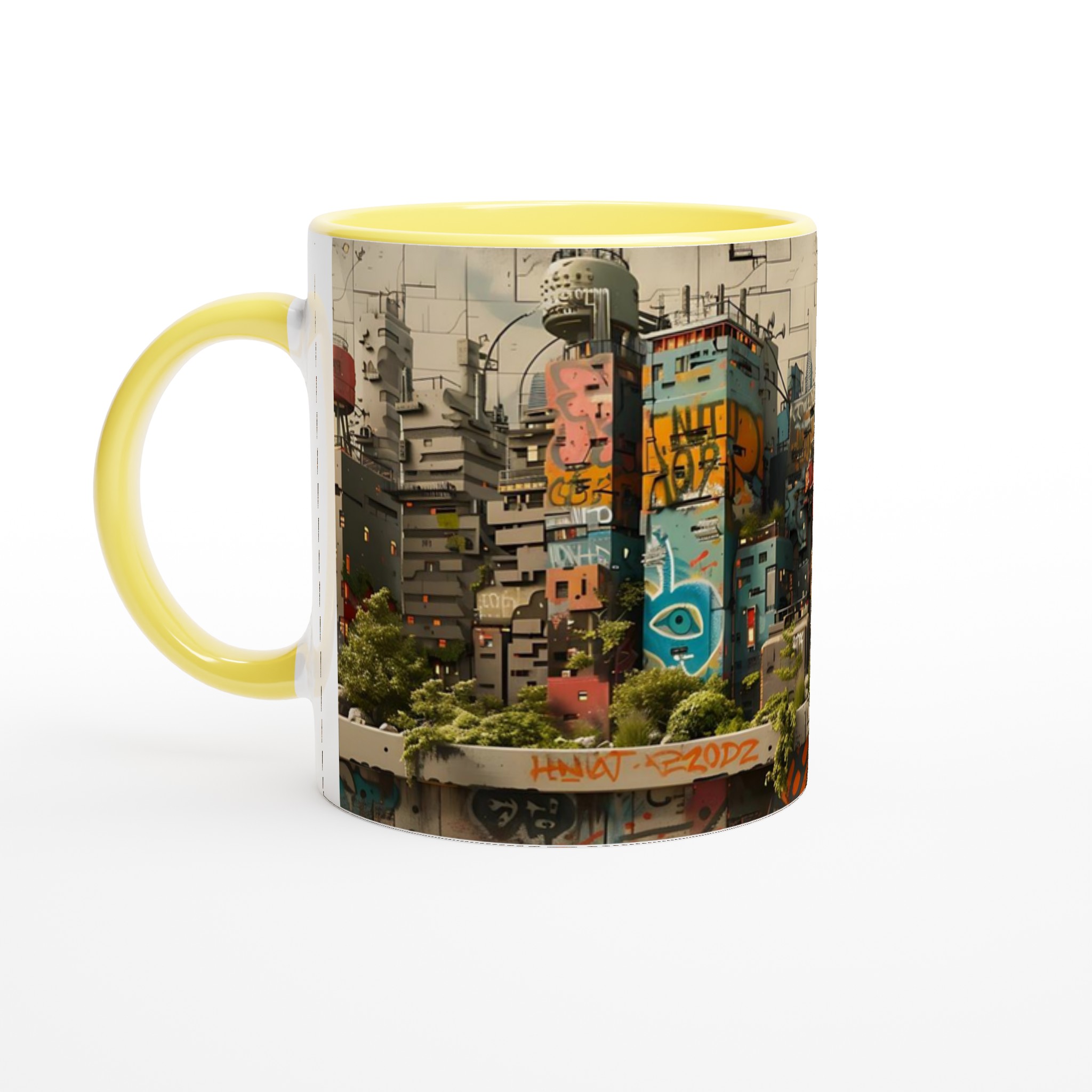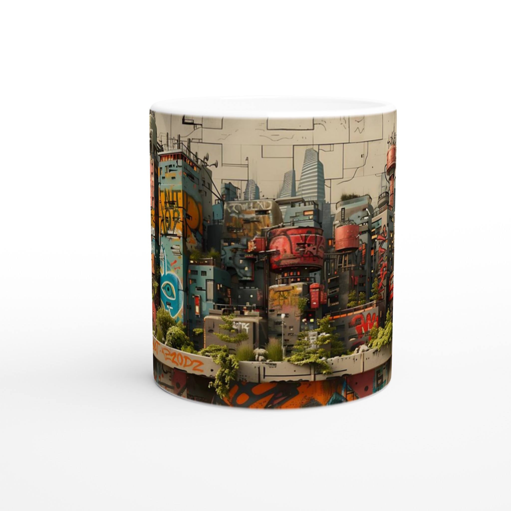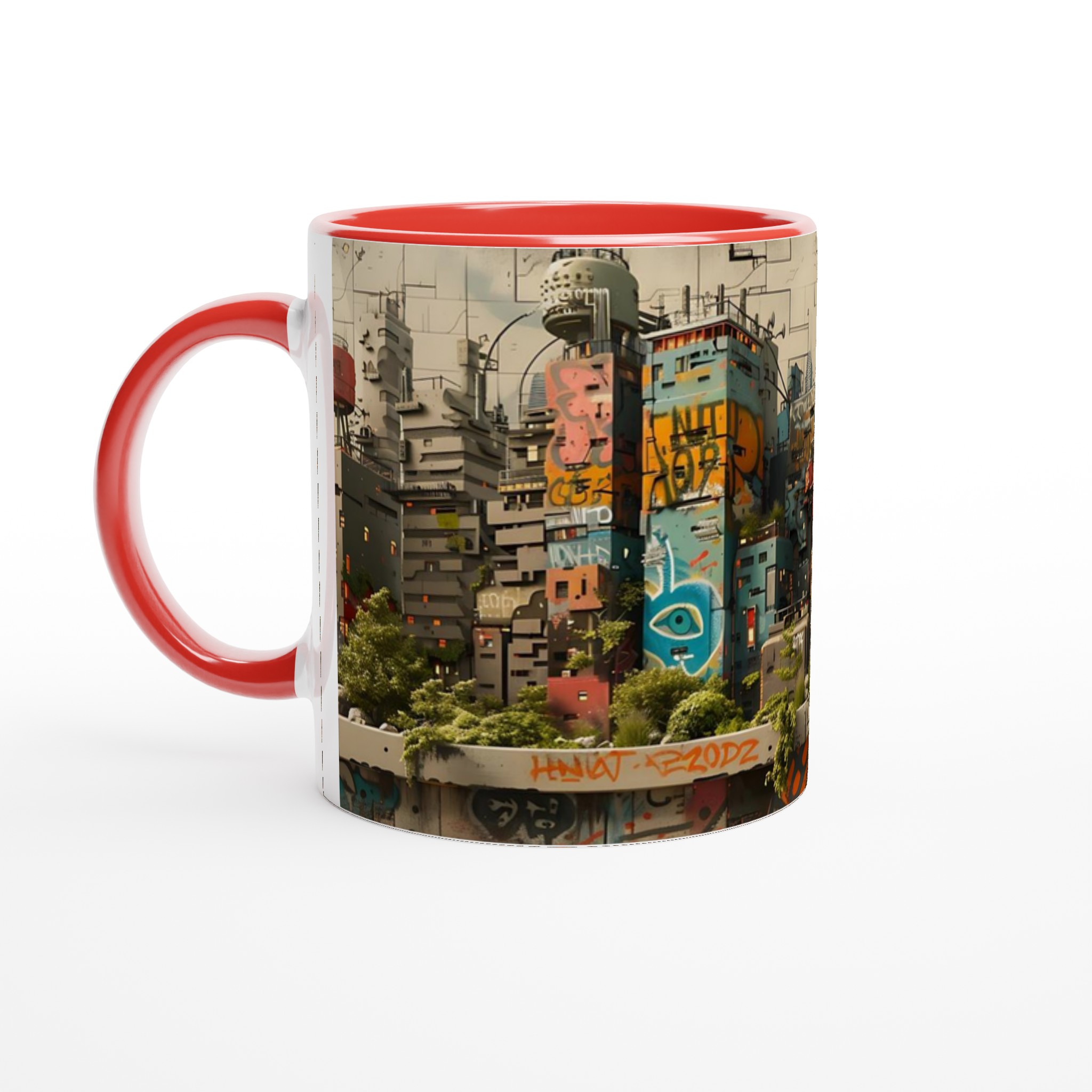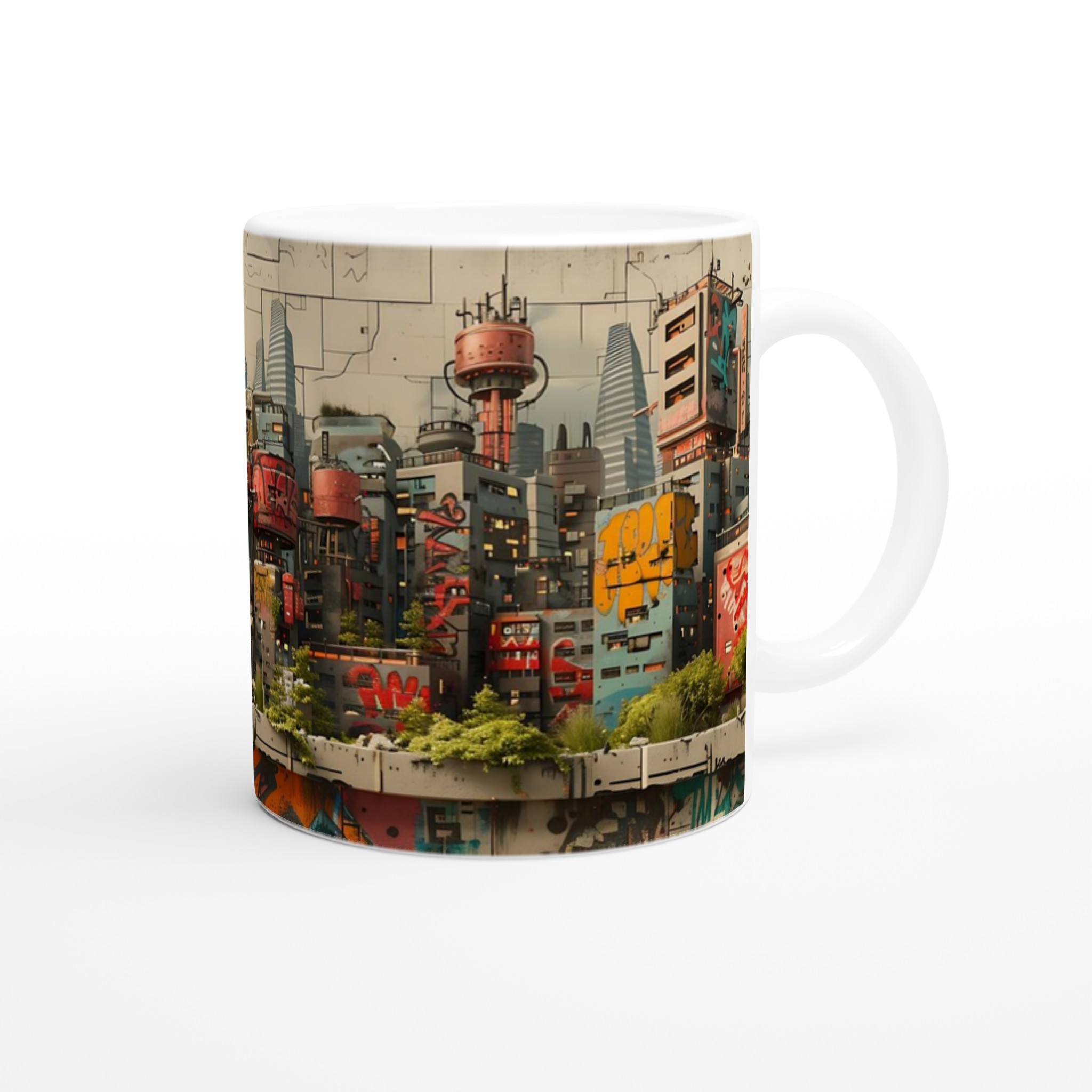 Urban Artistry – Graffiti Cityscape Ceramic Mug 11oz, in your choice of seven vibrant hues