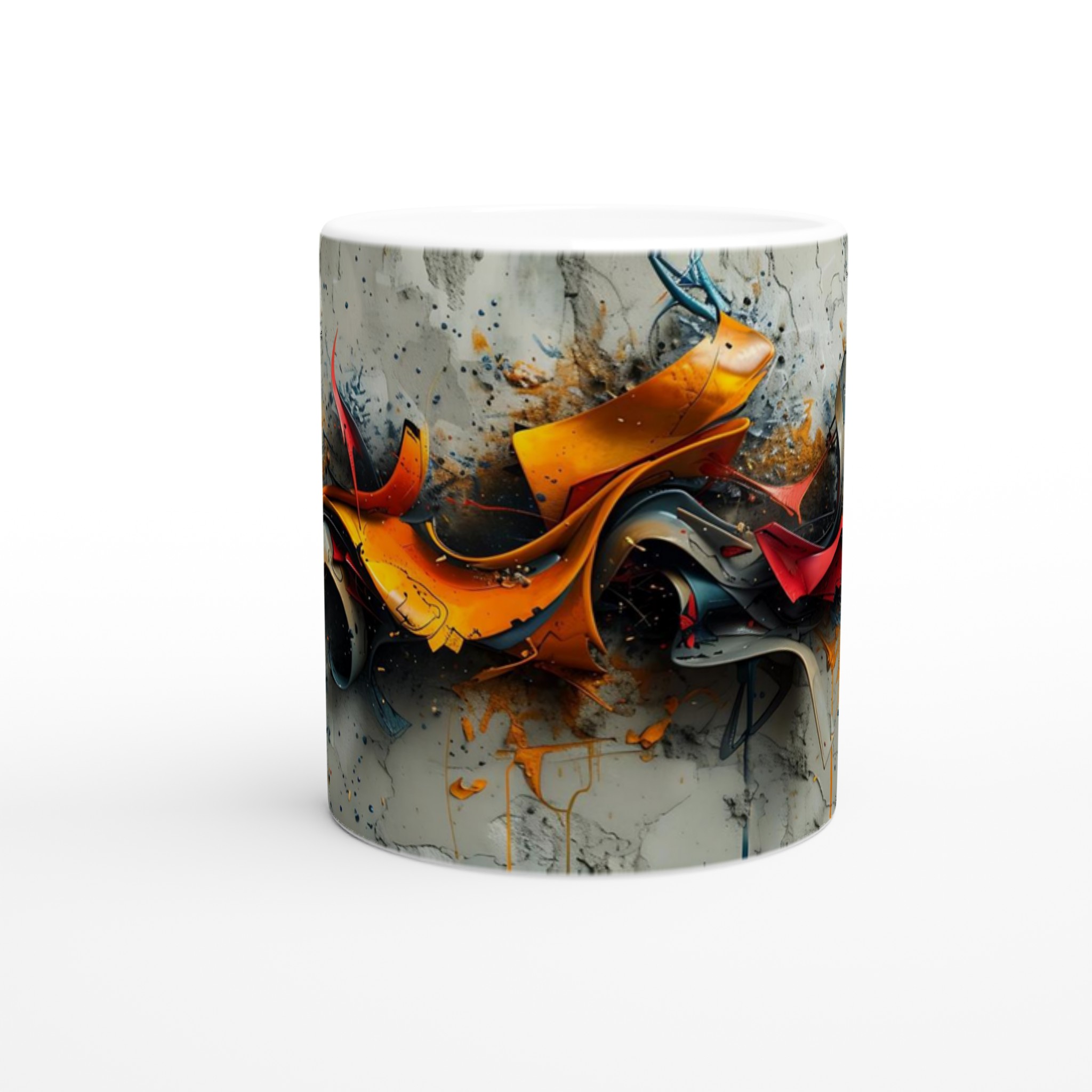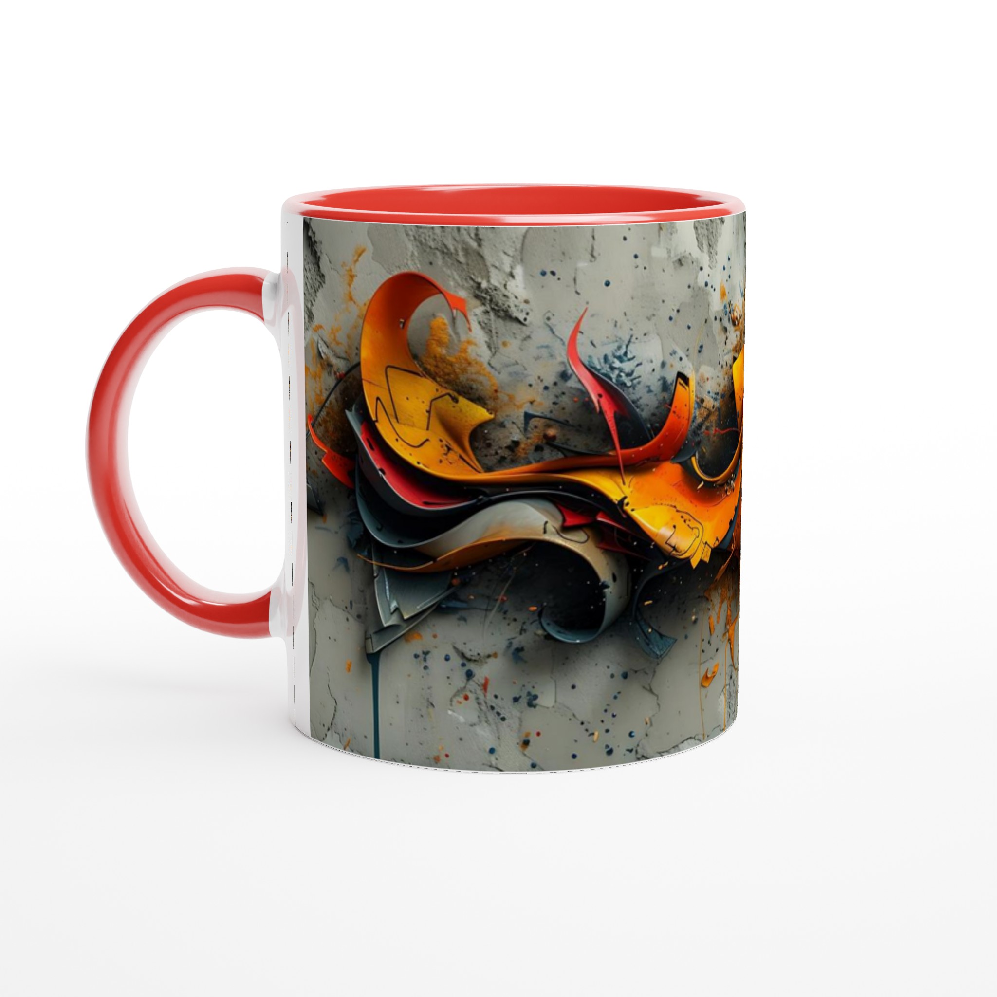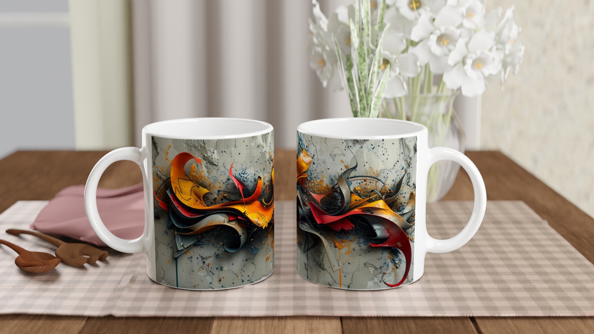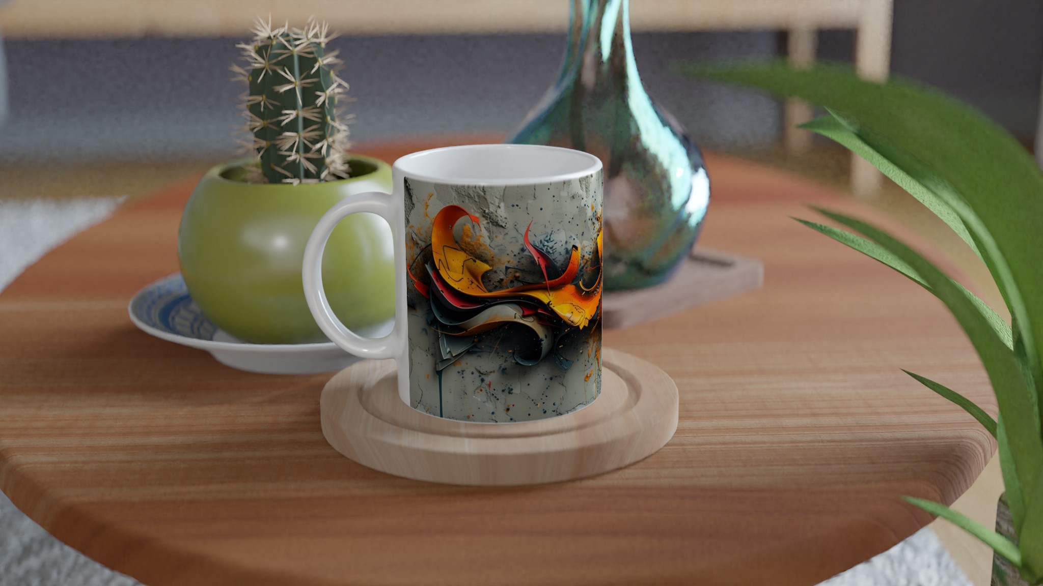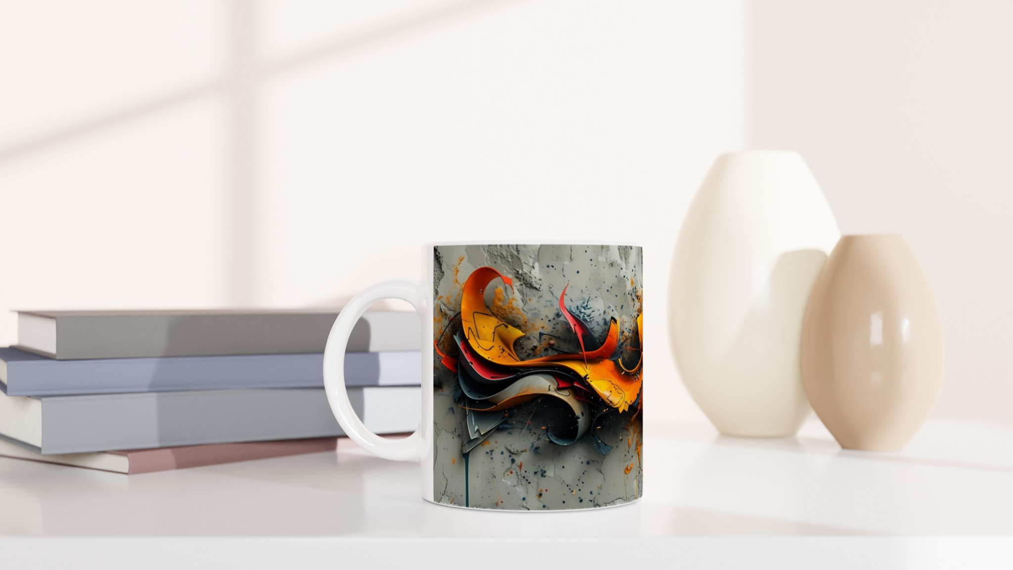Abstract Swirl Art Ceramic Mug 11oz – Vibrant Orange, Red & Gray Design