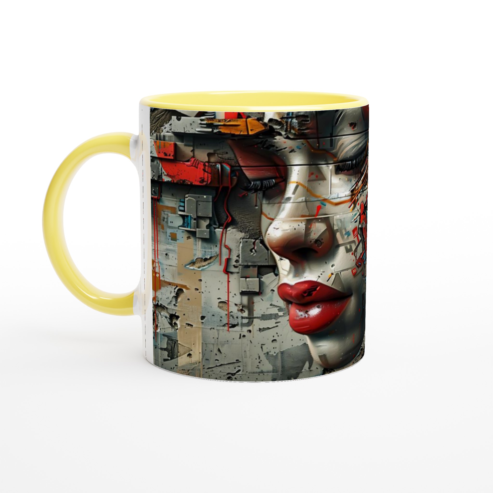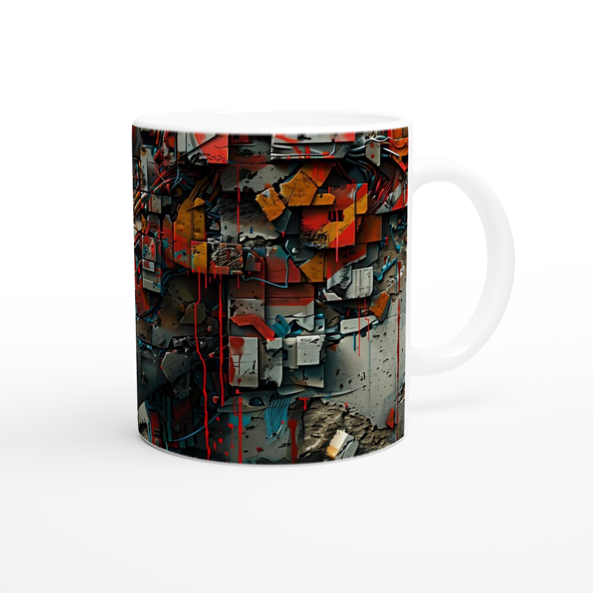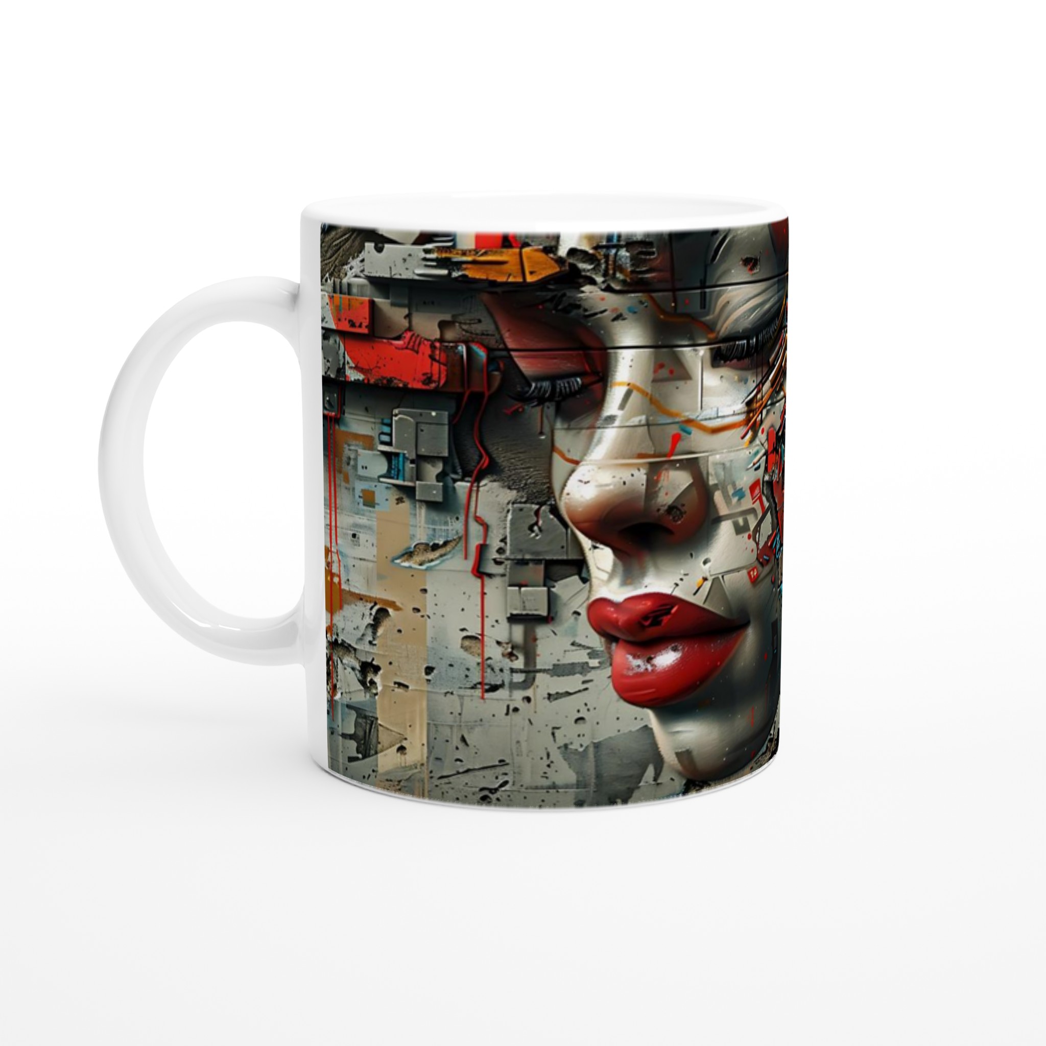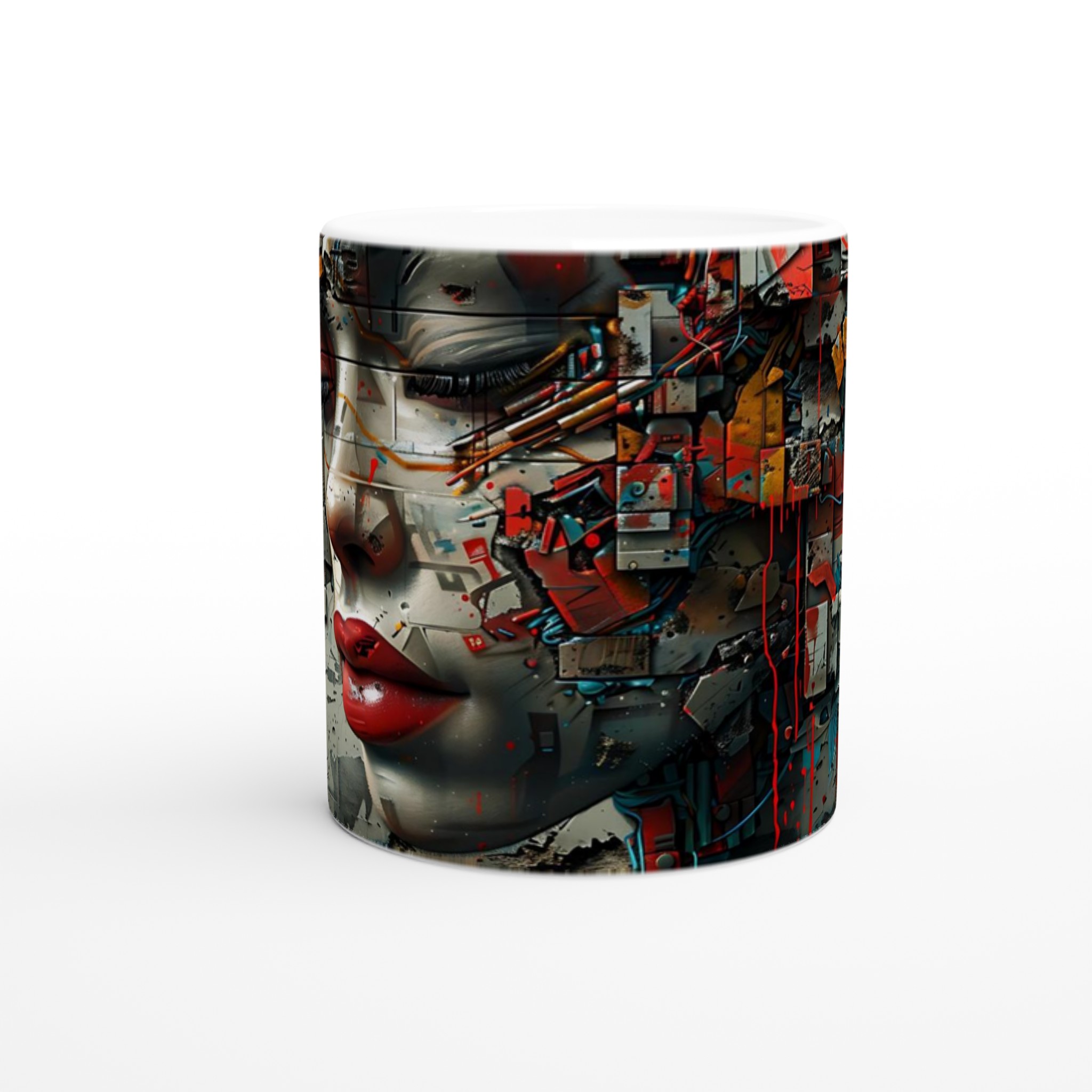 Abstract Cyberpunk Muse Ceramic Mug 11oz – Artful Tech-Inspired Design in Your Choice of Seven Vibrant Hues