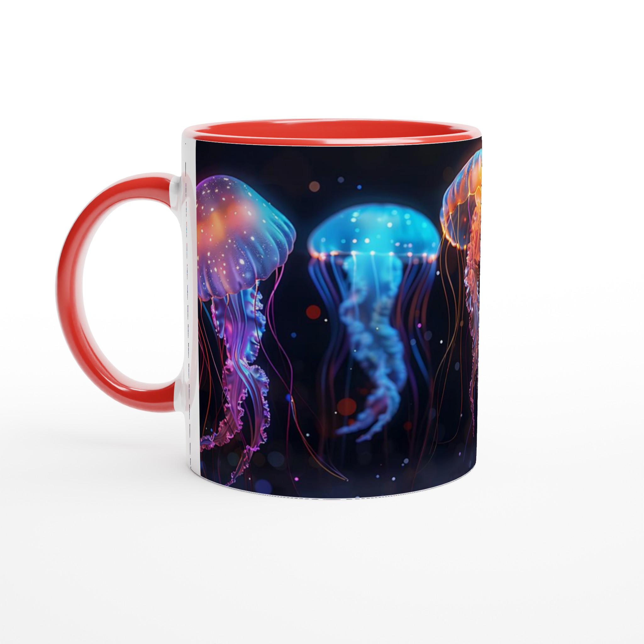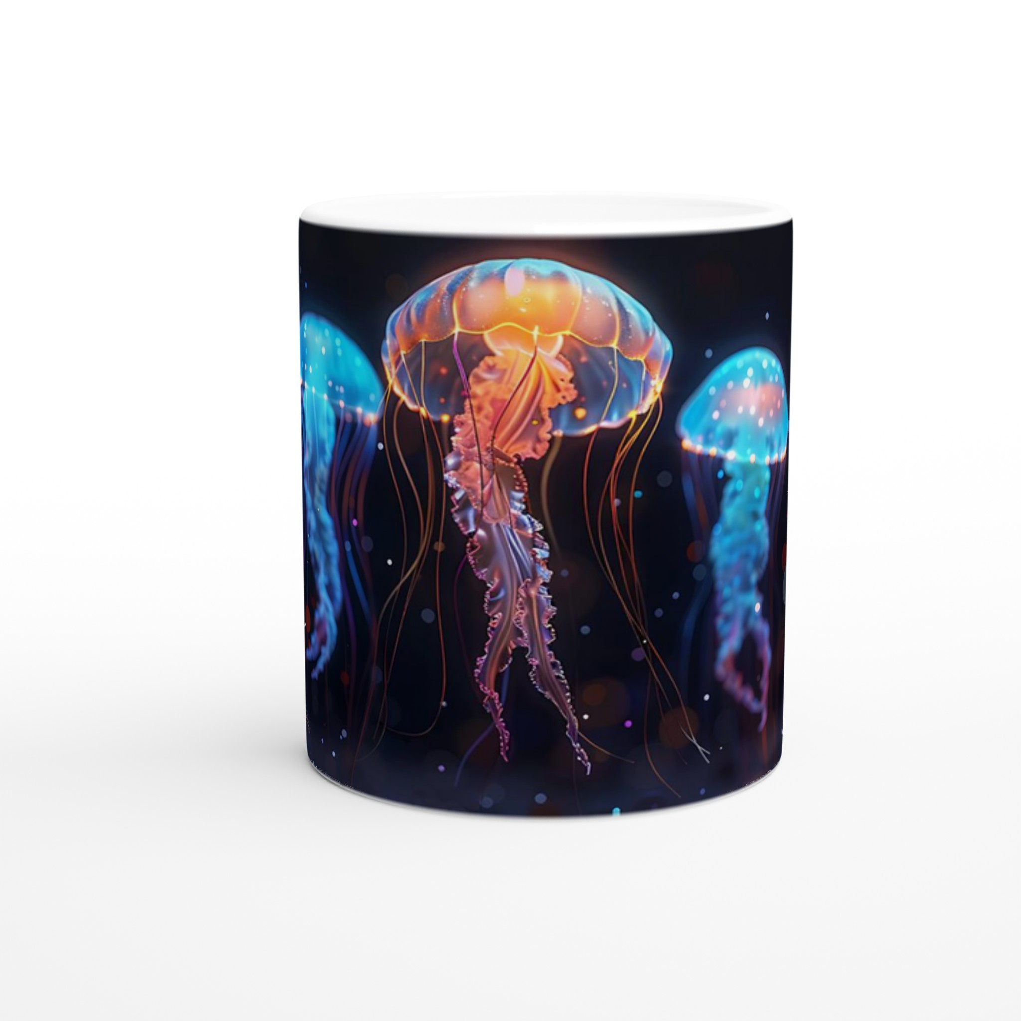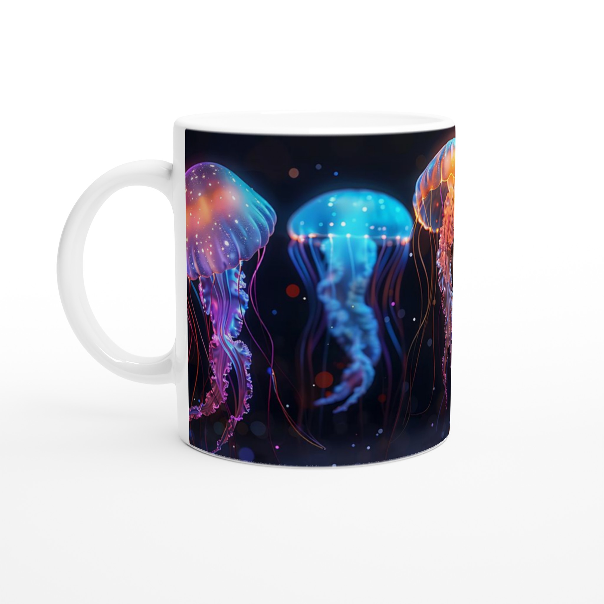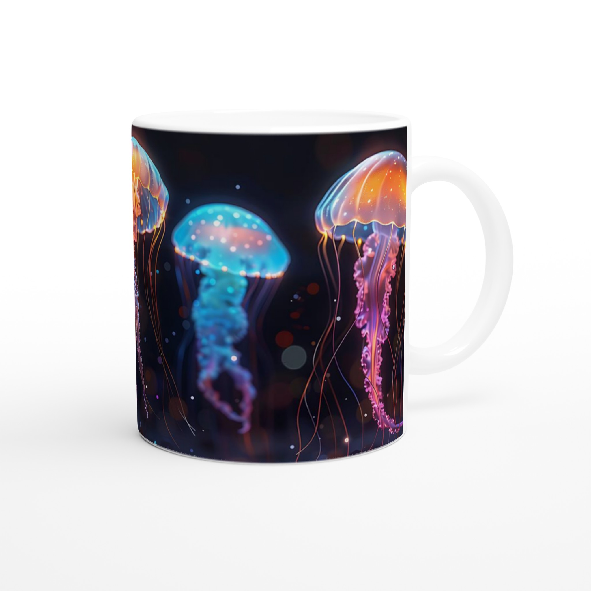 Bioluminescent Jellyfish Dream – White Ceramic Mug 11oz, in your choice of seven vibrant colors!