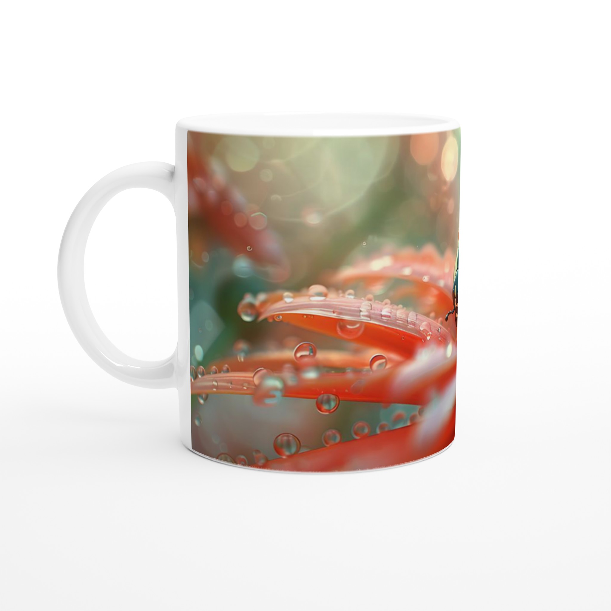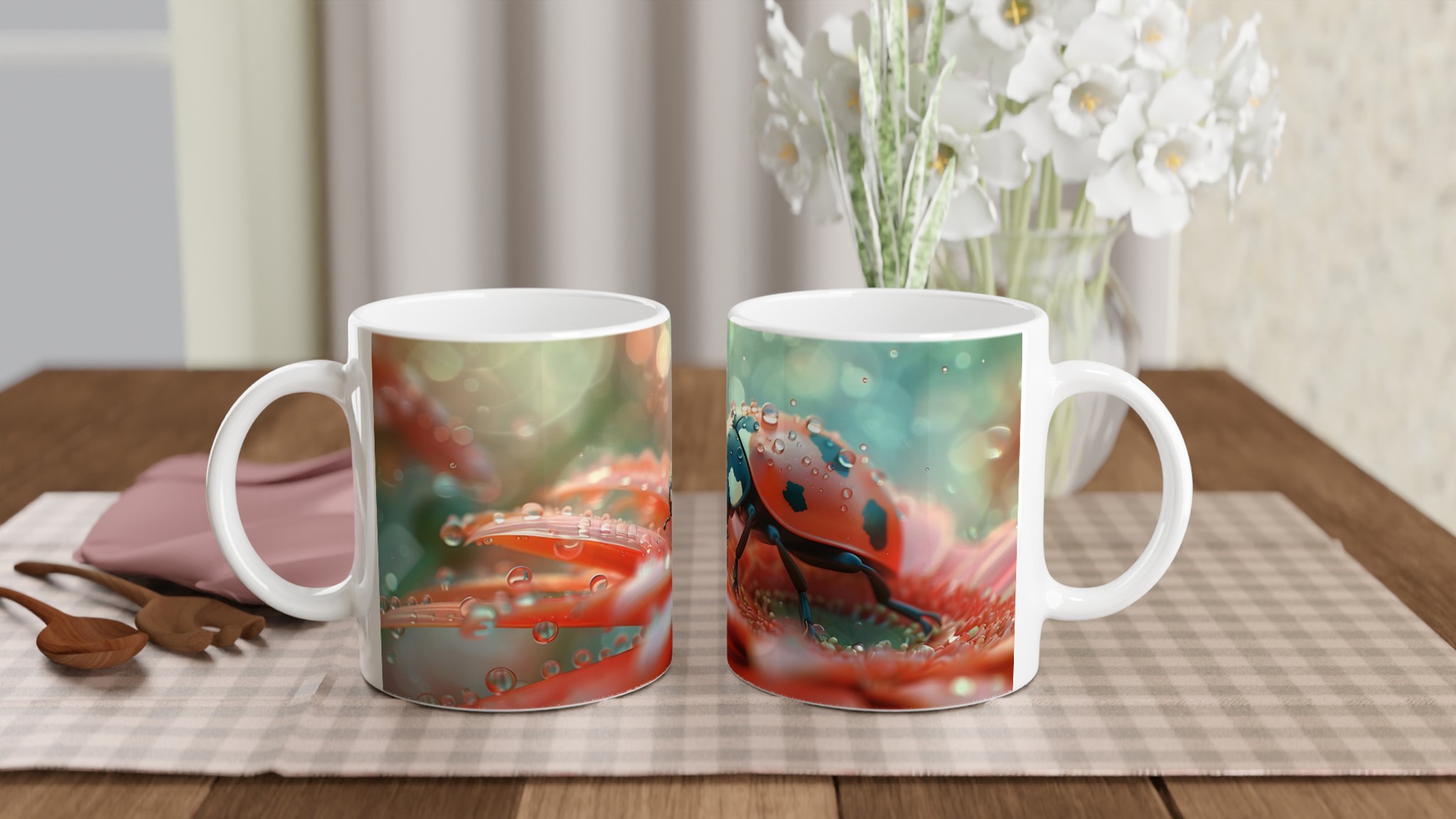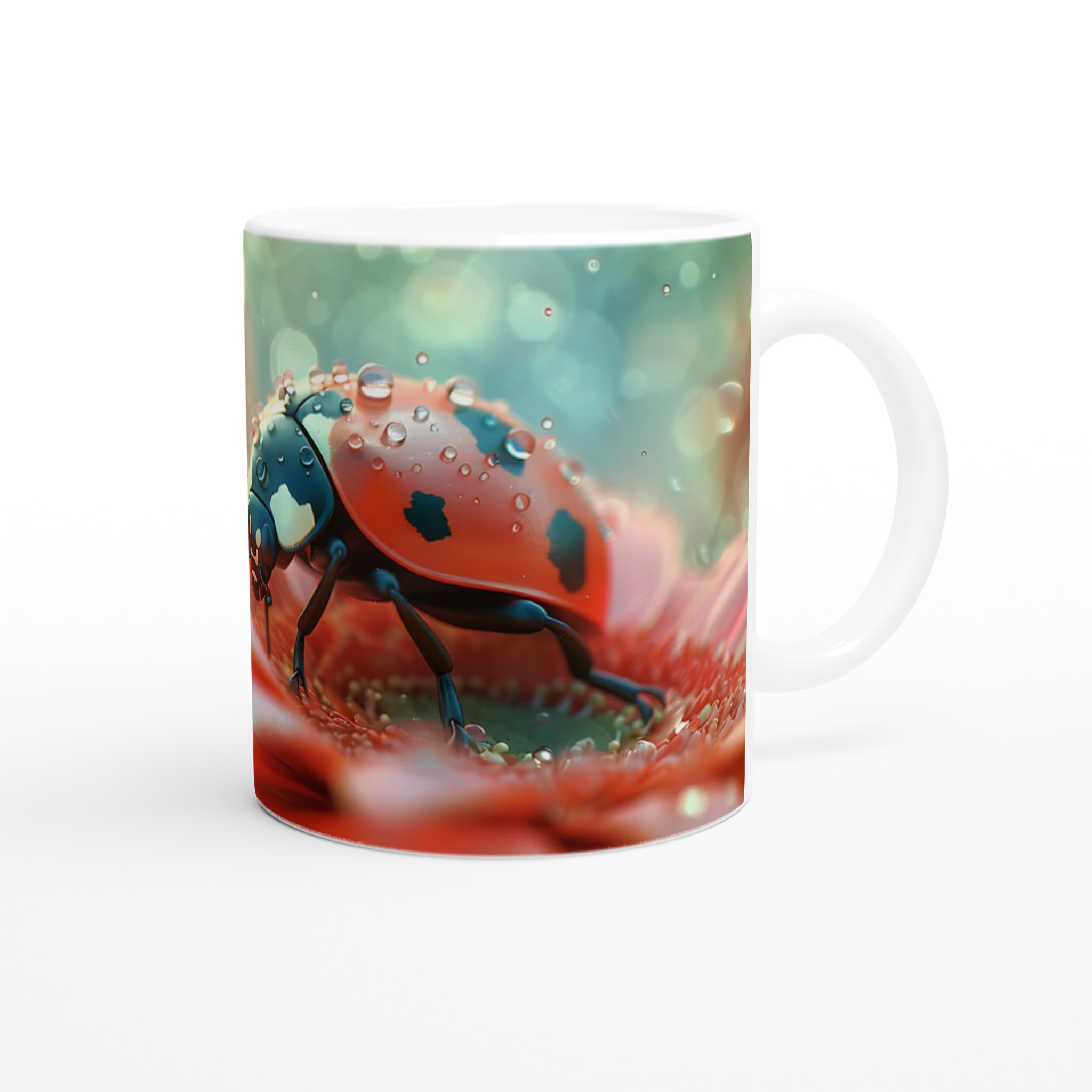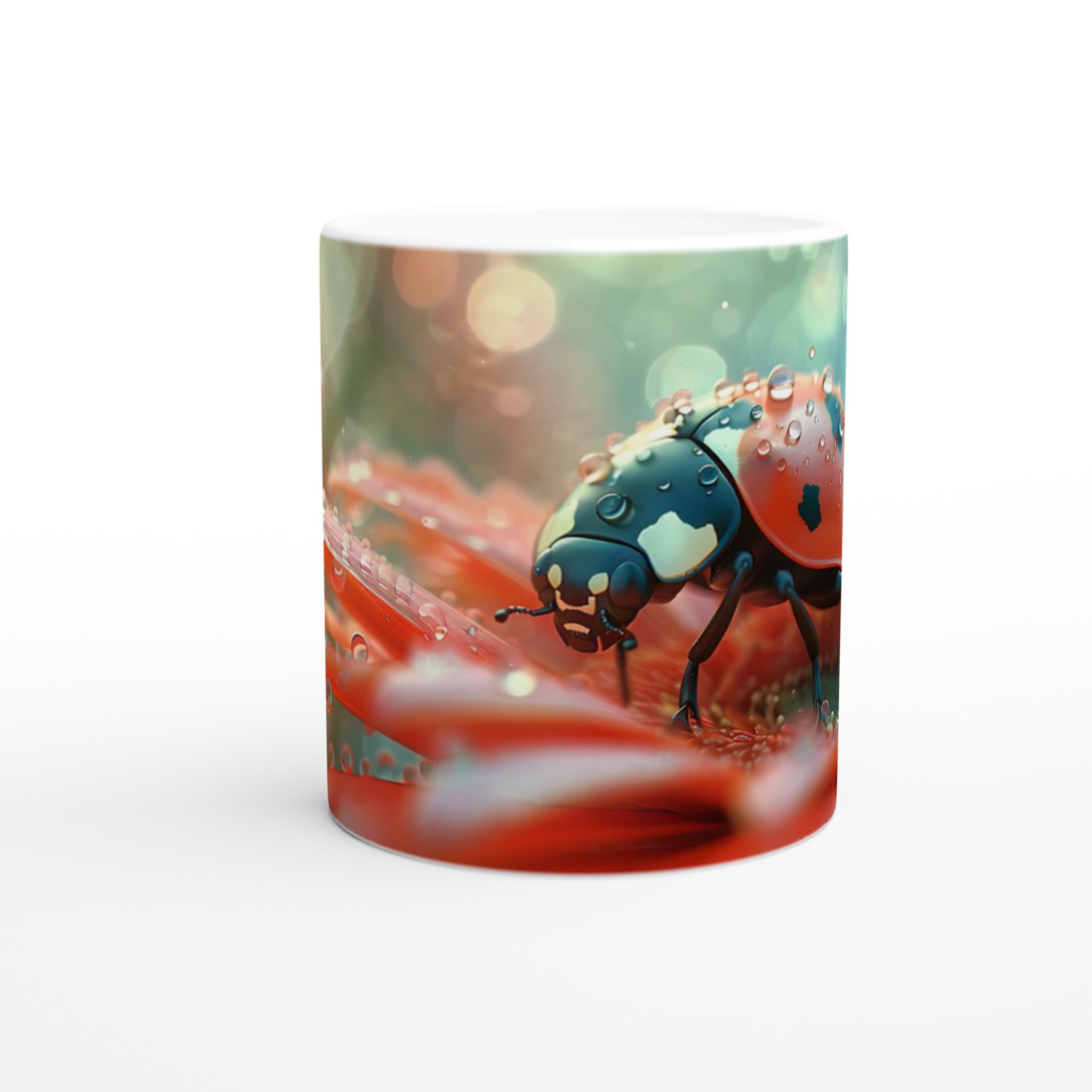 Dewdrop Ladybug Blossom – Ceramic Coffee Mug 11oz in Your Choice of Seven Vibrant Colors