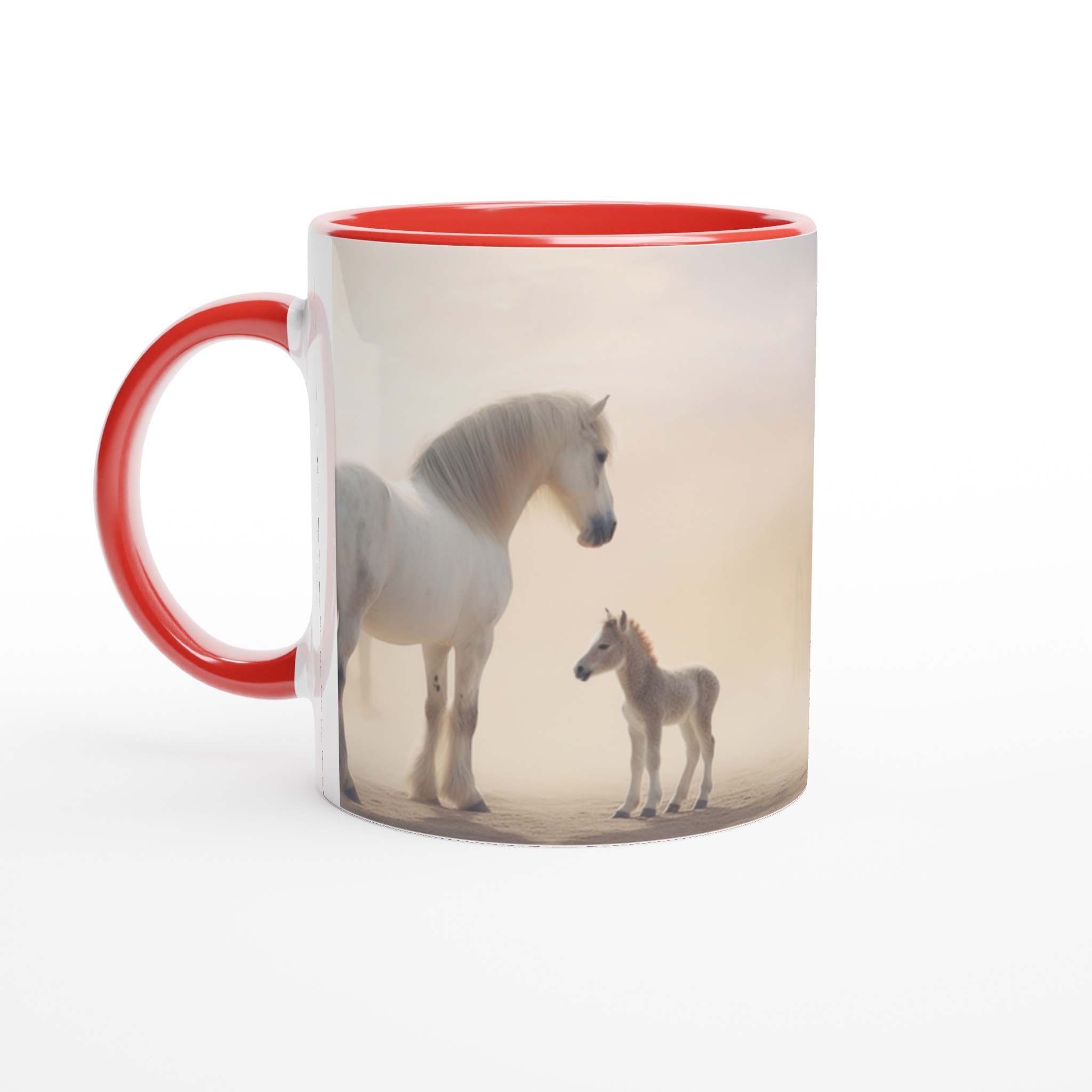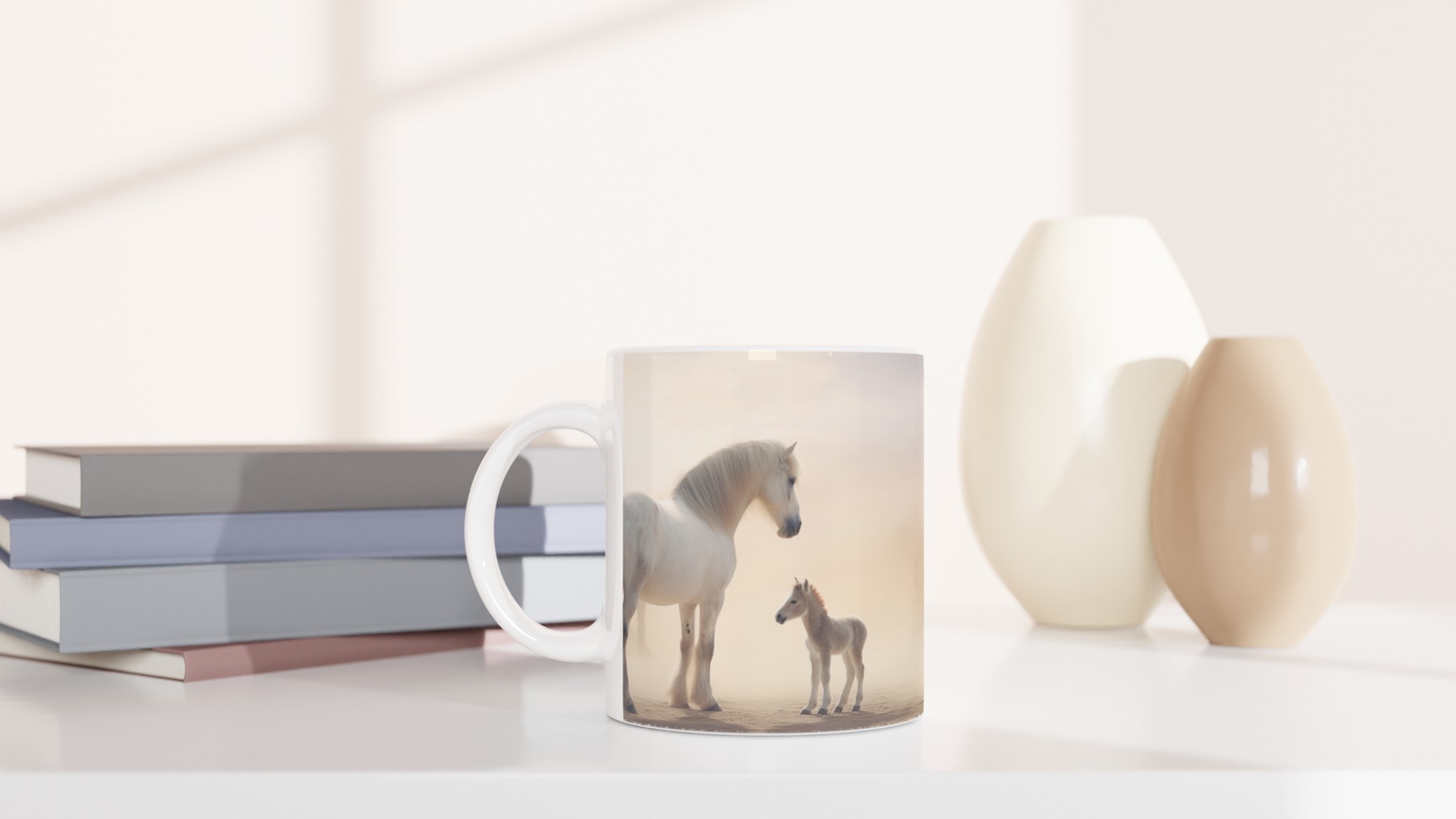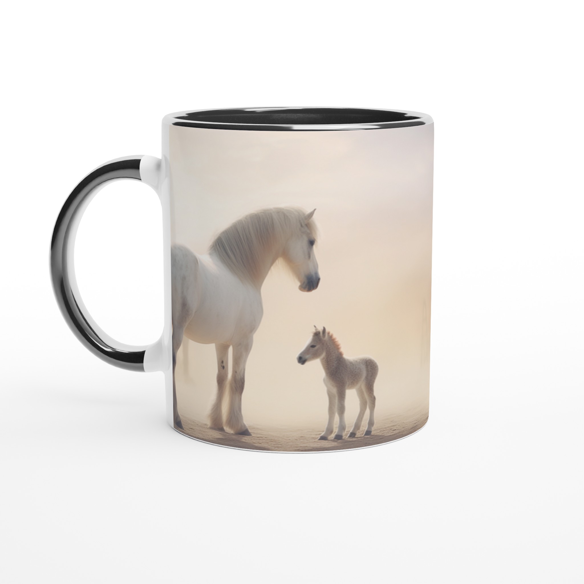 Desert Dream – White Horse & Foal Ceramic Mug 11oz, in your choice of seven captivating colors