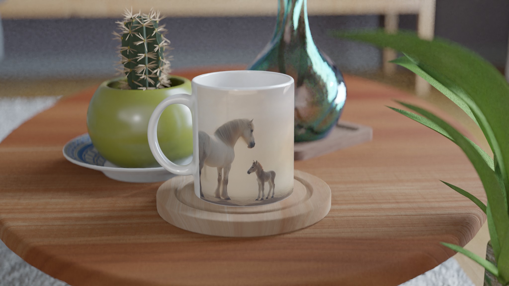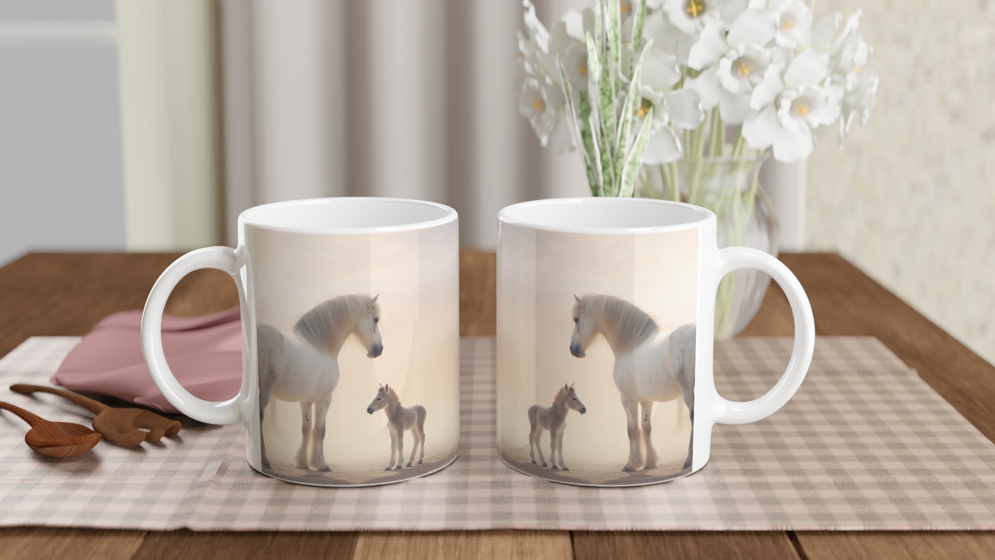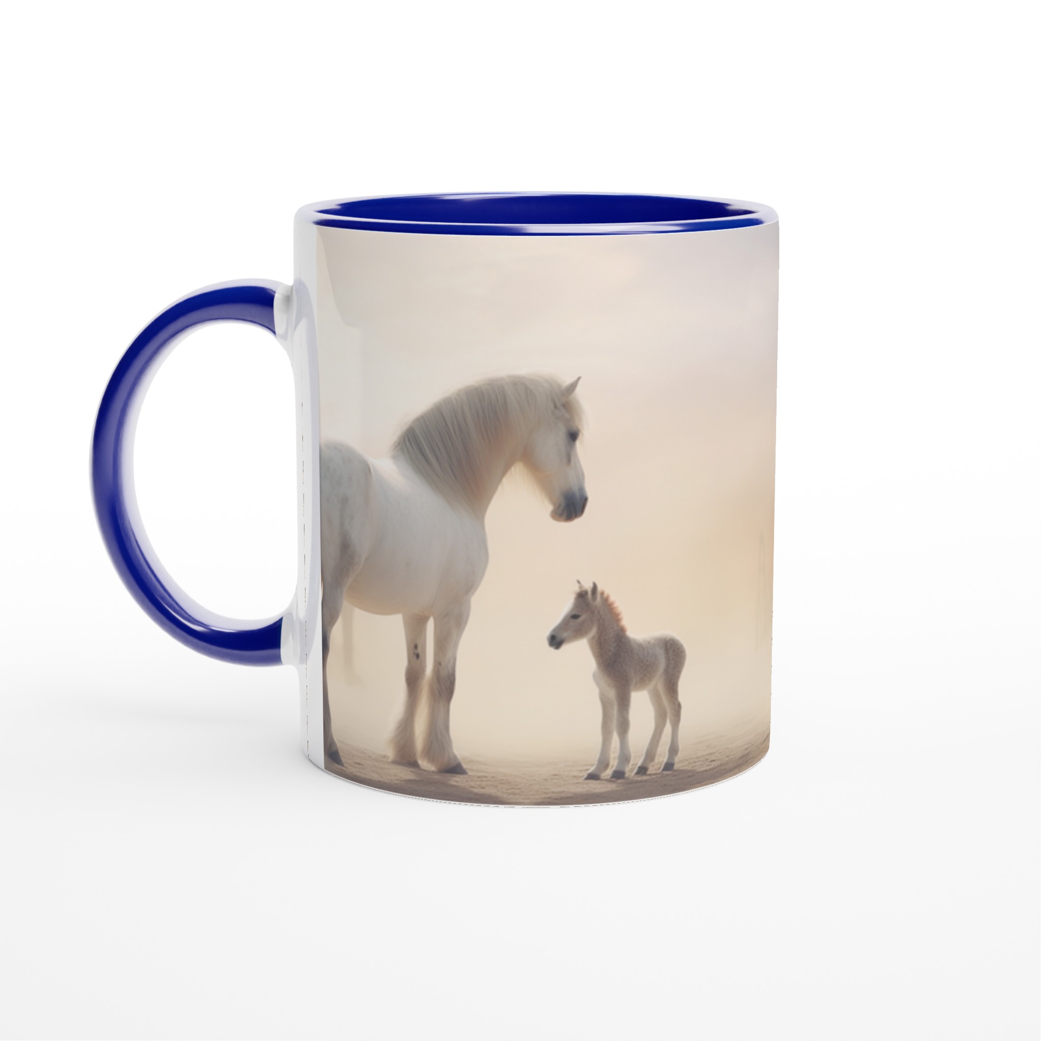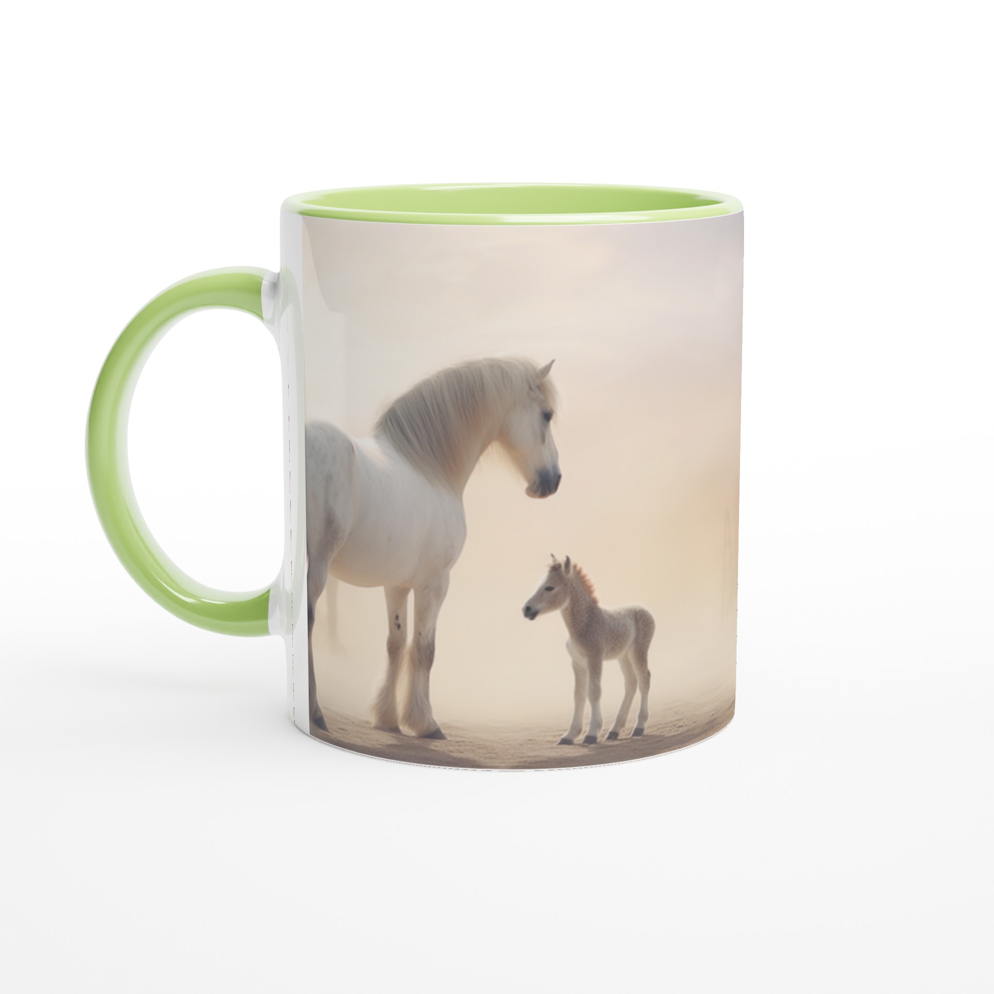 Desert Dream – White Horse & Foal Ceramic Mug 11oz, in your choice of seven captivating colors
