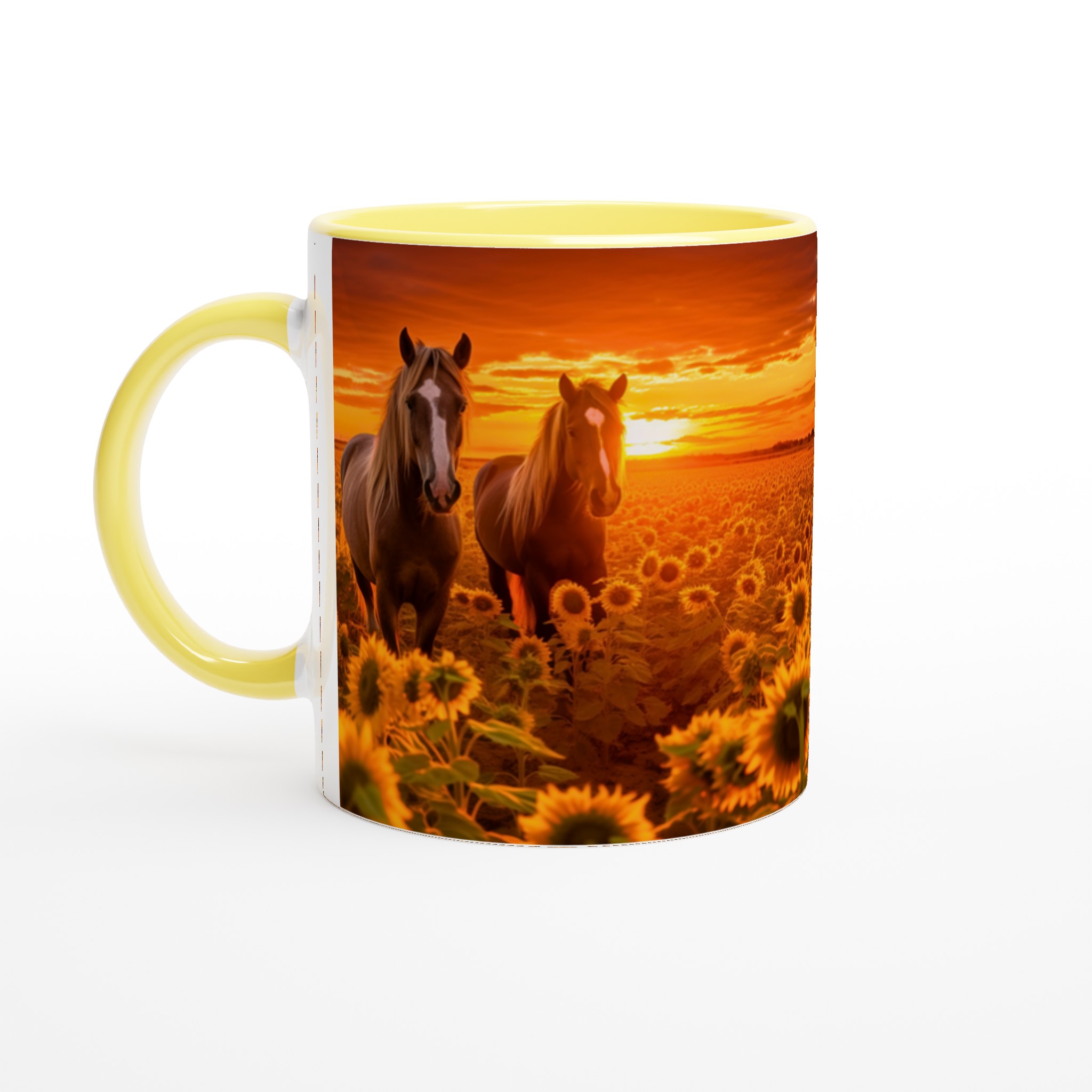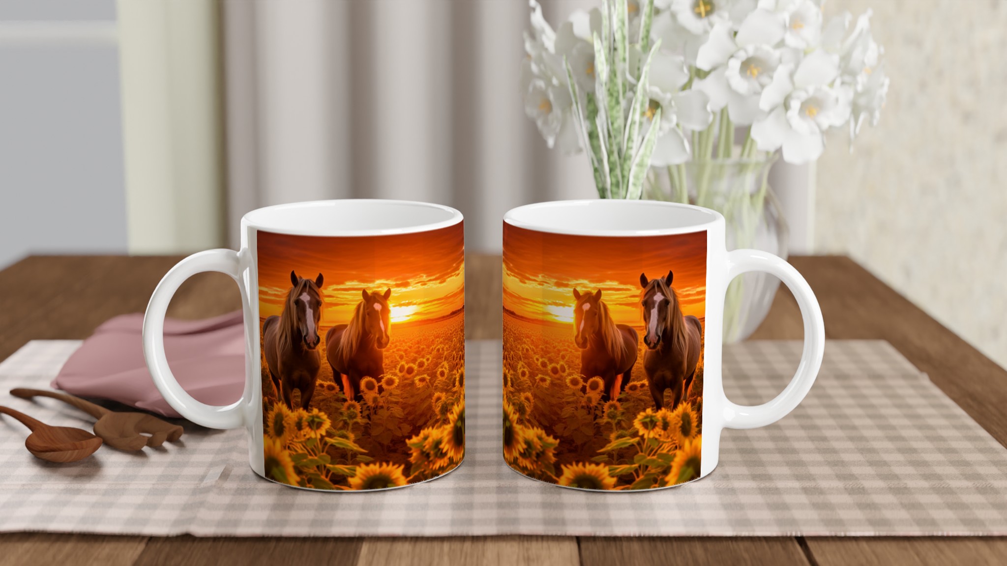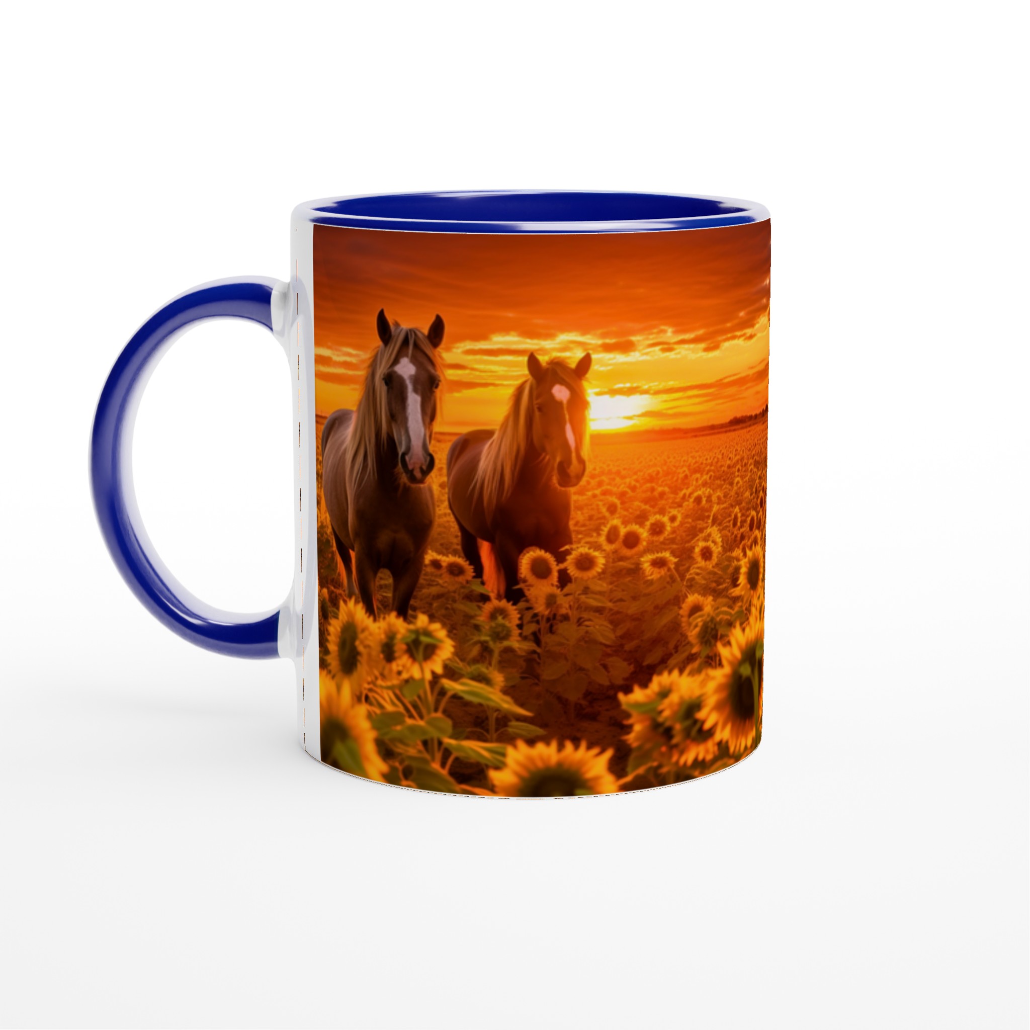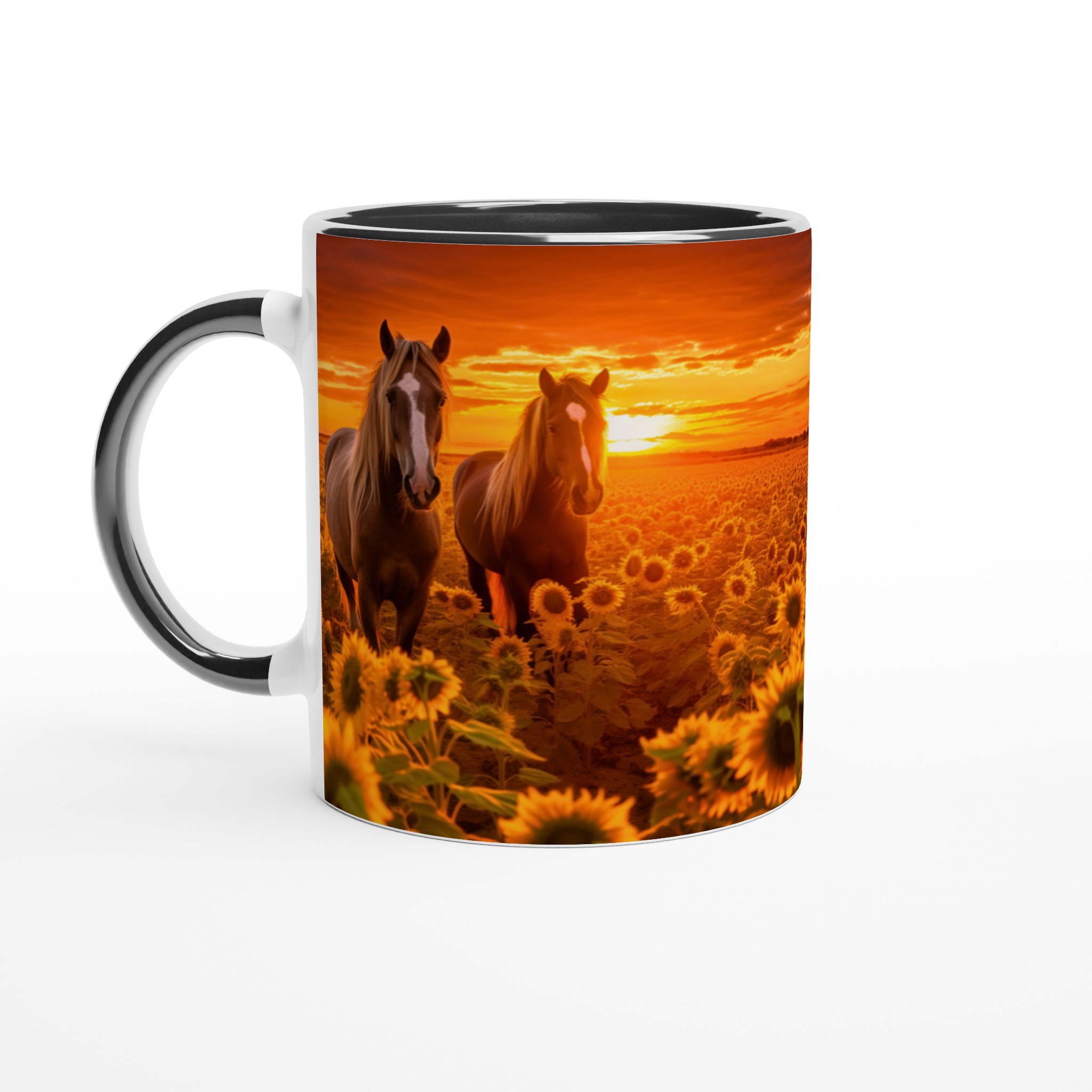 Golden Hour Horses – Majestic Sunset Ceramic Mug 11oz, in your choice of seven vibrant colors