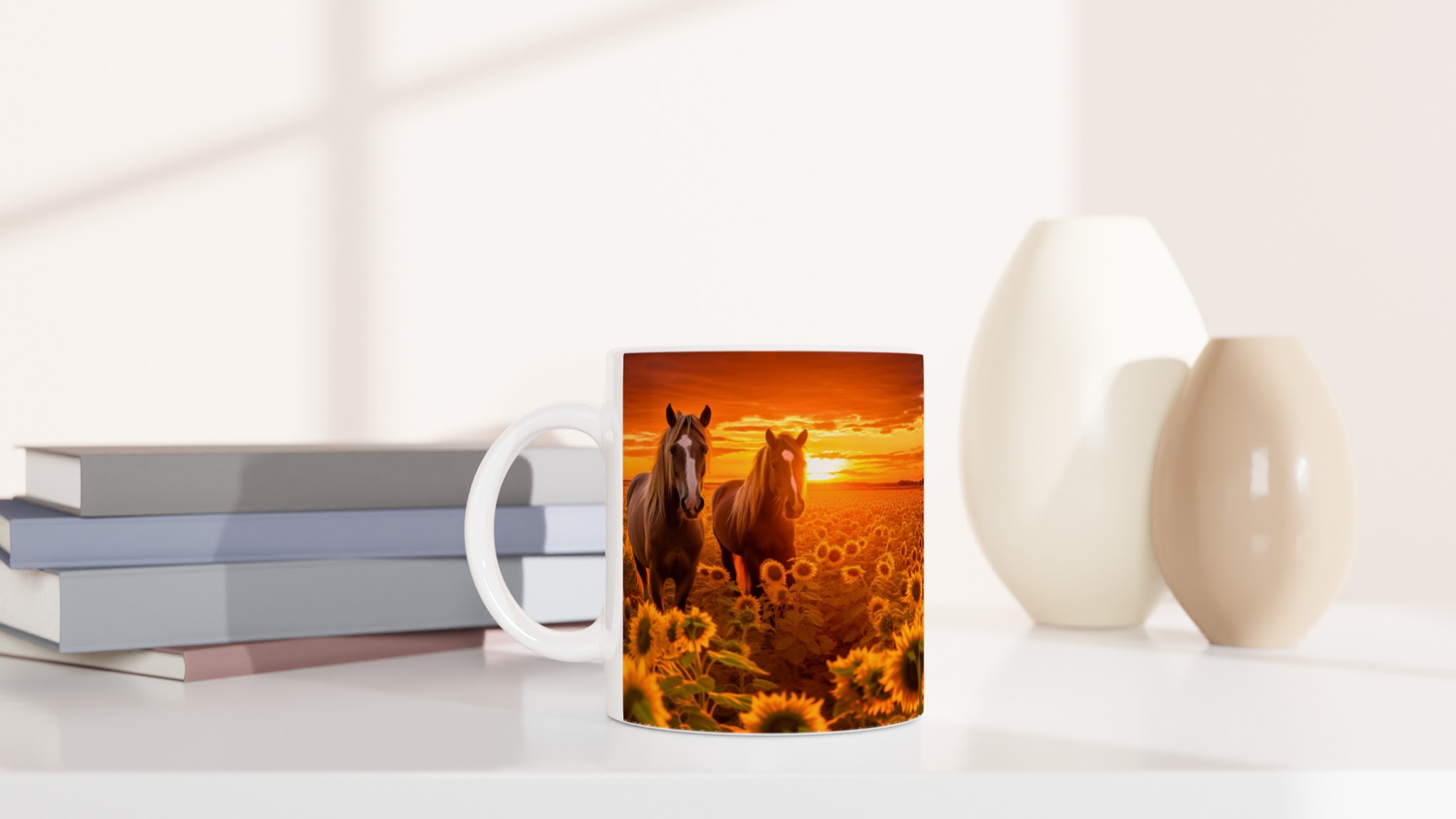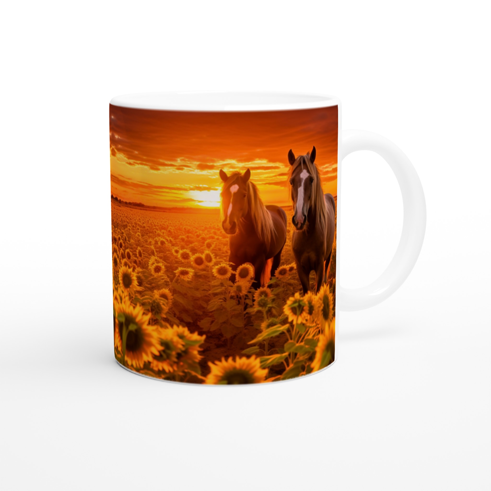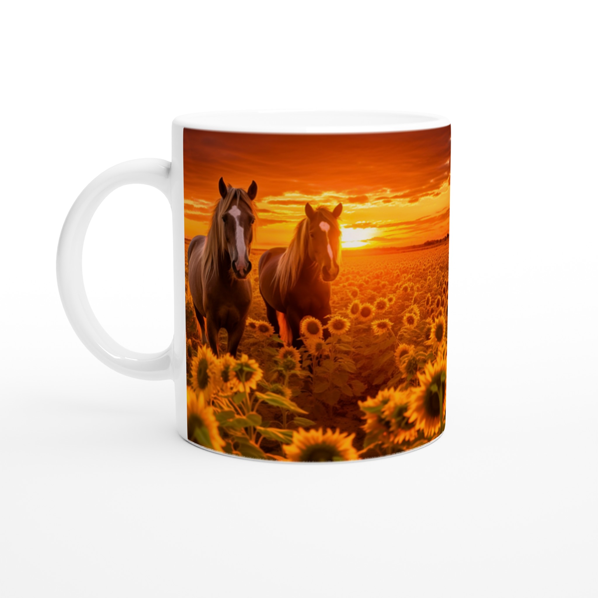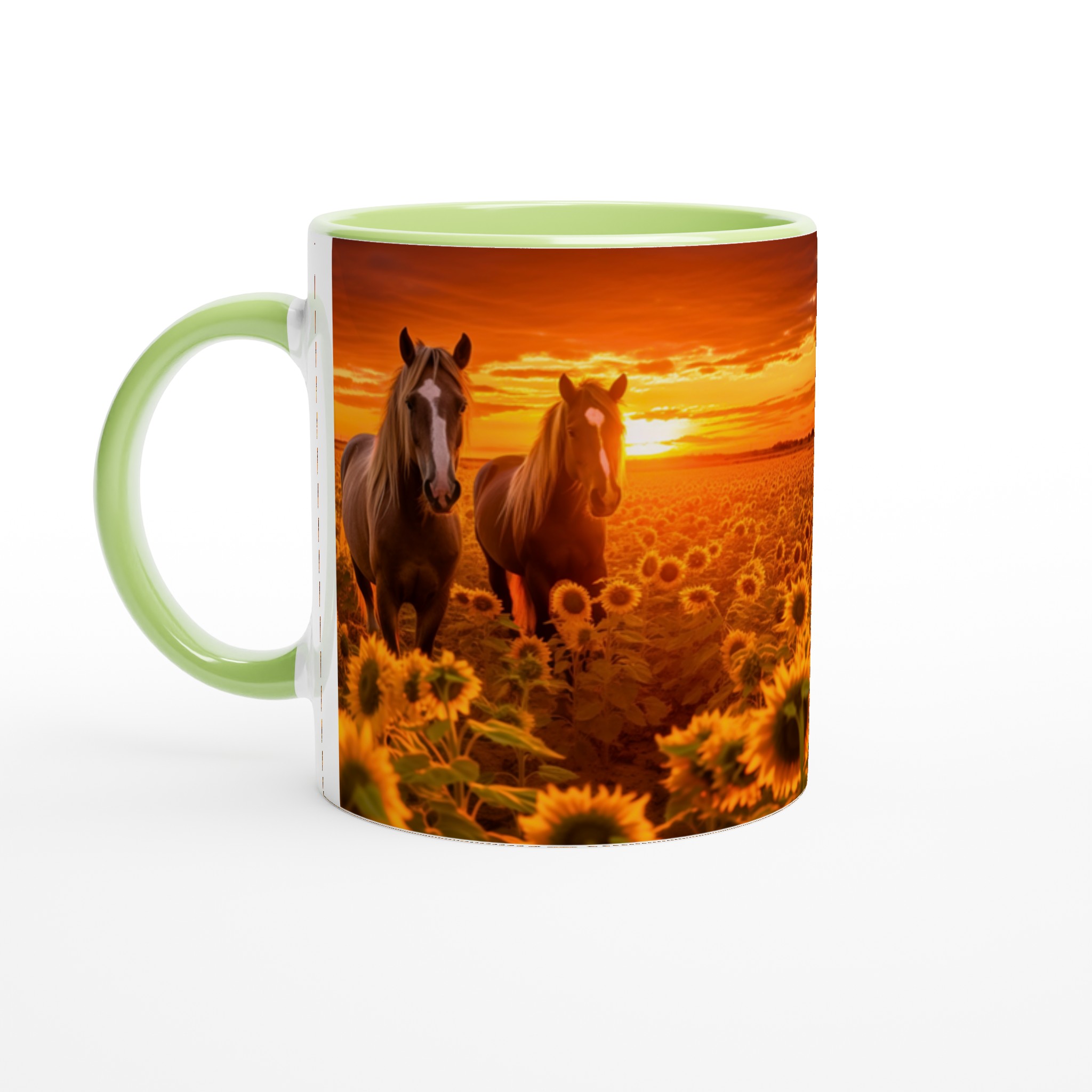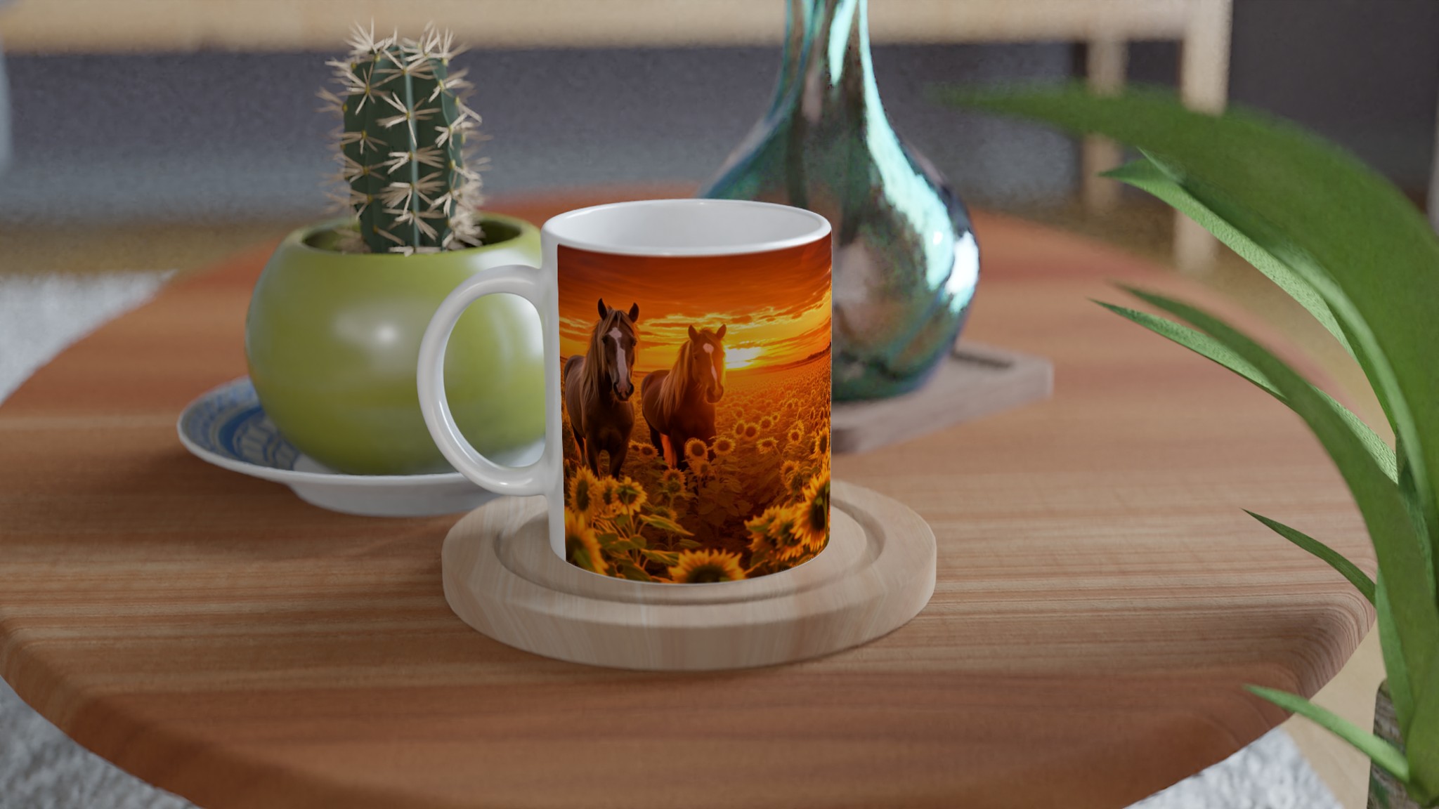 Golden Hour Horses – Majestic Sunset Ceramic Mug 11oz, in your choice of seven vibrant colors