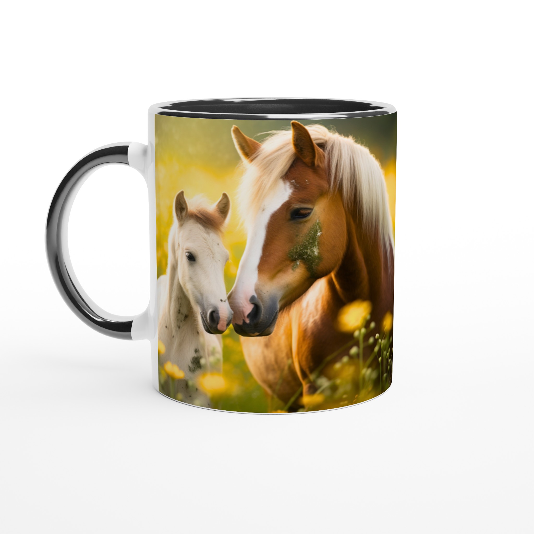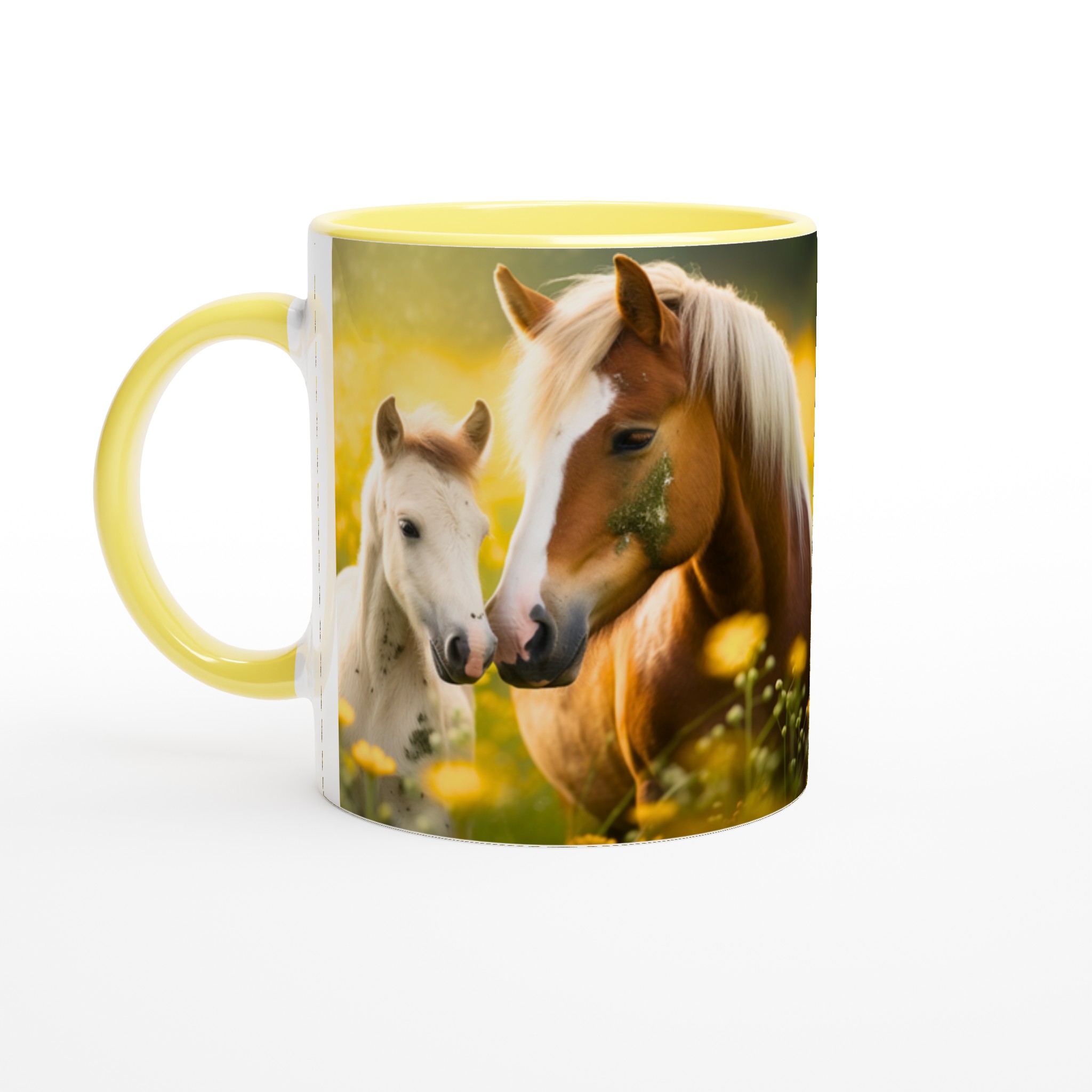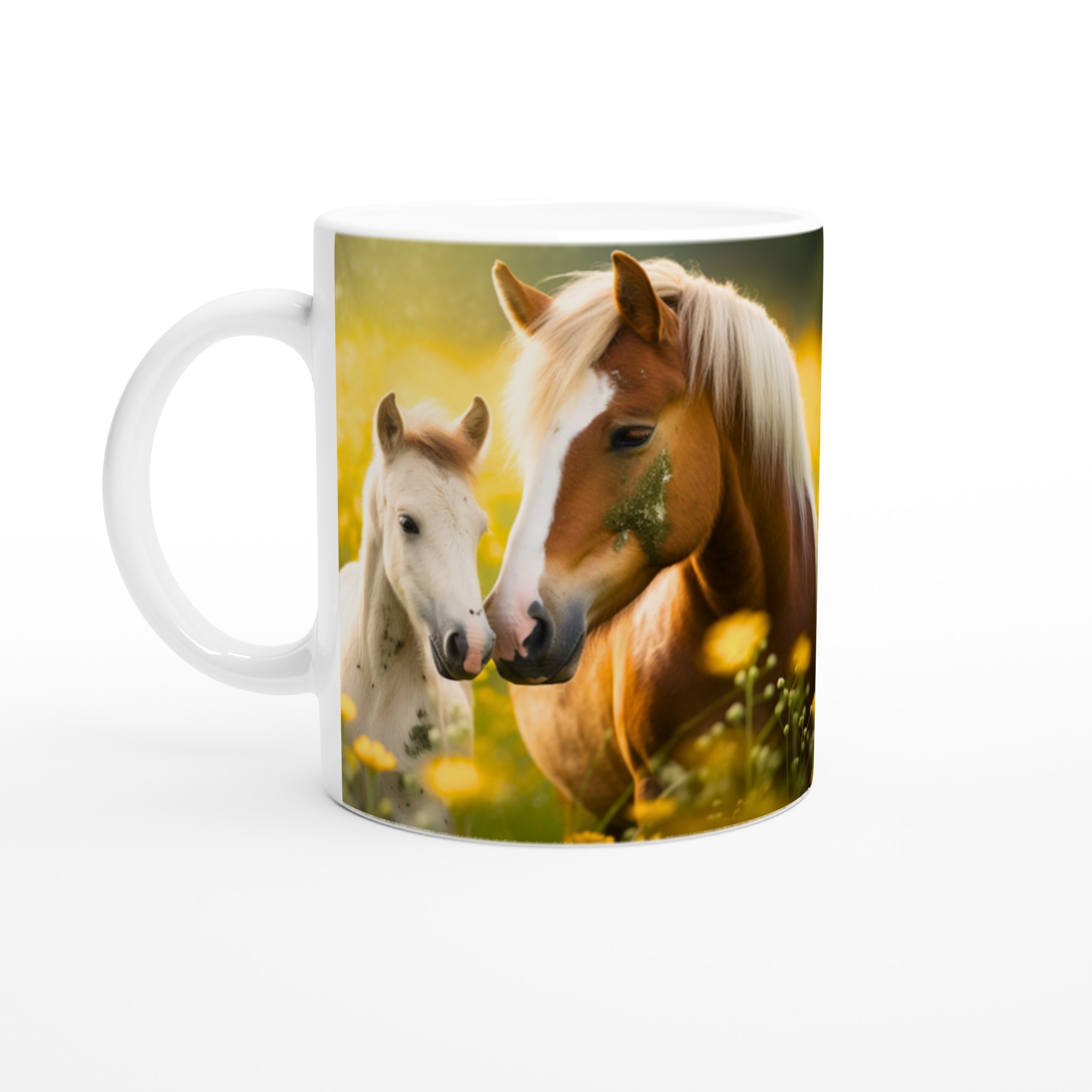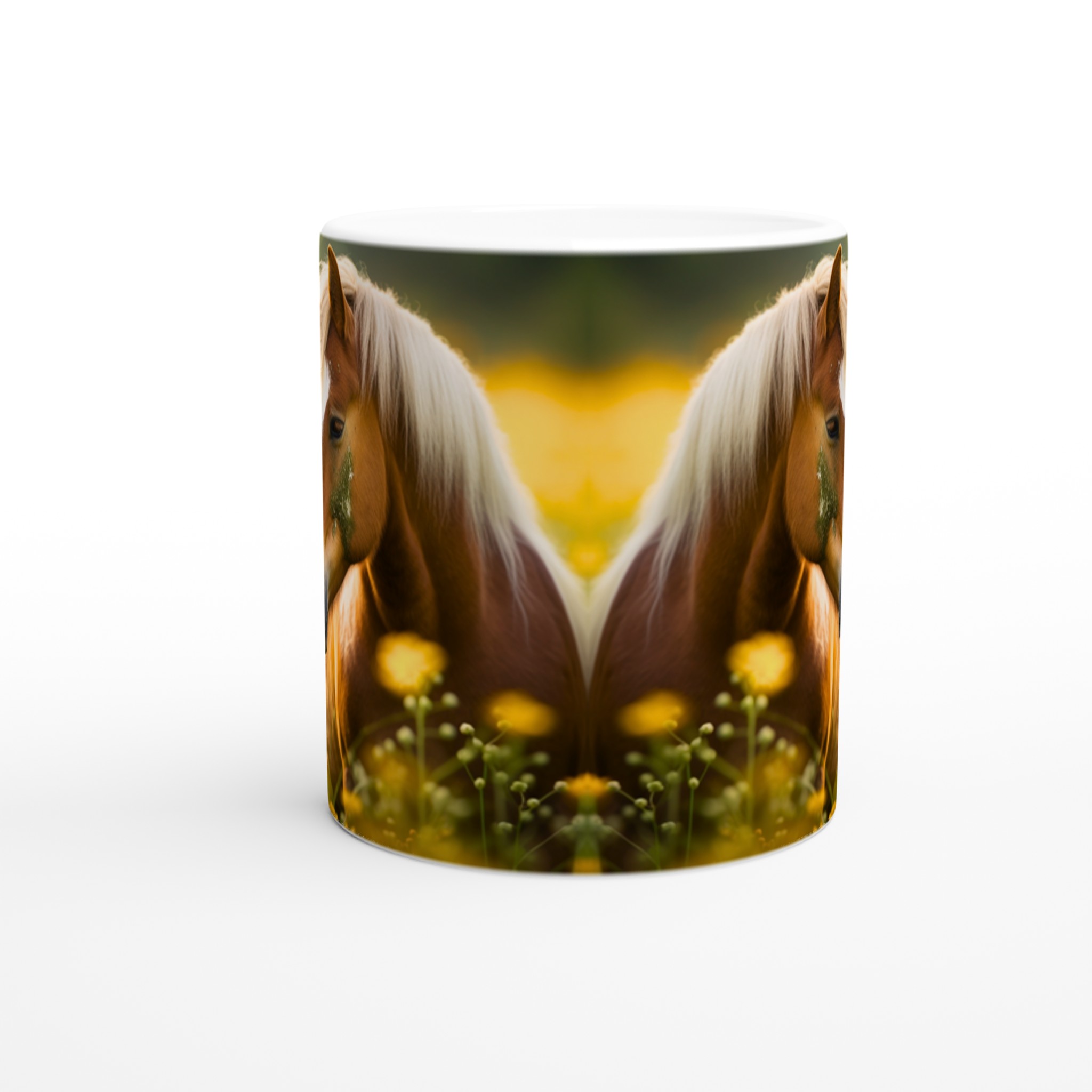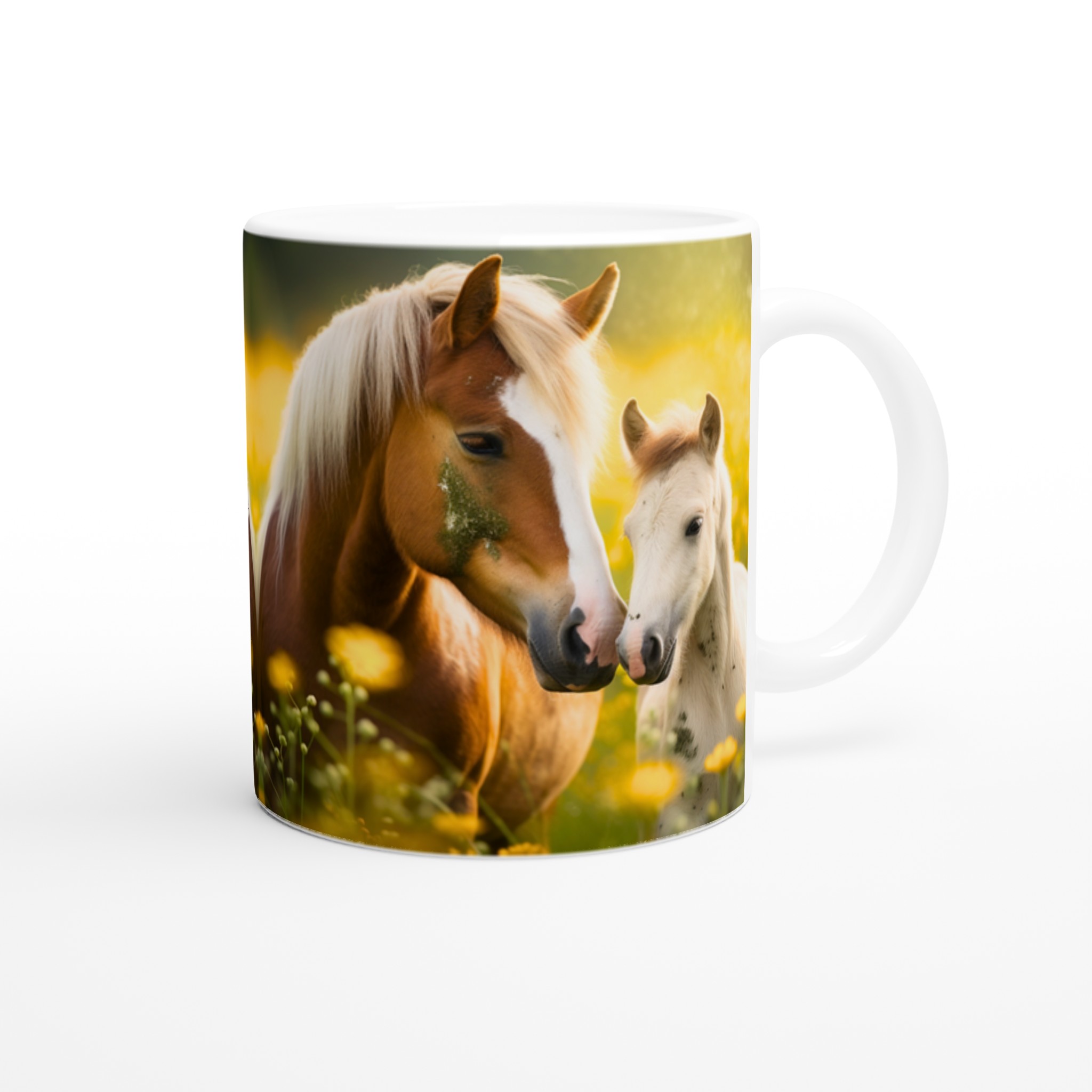 Golden Meadow Horses – White Ceramic Mug 11oz, in your choice of seven vibrant colors