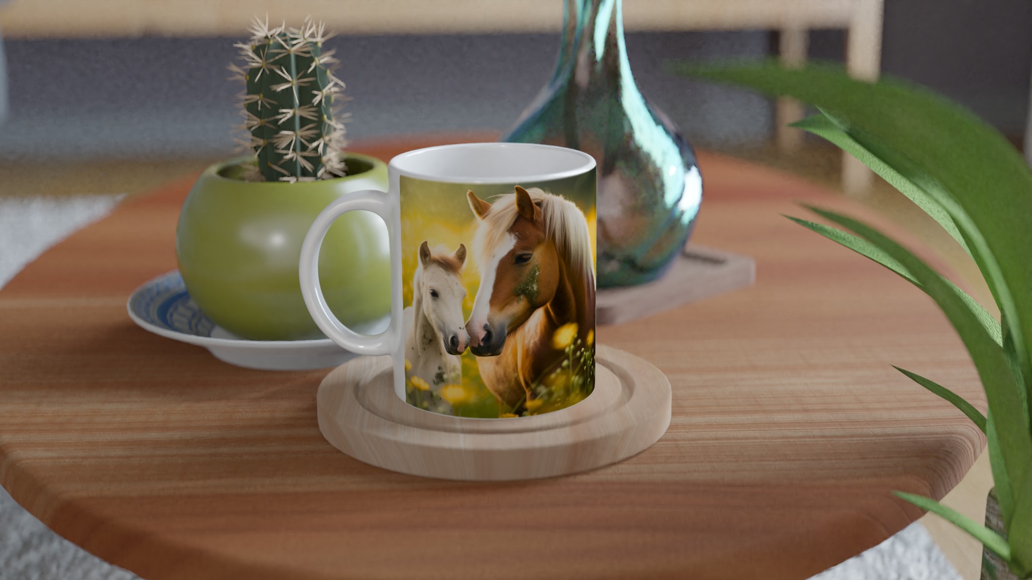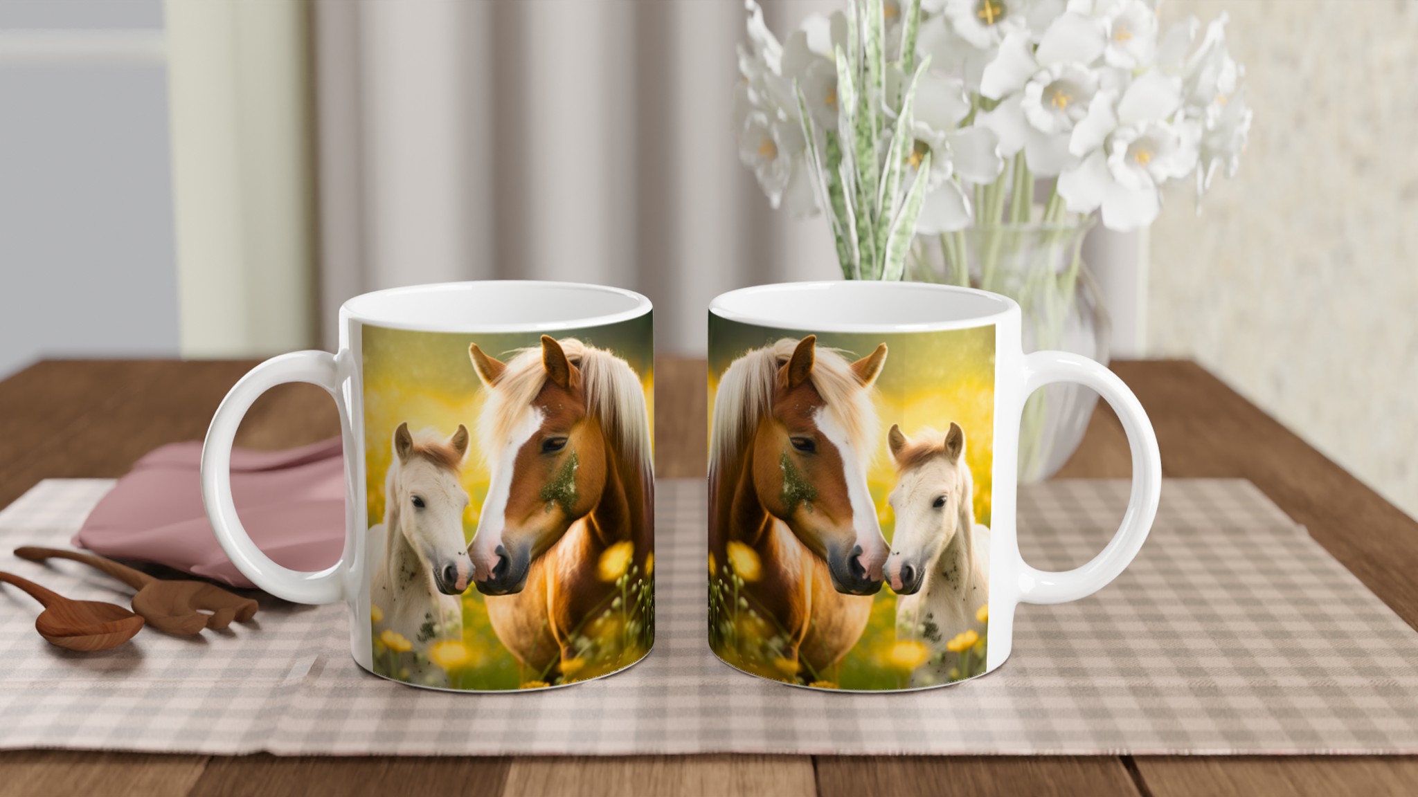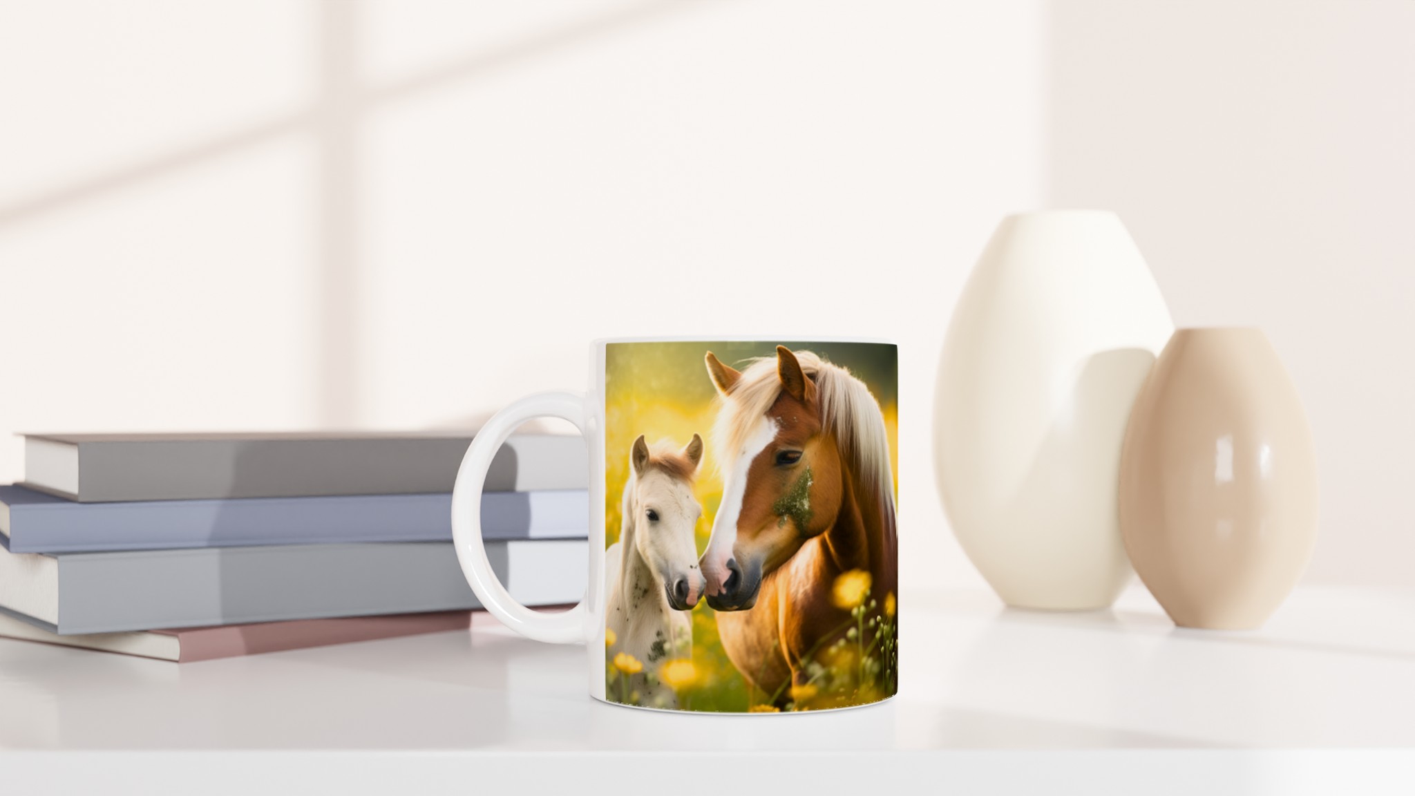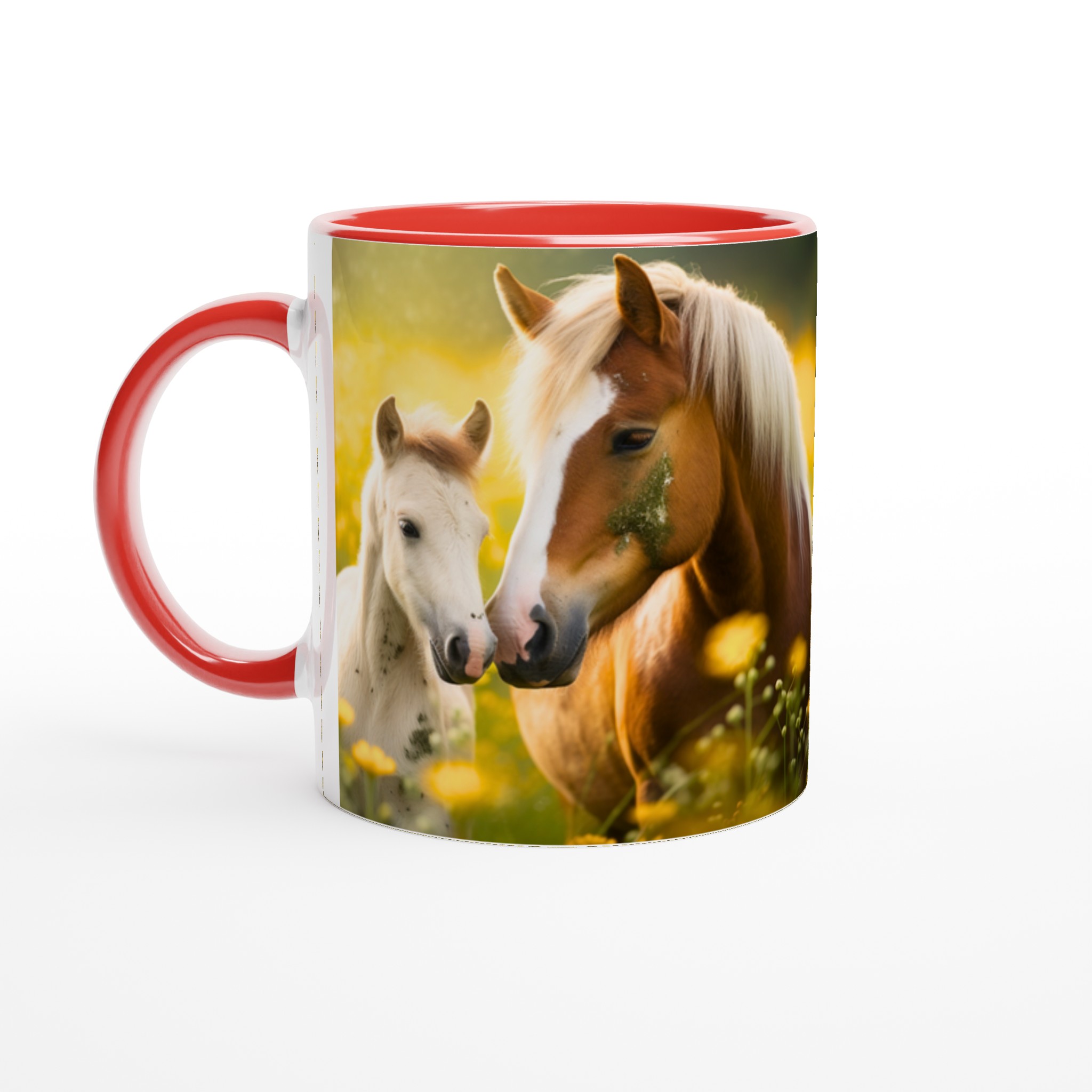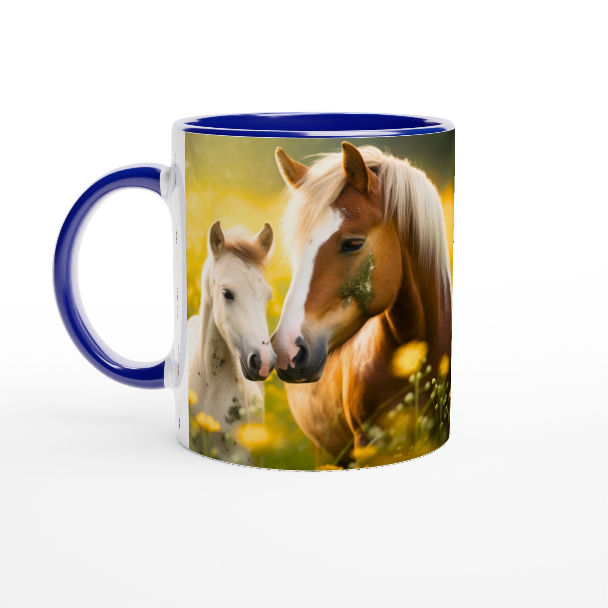 Golden Meadow Horses – White Ceramic Mug 11oz, in your choice of seven vibrant colors