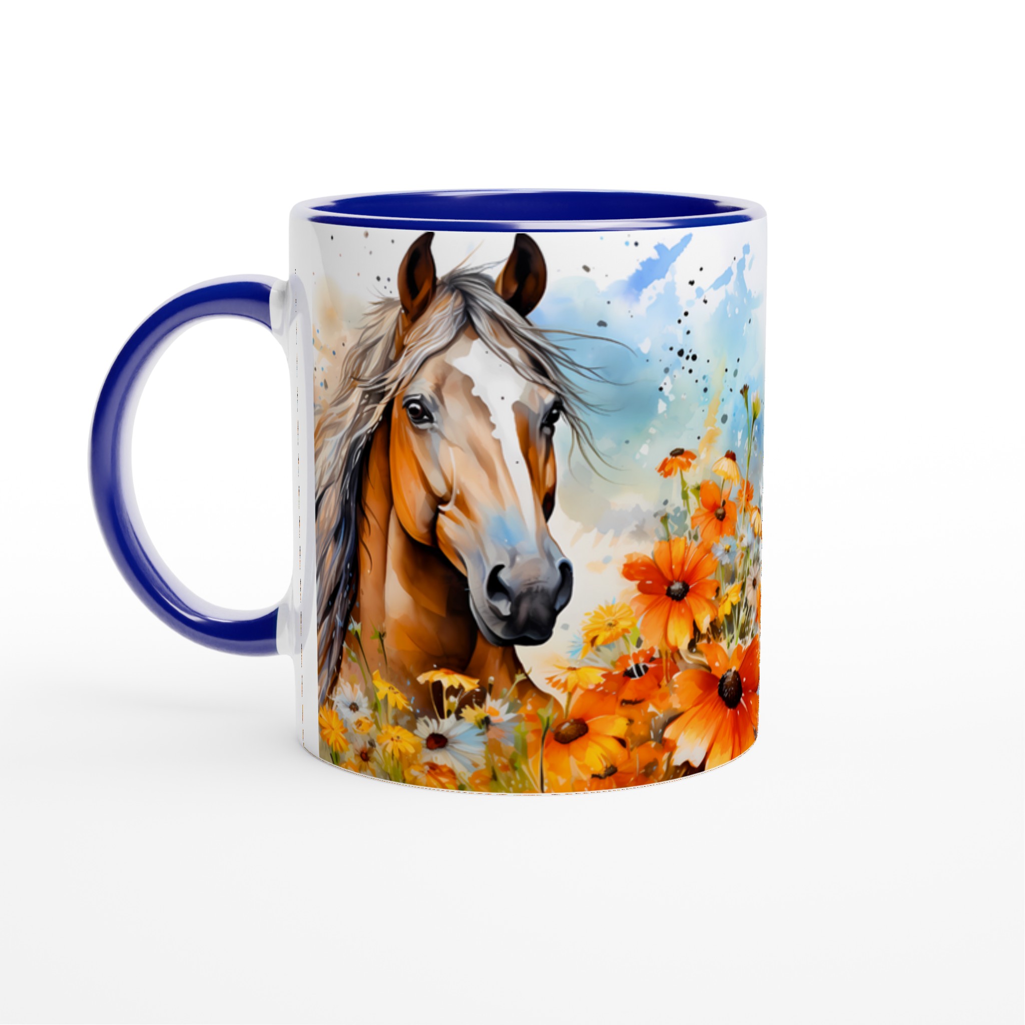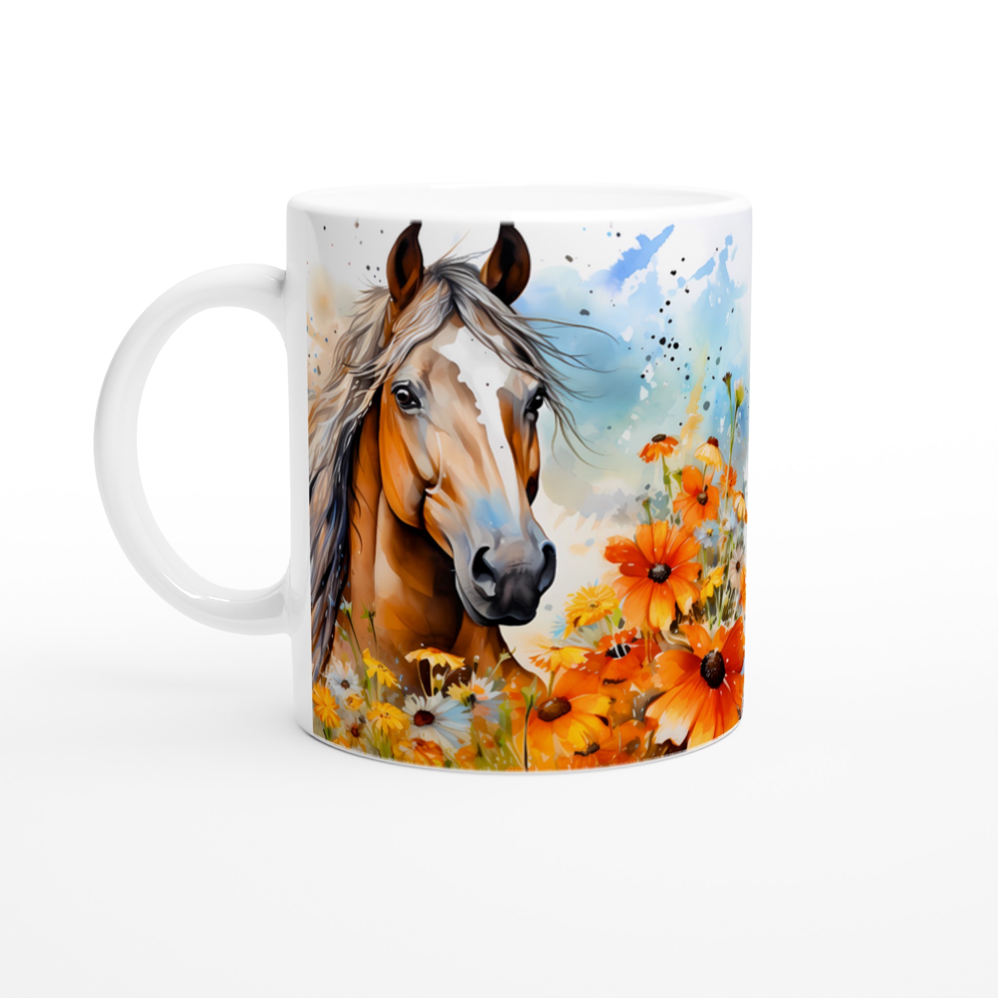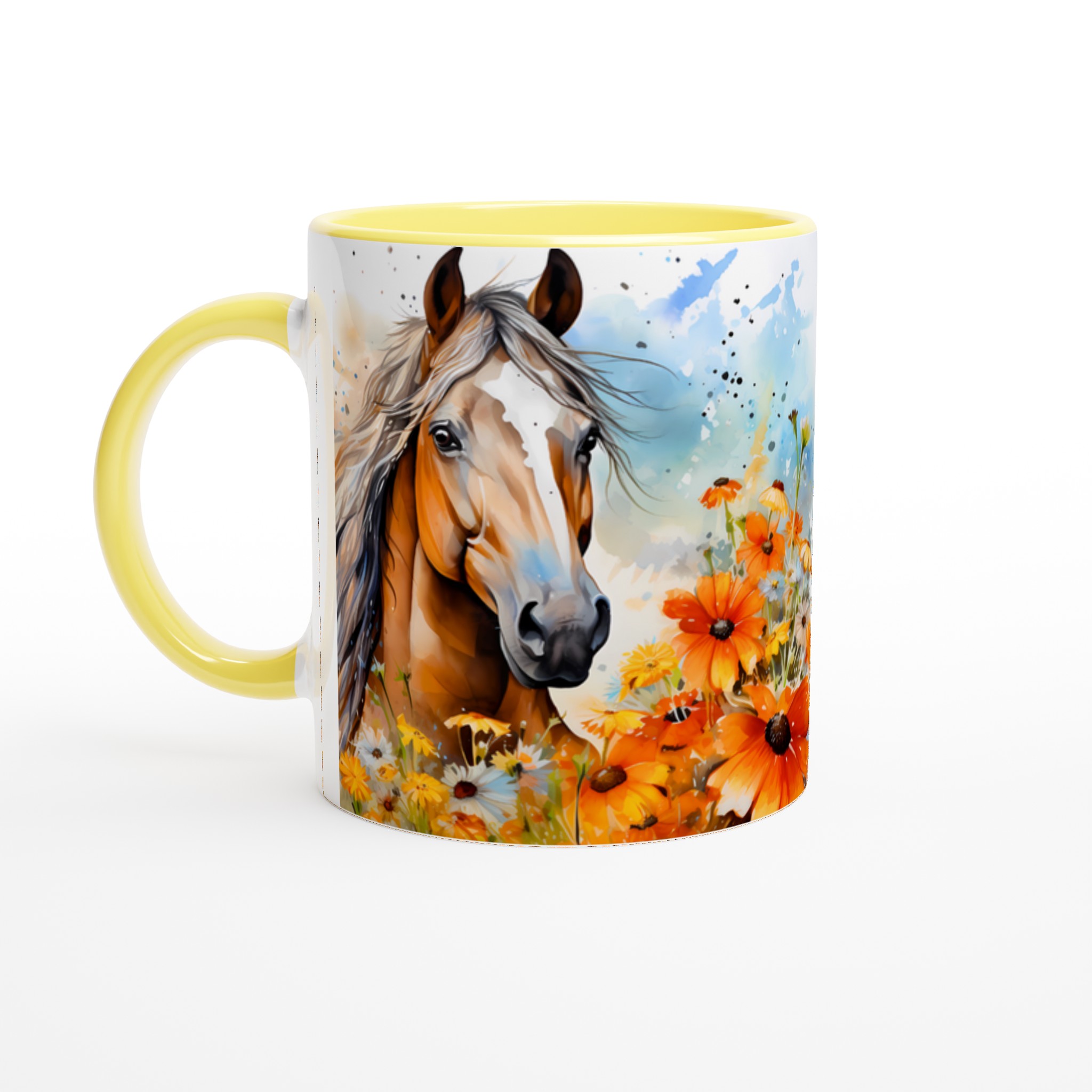 Gallop Through Meadows – Watercolor Horse & Floral Mug, 11oz Ceramic in 7 Vibrant Colors