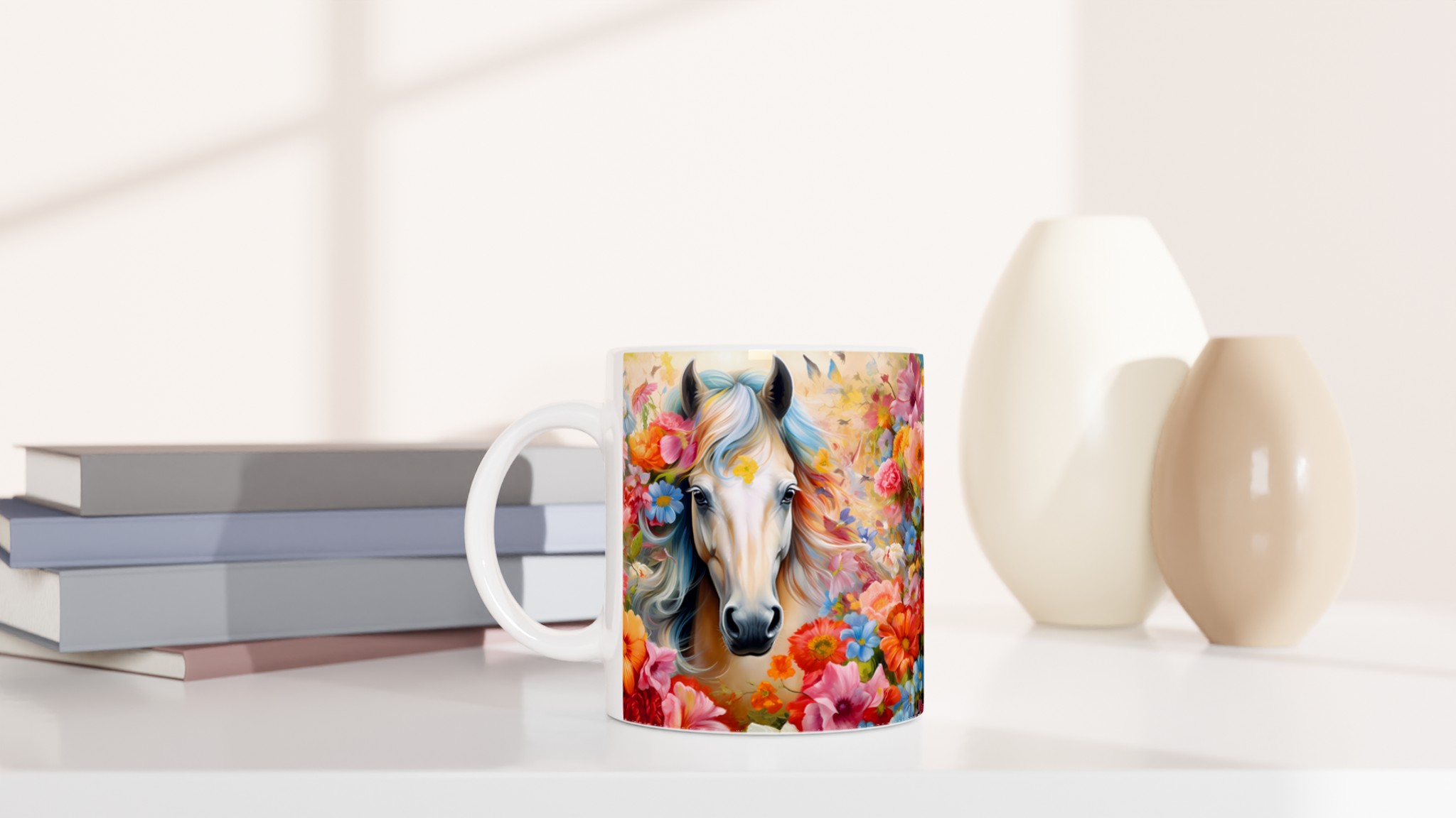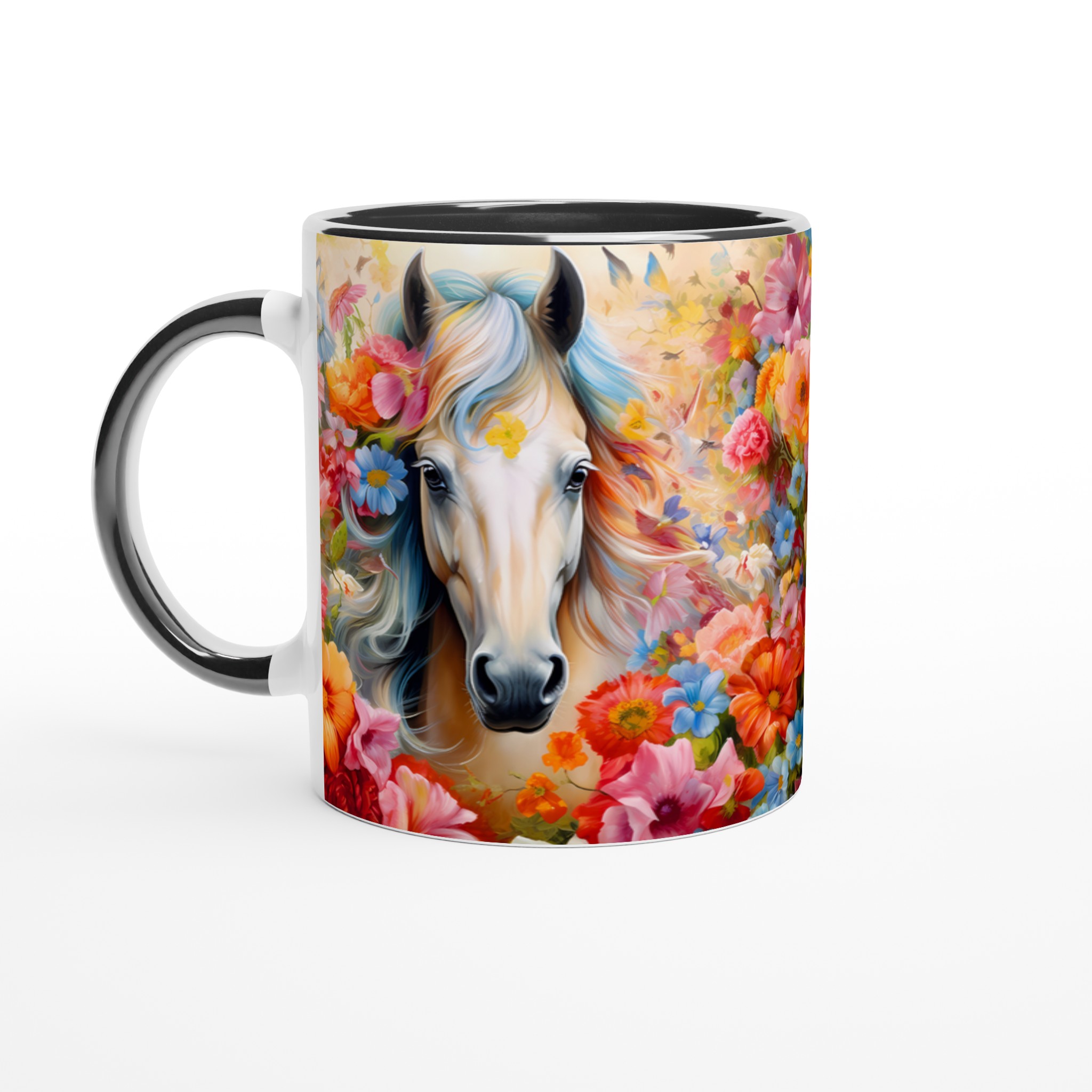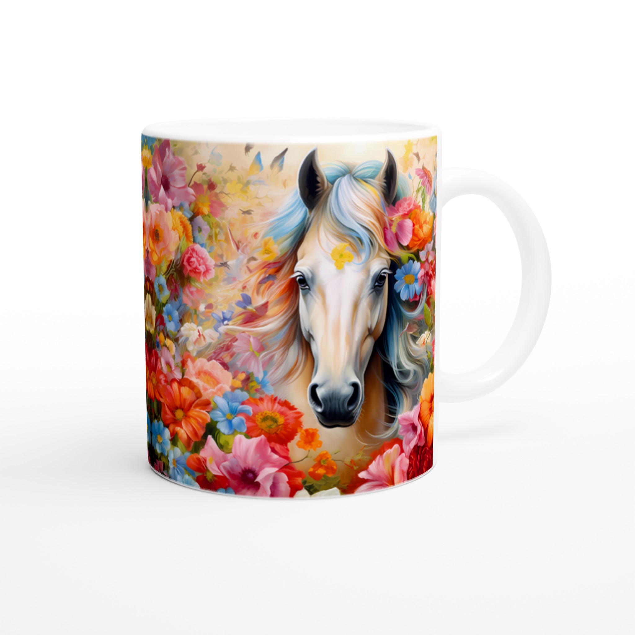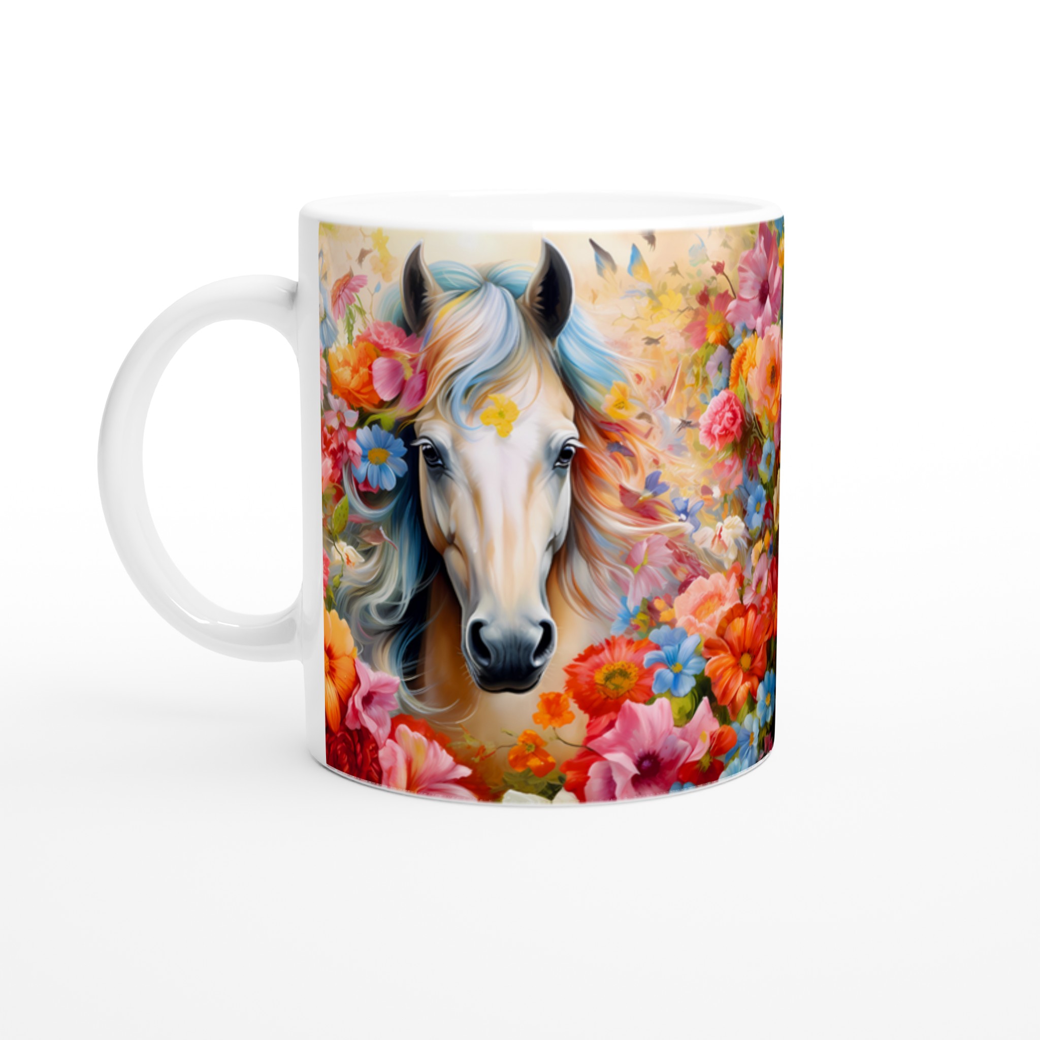 Enchanted Floral Horse – White Ceramic Mug 11oz, a vibrant statement piece for every moment