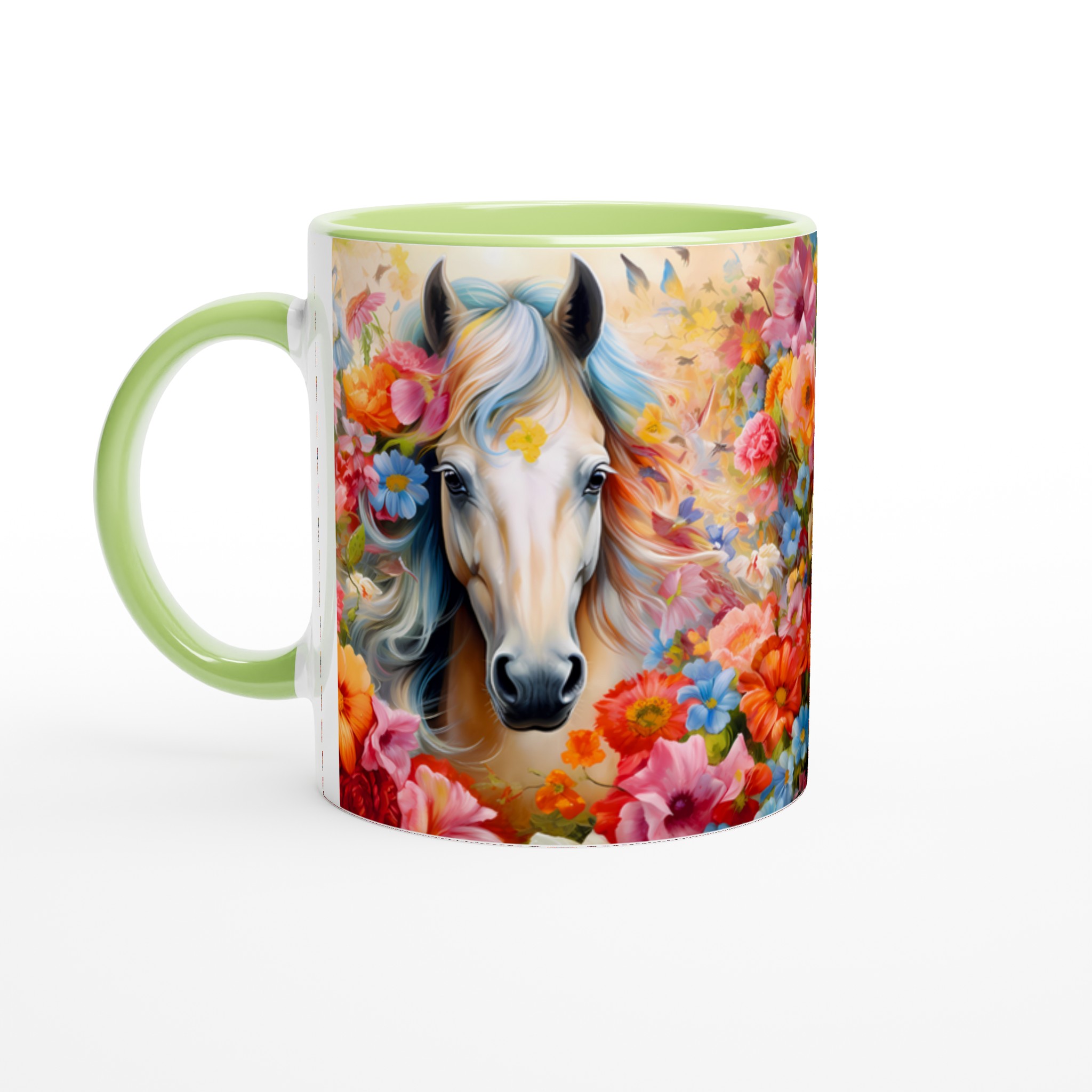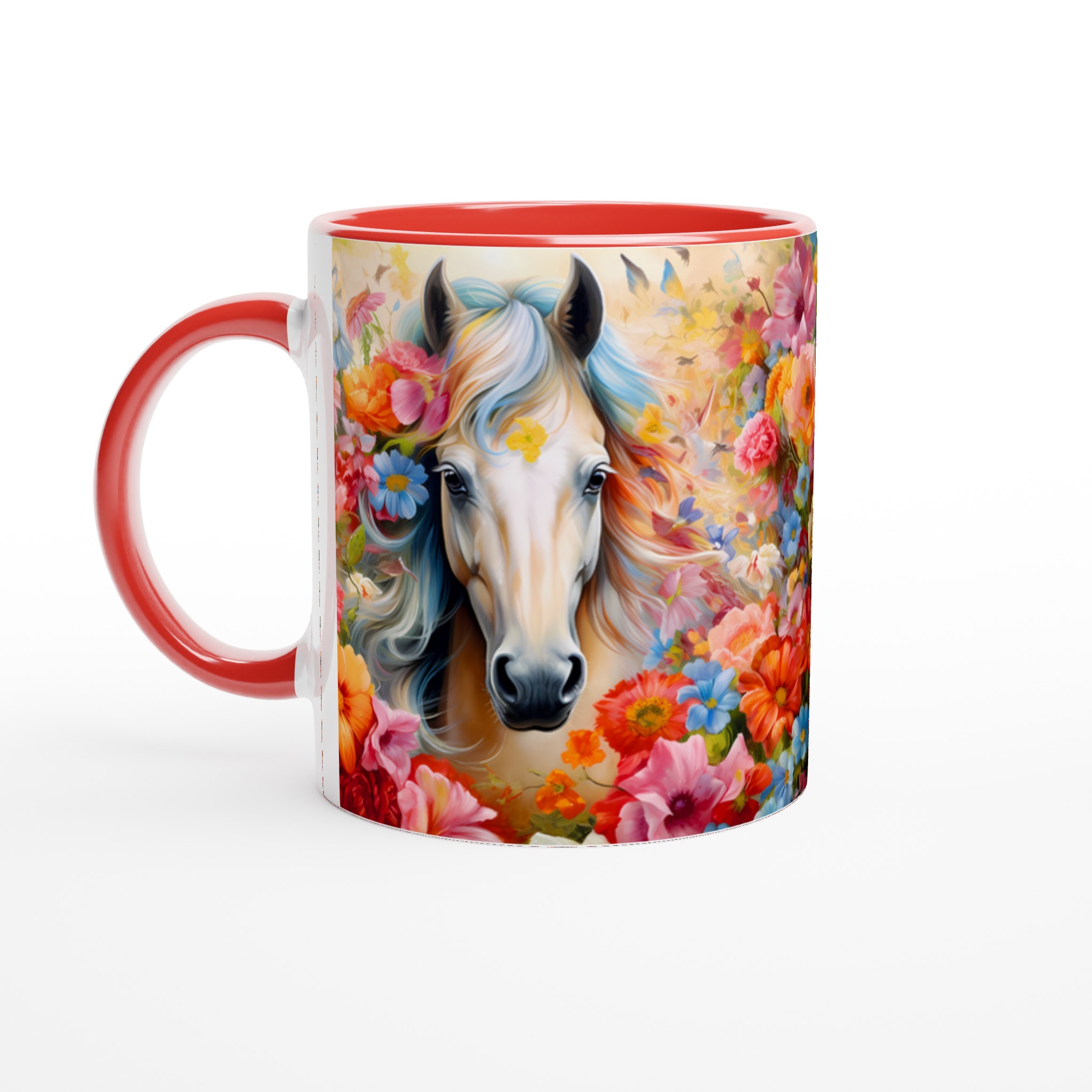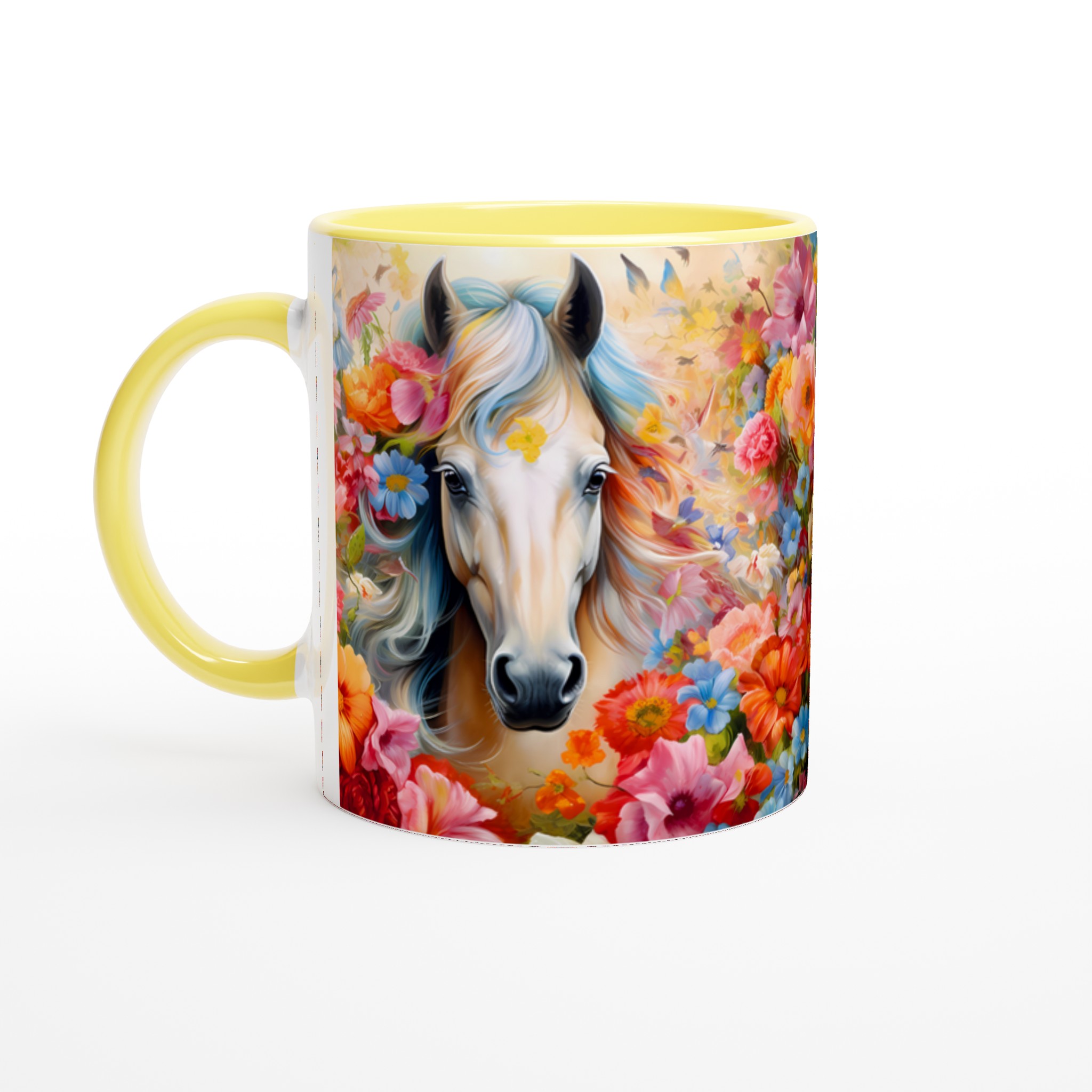 Enchanted Floral Horse – White Ceramic Mug 11oz, a vibrant statement piece for every moment